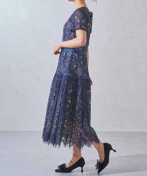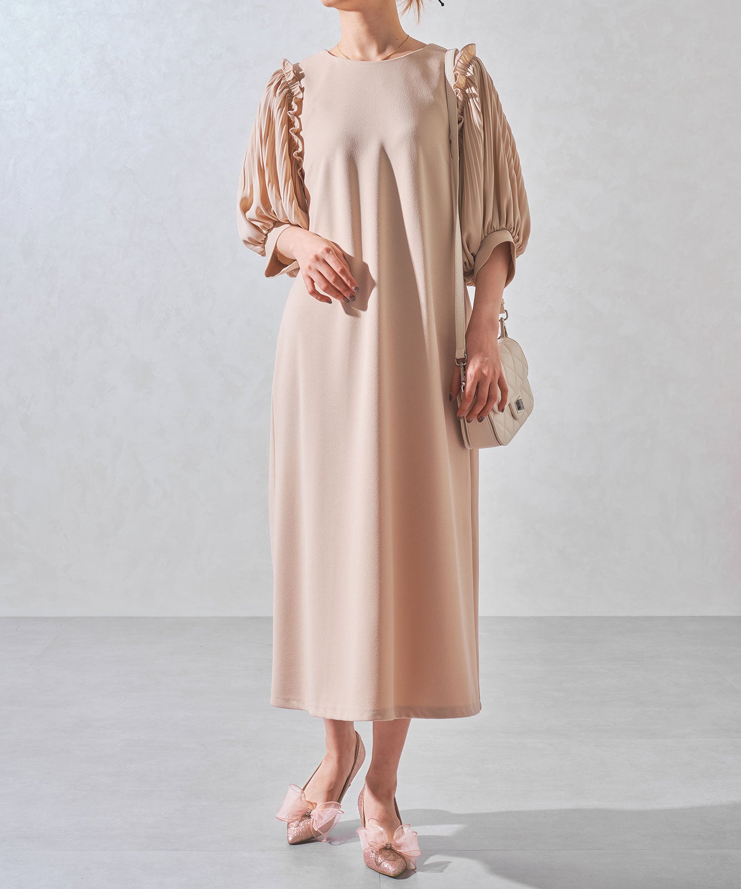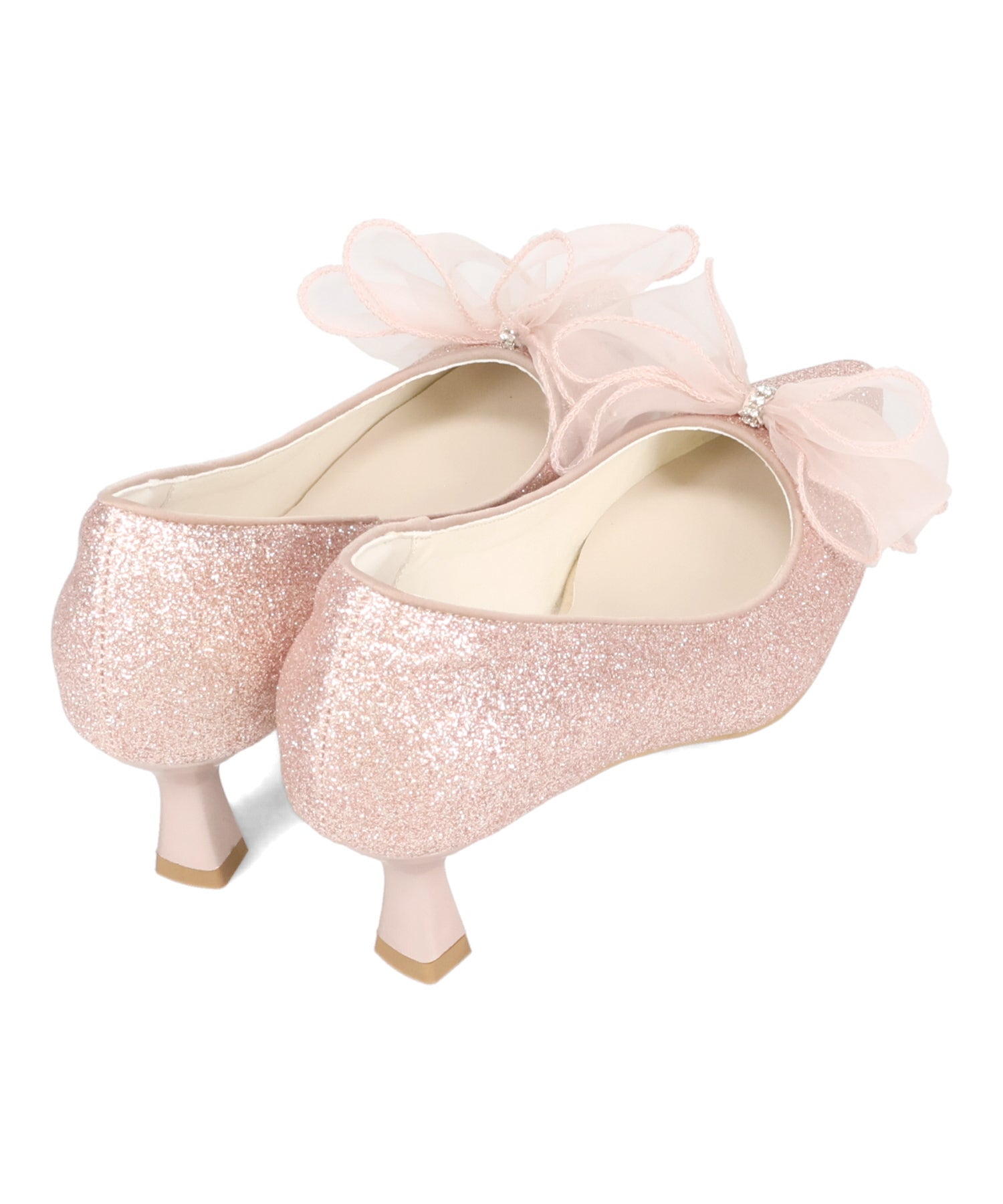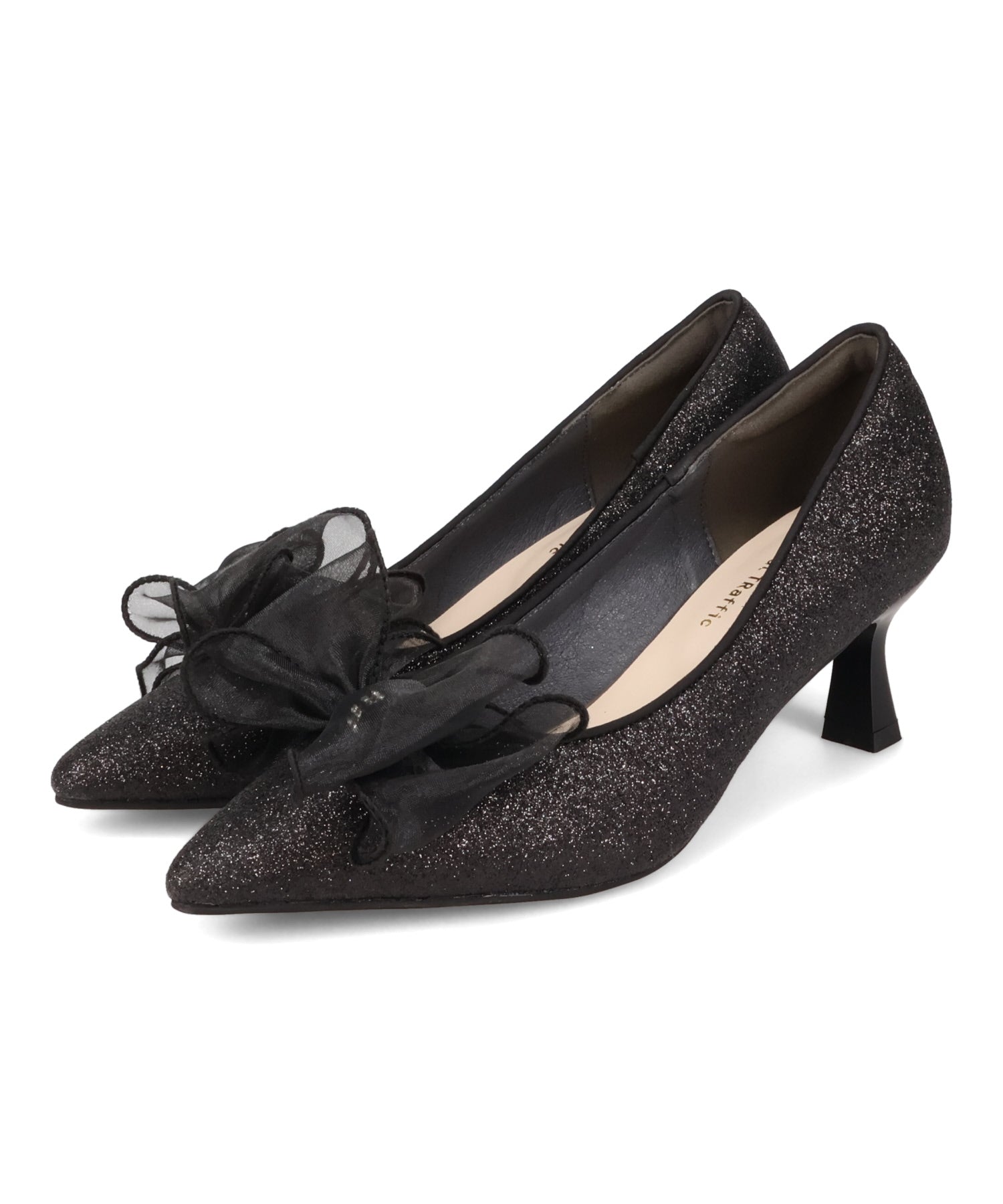 細かいグリッターが上品なパンプスは、ボリューム感たっぷりの大きなチュールリボンが華やかで特別な日の装いにぴったりなアイテム。リボンの中央には小粒のビジューをあしらってさらに高級感をプラス。シャープなポインテッドトゥでシルエットにこだわり、安定感のあるミドルヒールと踵部分のクッションが歩行をサポートしてくれる機能面にもこだわった1足。