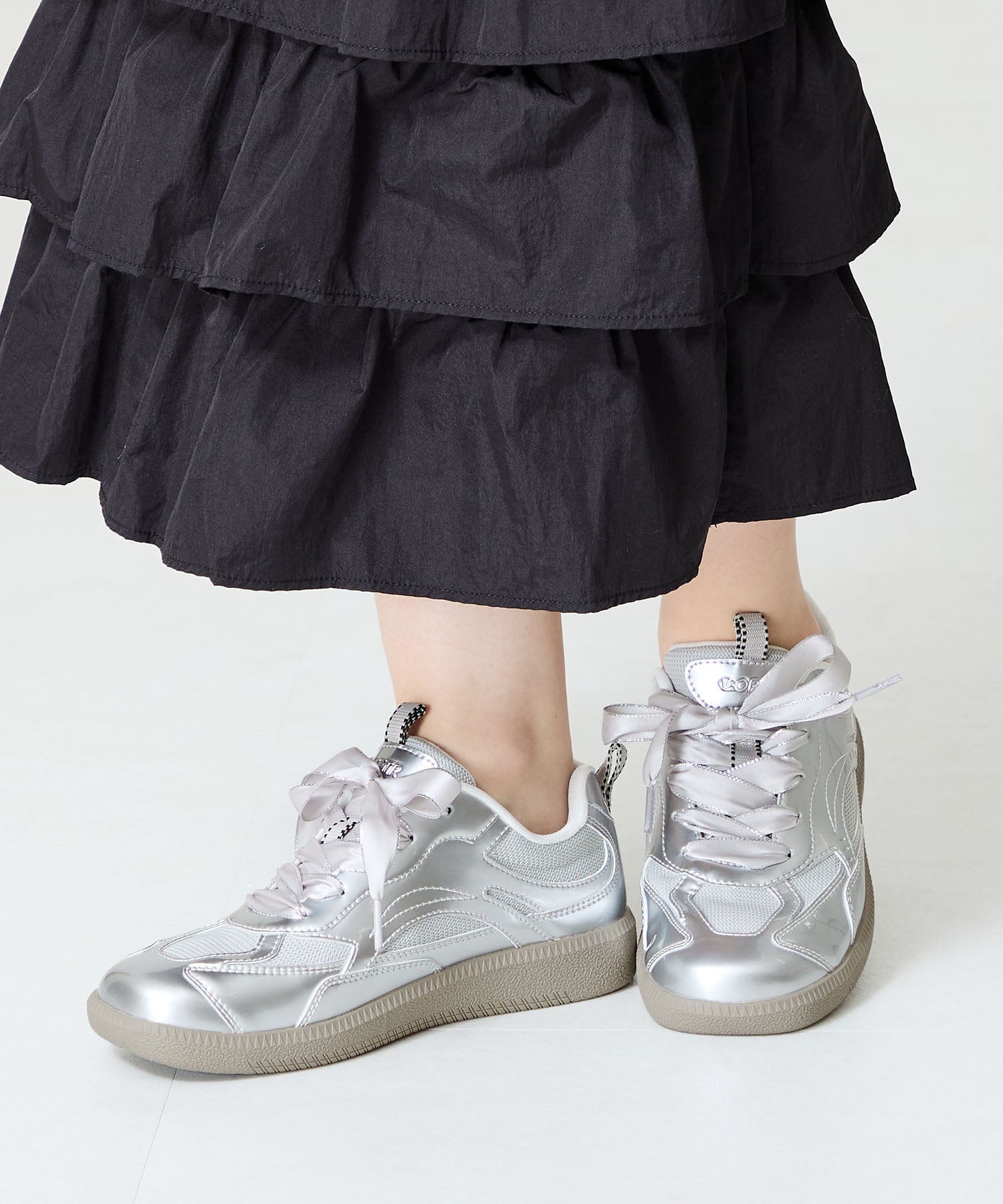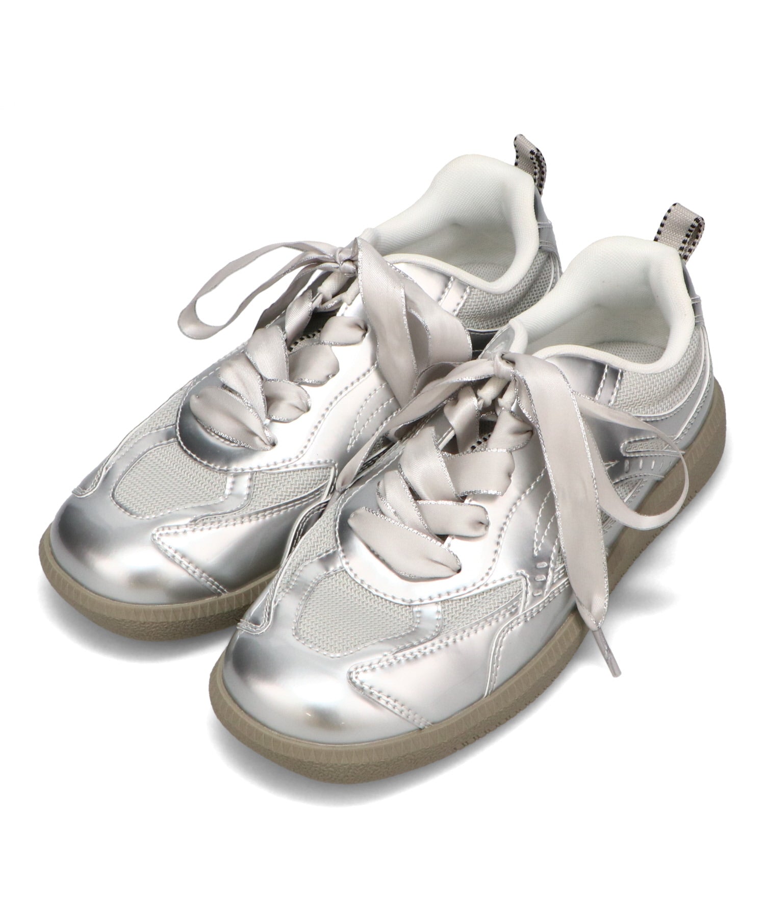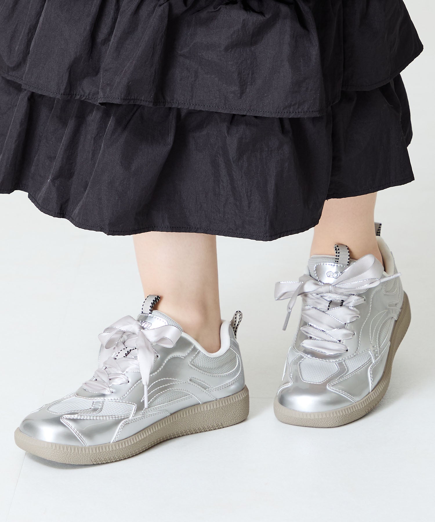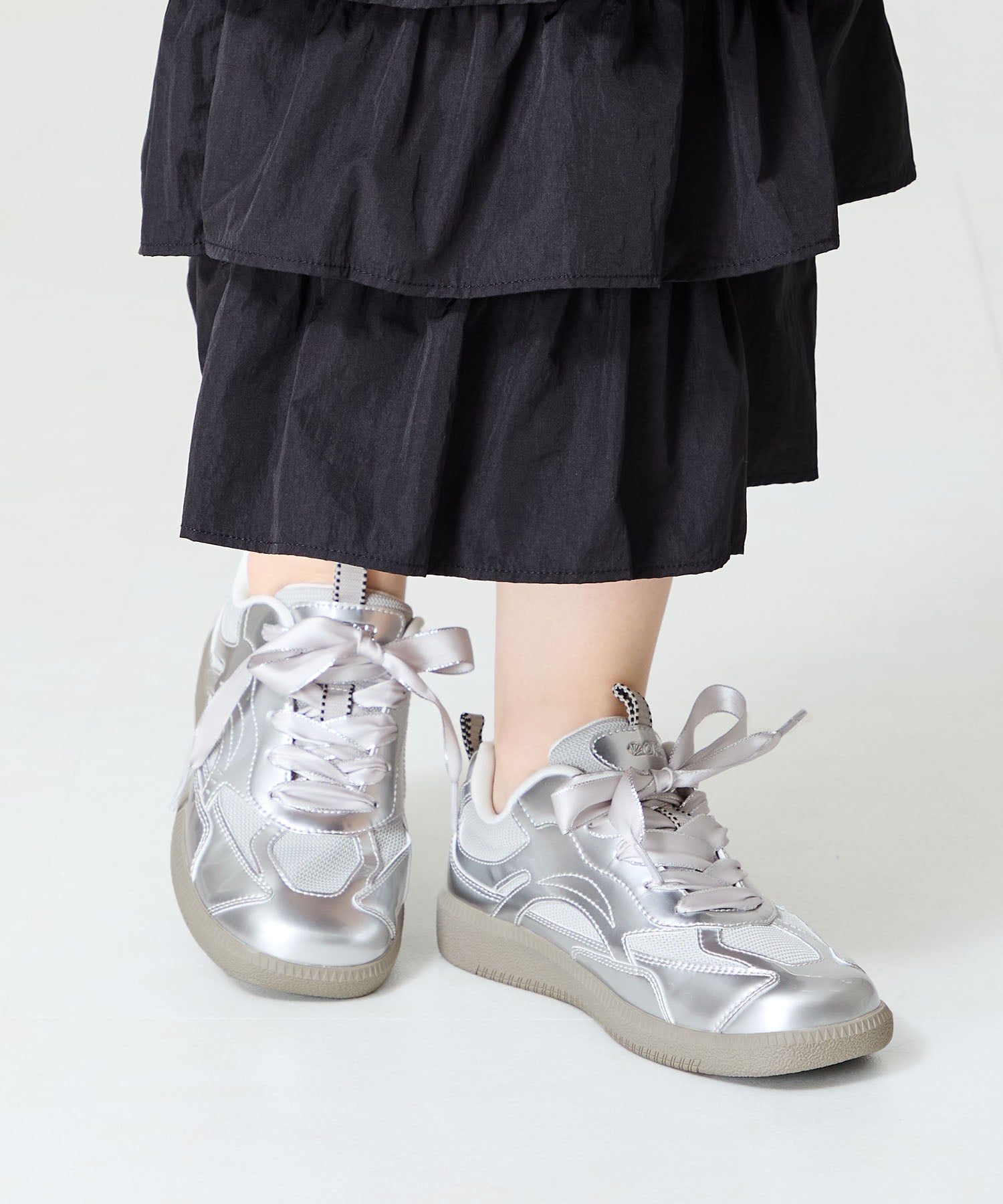 アッパー全体に大胆にメタリックの切替デザインを施したトレンド感満載のスニーカー。ベースをメッシュ素材にすることで通気性が良く、ソールも薄めでコンパクトなものを選んで見た目も軽やかな足元を演出。シューレースはサテンリボンにしてガーリーさをプラスし、スクエアトゥがカジュアルからフェミニンまで幅広く活躍してくれる。