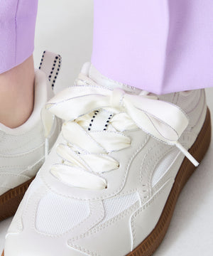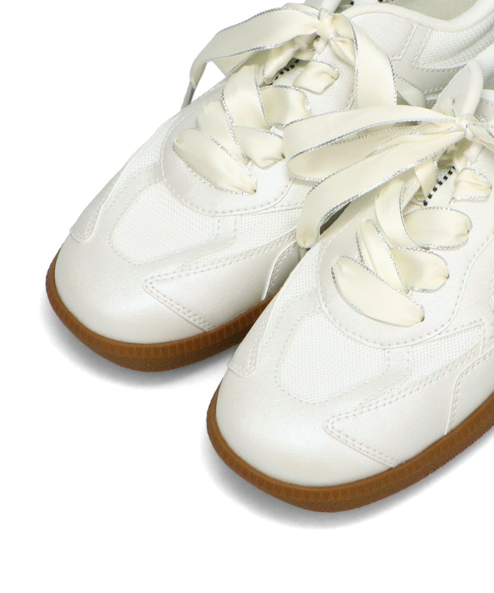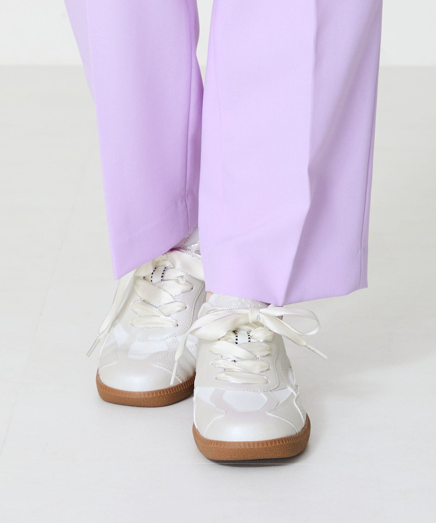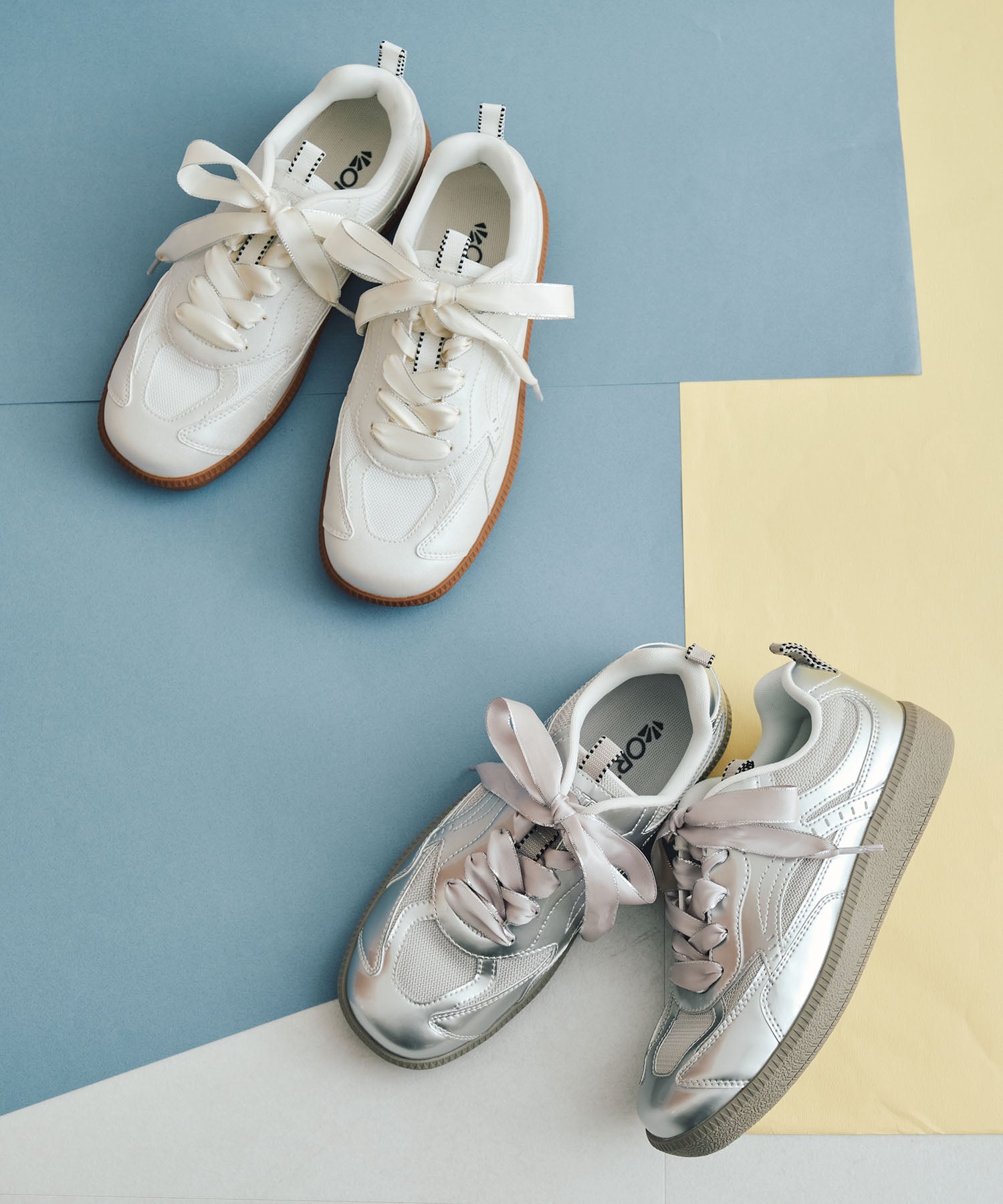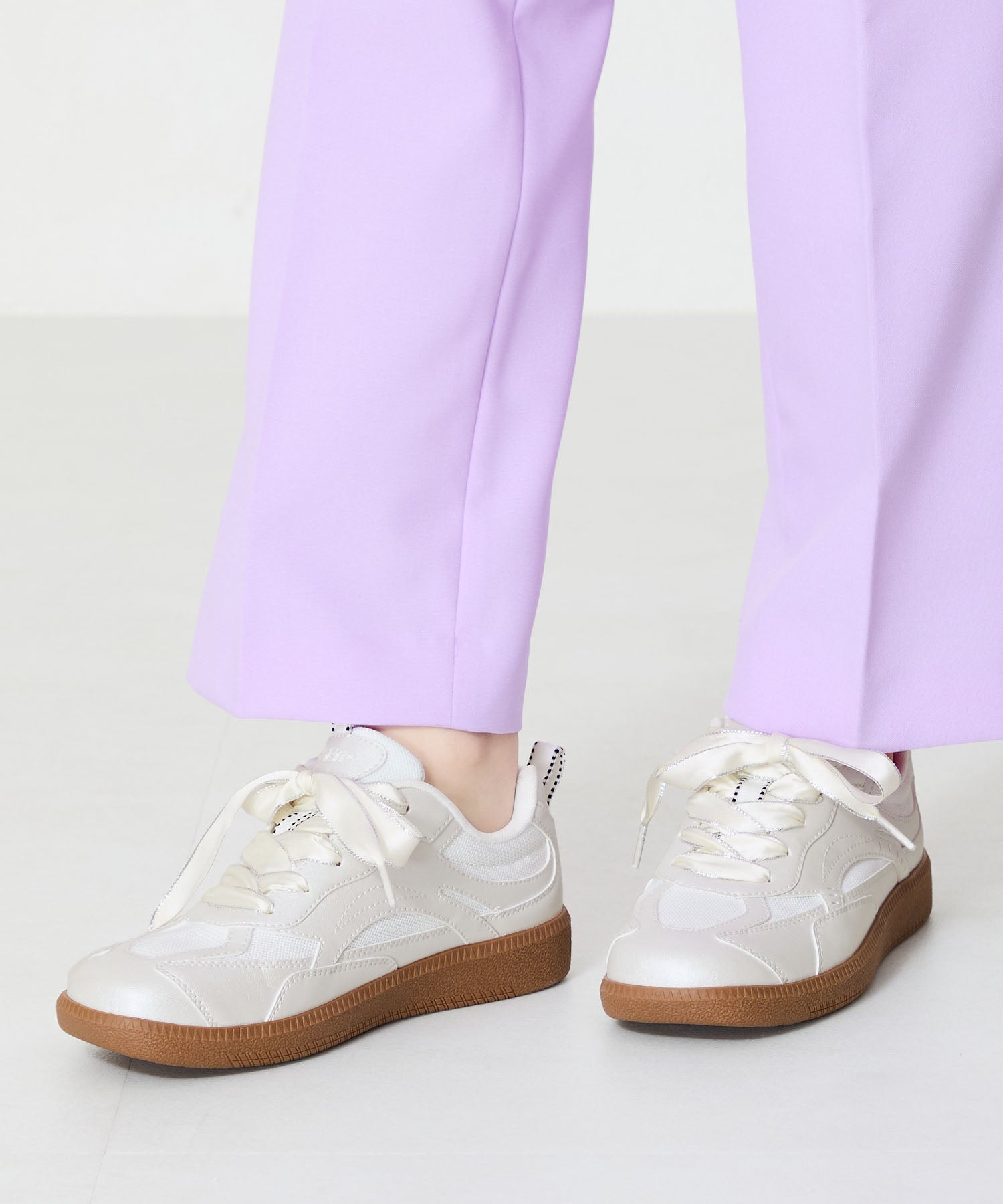 アッパー全体に大胆にメタリックの切替デザインを施したトレンド感満載のスニーカー。ベースをメッシュ素材にすることで通気性が良く、ソールも薄めでコンパクトなものを選んで見た目も軽やかな足元を演出。シューレースはサテンリボンにしてガーリーさをプラスし、スクエアトゥがカジュアルからフェミニンまで幅広く活躍してくれる。