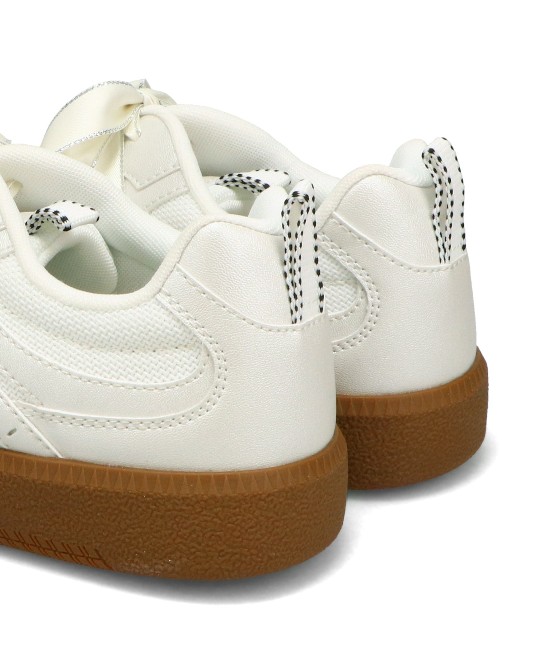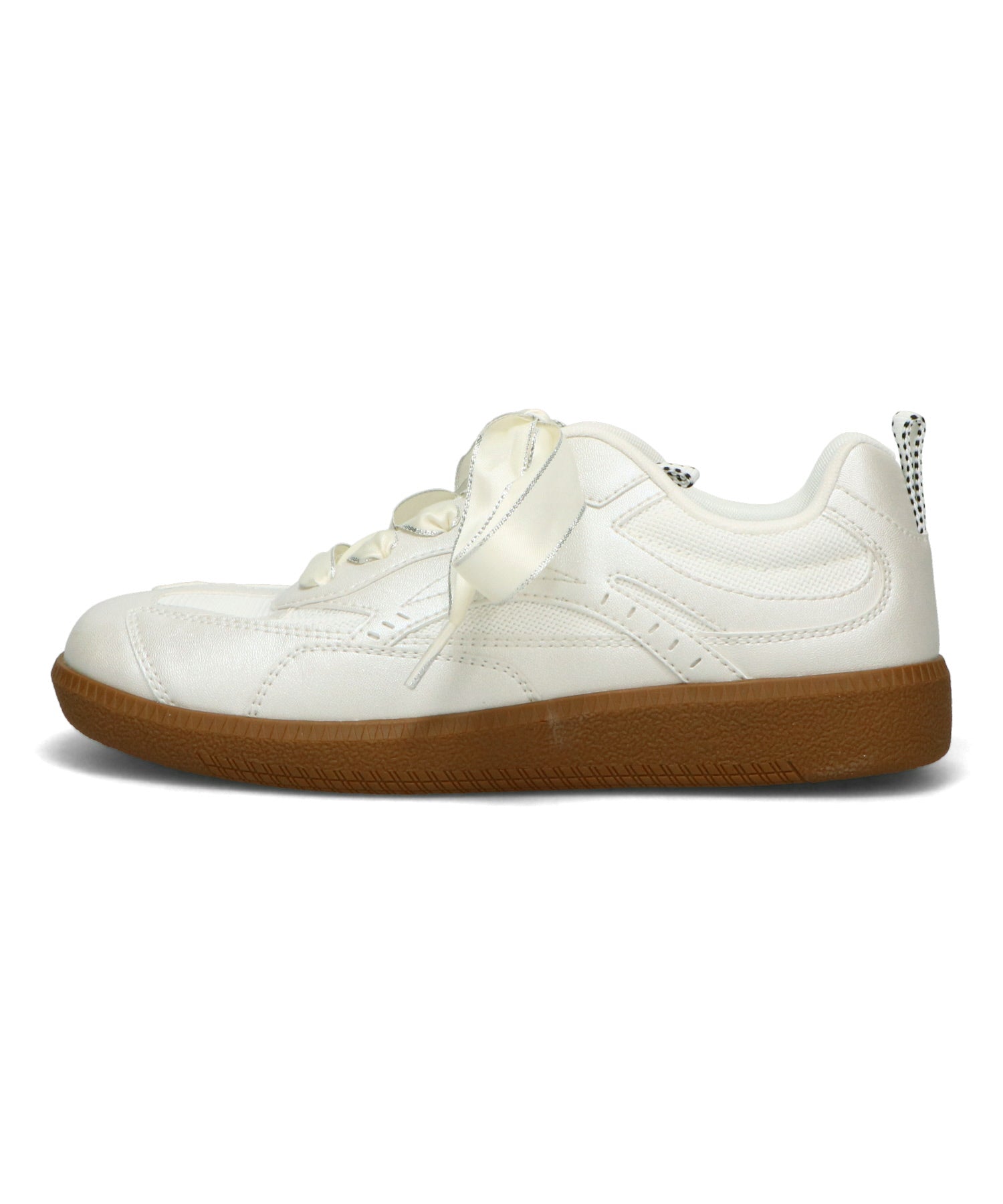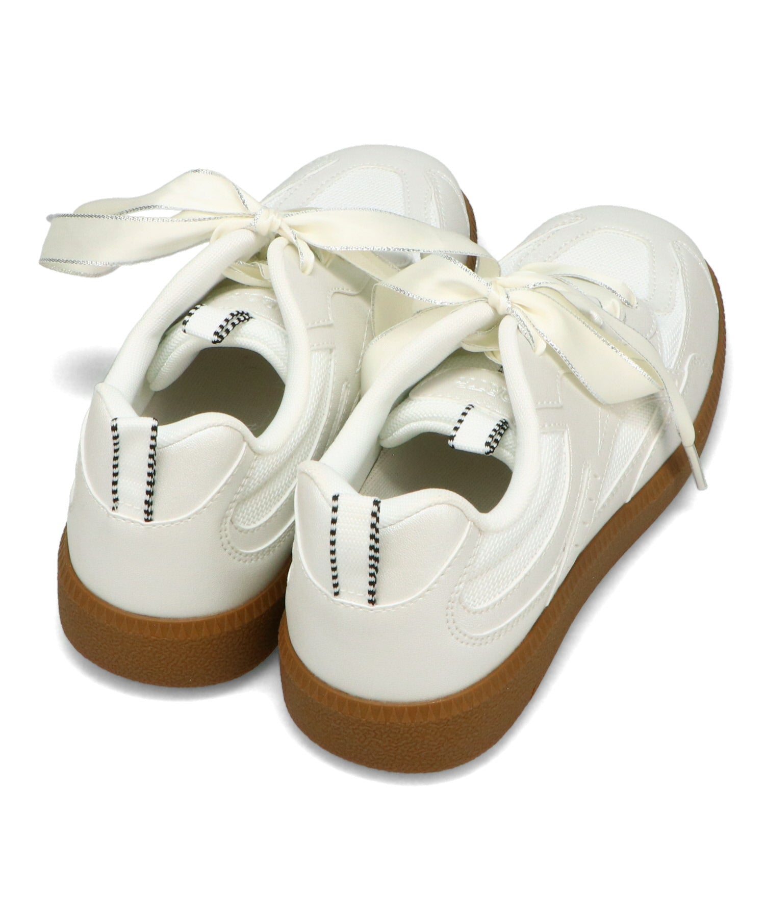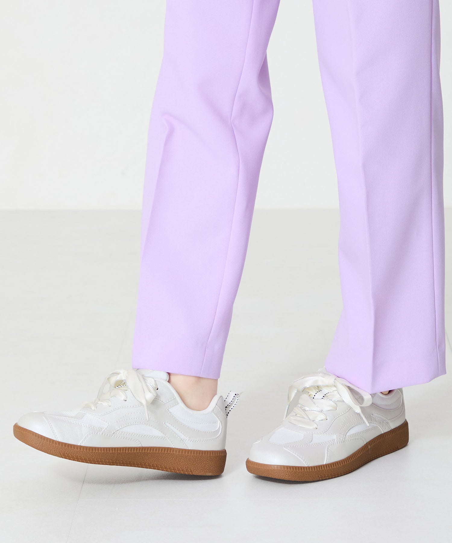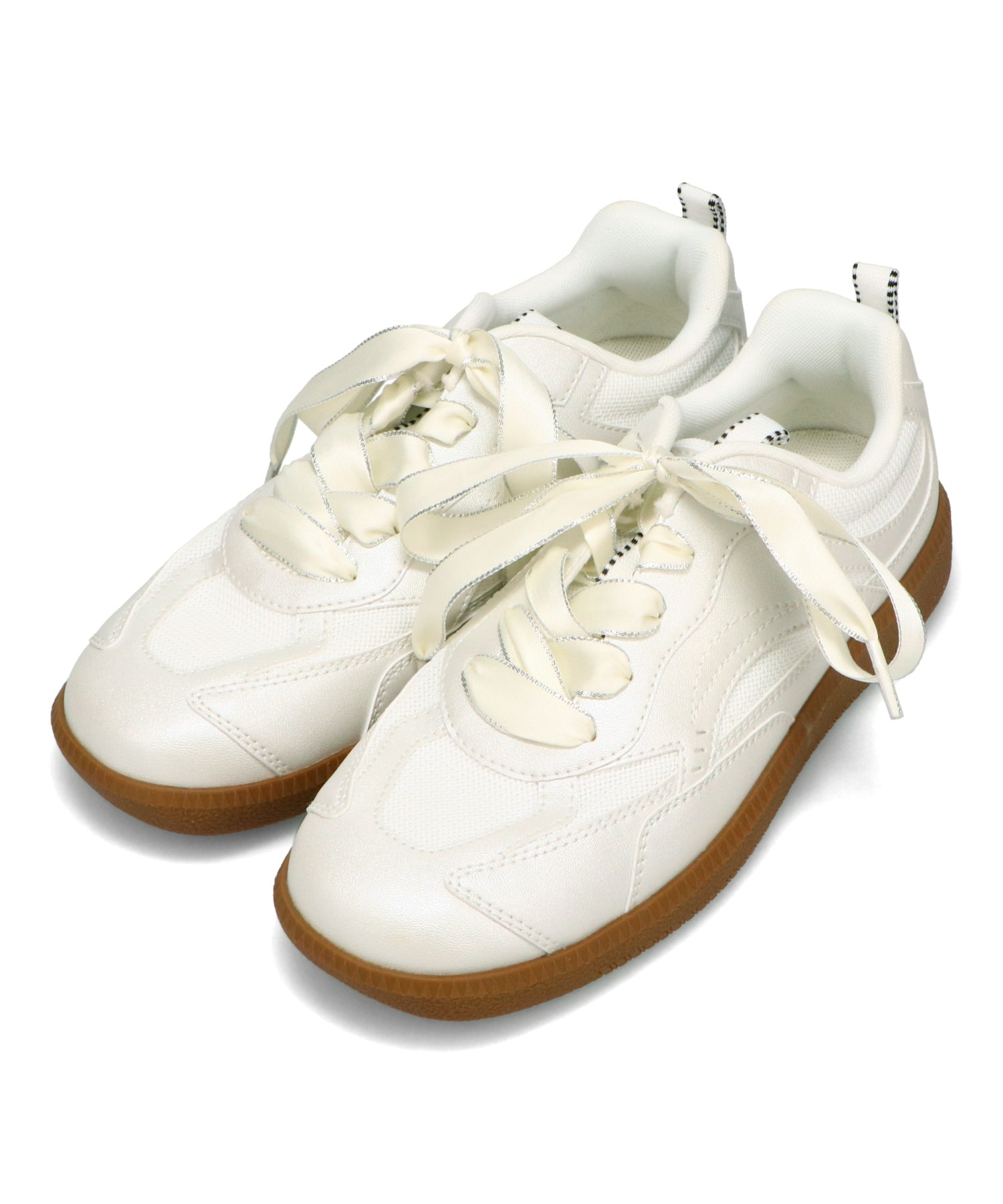 アッパー全体に大胆にメタリックの切替デザインを施したトレンド感満載のスニーカー。ベースをメッシュ素材にすることで通気性が良く、ソールも薄めでコンパクトなものを選んで見た目も軽やかな足元を演出。シューレースはサテンリボンにしてガーリーさをプラスし、スクエアトゥがカジュアルからフェミニンまで幅広く活躍してくれる。