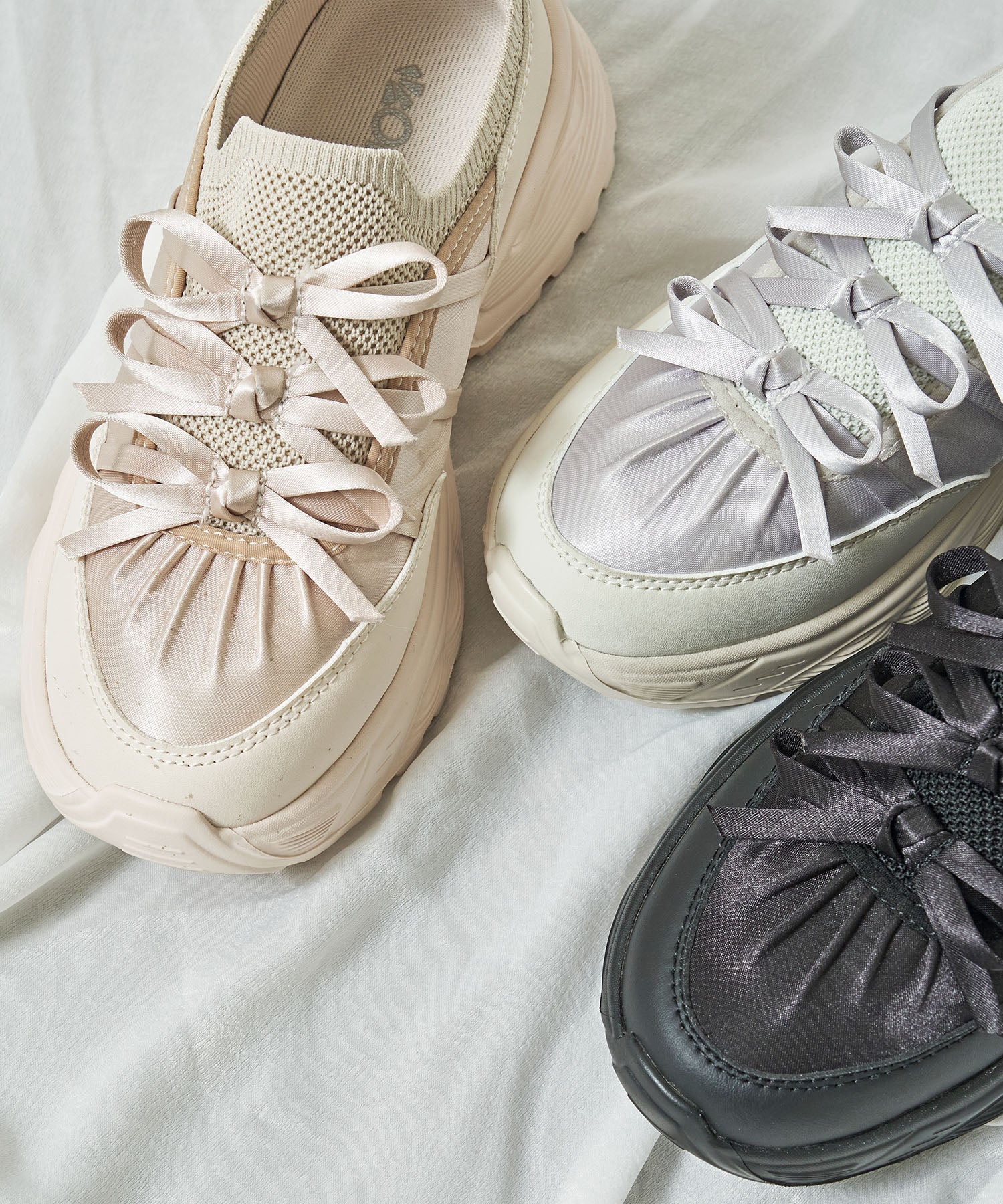 リボンディテールとギャザーがコーディネートに大人可愛い甘さをプラスしてくれる厚底スニーカー。しっかりホールドしてくれる履き口部分のニットは伸縮性がありフィット感も◎。カジュアルにも合わせられるブラックと、フェミニンコーデにぴったりな淡いグレーとピンクのカラバリも可愛い。ガーリーに履きたい方はミニ丈で、甘さをおさえたい方はロング丈のボトムで合わせるがおすすめ。