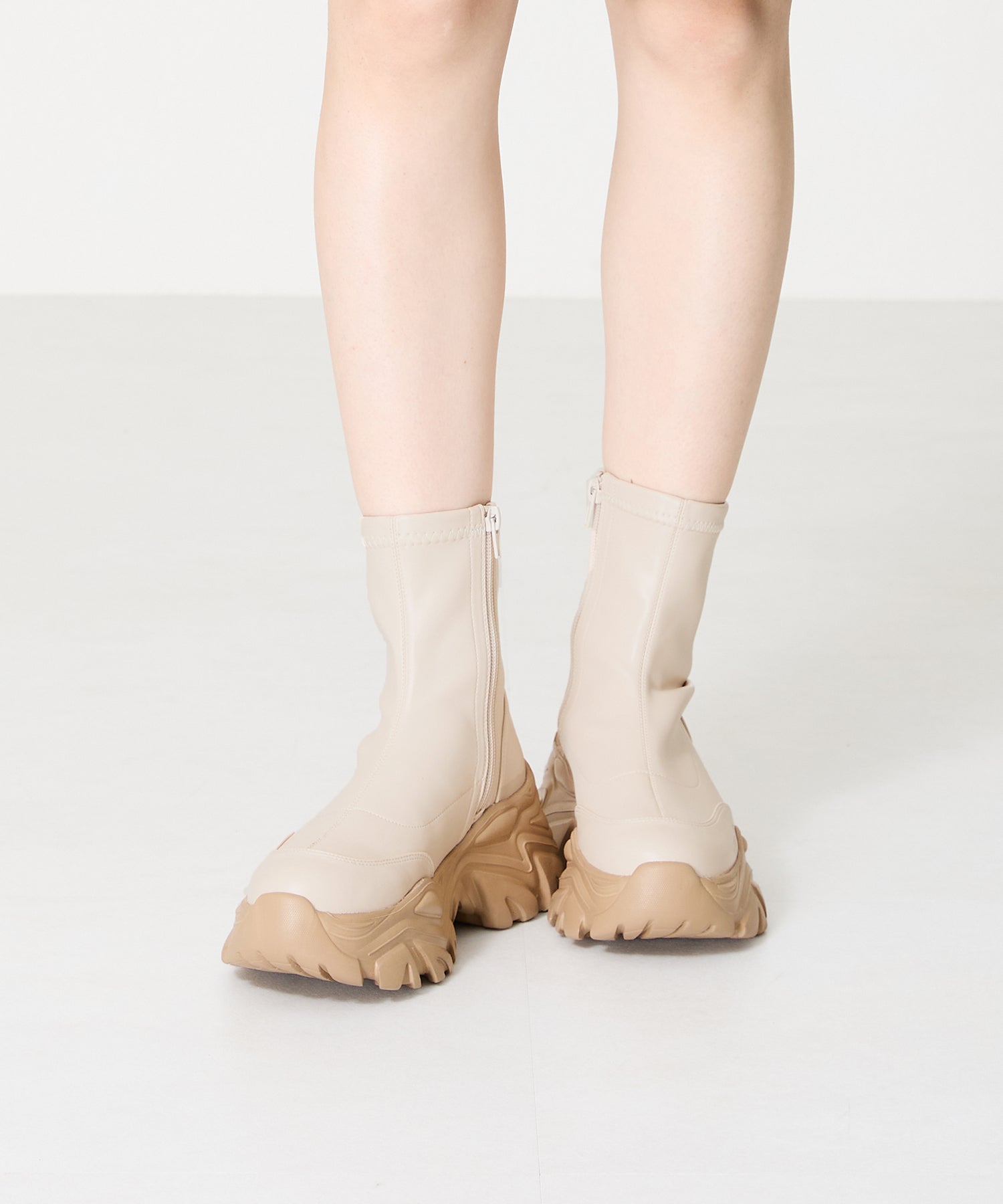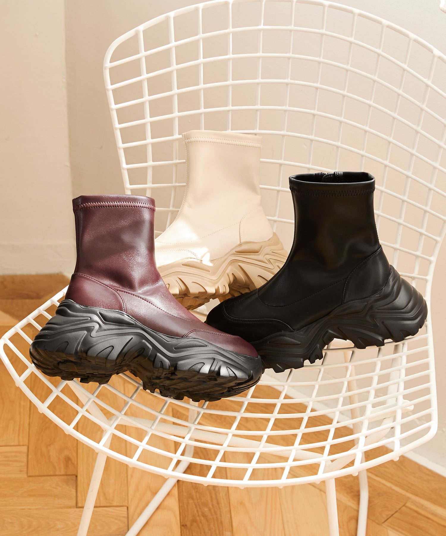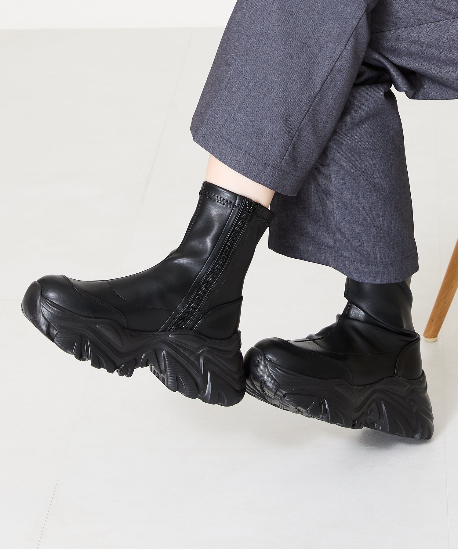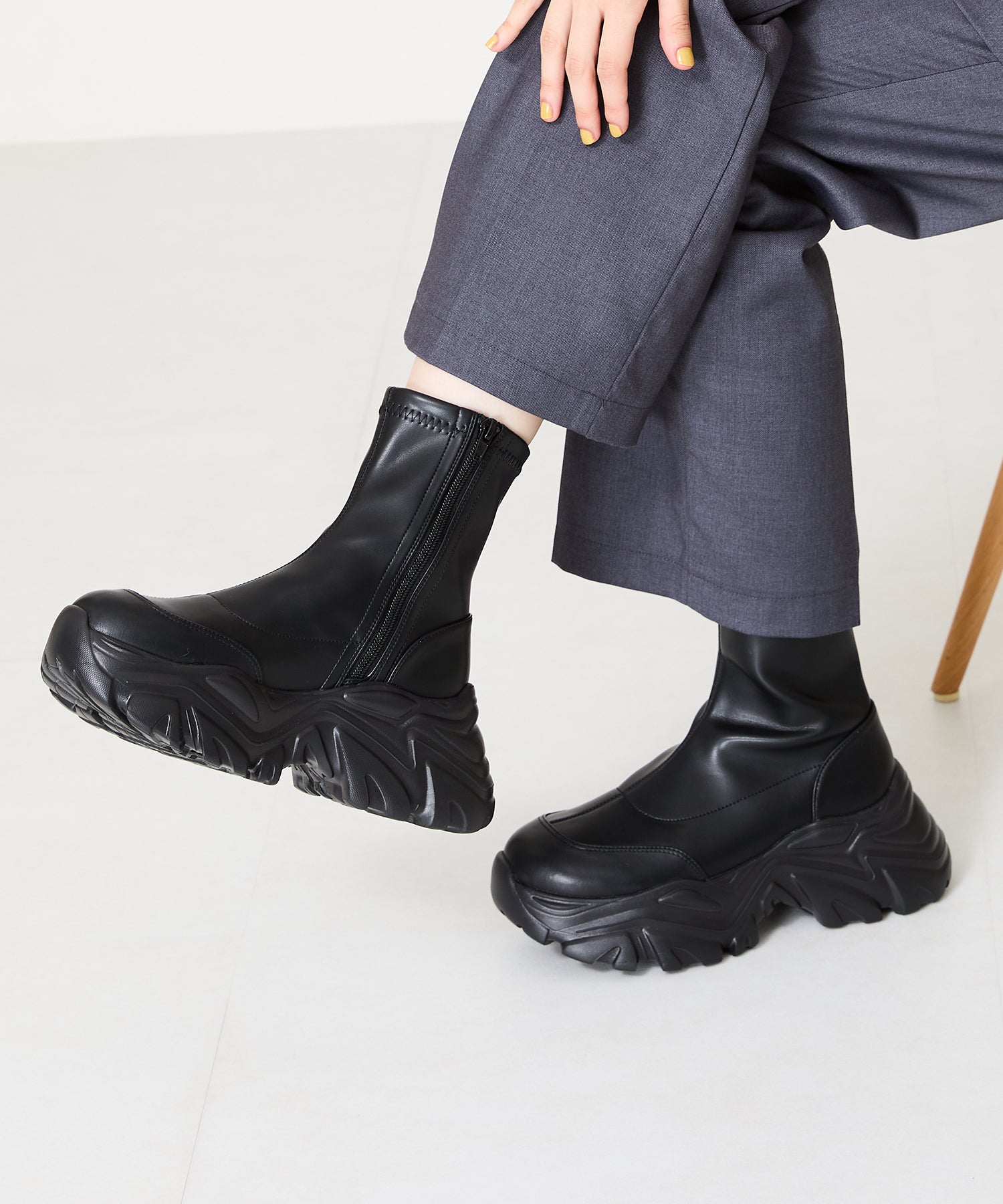 とことんボリュームを持たせたスニーカーソールがインパクト大のブーツは、履くだけでコーディネートの主役になる1足。筒回りはストレッチ素材で足当たりが良くフィットするので、ボリューミーなソールと組み合わせることで細見え効果が抜群。ソールには軽量で柔らかい材質を使用しているので見た目以上に歩きやすく疲れにくいので、今季手に入れたいマストアイテム。