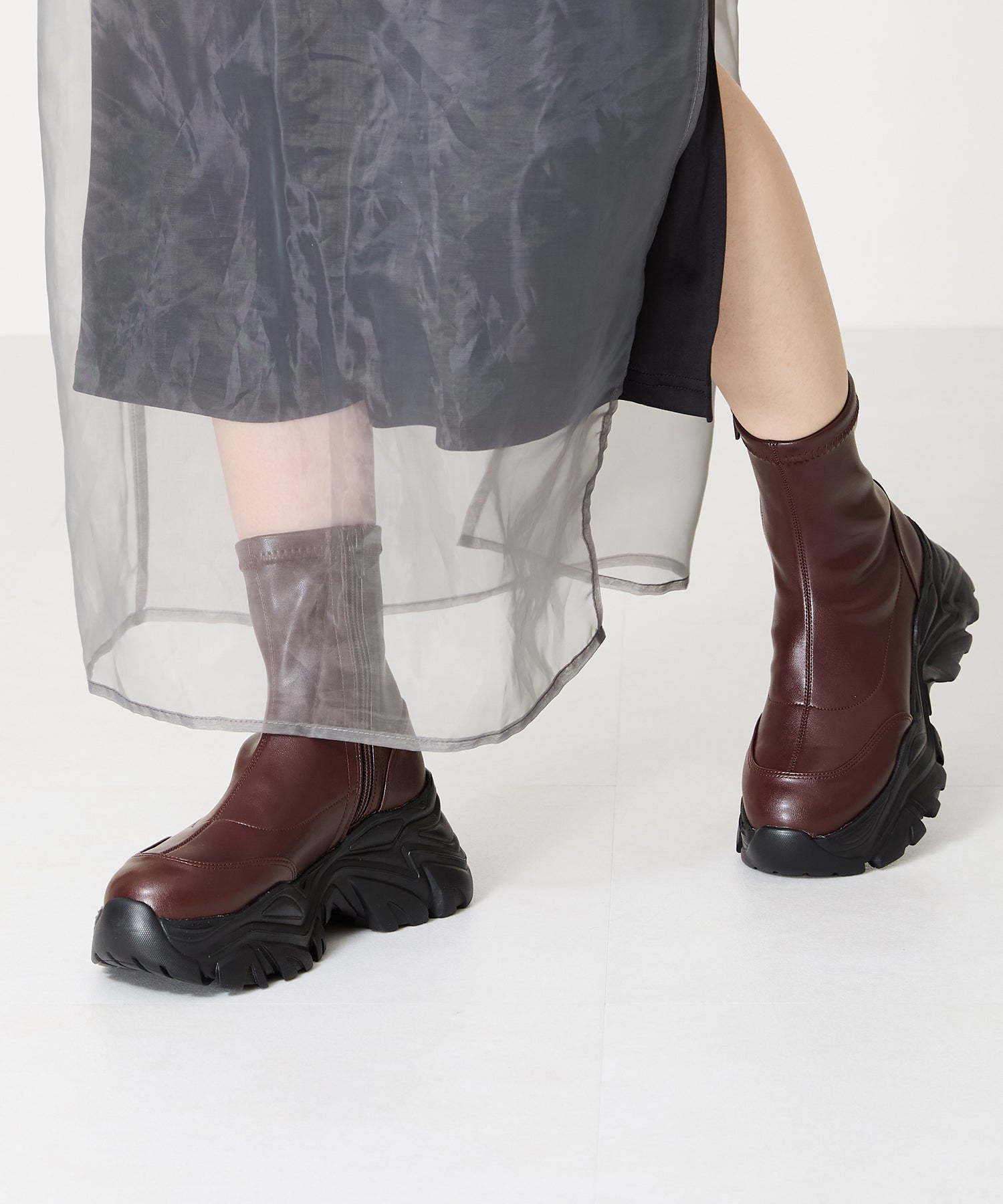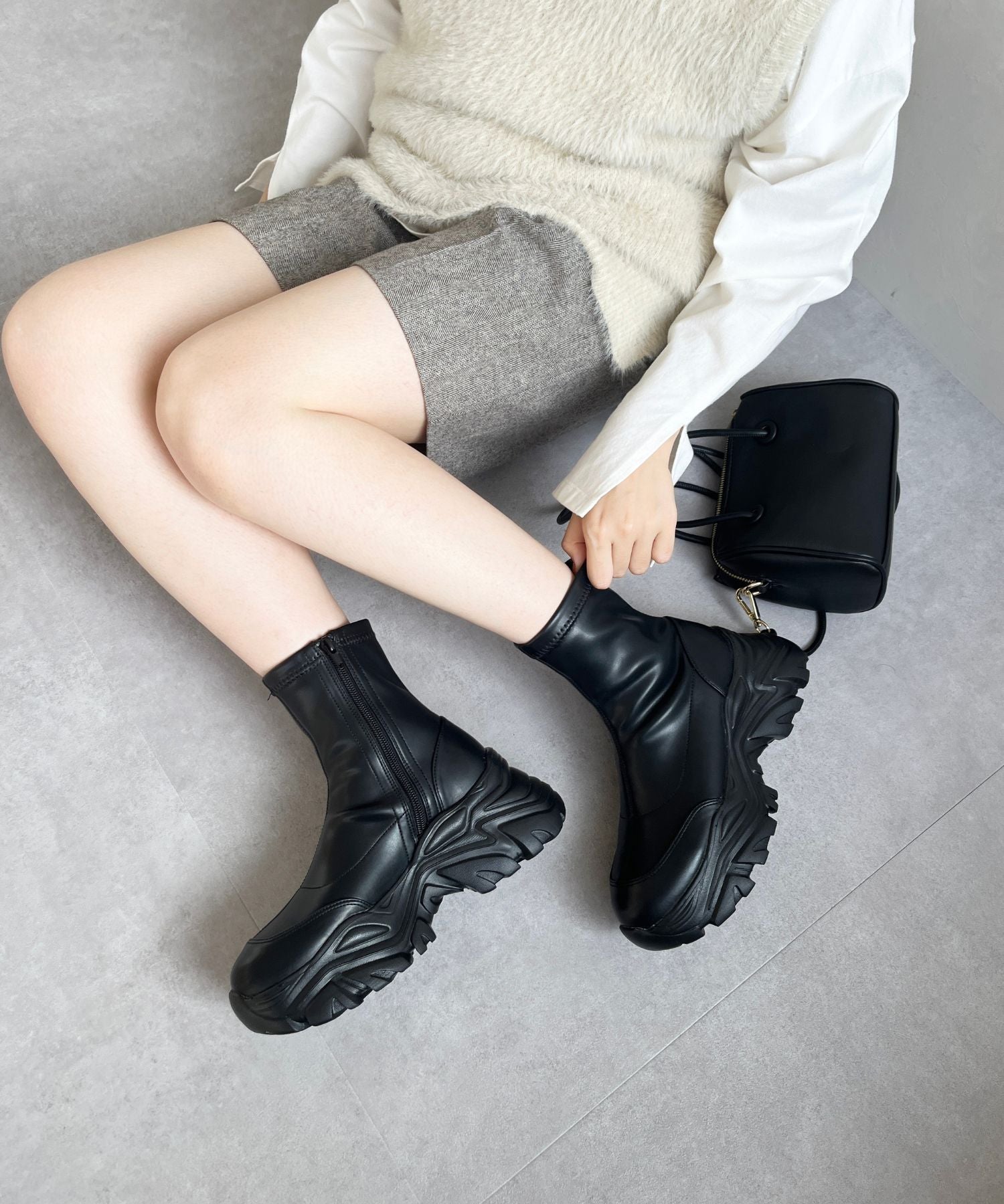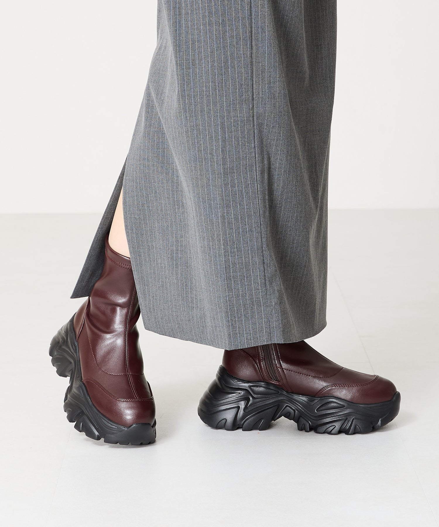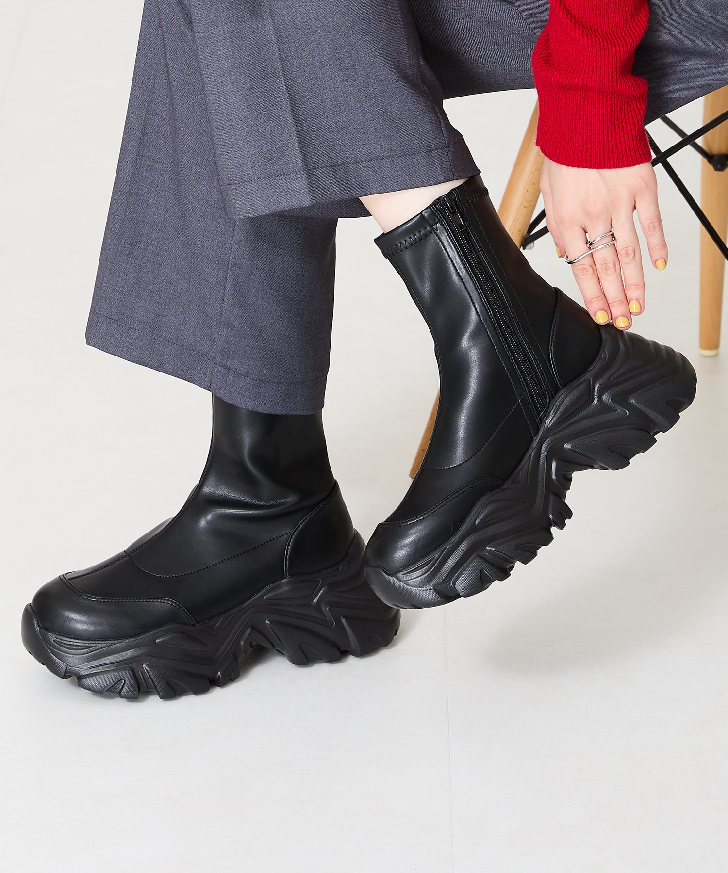とことんボリュームを持たせたスニーカーソールがインパクト大のブーツは、履くだけでコーディネートの主役になる1足。筒回りはストレッチ素材で足当たりが良くフィットするので、ボリューミーなソールと組み合わせることで細見え効果が抜群。ソールには軽量で柔らかい材質を使用しているので見た目以上に歩きやすく疲れにくいので、今季手に入れたいマストアイテム。