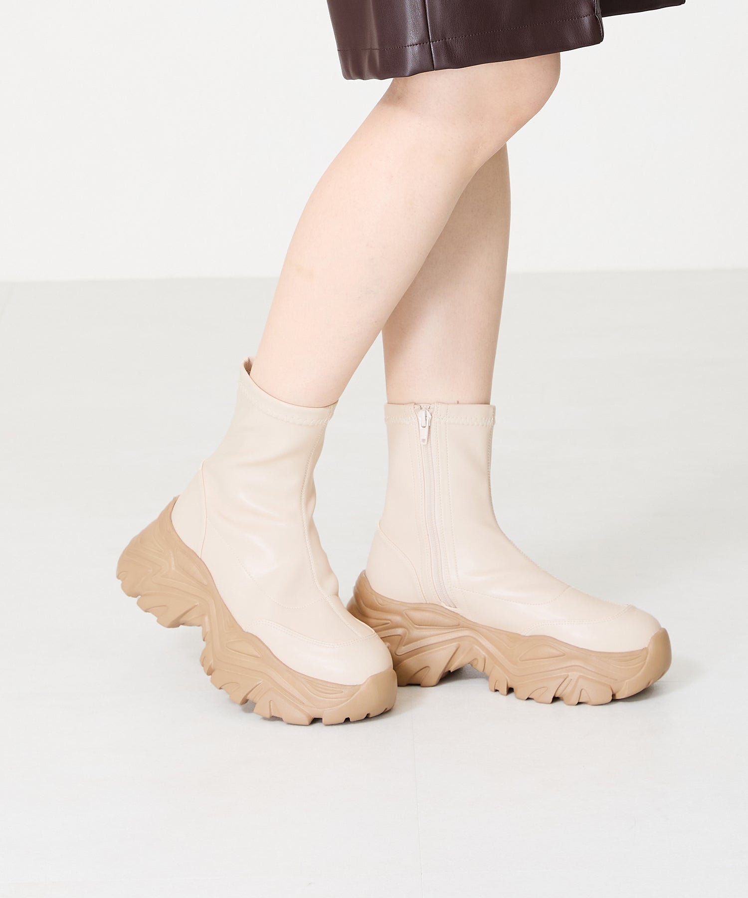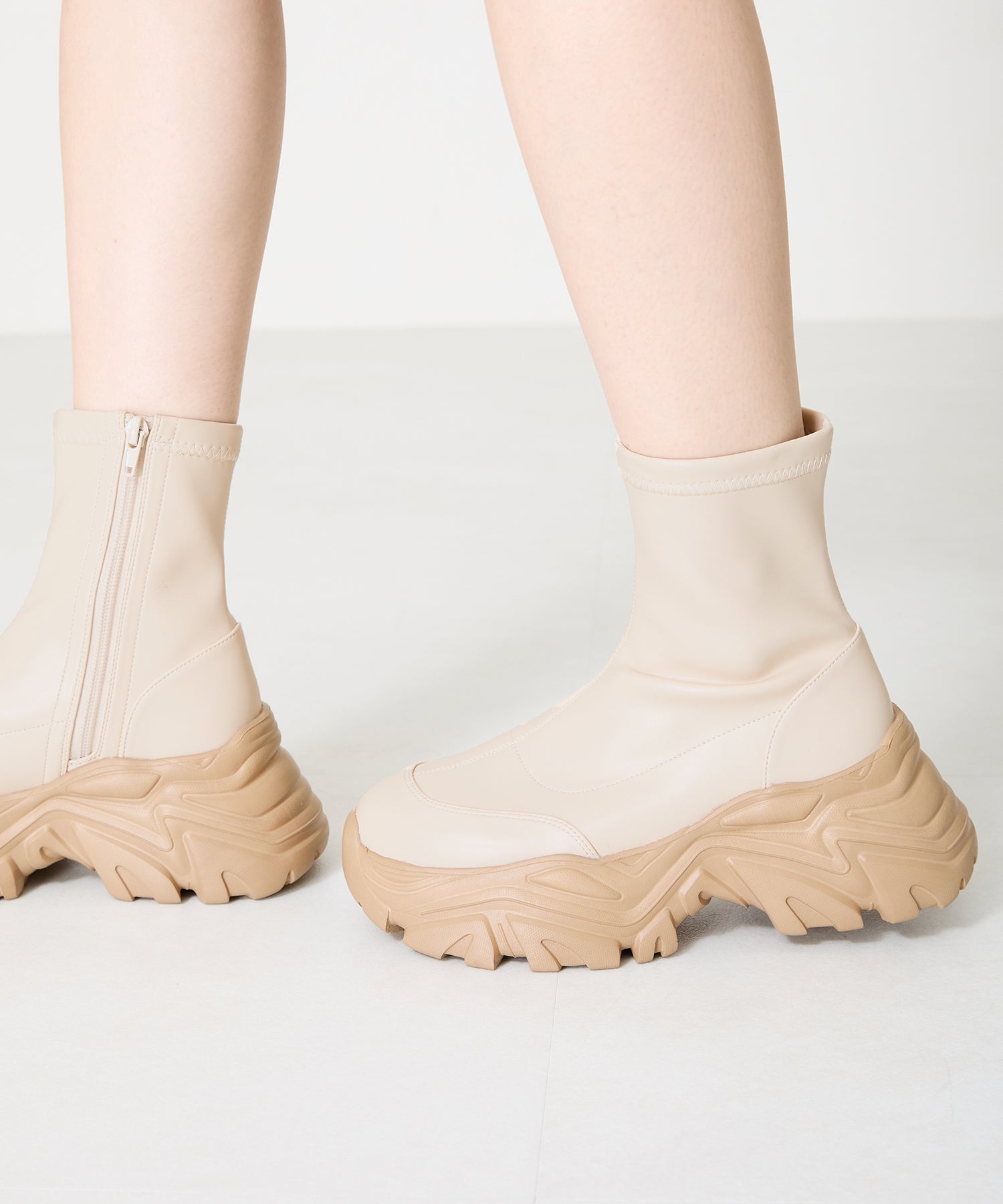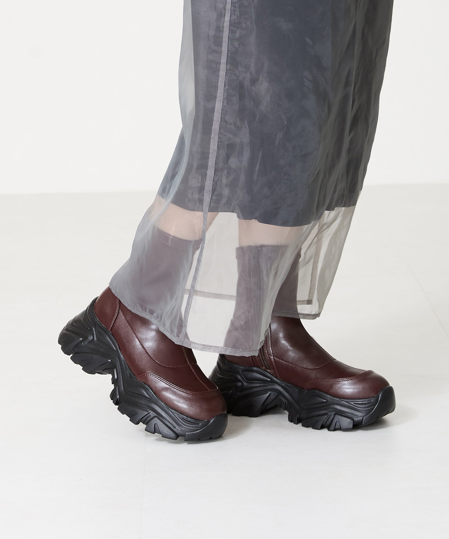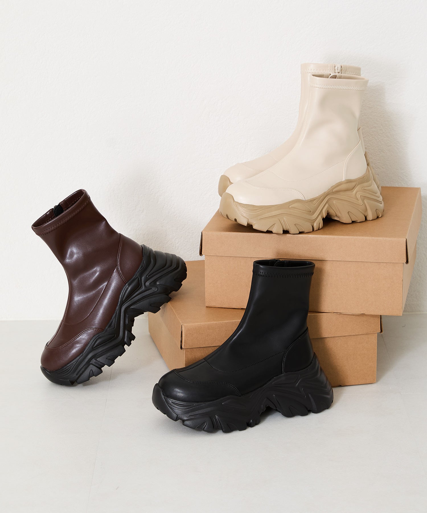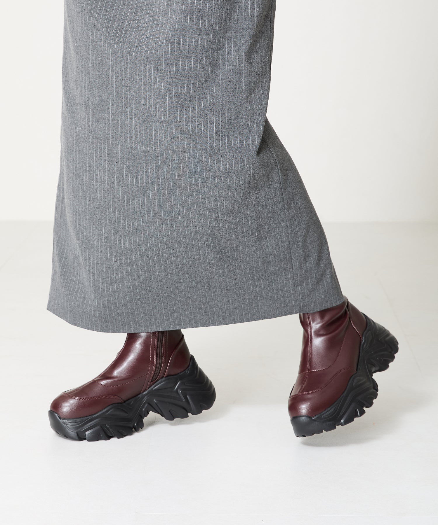 とことんボリュームを持たせたスニーカーソールがインパクト大のブーツは、履くだけでコーディネートの主役になる1足。筒回りはストレッチ素材で足当たりが良くフィットするので、ボリューミーなソールと組み合わせることで細見え効果が抜群。ソールには軽量で柔らかい材質を使用しているので見た目以上に歩きやすく疲れにくいので、今季手に入れたいマストアイテム。