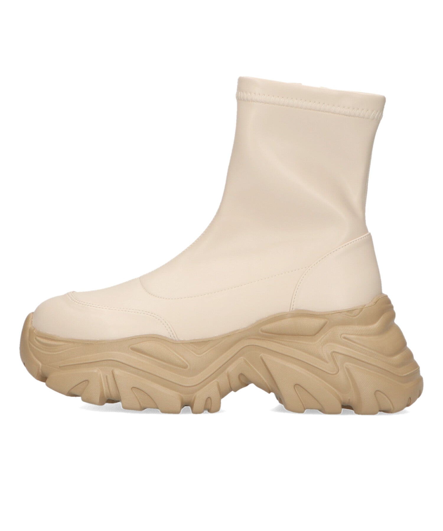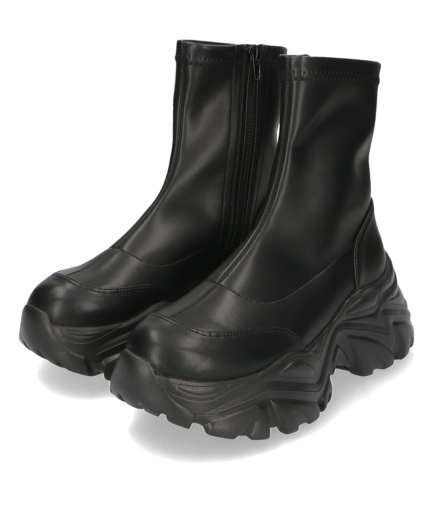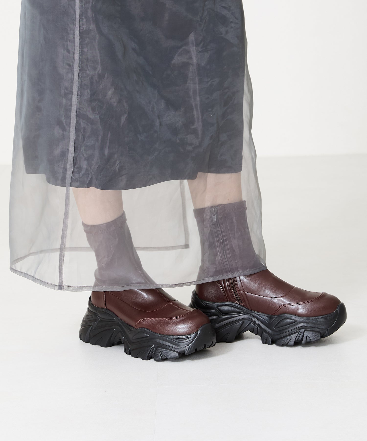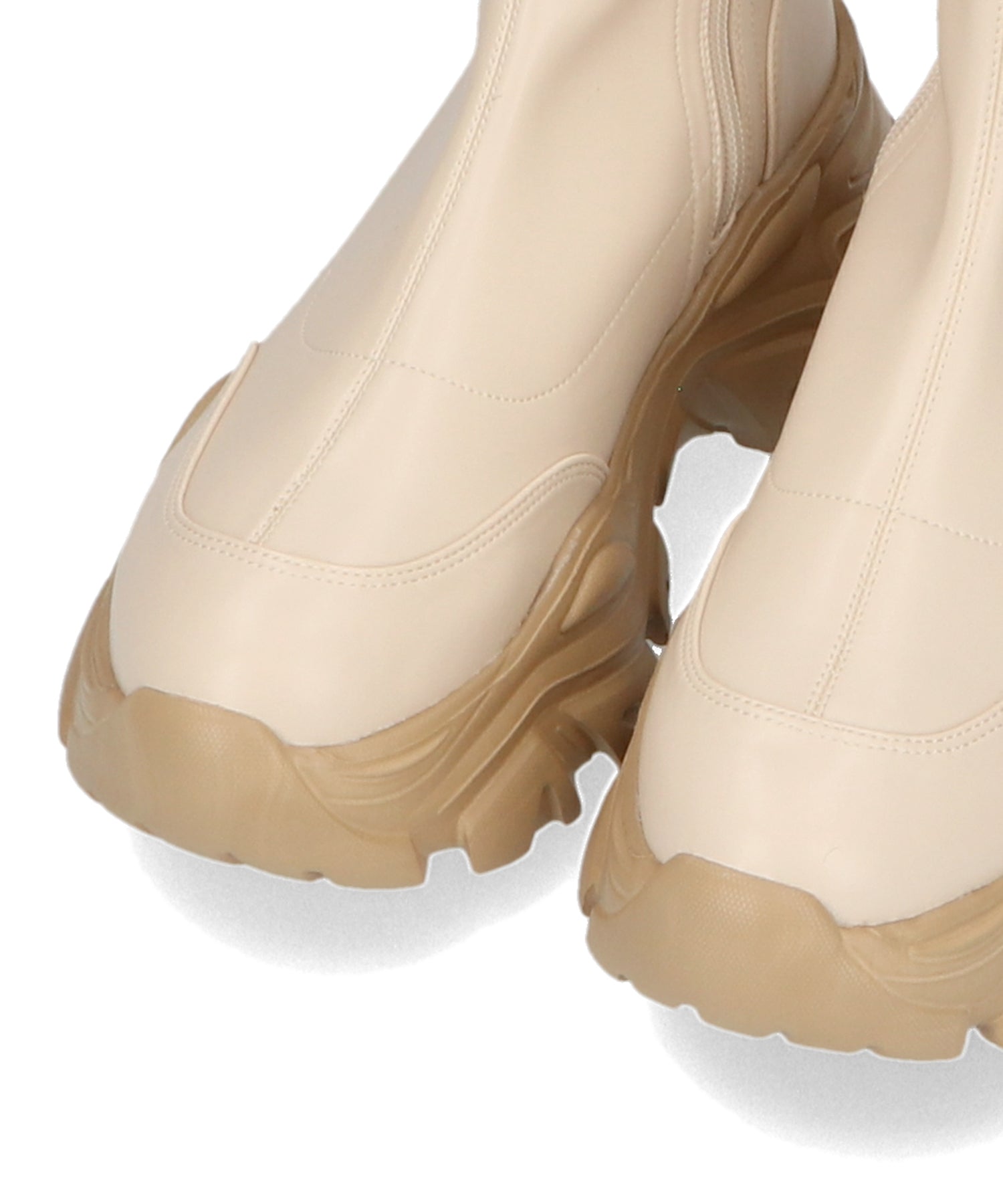 とことんボリュームを持たせたスニーカーソールがインパクト大のブーツは、履くだけでコーディネートの主役になる1足。筒回りはストレッチ素材で足当たりが良くフィットするので、ボリューミーなソールと組み合わせることで細見え効果が抜群。ソールには軽量で柔らかい材質を使用しているので見た目以上に歩きやすく疲れにくいので、今季手に入れたいマストアイテム。