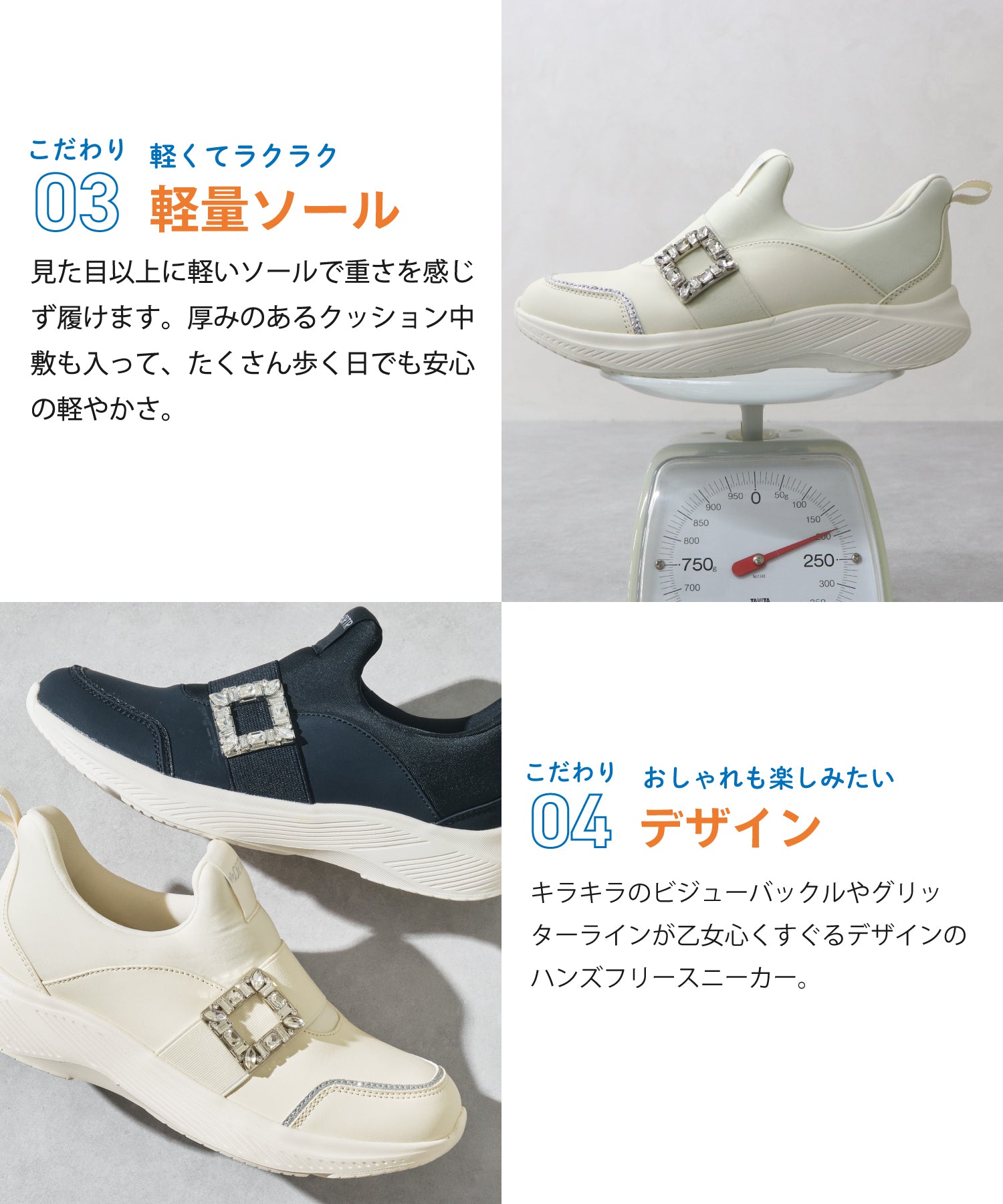 キラキラのビジューバックルやグリッターラインが乙女心くすぐるデザインのハンズフリースニーカーは、手を使わずにさっと履けるので着脱のストレスがないのが嬉しい。クッション性にこだわりフィット感が心地よく、軽量でたくさん歩いても疲れにくいので楽に履きたいけどおしゃれも楽しみたい方におすすめ。ベーシックなカラバリが使いやすくオールシーズン履けるのもポイント。