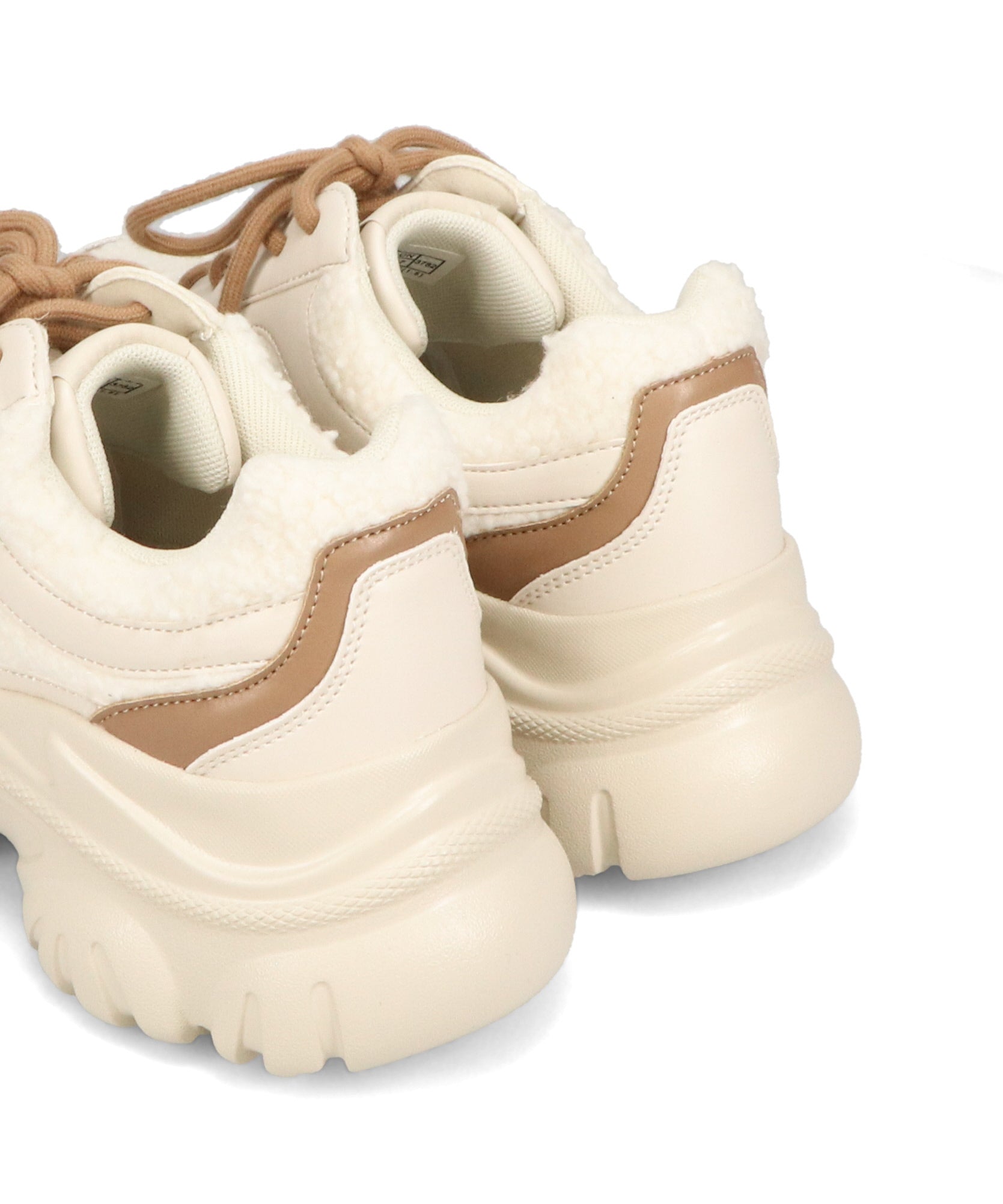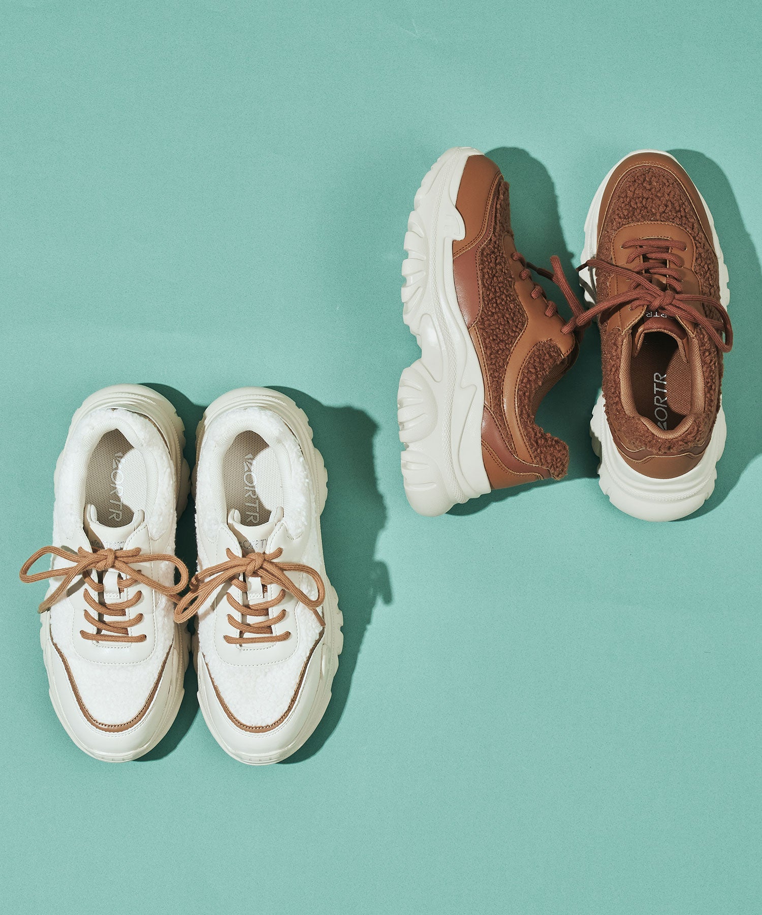 思わず触りたくなるほどモコモコのボアをたっぷり使用したシーズンムード高まるスニーカー。丸みのあるつま先や、ボリューミーな厚底ソールと組み合わせることで、とことん存在感のある今っぽいシルエットに。中敷クッションは厚みと弾力があるので足裏への負担を軽減してくれるのもポイント。コーデの主役になるデザインも肌に馴染みやすい柔らかい雰囲気の2色展開。