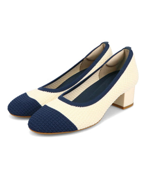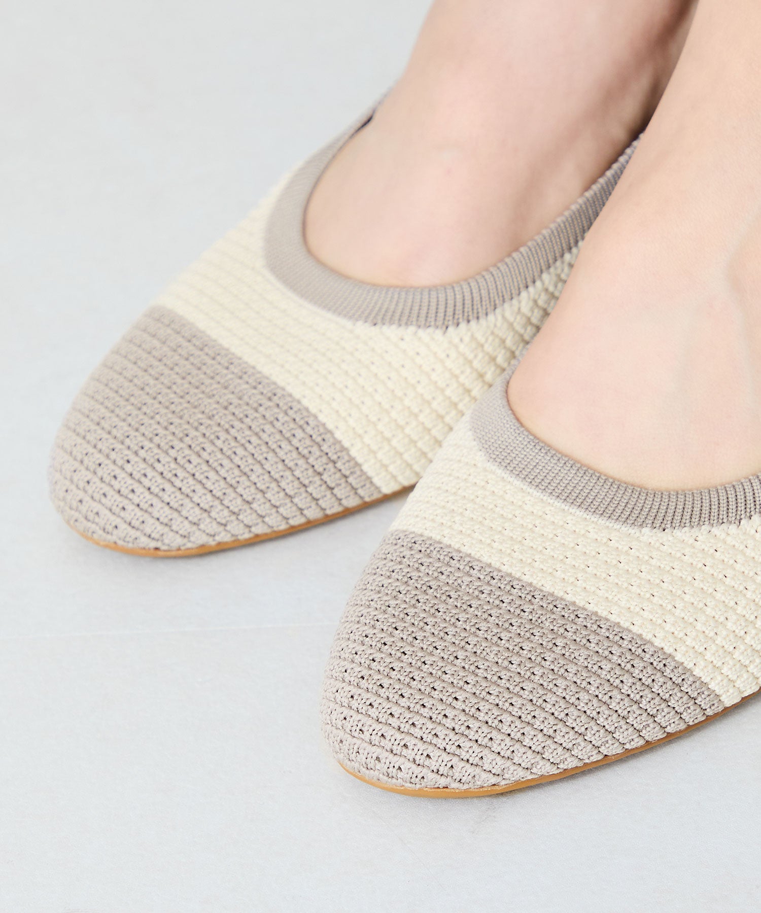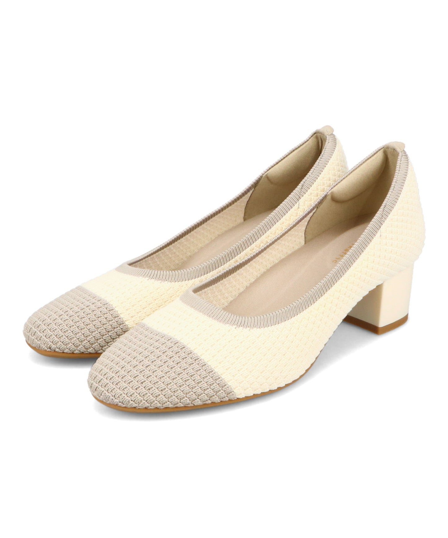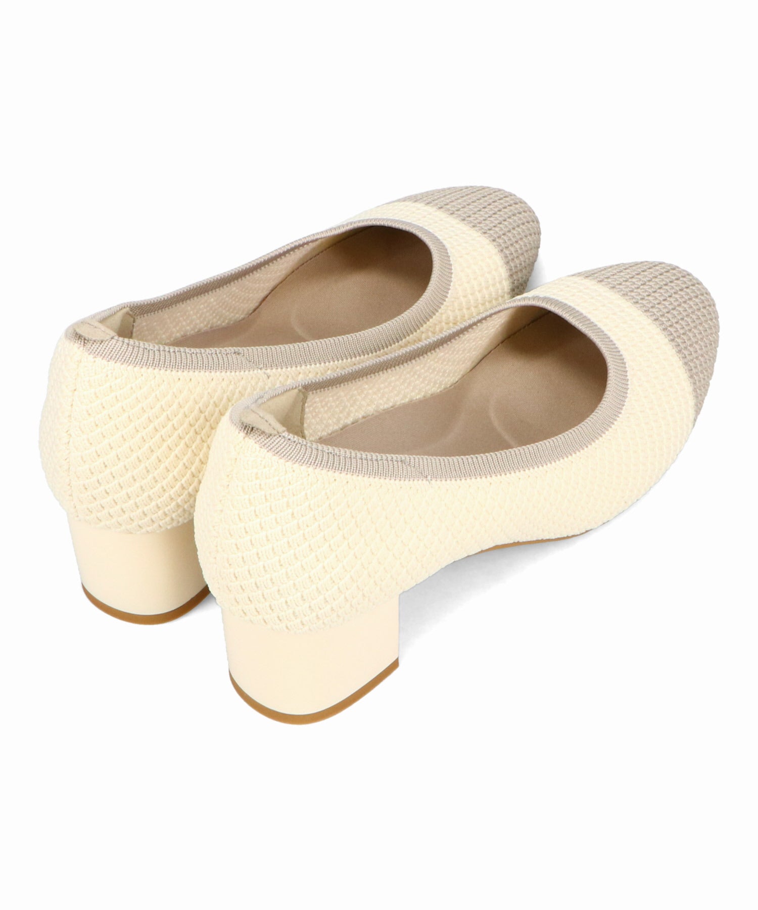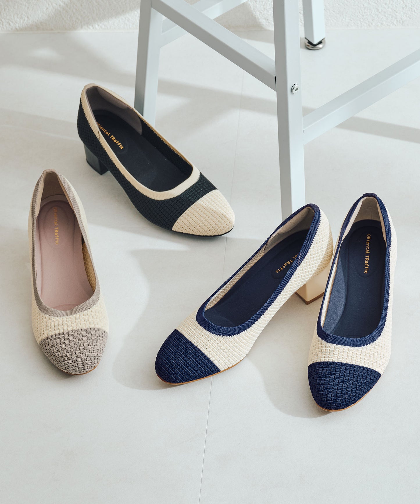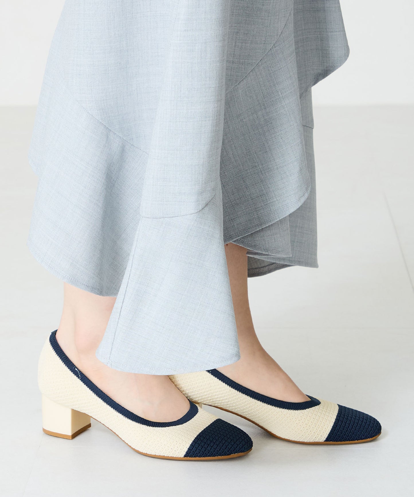 アッパー全体にニット素材を使用した柔らかい足当たりが魅力のパンプスは、つま先と履き口周りをバイカラーの配色にし足元に取り入れるだけでおしゃれ度アップ。丸みのあるラウンドトゥで指先への負担が少なく、4.5cmのヒールは接地面が広いチャンキーヒールで安定感も◎。クッションを搭載した中敷や踵のクッションが足全体を支えてくれ長時間の歩行も安心。