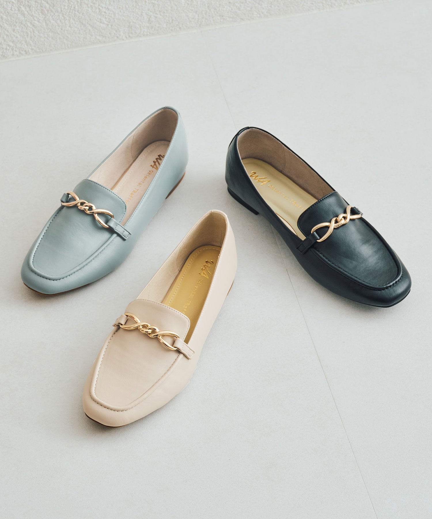 ゴールドのチェーンモチーフがアクセントのローファーは、オンオフ問わずきれいめにもカジュアルにも合わせられるのでマルチに活躍してくれる1足。履きやすいフラットヒールに加え、中敷には厚手のクッションが入っているので長時間歩いても足裏が疲れにくい。踵は芯を入れずに柔らかく仕上げたりと、細部までこだわり抜いたシンプルで使いやすい大人ローファー。
