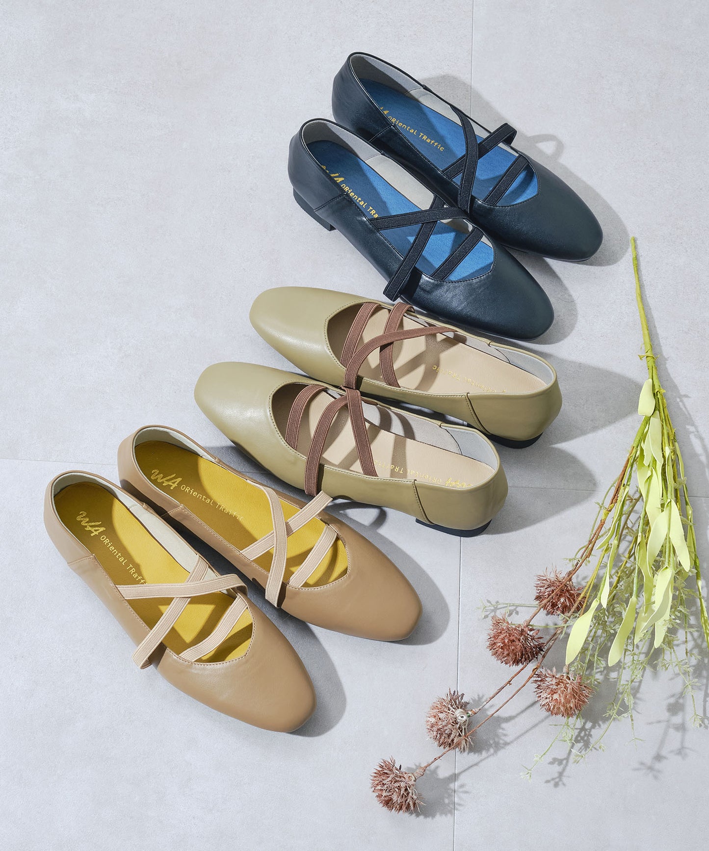 踵が踏めるバブーシュデザインのフラットパンプスは、複雑に配置されたゴムベルトで足の甲にしっかりとフィットしながらもどこか遊び心を感じさせるデザインに。程よく丸みのあるスクエアトゥに、履き口はVカットにすることで女性らしさをオン。厚手の中敷クッションに加え、先芯まで柔らかいものを採用することで、フィット感や履き心地を追及したこだわりのパンプス。