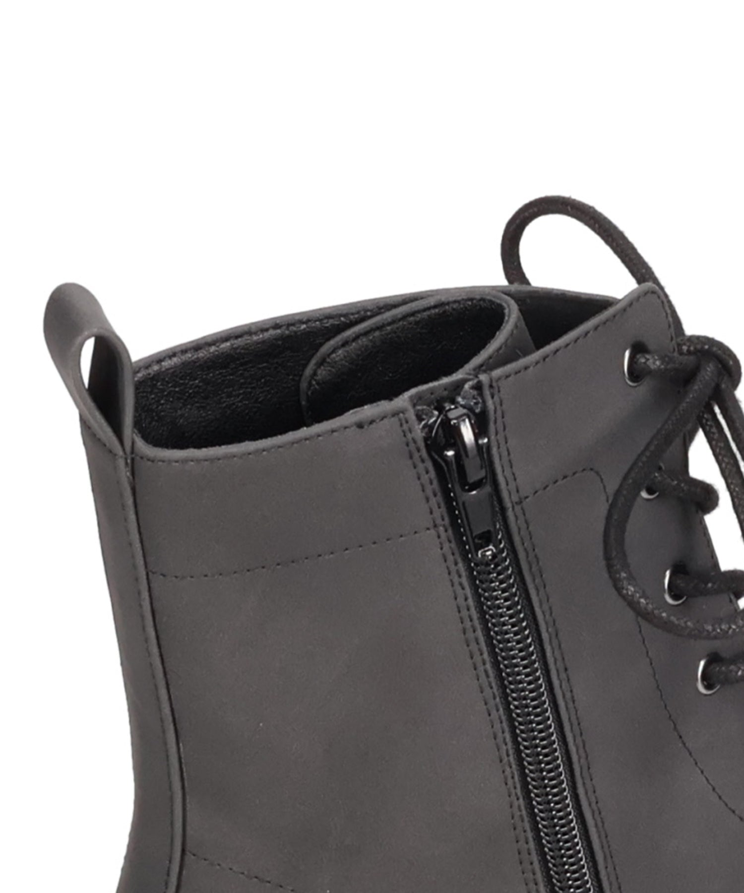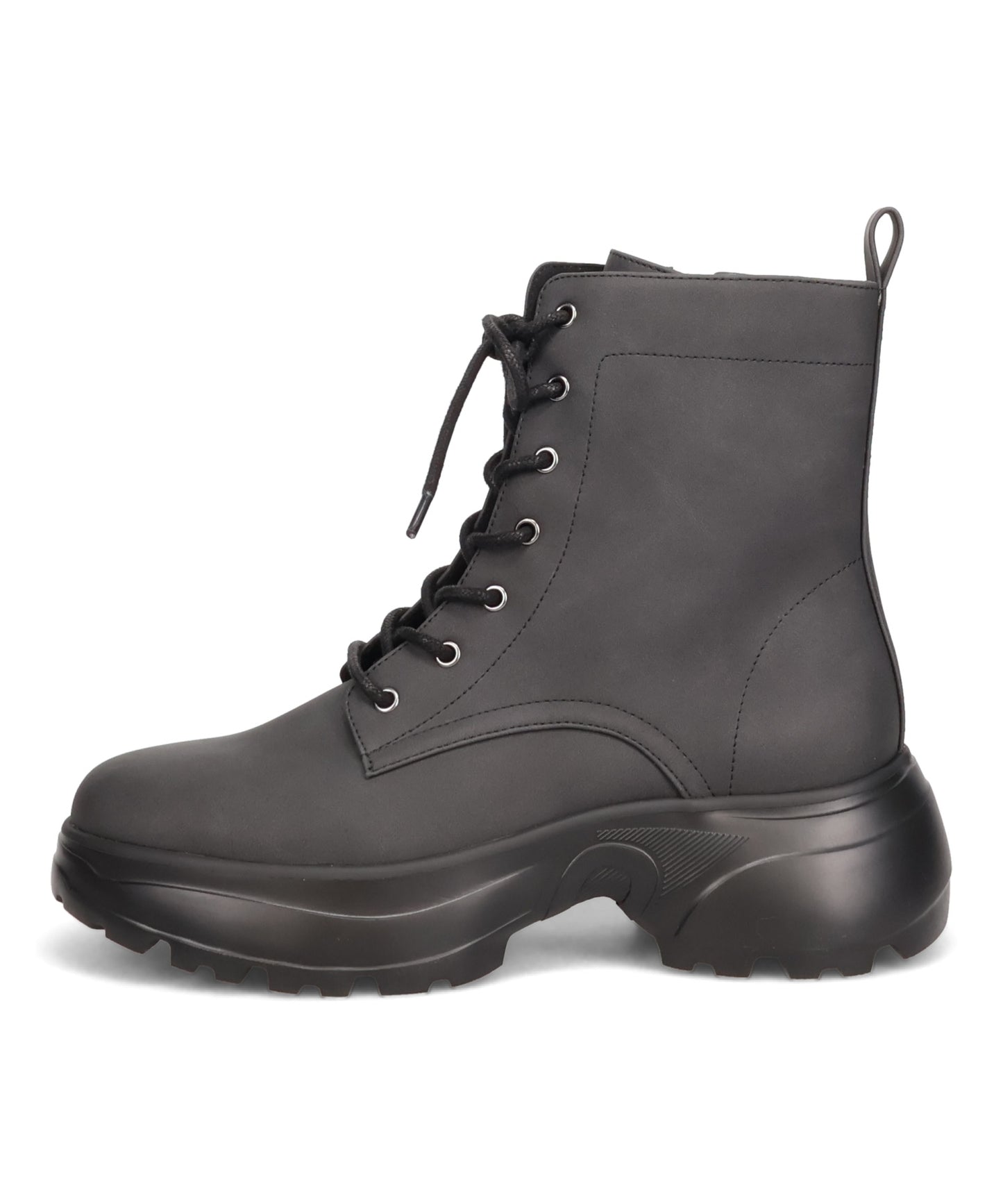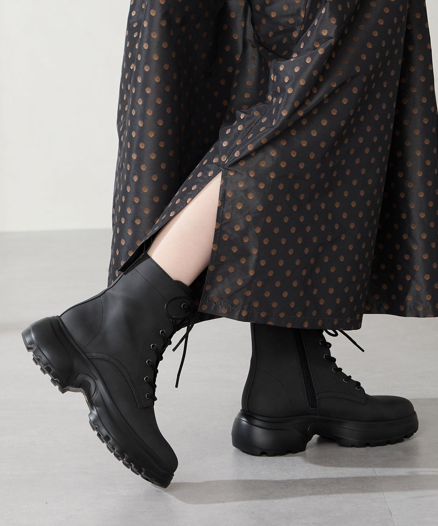 丸みを帯びたボリュームソールが可愛らしいレースアップブーツは、シボのあるマットな質感のマテリアルが高見えするアイテム。太めのシューレースでマニッシュな印象ながらも、ハトメを付けたデザインでエッジを効かせたディテールをプラス。足裏にフィットする凹凸を付けたクッション入りのインソールや、厚みのあるナイロン素材を使用した裏側で快適な歩き心地を実現。