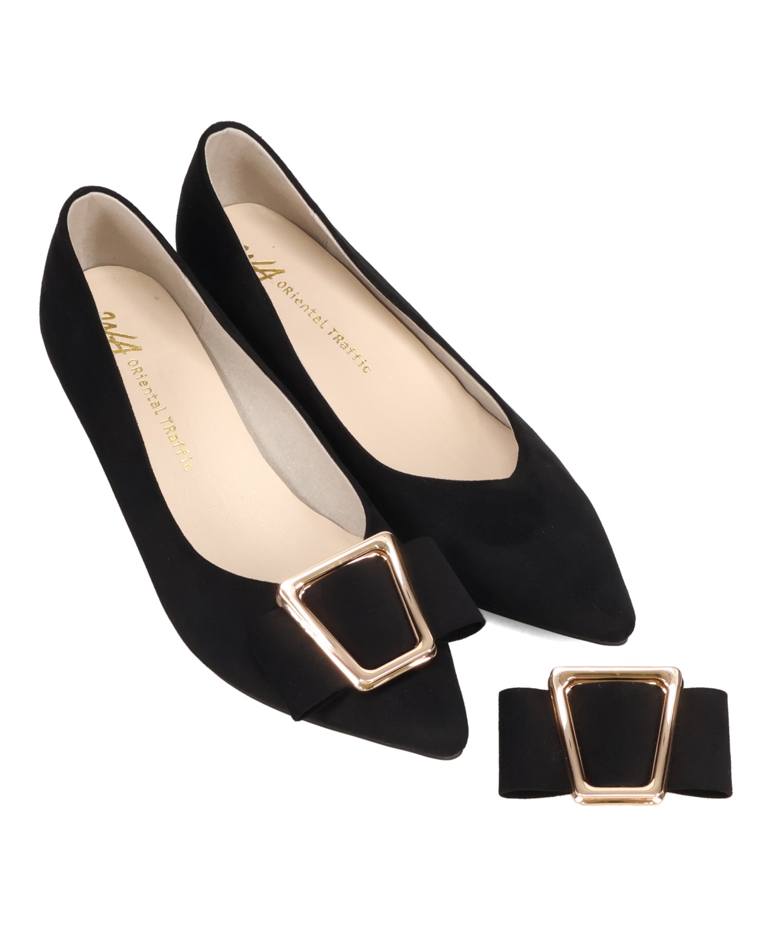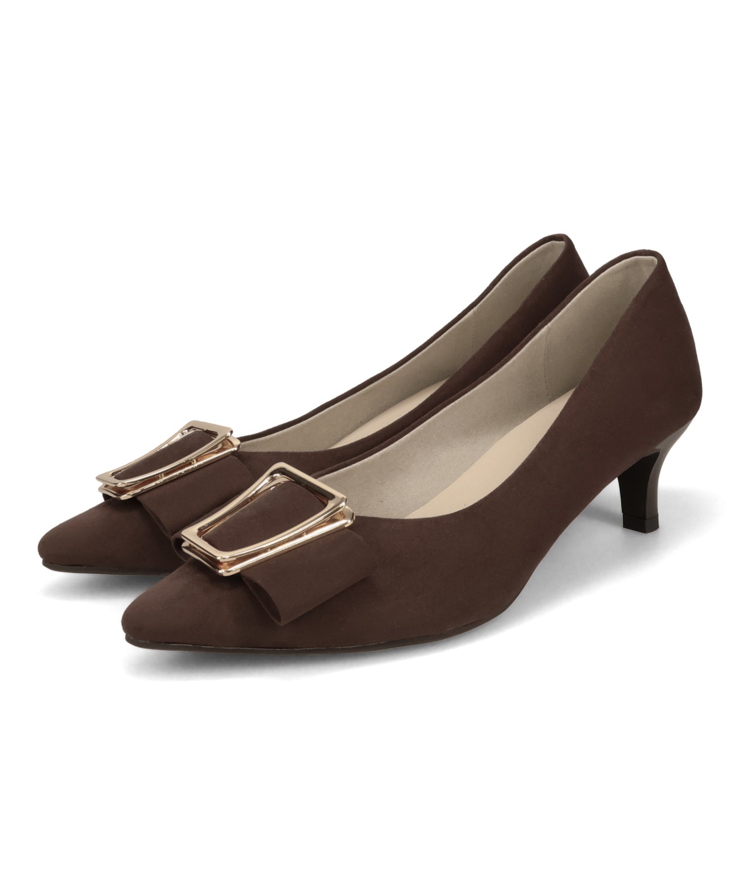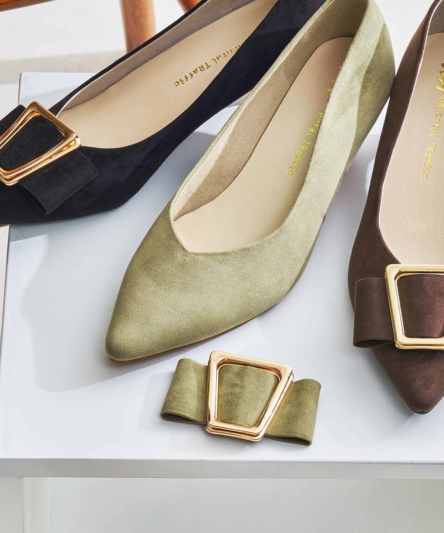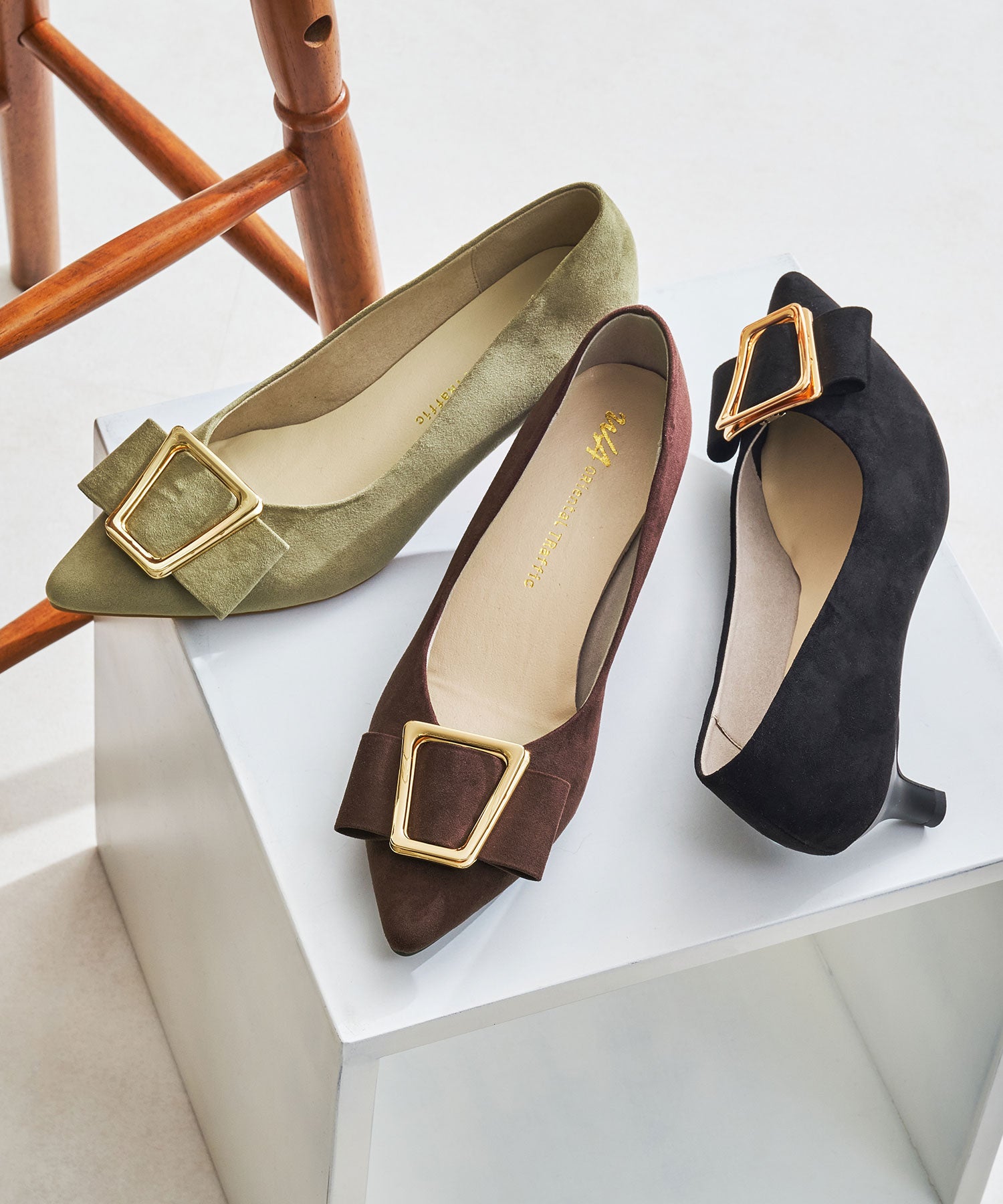 シャープなポインテッドトゥに華奢なヒールが女性らしさを引き立たせてくれるパンプス。大ぶりのモチーフは、クリップ式で付け外しが可能でシーンに合わせての使い分けが可能。つま先や中敷にクッションを入れることでヒールでも歩きやすい設計に。今期はベーシックで万能なブラック、トレンド人気のブラウン、春らしく差し色にもなるくすみグリーンの嬉しい3足展開。