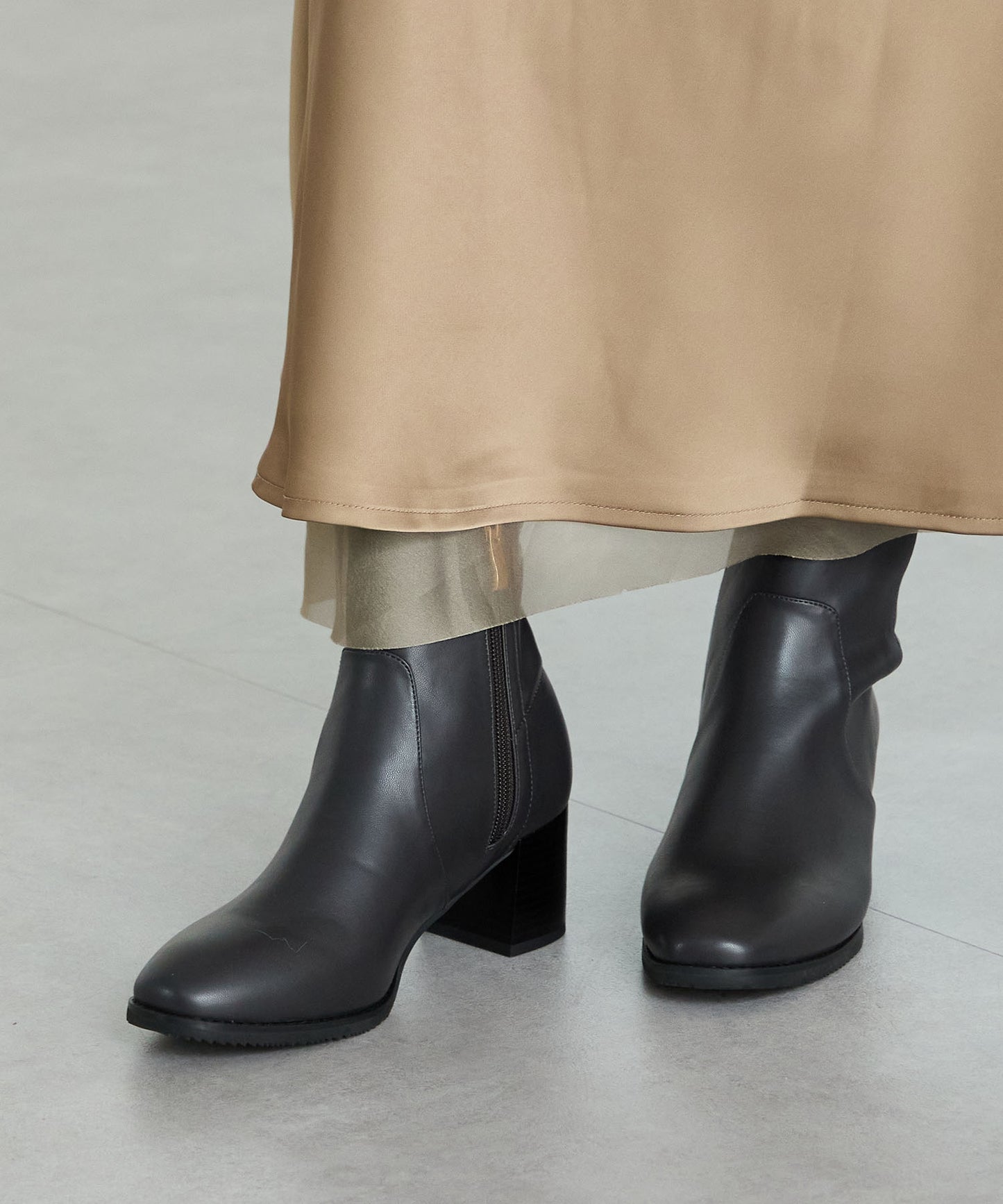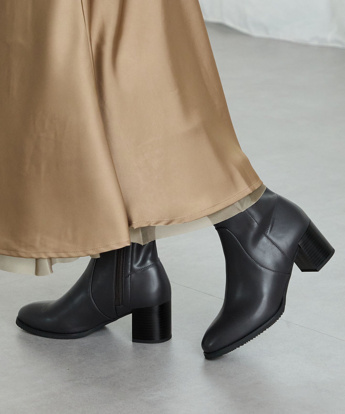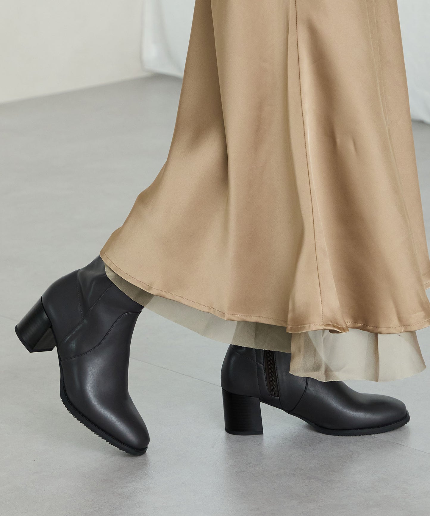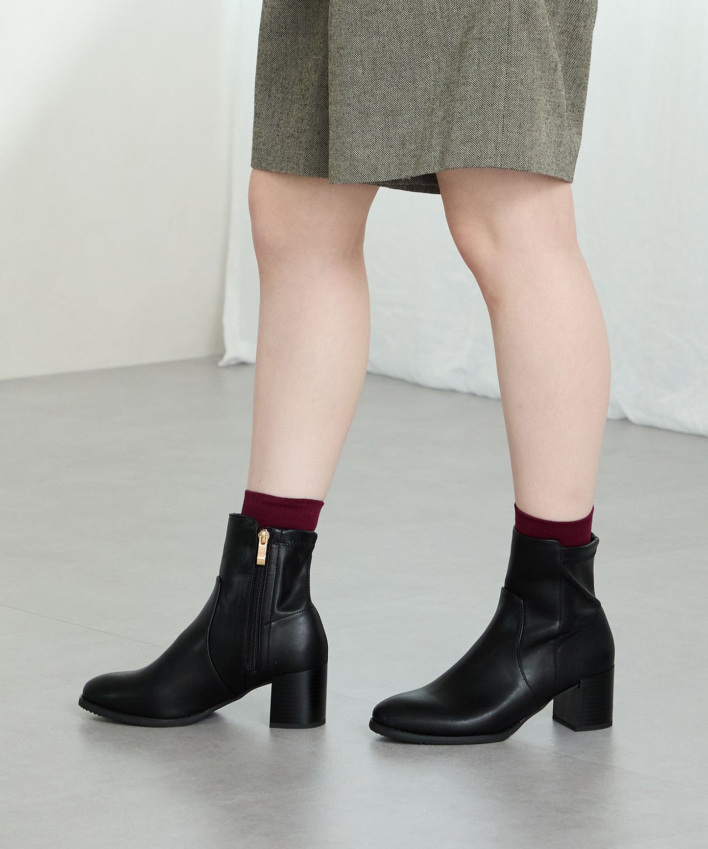 シルエットにとことんこだわった美脚効果抜群のブーツは、後ろ側を切り替え、伸縮性のあるストレッチ素材を使用することで圧迫感がなく、ストレスのない履き心地。カラー毎に素材を変えているのでお洋服の雰囲気に合わせて選ぶことが出来る。6㎝ヒールでも太めのチャンキーヒールにすることで歩行が安定し、疲れにくい。履き口に段差を付けたり、内側のゴールドのジップがアクセントに。