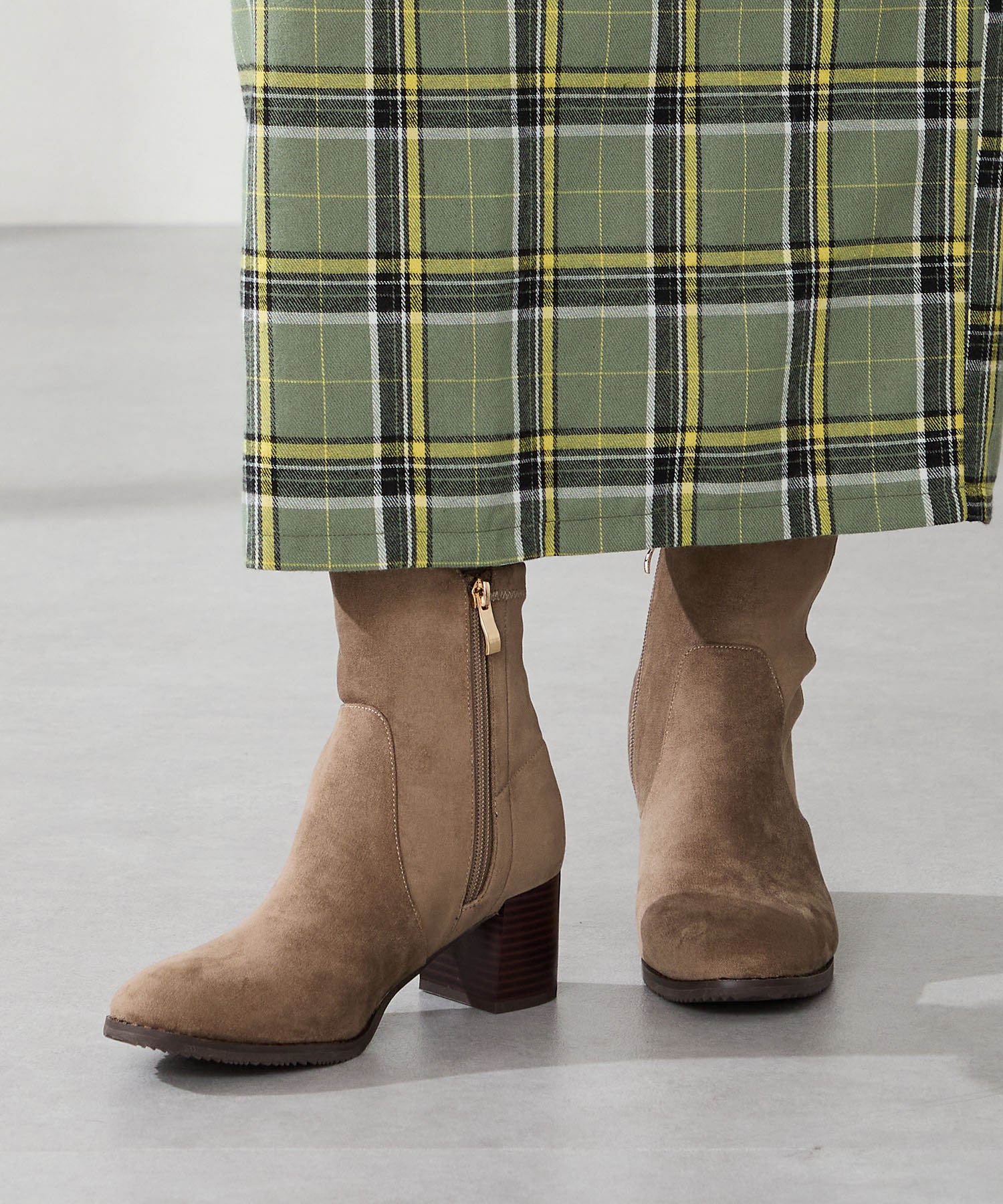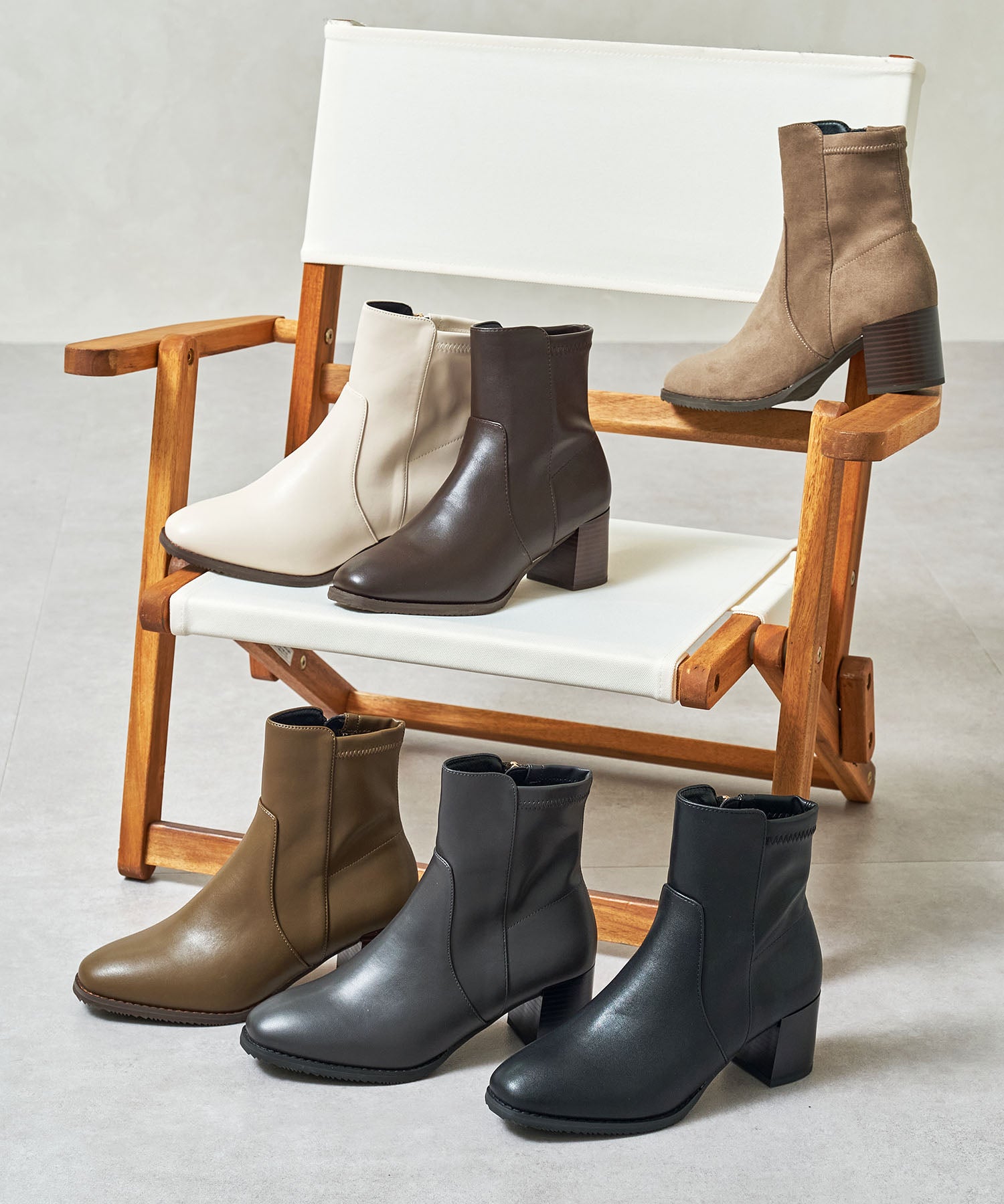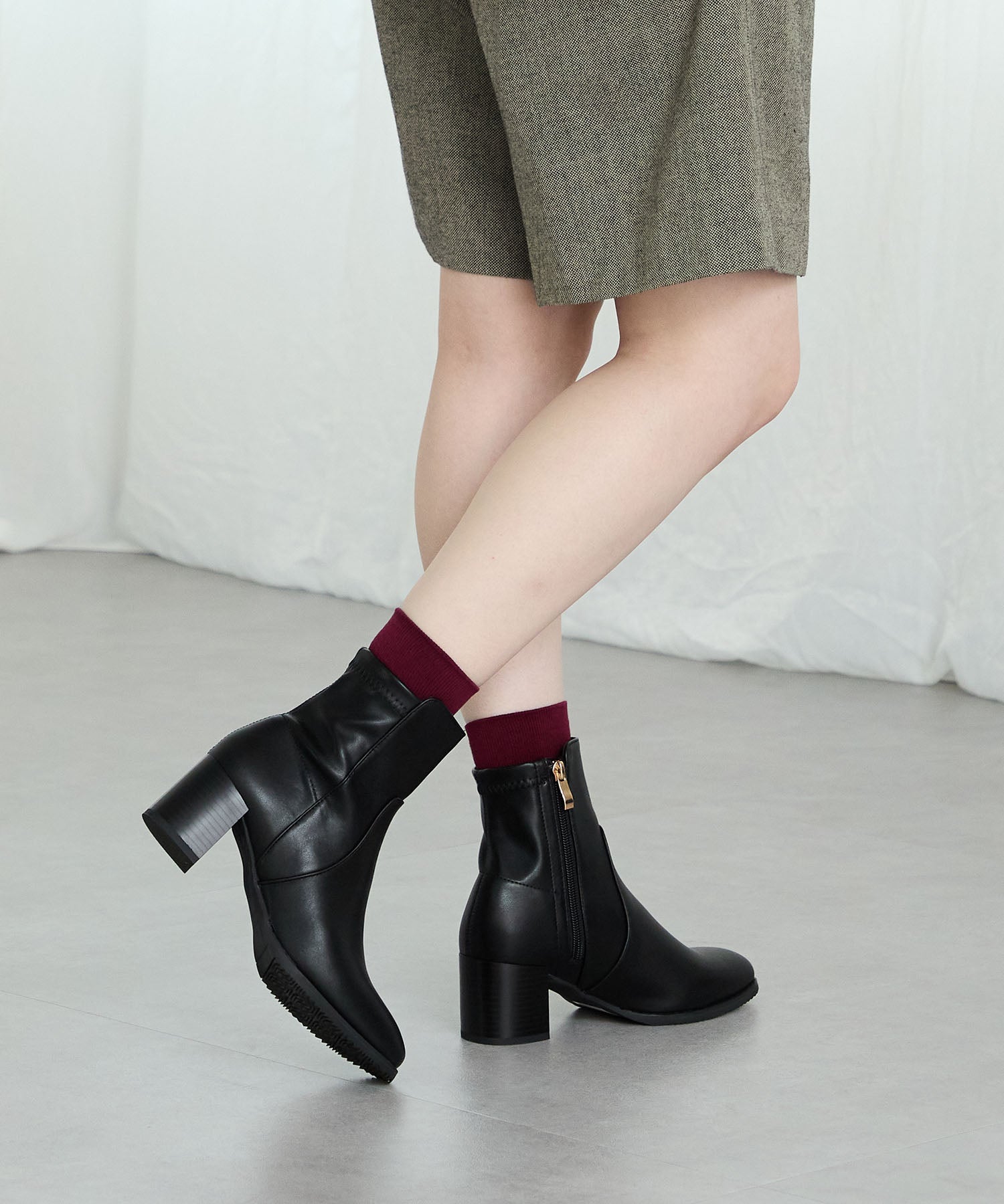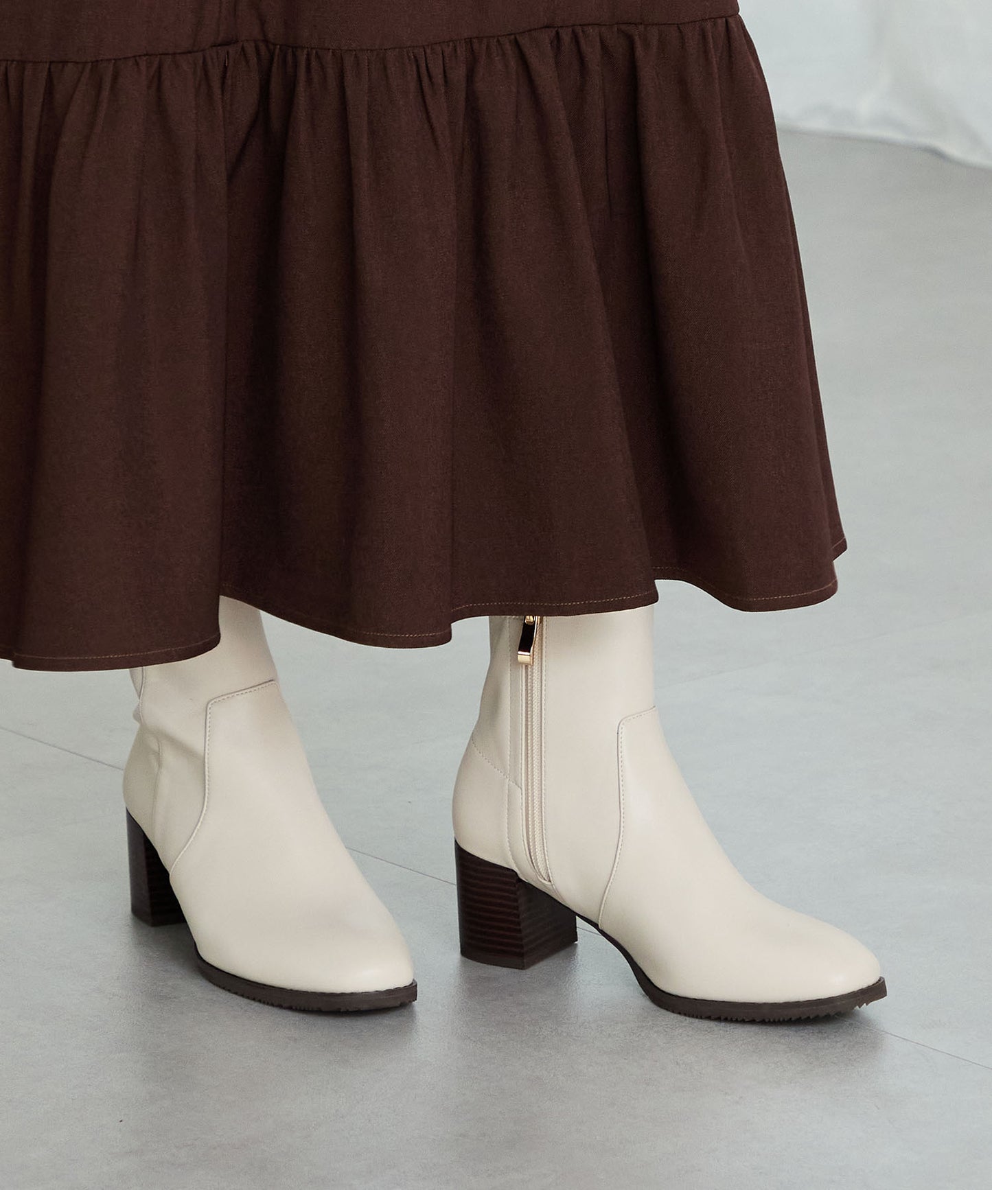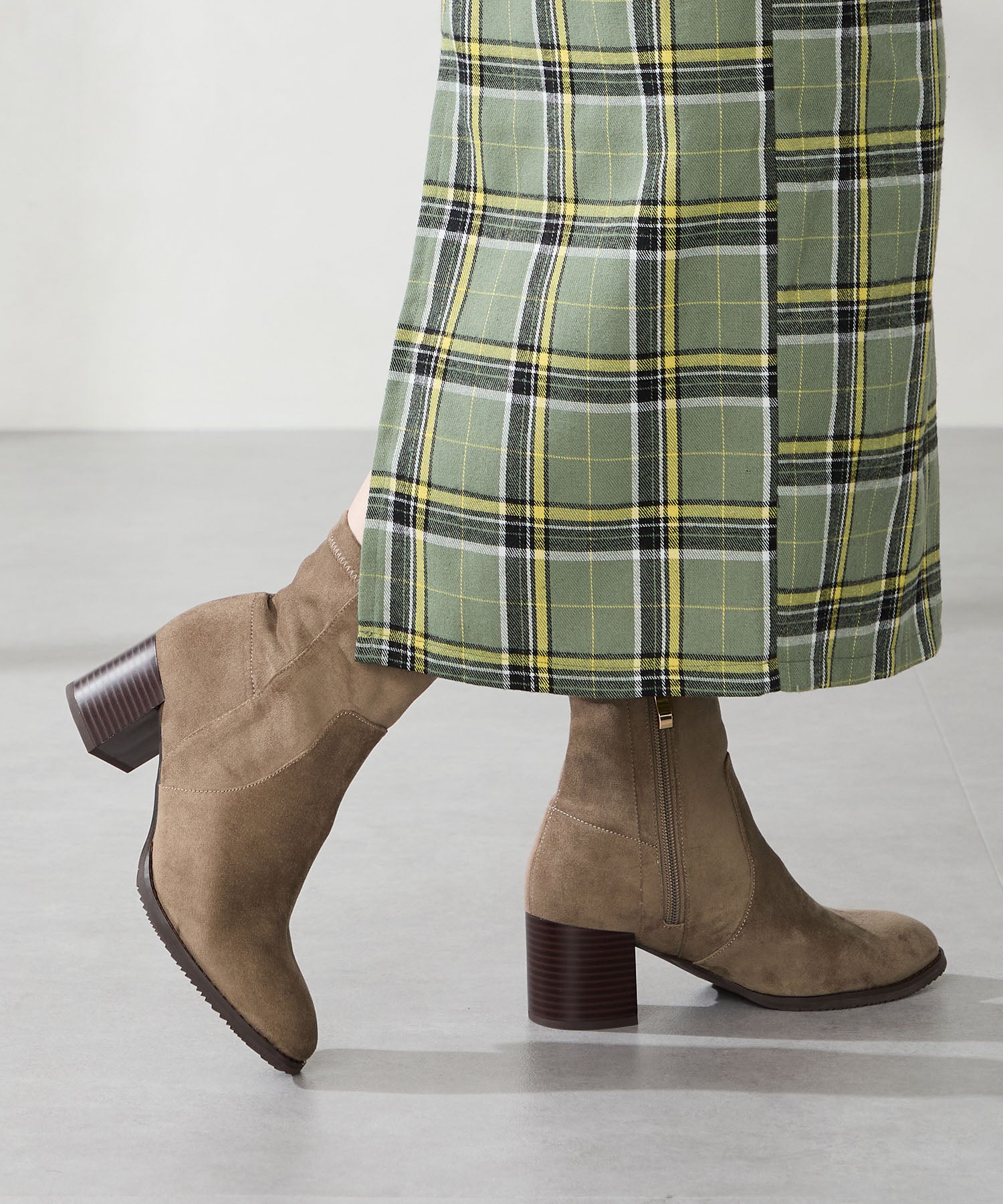 シルエットにとことんこだわった美脚効果抜群のブーツは、後ろ側を切り替え、伸縮性のあるストレッチ素材を使用することで圧迫感がなく、ストレスのない履き心地。カラー毎に素材を変えているのでお洋服の雰囲気に合わせて選ぶことが出来る。6㎝ヒールでも太めのチャンキーヒールにすることで歩行が安定し、疲れにくい。履き口に段差を付けたり、内側のゴールドのジップがアクセントに。