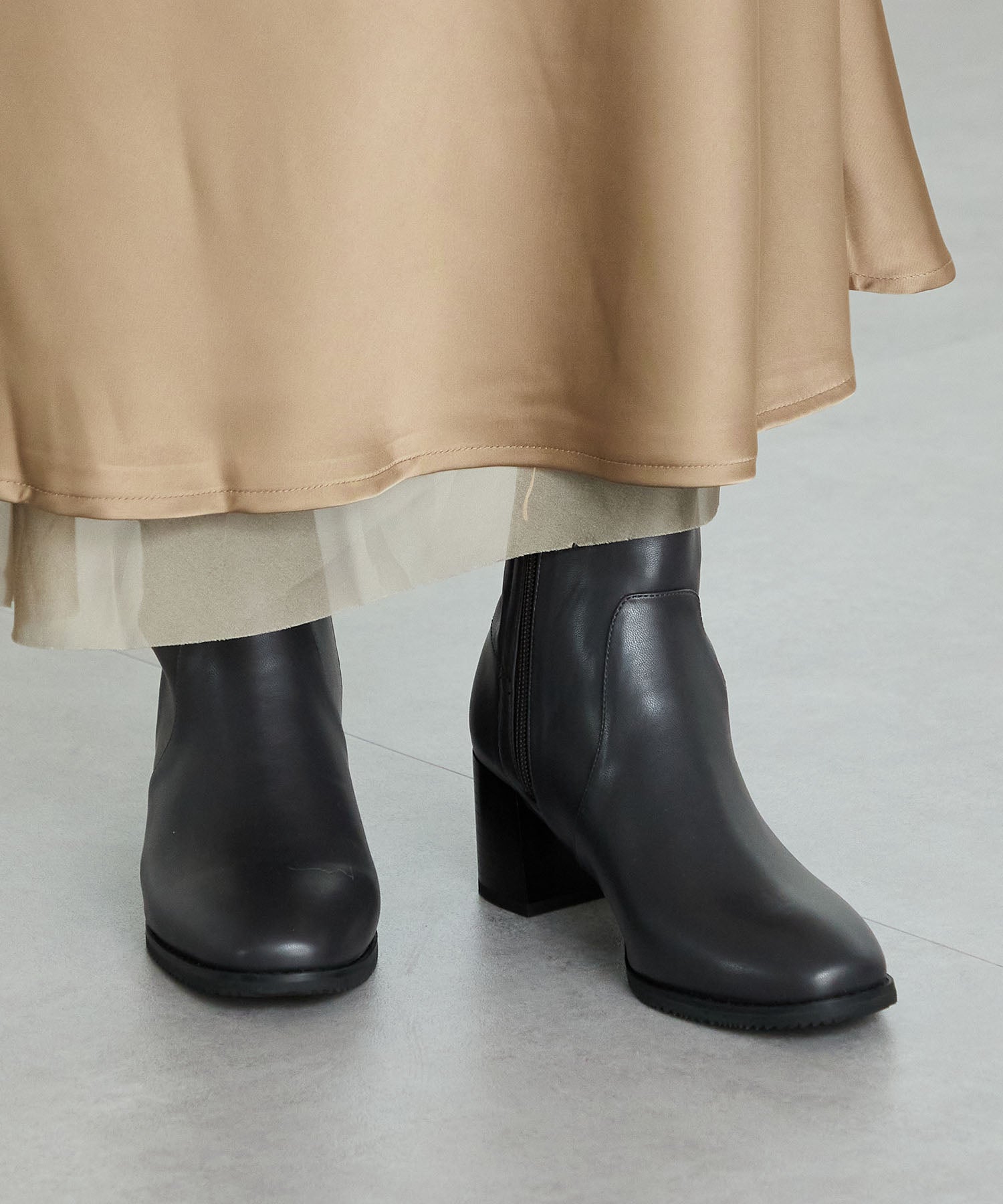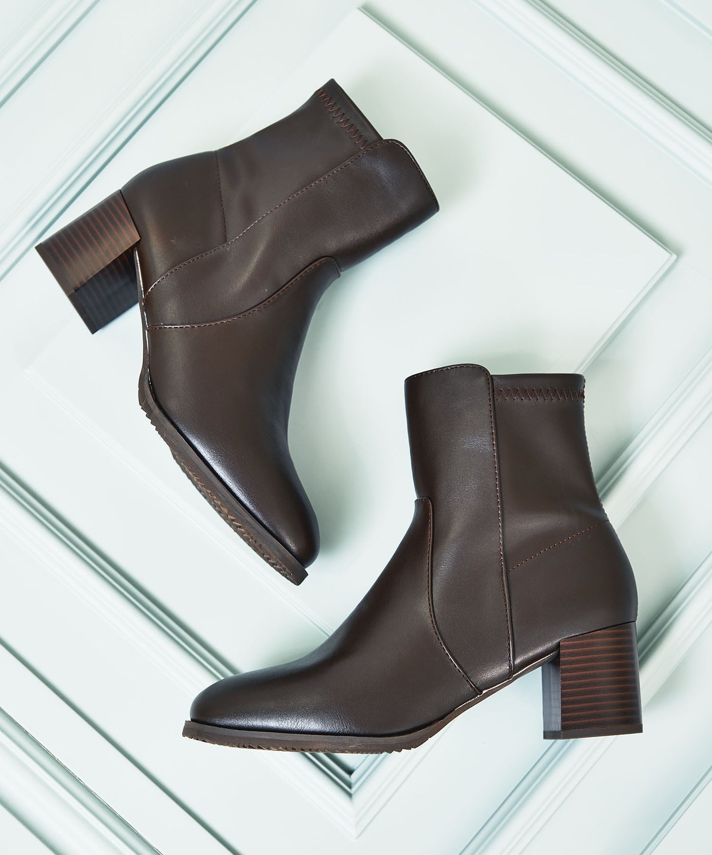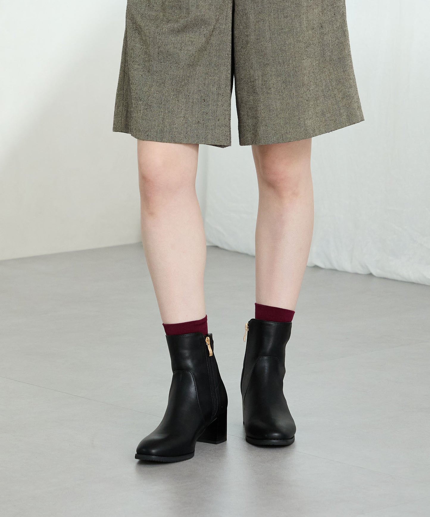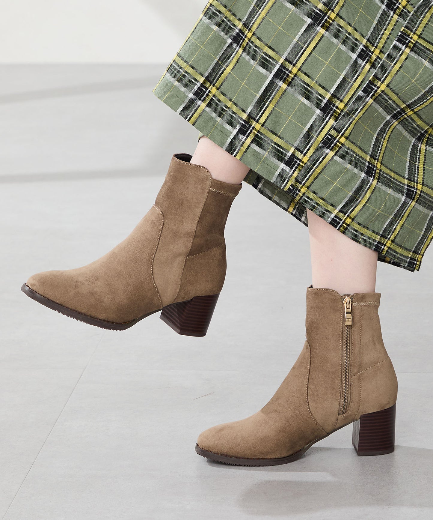 シルエットにとことんこだわった美脚効果抜群のブーツは、後ろ側を切り替え、伸縮性のあるストレッチ素材を使用することで圧迫感がなく、ストレスのない履き心地。カラー毎に素材を変えているのでお洋服の雰囲気に合わせて選ぶことが出来る。6㎝ヒールでも太めのチャンキーヒールにすることで歩行が安定し、疲れにくい。履き口に段差を付けたり、内側のゴールドのジップがアクセントに。