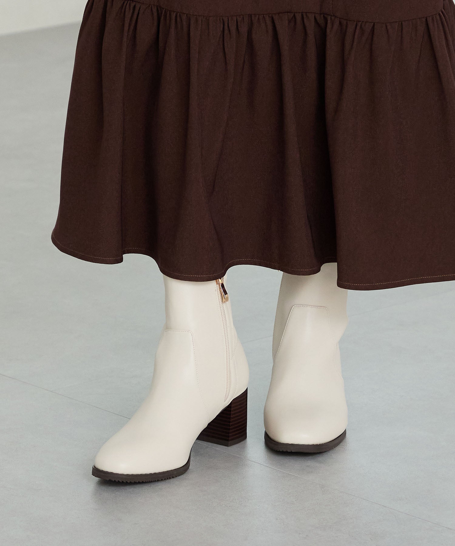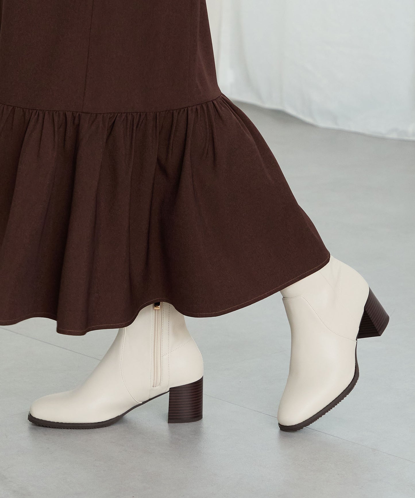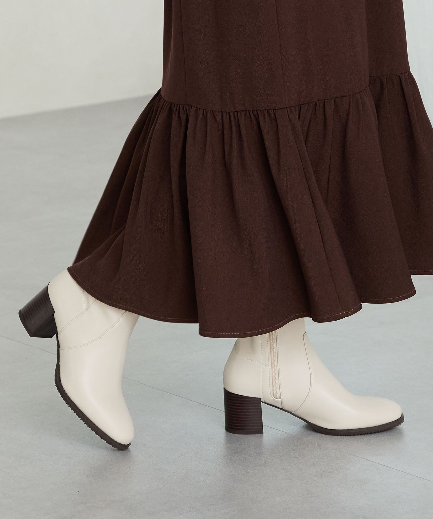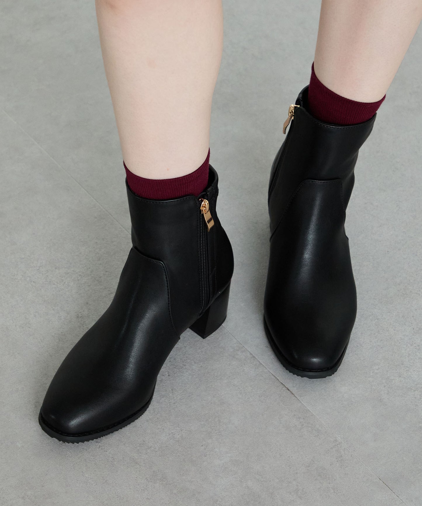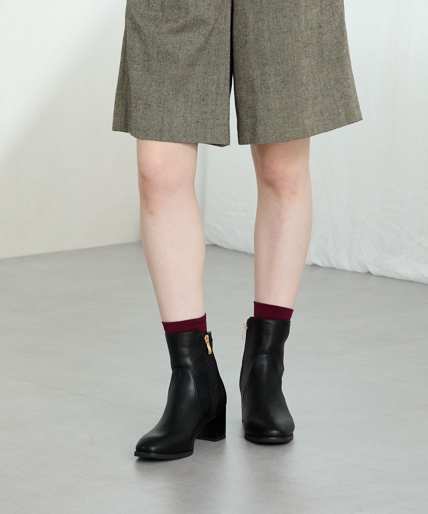 シルエットにとことんこだわった美脚効果抜群のブーツは、後ろ側を切り替え、伸縮性のあるストレッチ素材を使用することで圧迫感がなく、ストレスのない履き心地。カラー毎に素材を変えているのでお洋服の雰囲気に合わせて選ぶことが出来る。6㎝ヒールでも太めのチャンキーヒールにすることで歩行が安定し、疲れにくい。履き口に段差を付けたり、内側のゴールドのジップがアクセントに。