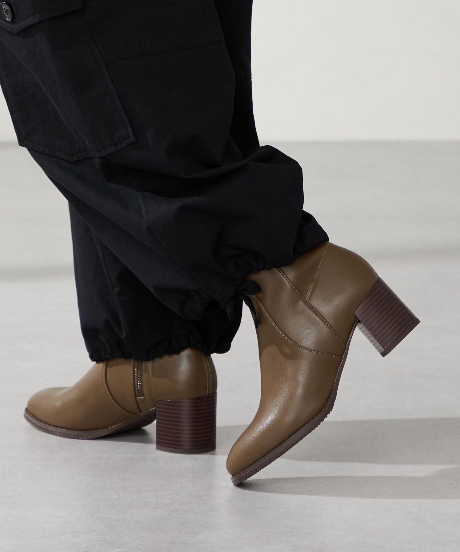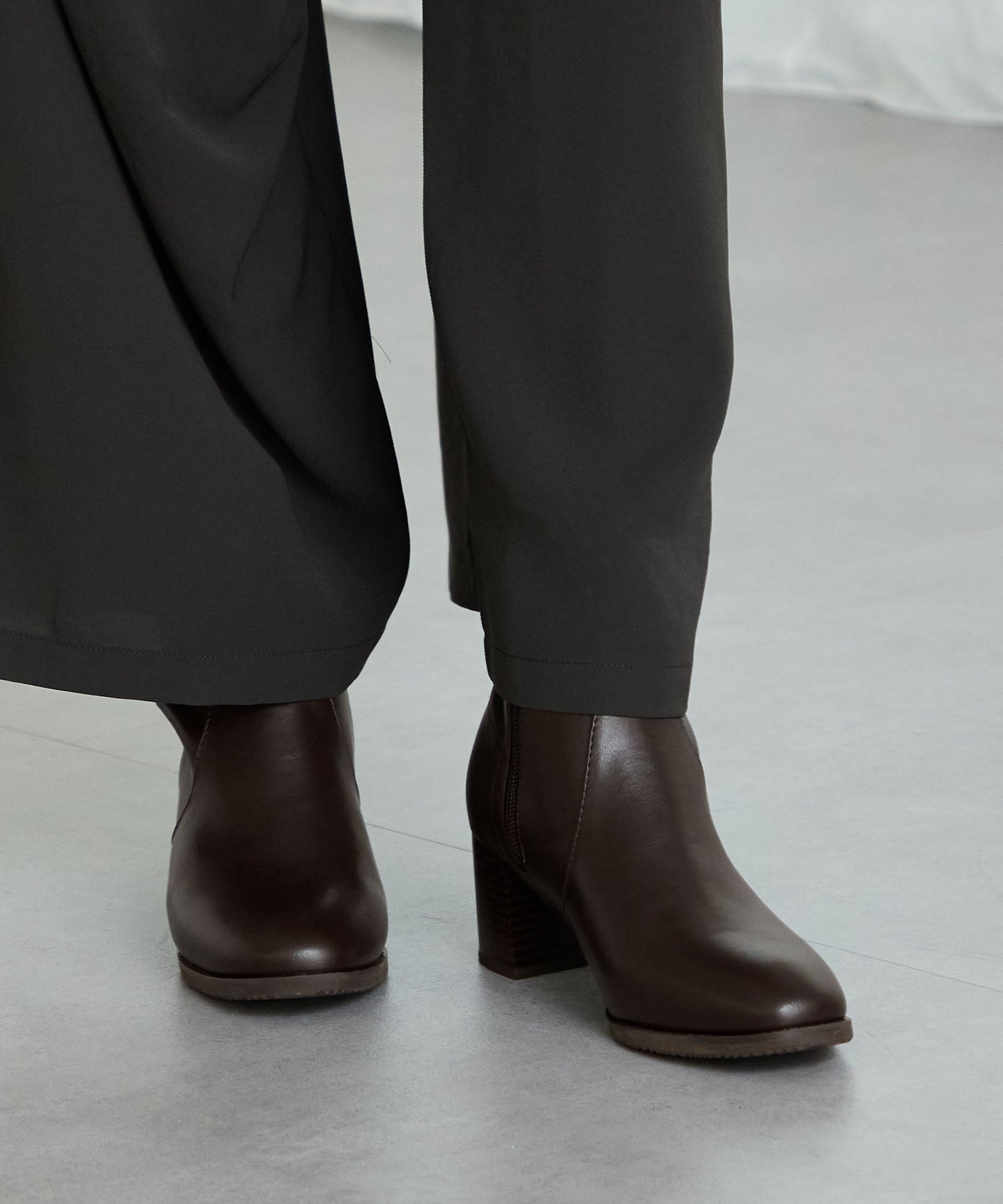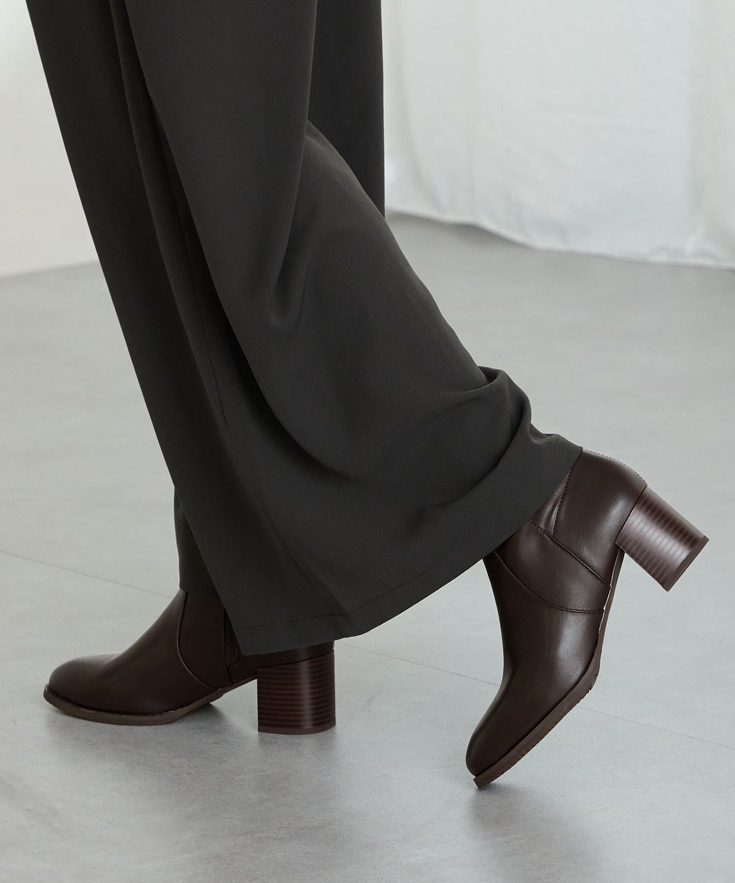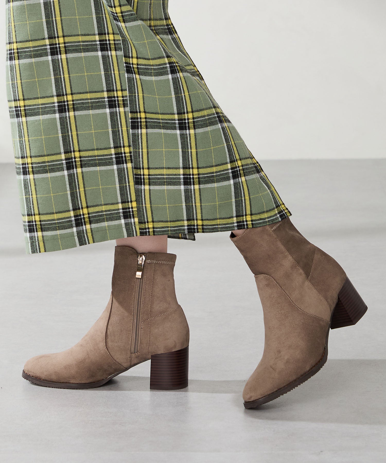シルエットにとことんこだわった美脚効果抜群のブーツは、後ろ側を切り替え、伸縮性のあるストレッチ素材を使用することで圧迫感がなく、ストレスのない履き心地。カラー毎に素材を変えているのでお洋服の雰囲気に合わせて選ぶことが出来る。6㎝ヒールでも太めのチャンキーヒールにすることで歩行が安定し、疲れにくい。履き口に段差を付けたり、内側のゴールドのジップがアクセントに。