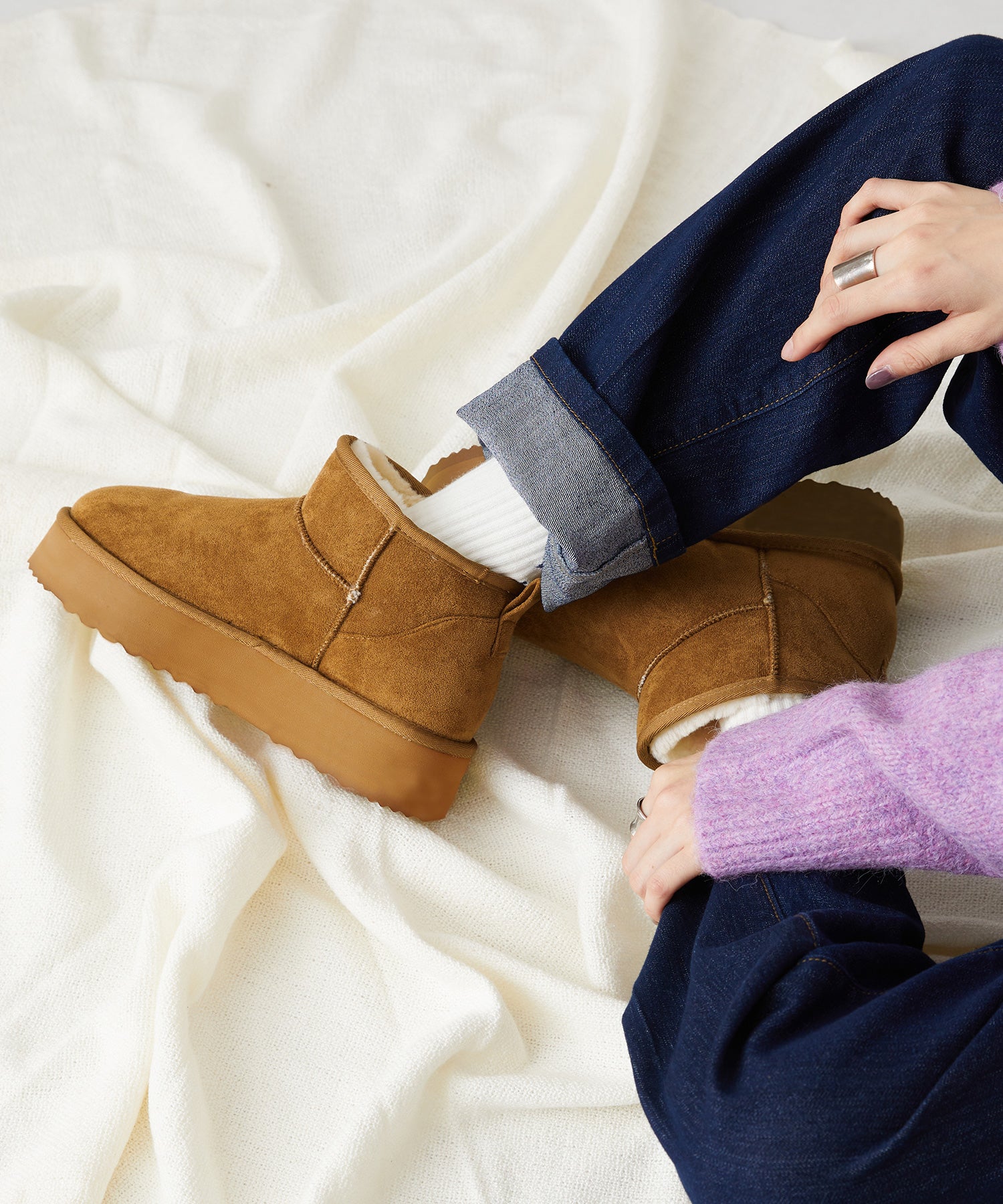 ボリュームのあるシルエットがトレンドライクなムートンブーツは、今季も持っておきたい冬のマストアイテム。厚底ヒールで自然とスタイルアップも叶いつつ、安定感のある履き心地でたくさん歩く日にもおすすめ。中敷部分や内側全体には、足を包み込むたっぷりのフェイクファーを施し、防寒対策にぴったり。どんなスタイリングにもはまるショート丈で、デイリー使いしたくなる1足。