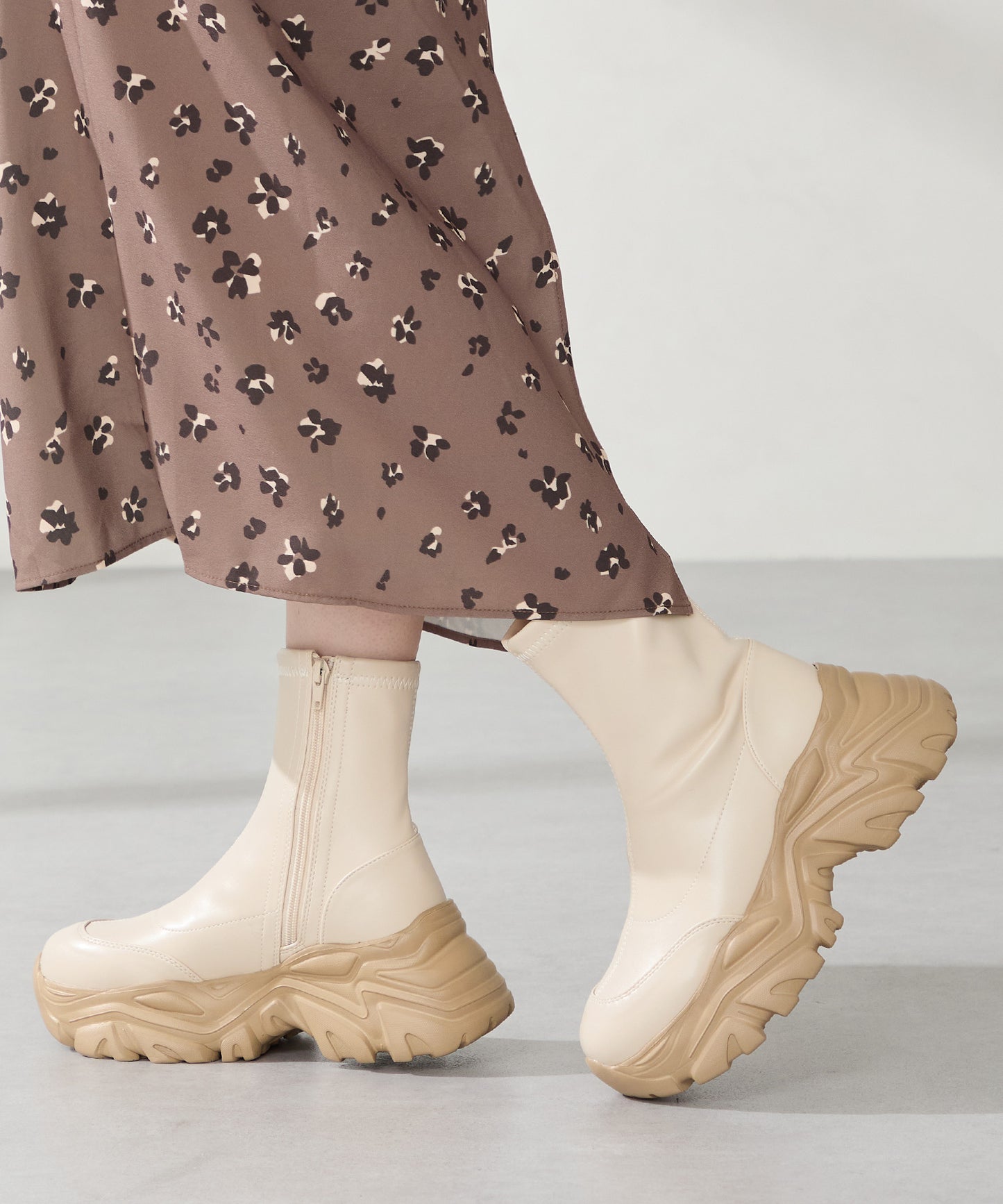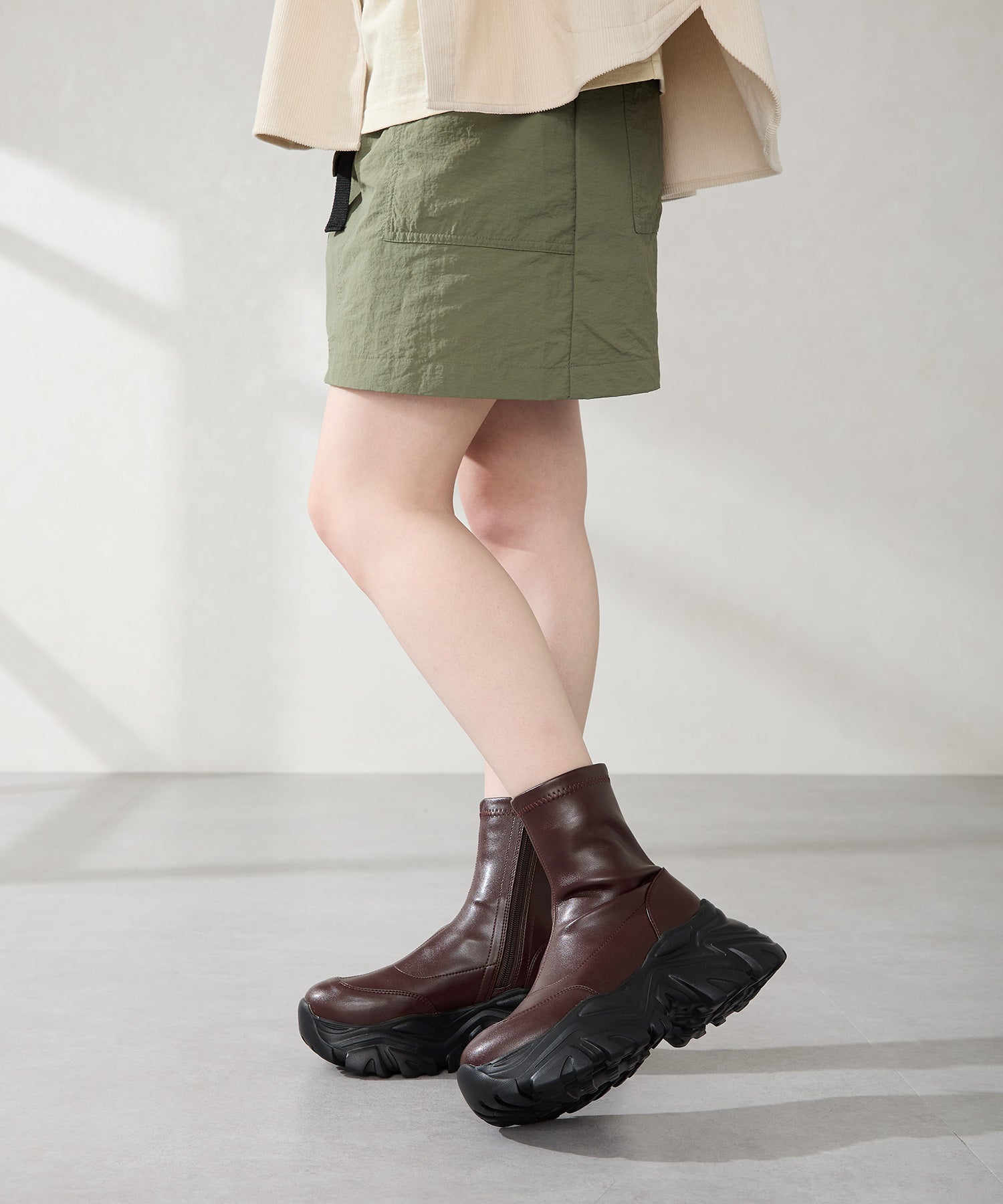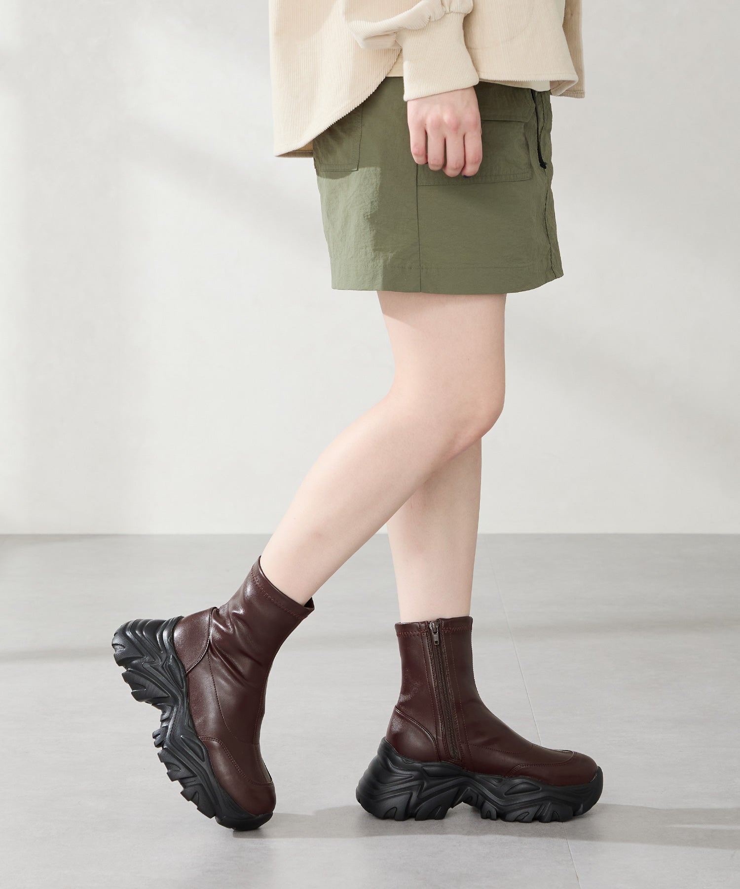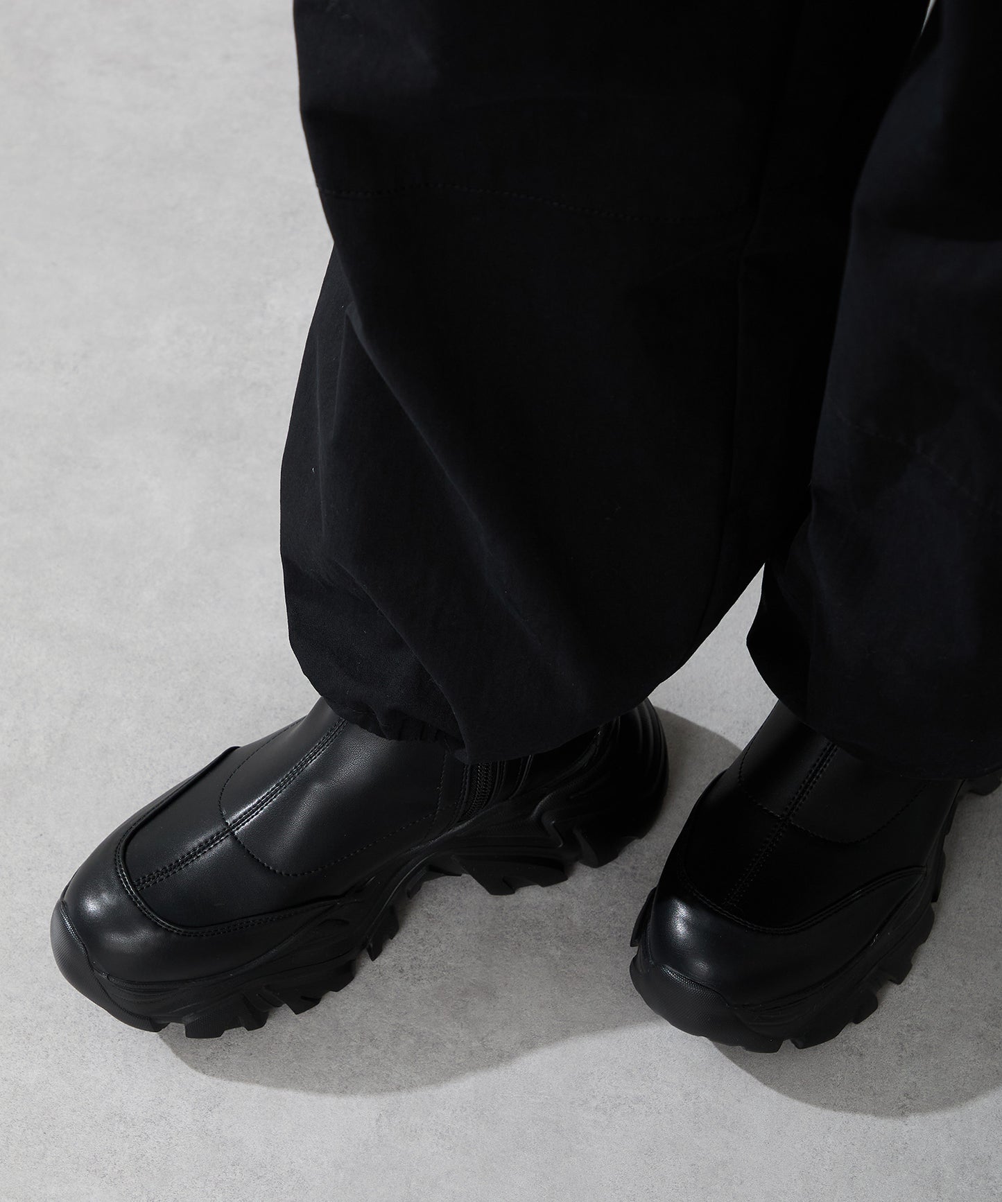 とことんボリュームを持たせたスニーカーソールがインパクト大のブーツは、履くだけでコーディネートの主役になる1足。筒回りはストレッチ素材で足当たりが良くフィットするので、ボリューミーなソールと組み合わせることで細見え効果が抜群。ソールには軽量で柔らかい材質を使用しているので見た目以上に歩きやすく疲れにくいので、今季手に入れたいマストアイテム。