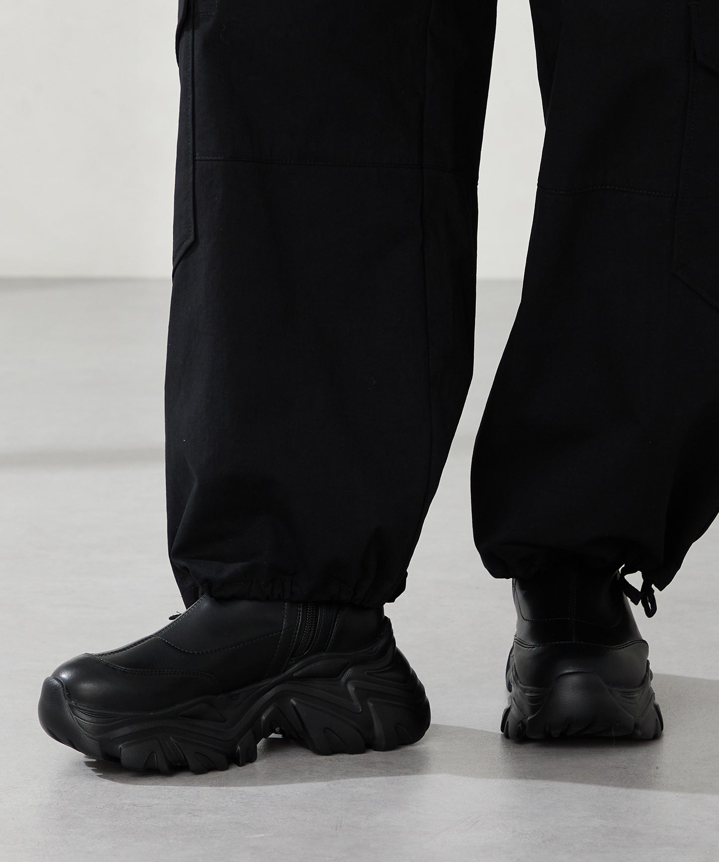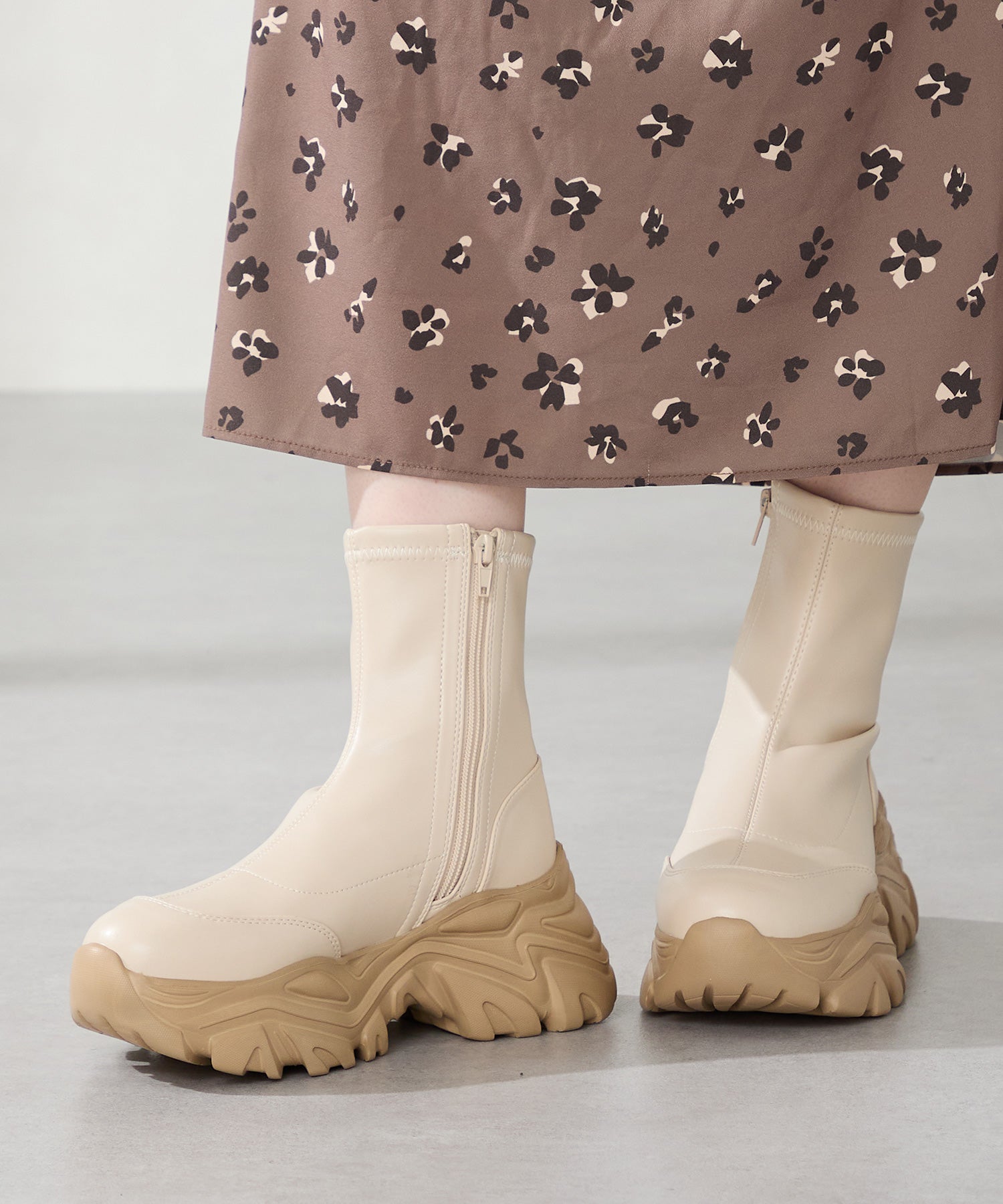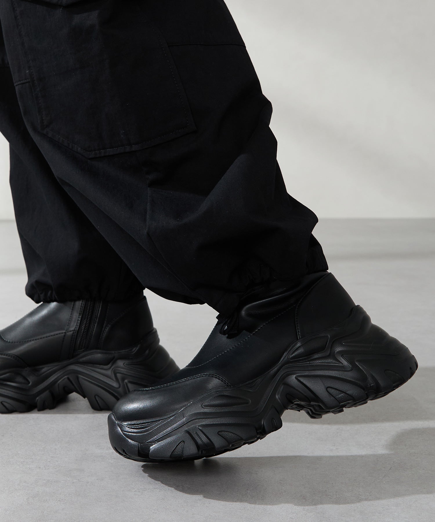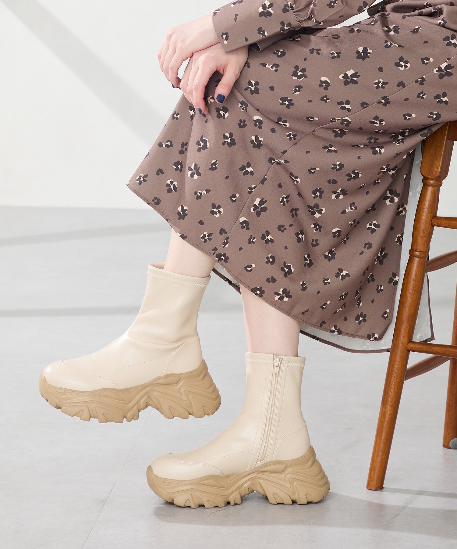 とことんボリュームを持たせたスニーカーソールがインパクト大のブーツは、履くだけでコーディネートの主役になる1足。筒回りはストレッチ素材で足当たりが良くフィットするので、ボリューミーなソールと組み合わせることで細見え効果が抜群。ソールには軽量で柔らかい材質を使用しているので見た目以上に歩きやすく疲れにくいので、今季手に入れたいマストアイテム。