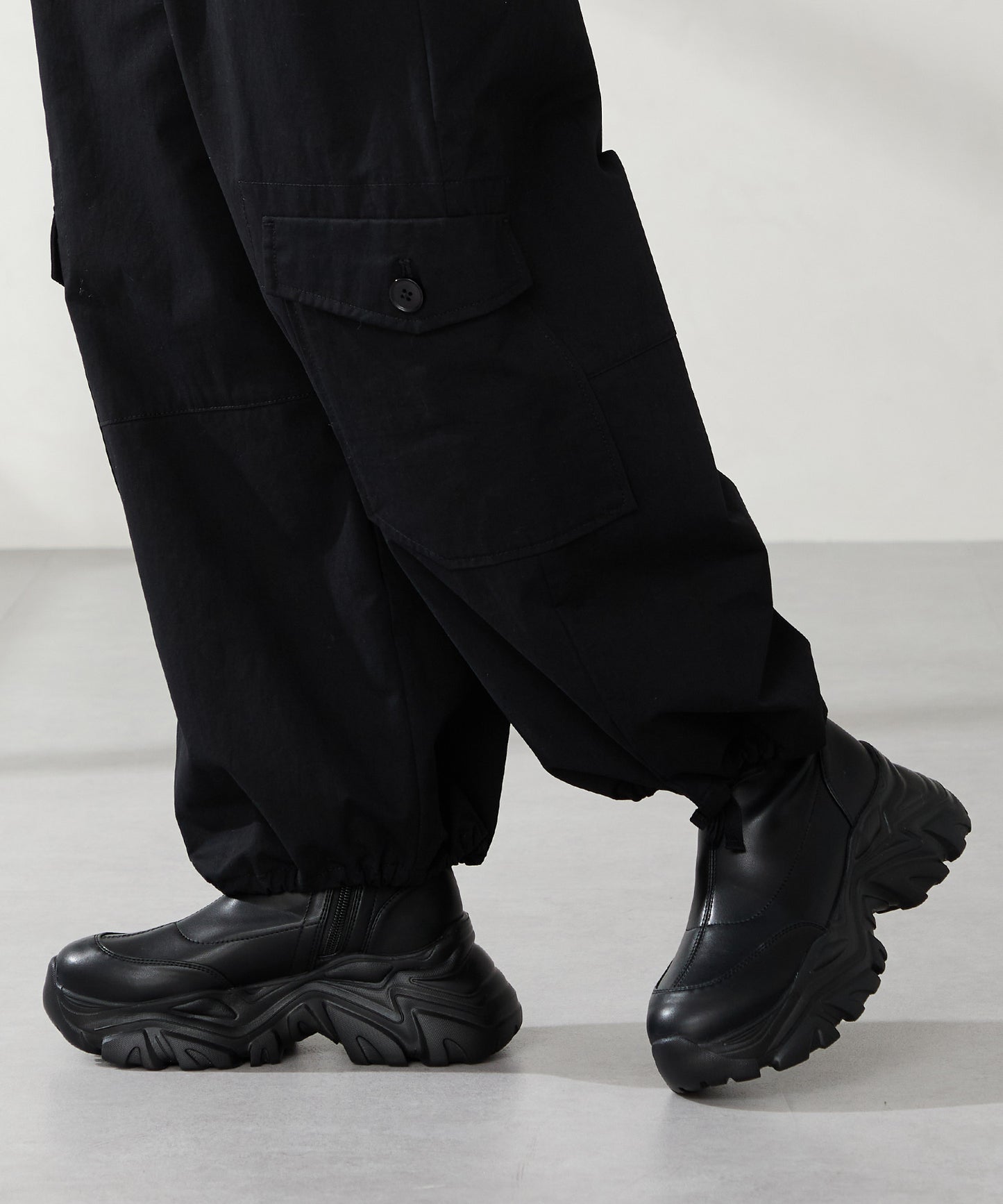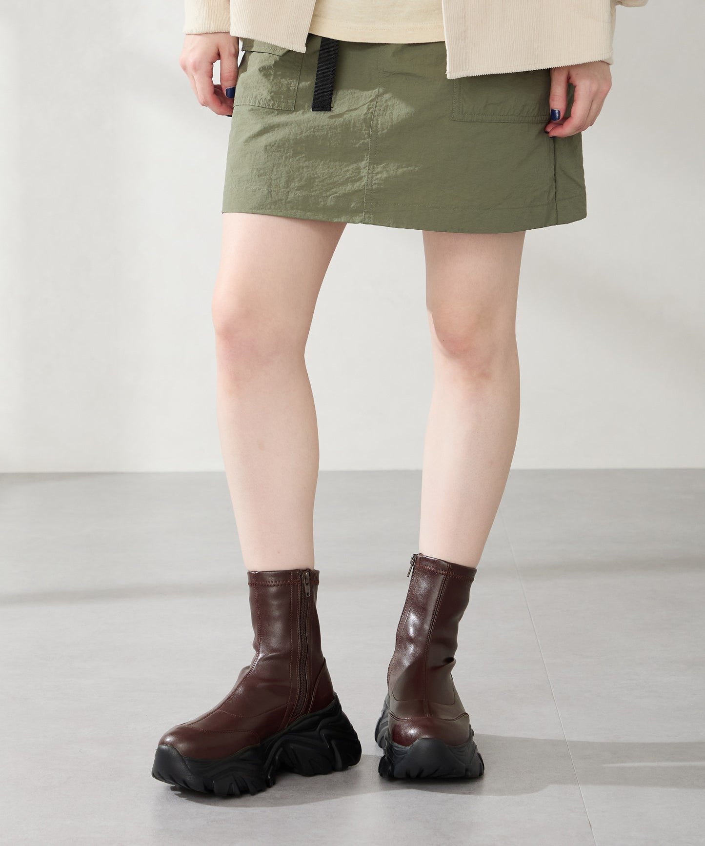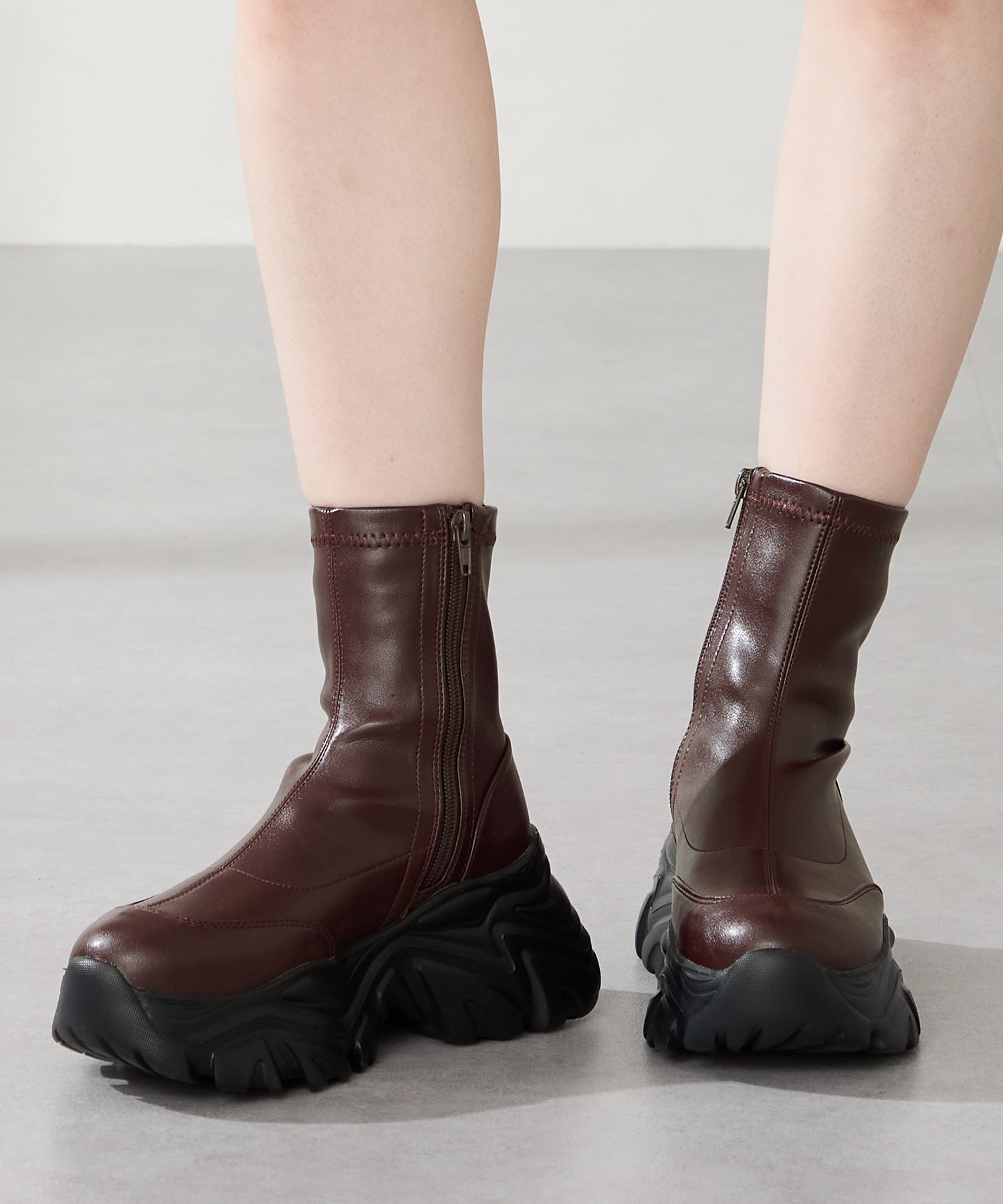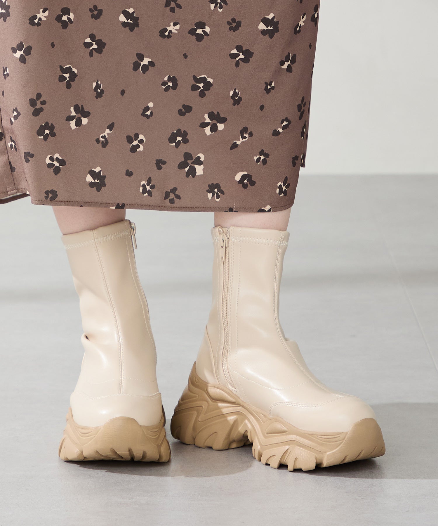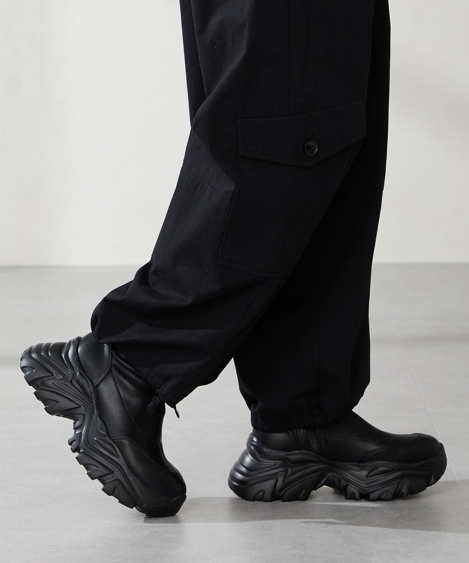 とことんボリュームを持たせたスニーカーソールがインパクト大のブーツは、履くだけでコーディネートの主役になる1足。筒回りはストレッチ素材で足当たりが良くフィットするので、ボリューミーなソールと組み合わせることで細見え効果が抜群。ソールには軽量で柔らかい材質を使用しているので見た目以上に歩きやすく疲れにくいので、今季手に入れたいマストアイテム。
