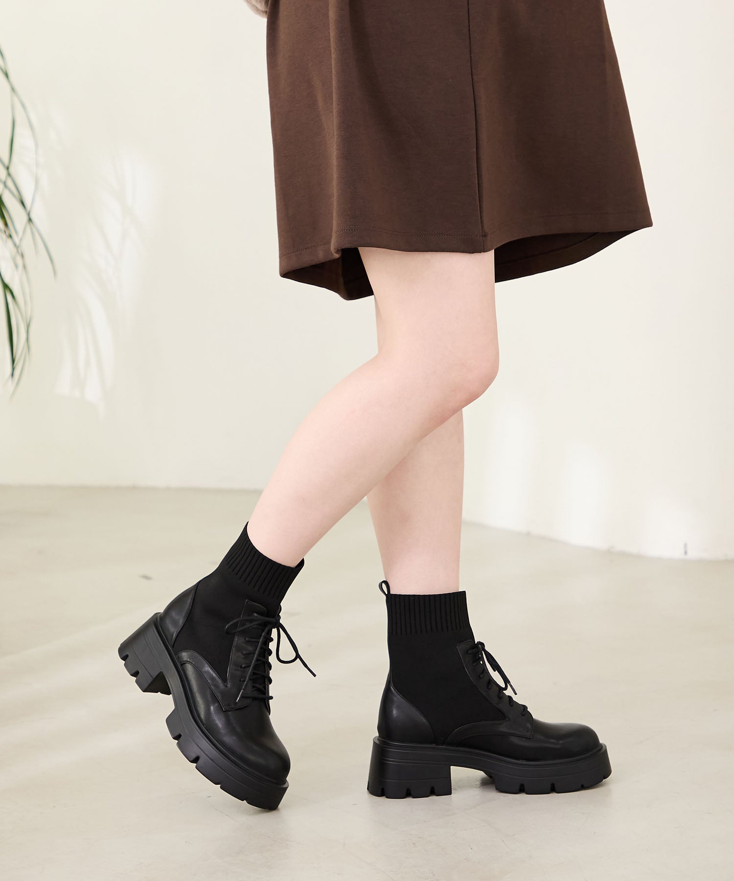 レースアップ×ニットでとことんカジュアルに仕上げたブーツ。厚みのあるソールが脚をすっきりと見せてくれ、筒まわりには伸縮性のあるリブニットを使用することで、着脱のしやすさと快適な履き心地をサポート。ボリュームのあるデザインながら見た目以上に軽く、コロンとしたラウンドトゥが幅広いスタイルに合わせやすいので、この冬重宝しそう。