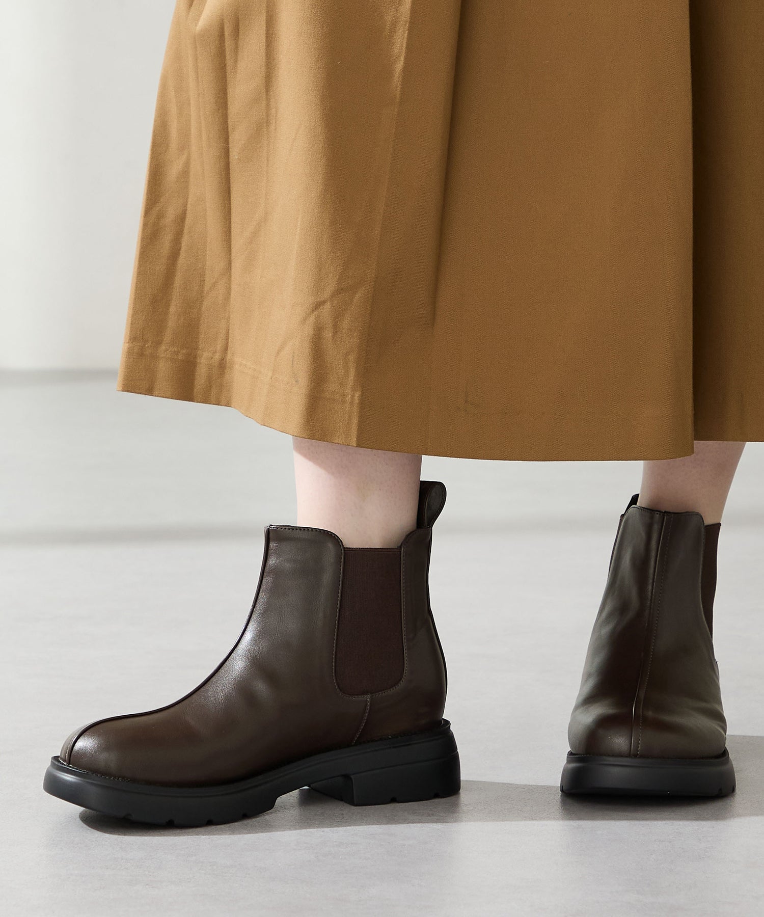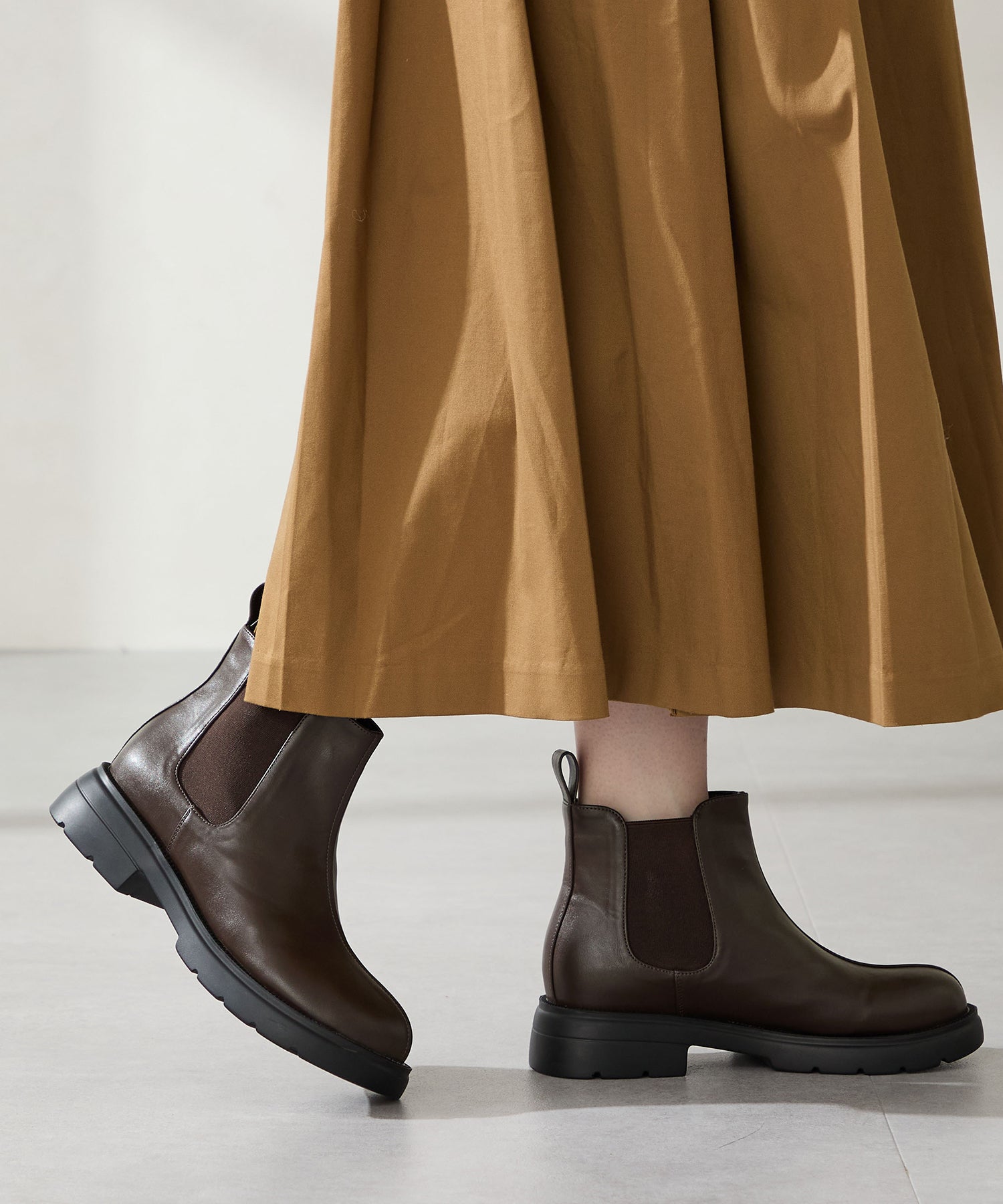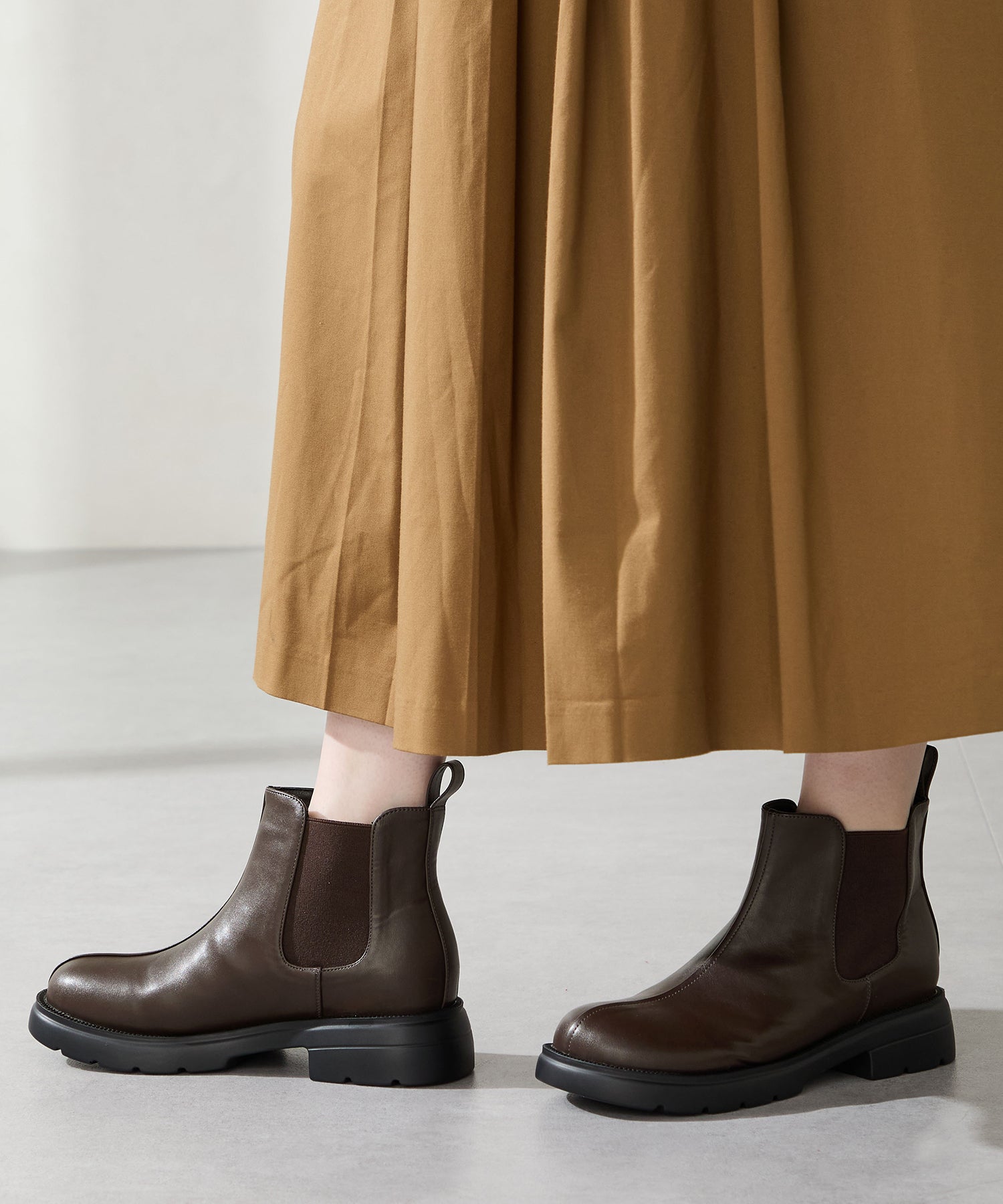 定番のサイドゴアブーツは、丸みのあるオブリークトゥで今っぽいフォルムに、センターに入れた立体的な切替デザインでひと癖加えたアイテム。絶妙な厚さのソールは軽い材質を使用することで足運びがしやすく、ジップのないゴアデザインで着脱も楽ちん。コーディネートを選ばない短めの丈感に、ブラックとダークトーンのブラウンの合わせやすい2色展開でこの冬大活躍しそう。