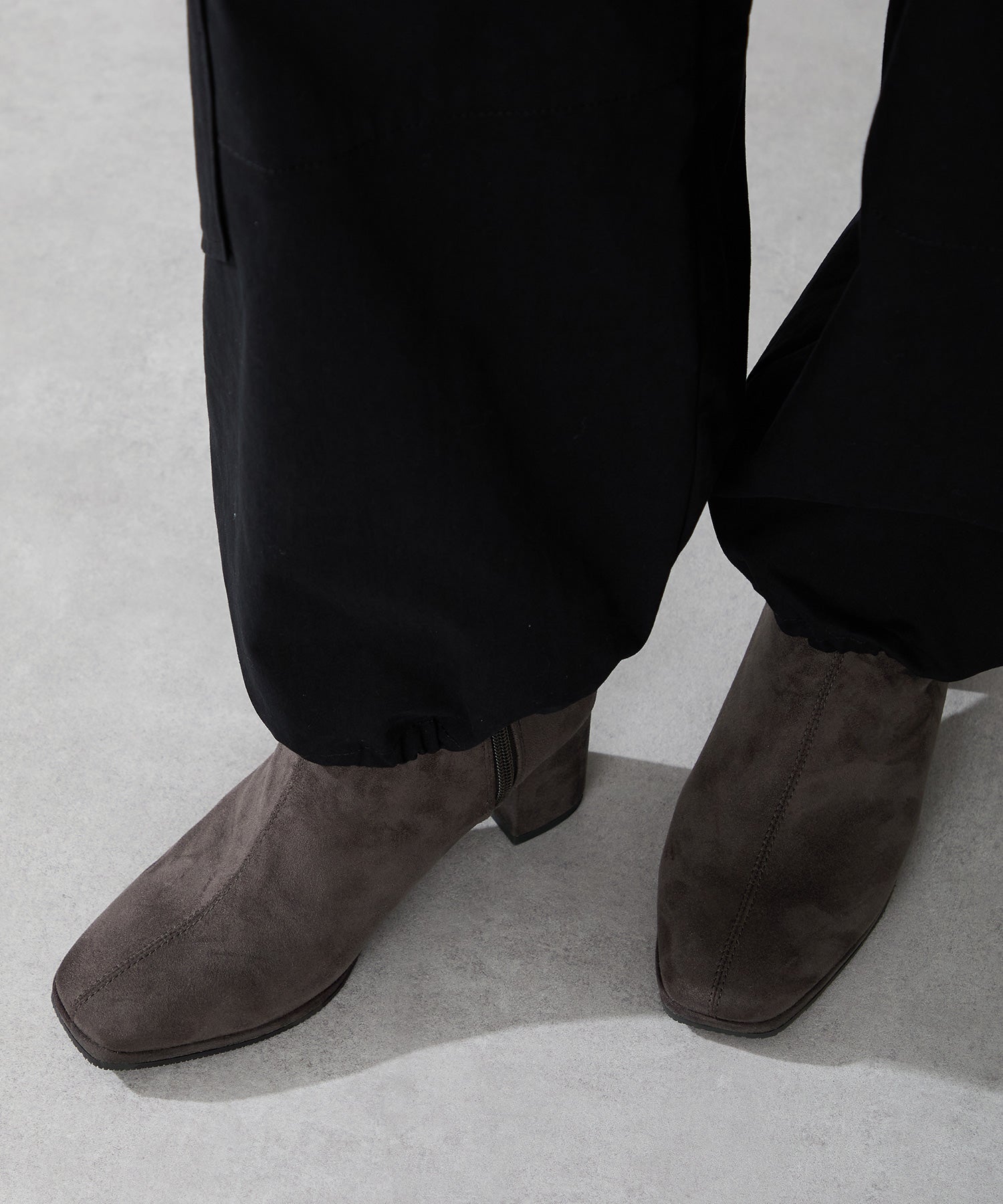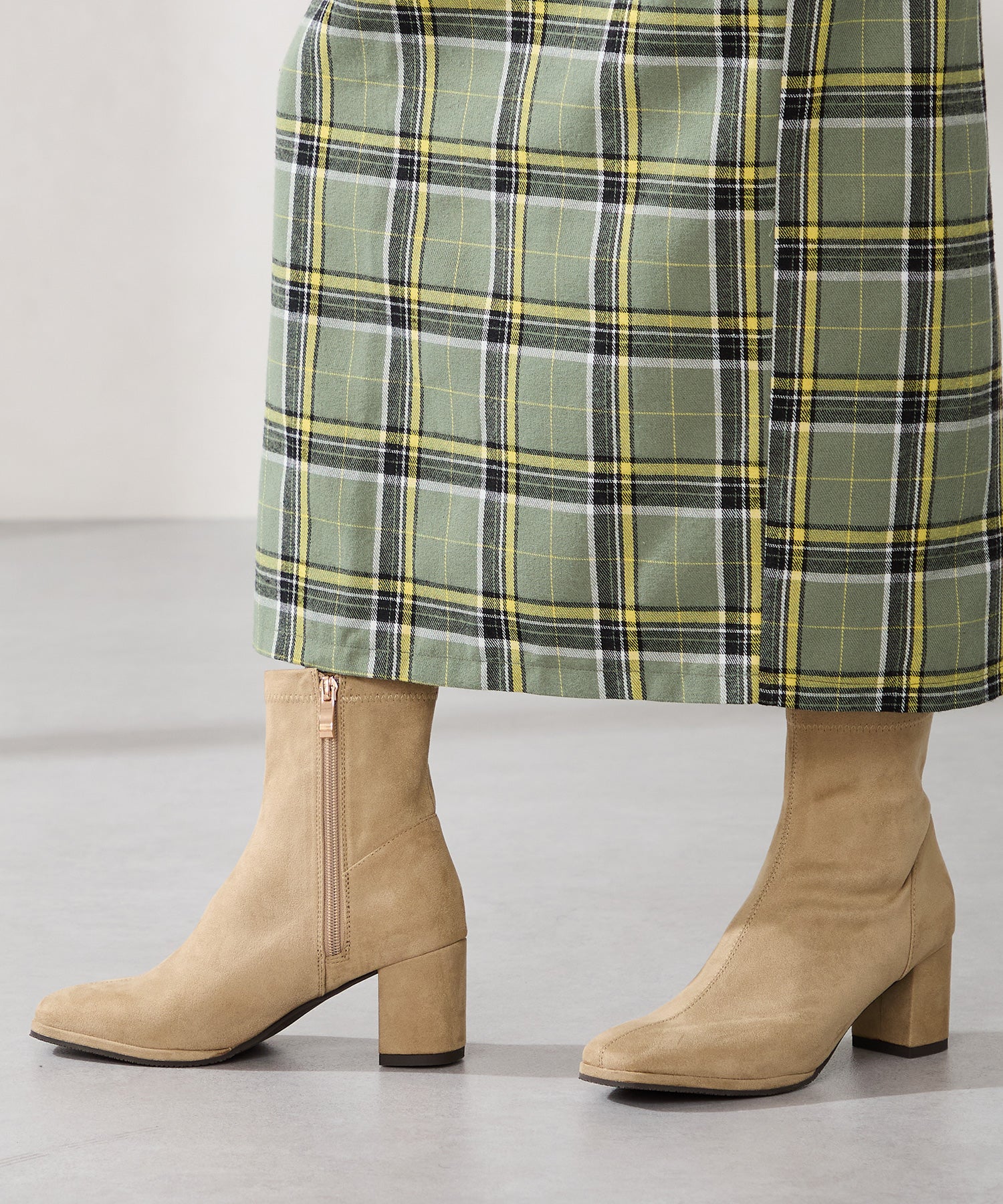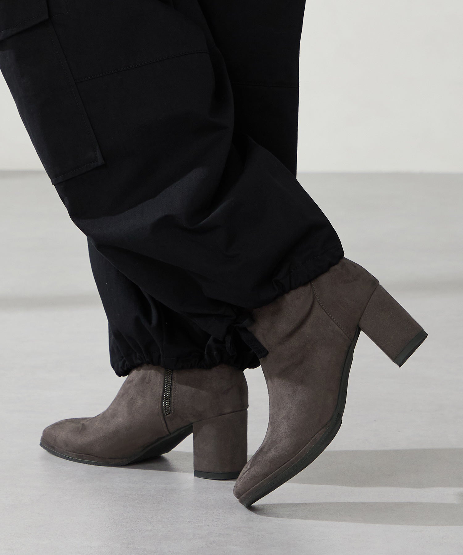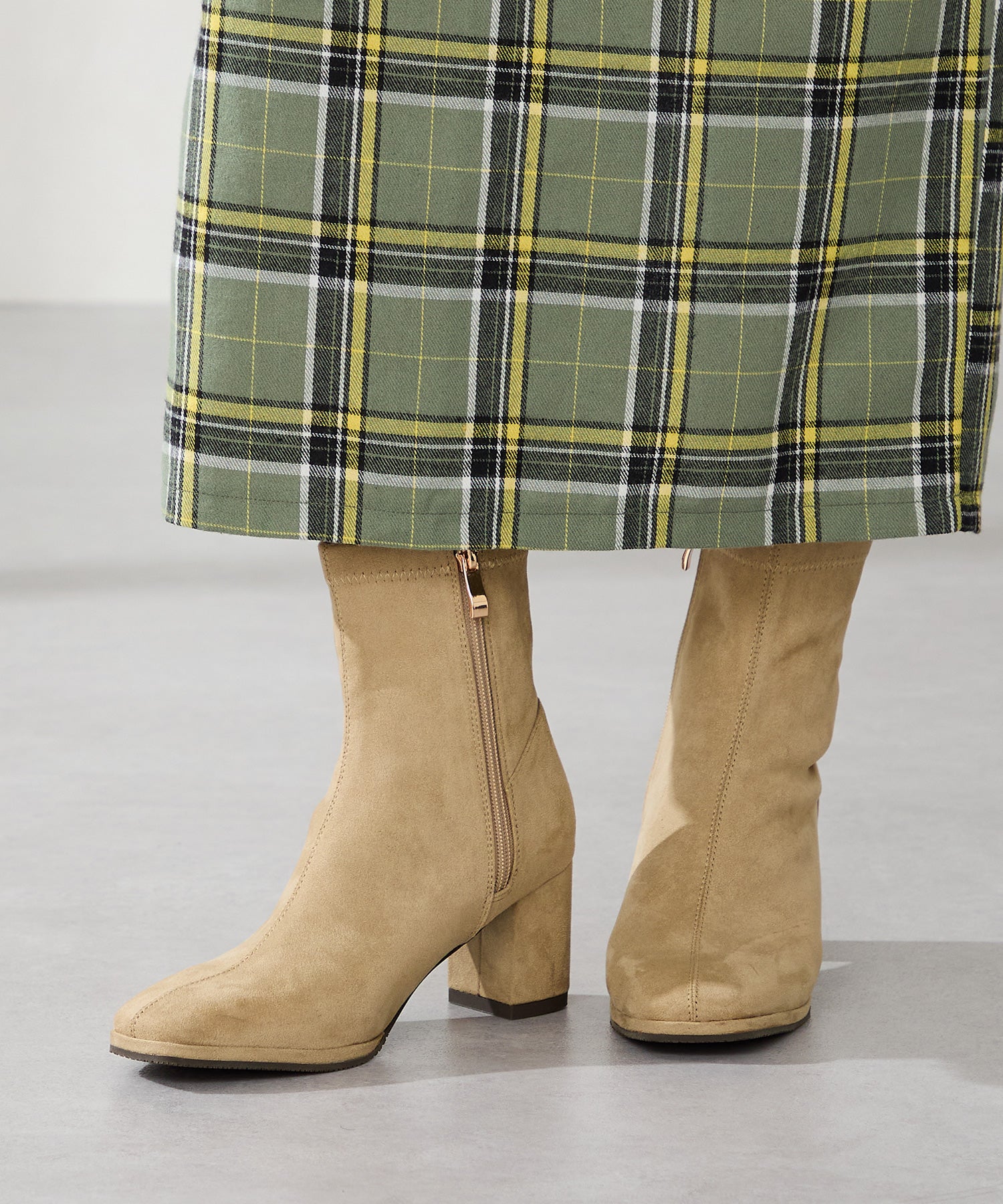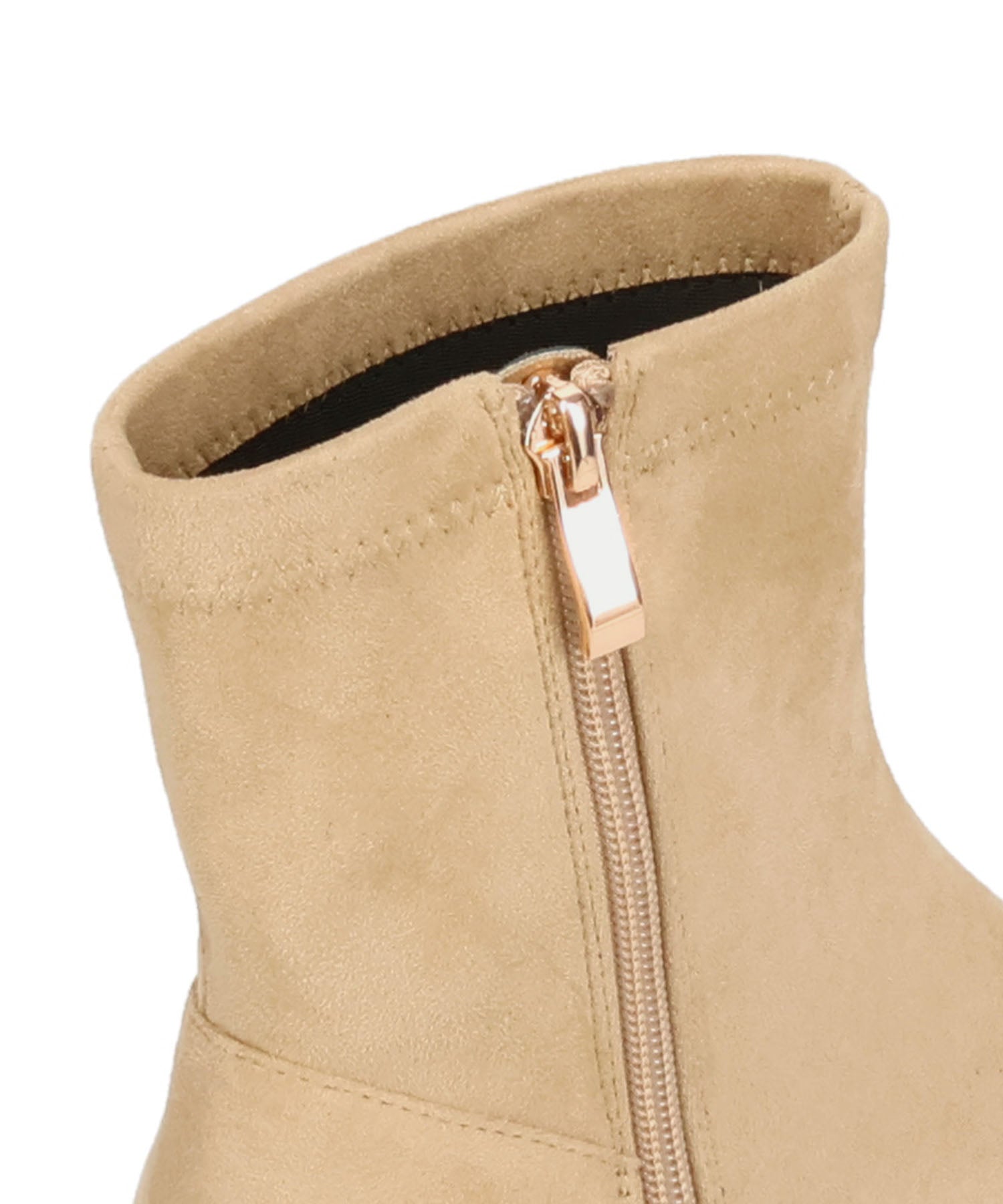 ベーシックなカラー展開で着回し力抜群のショートブーツは、ヒールまで全てスエード素材にすることで柔らかな仕上がりに。筒周りをタイトめにすることで縦のラインが綺麗に見え、アッパーにはセンターシームを施すことで美脚効果も抜群◎。伸縮性のあるストレッチ素材を使用しており、ストレスフリーに履けるのが魅力。シンプルながらも内側のゴールドのジップがさりげないアクセントに。