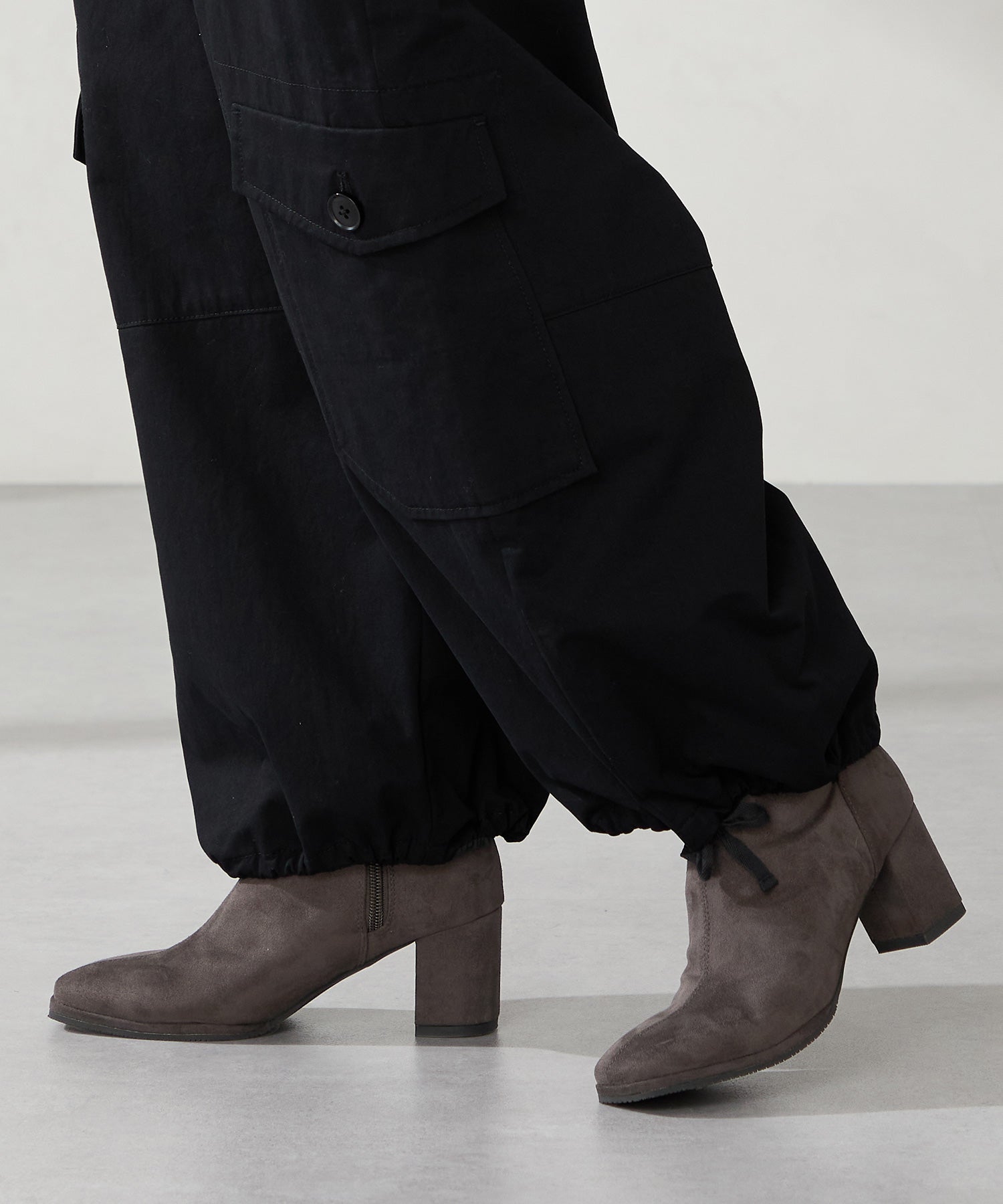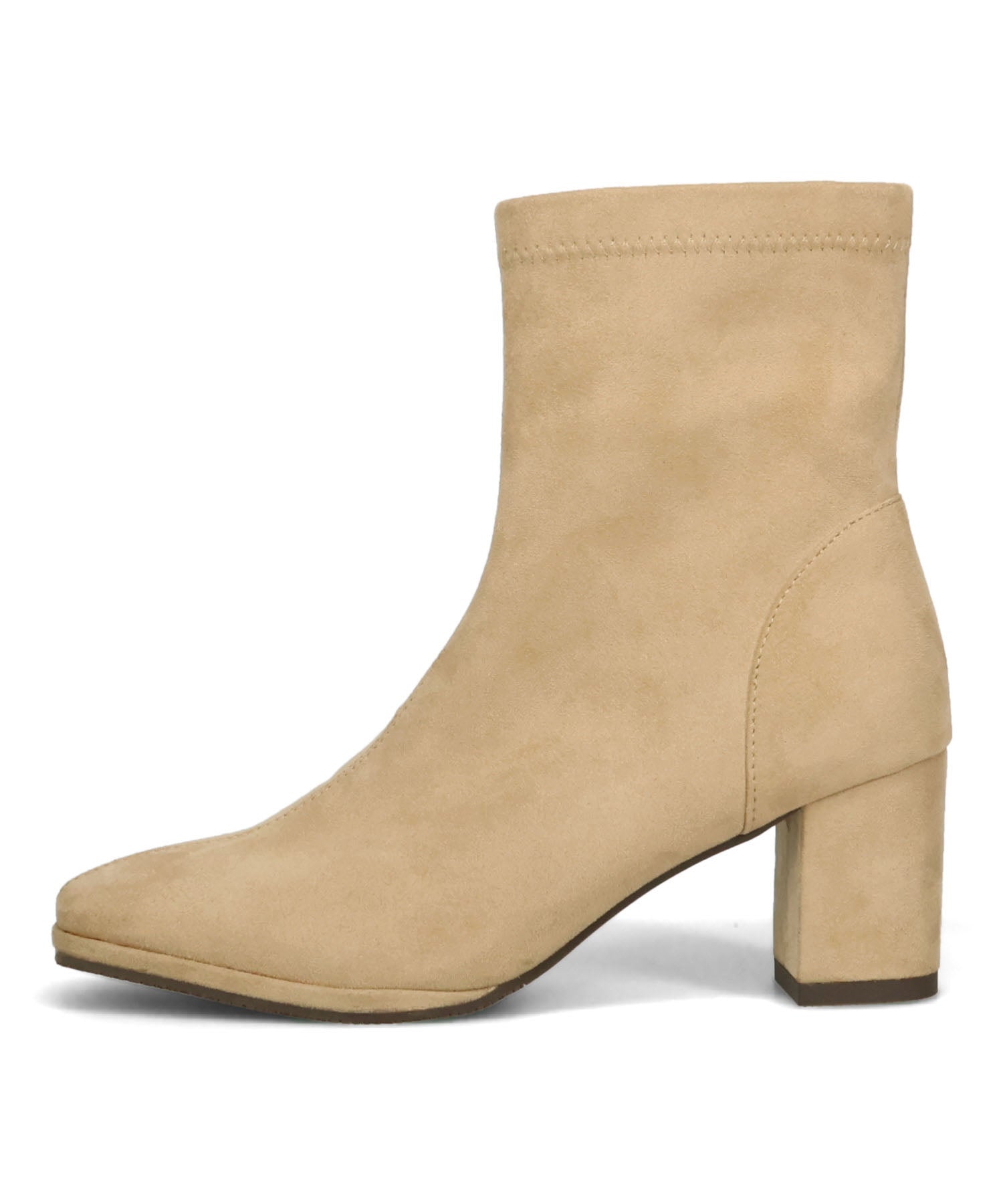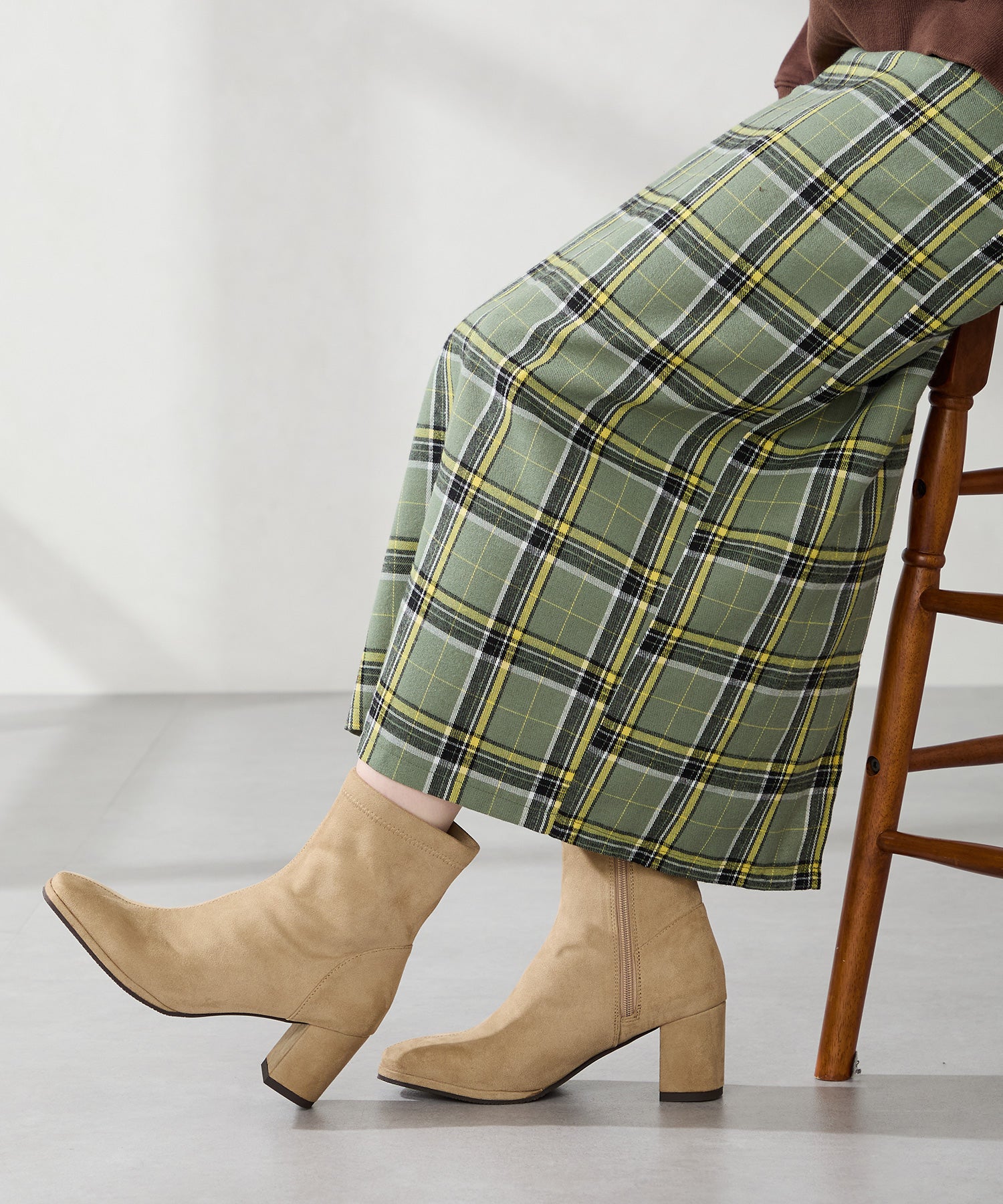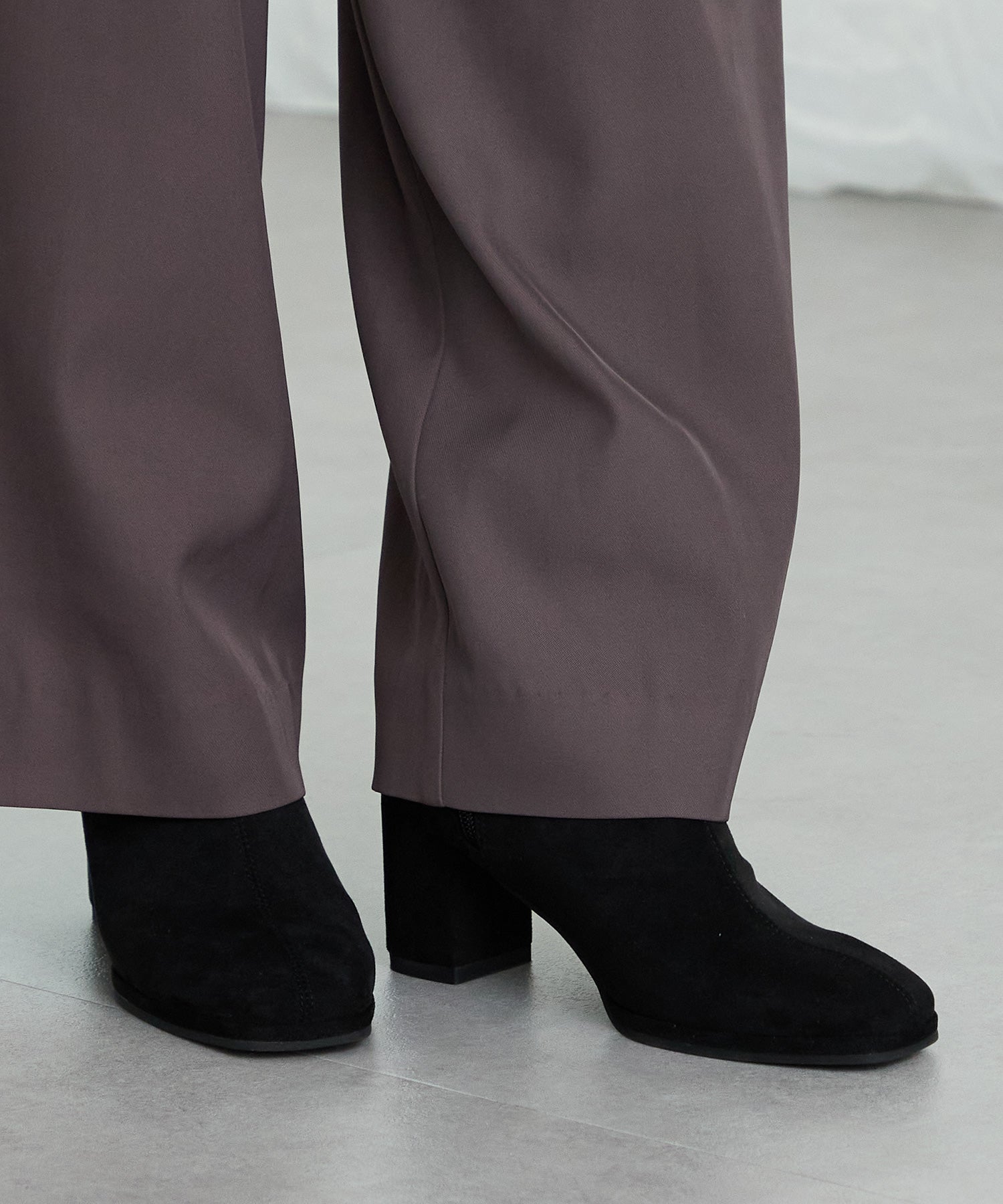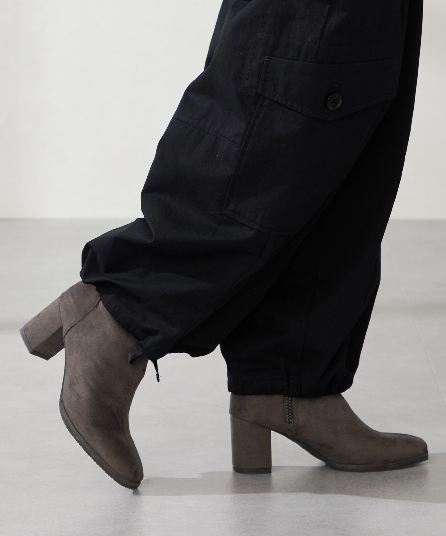 ベーシックなカラー展開で着回し力抜群のショートブーツは、ヒールまで全てスエード素材にすることで柔らかな仕上がりに。筒周りをタイトめにすることで縦のラインが綺麗に見え、アッパーにはセンターシームを施すことで美脚効果も抜群◎。伸縮性のあるストレッチ素材を使用しており、ストレスフリーに履けるのが魅力。シンプルながらも内側のゴールドのジップがさりげないアクセントに。