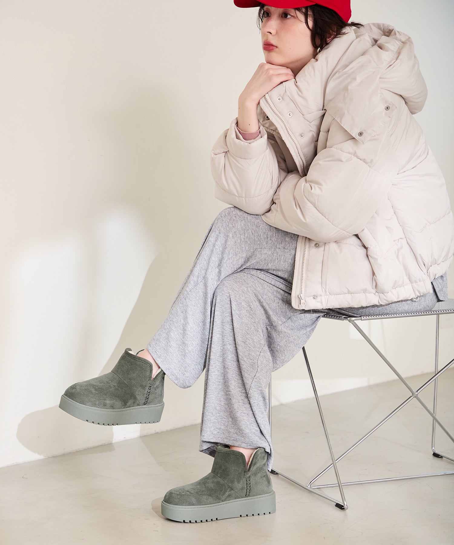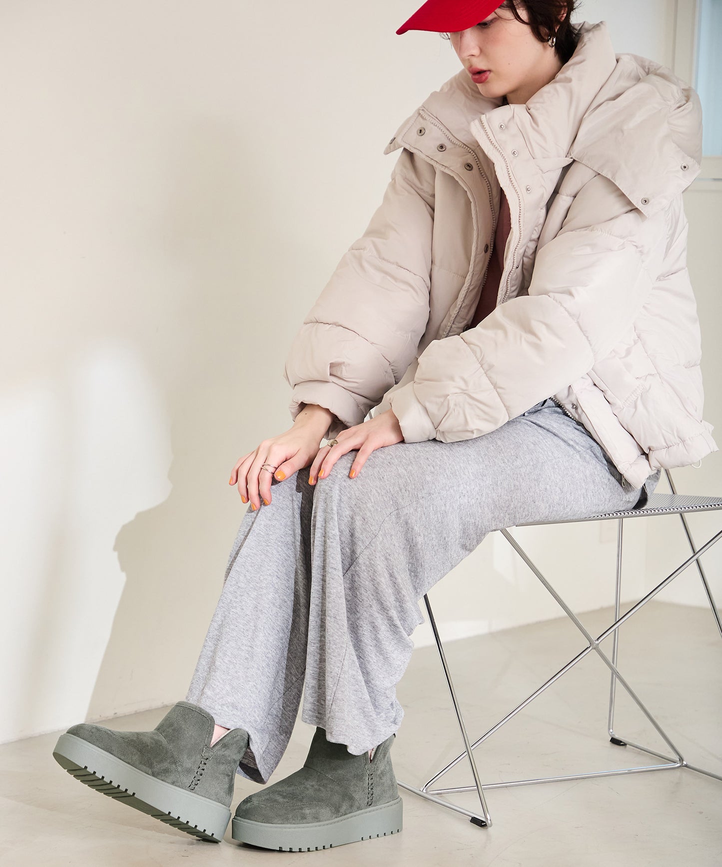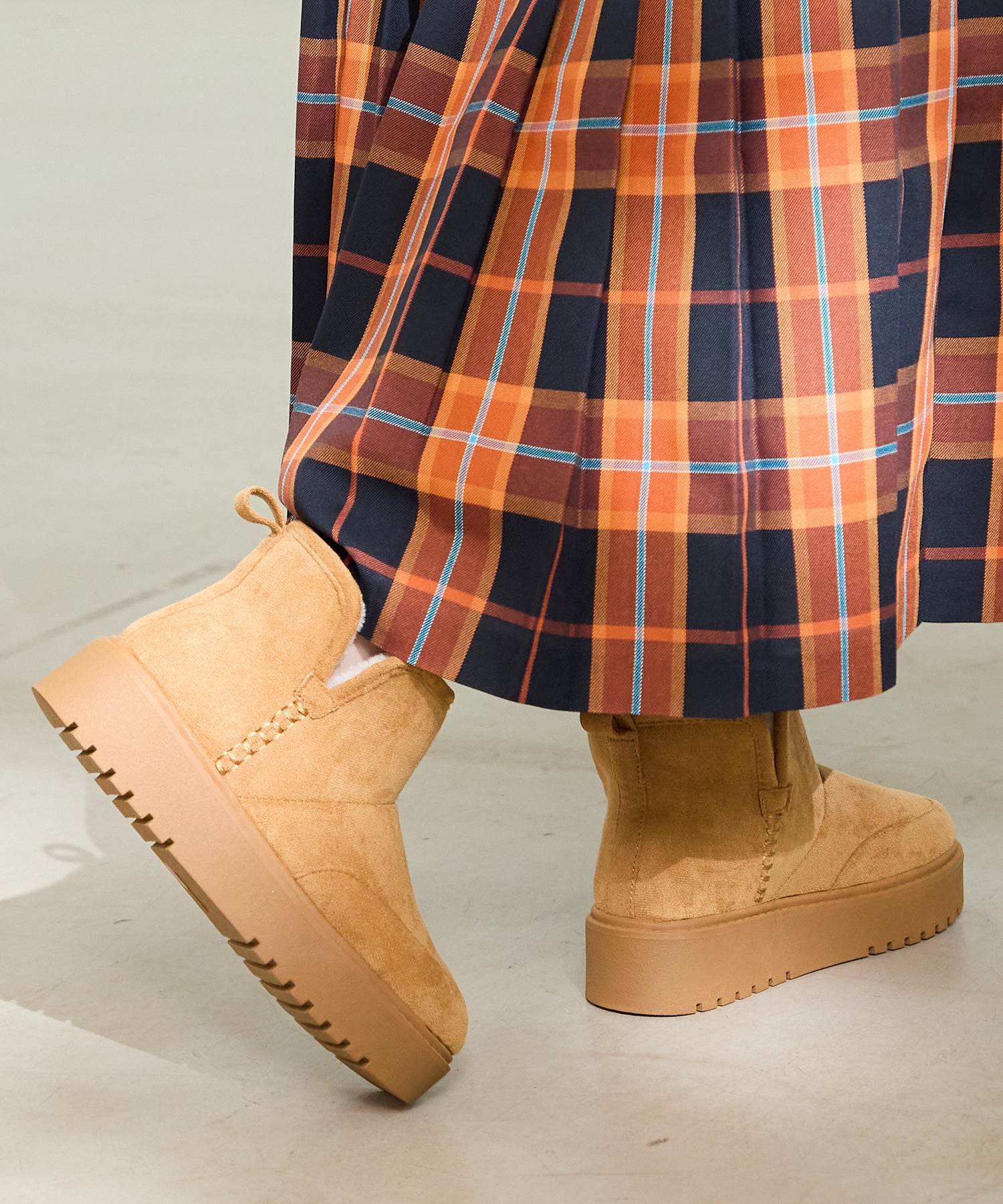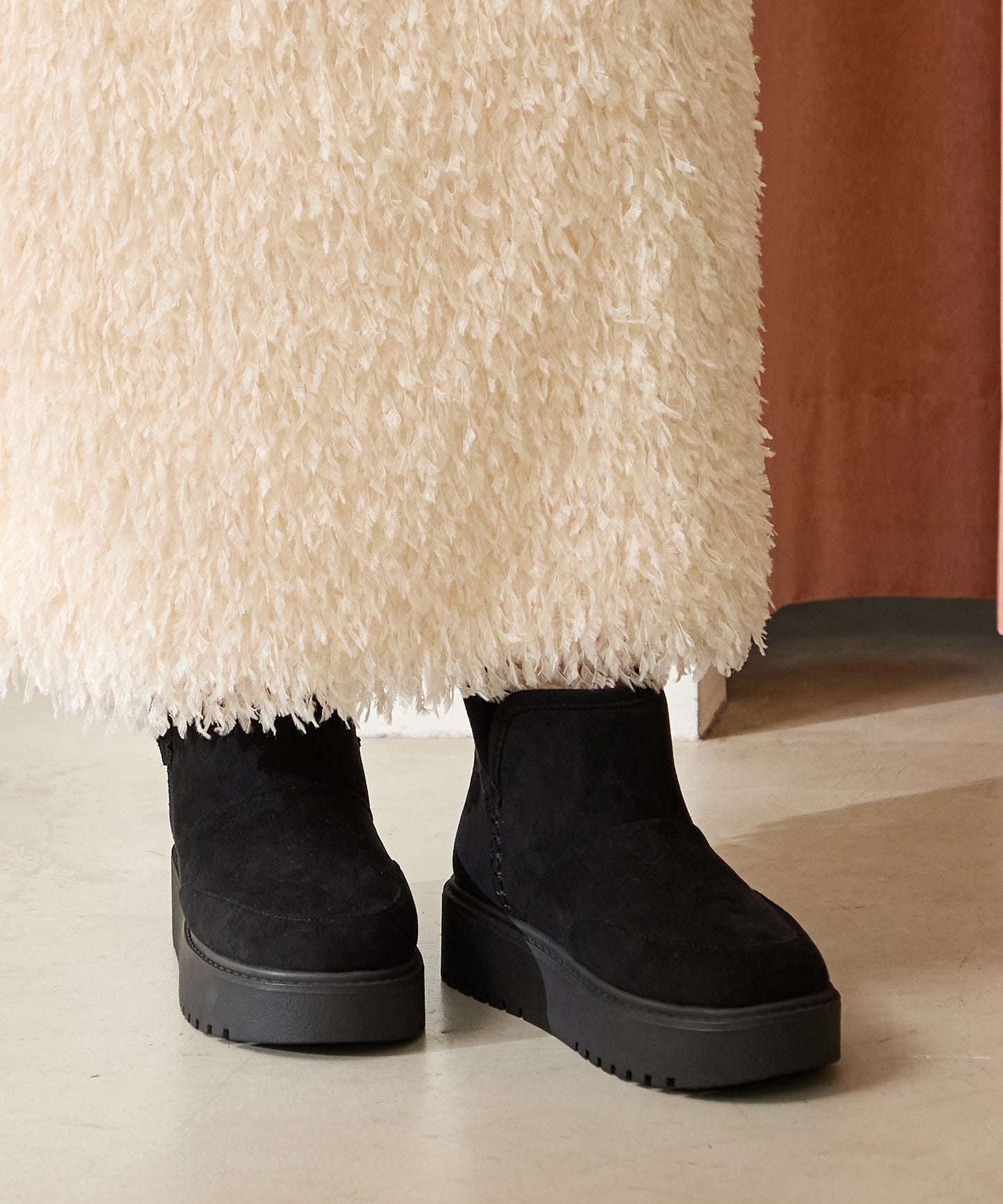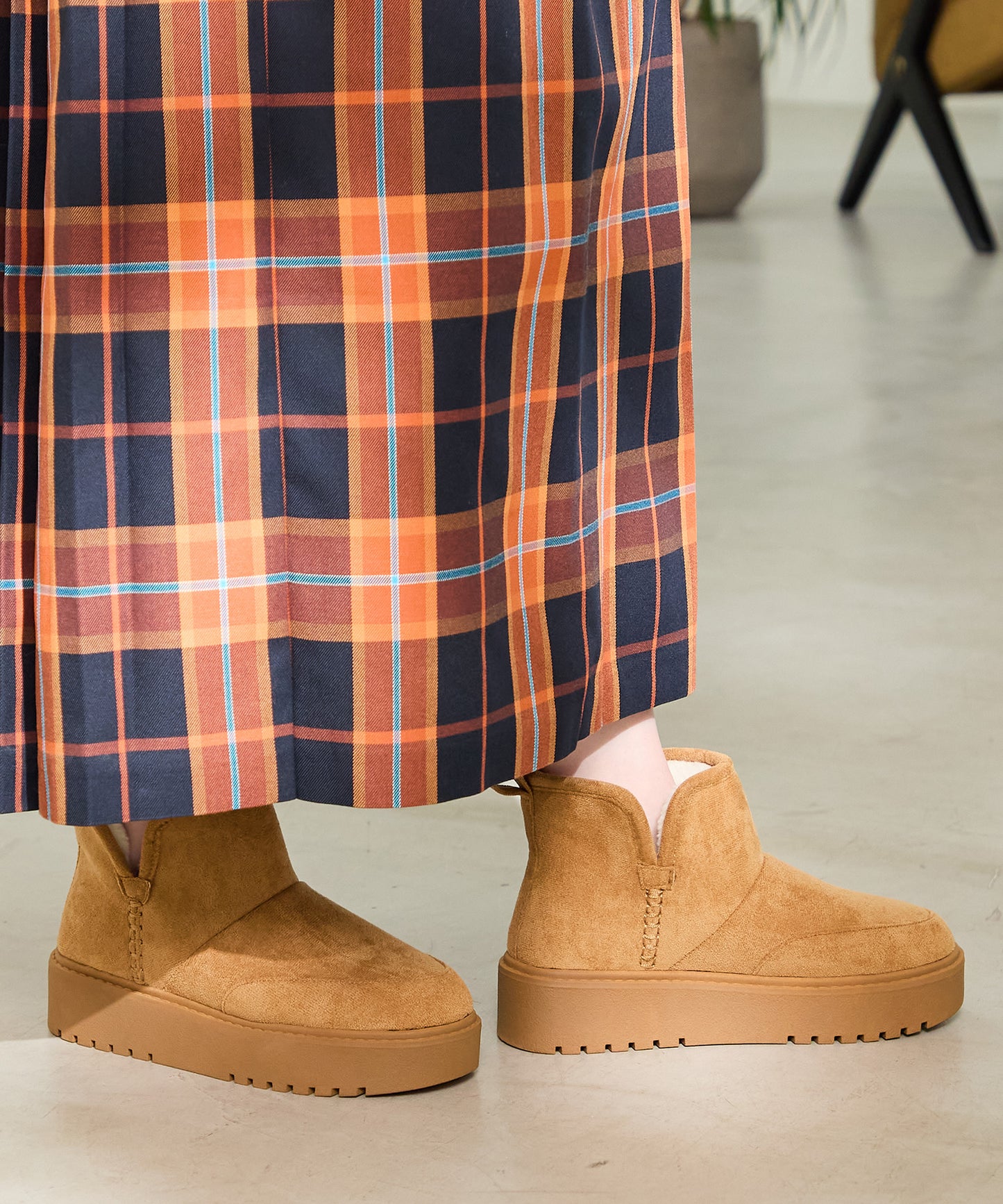 内側全体にフェイクファーをあしらったムートンブーツはお洒落さと防寒を両立できるアイテム。短めの筒丈で着脱しやすく、サイドスリット入りなので筒を折り返しても楽しめる2way仕様なのが嬉しいポイント。しっかり厚みのあるボリュームソールが今季らしいシルエットを叶えてくれる。ソールは柔らかく軽い材質で屈曲性が高く、フィット感抜群な機能面も充実したマストハブブーツ。