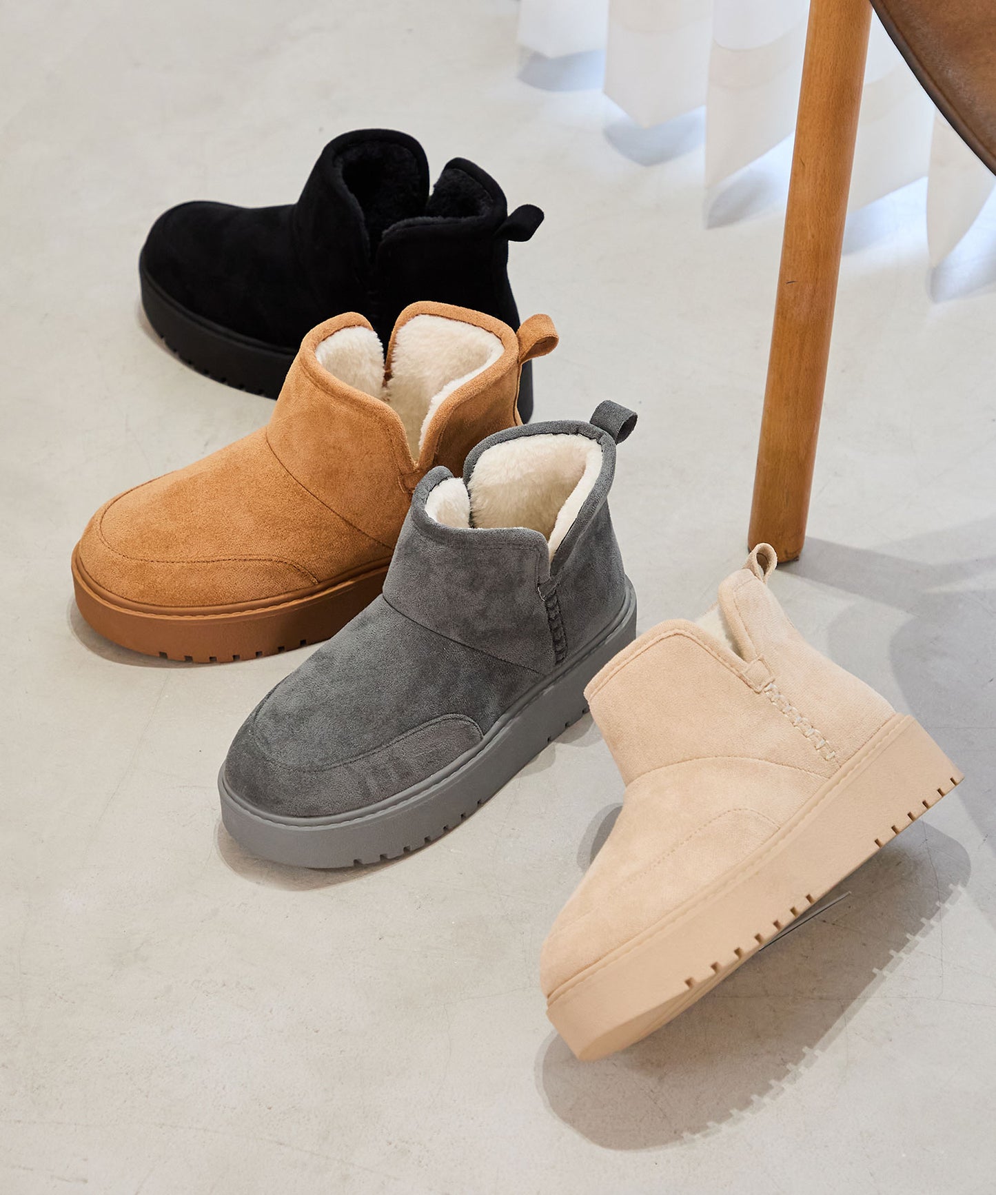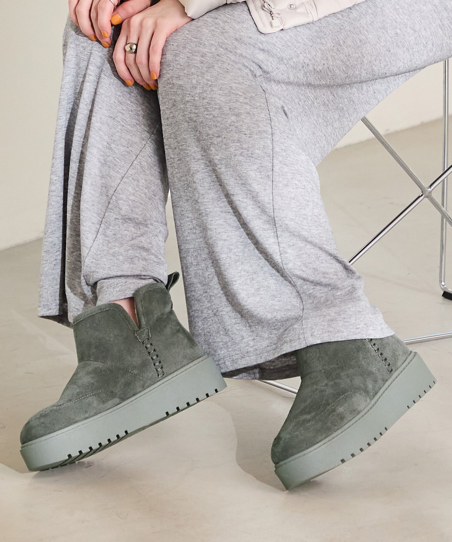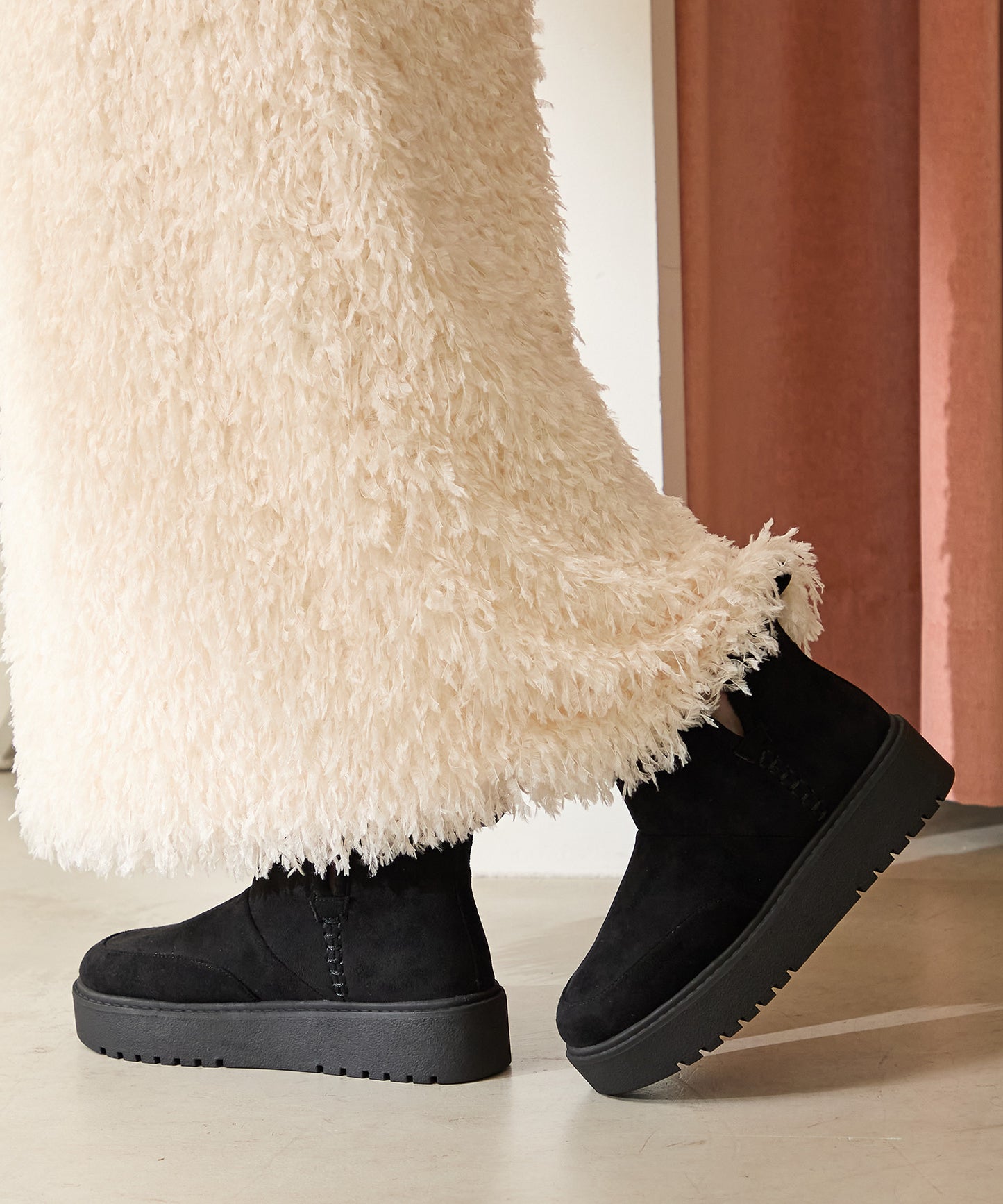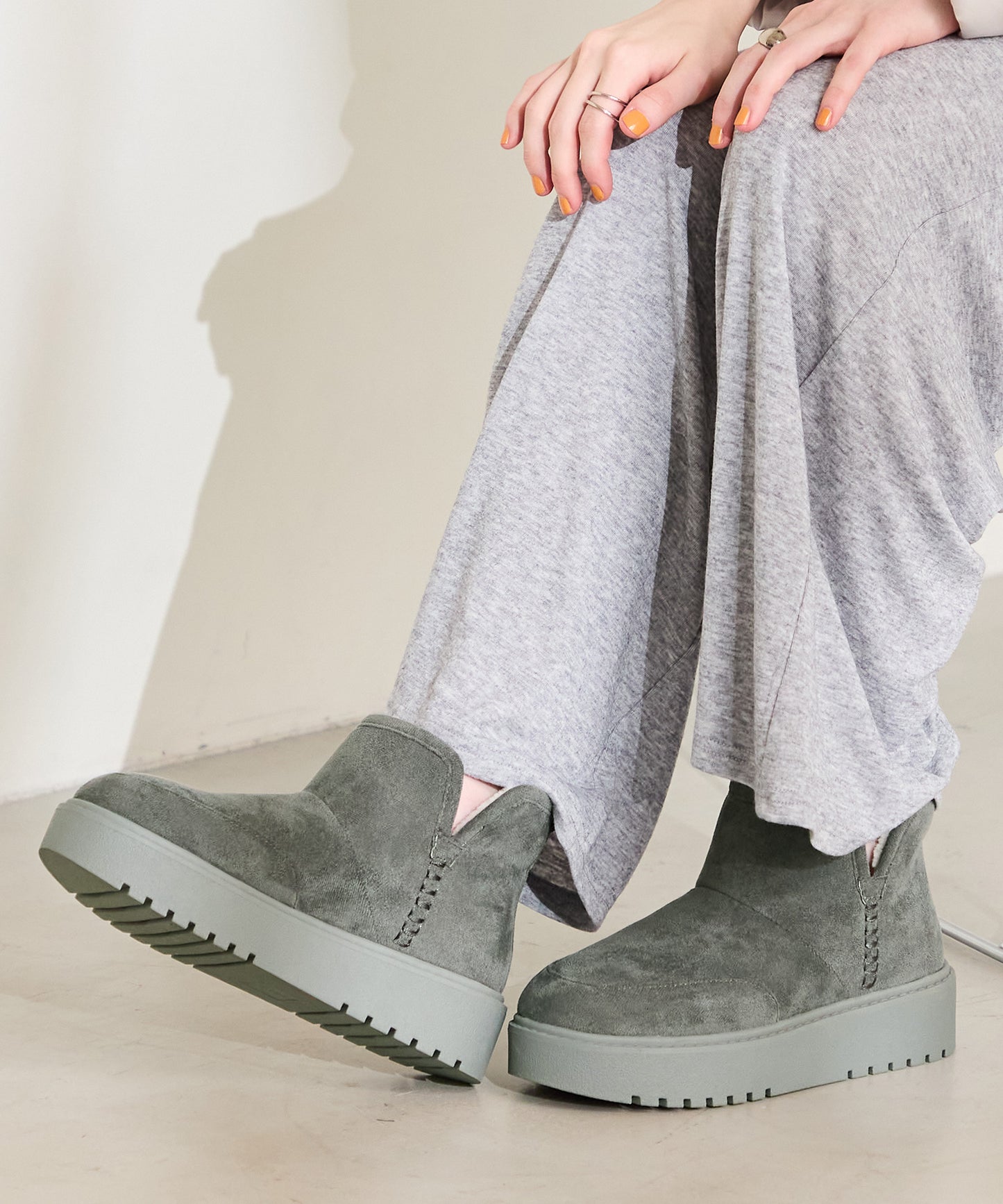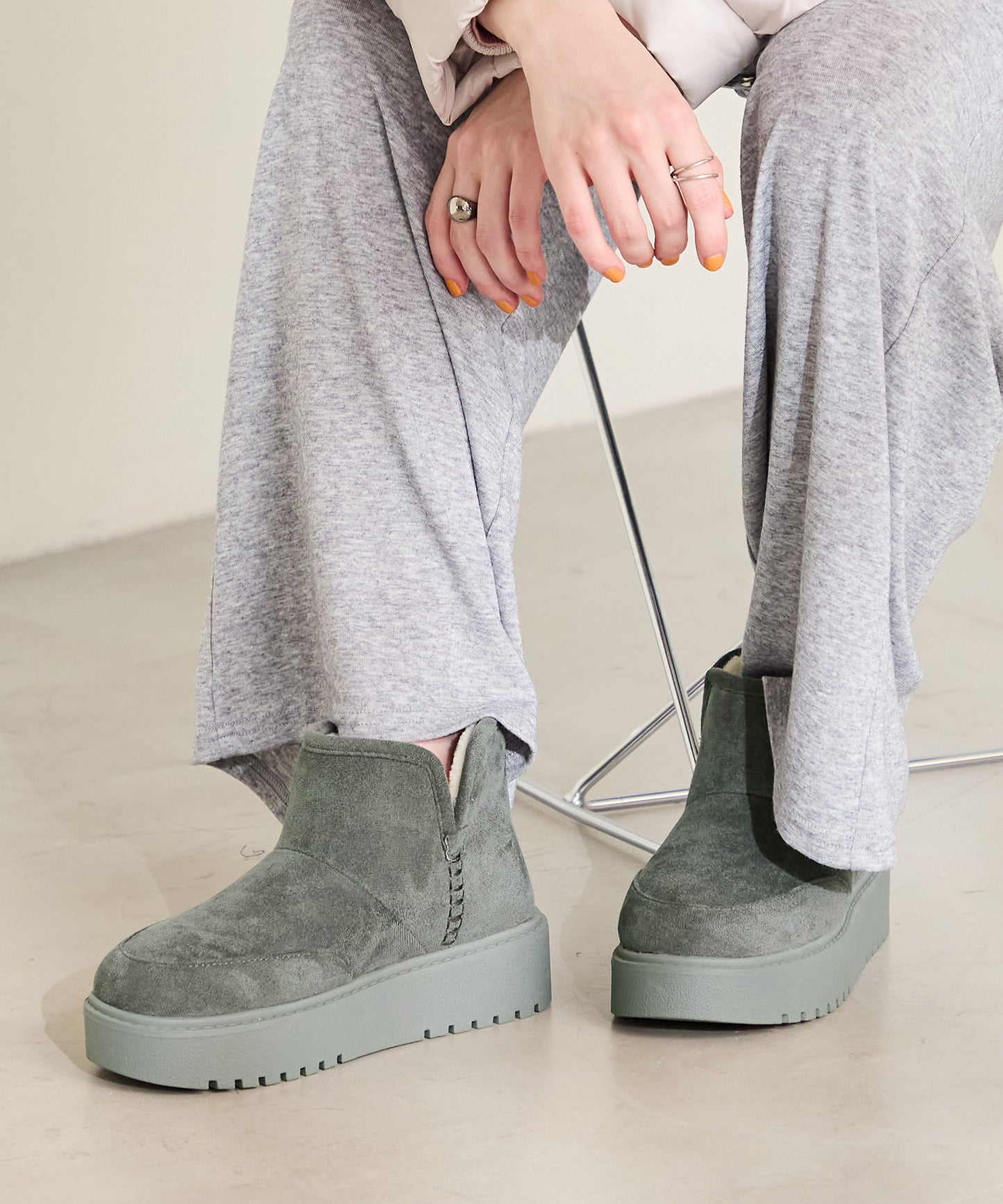 内側全体にフェイクファーをあしらったムートンブーツはお洒落さと防寒を両立できるアイテム。短めの筒丈で着脱しやすく、サイドスリット入りなので筒を折り返しても楽しめる2way仕様なのが嬉しいポイント。しっかり厚みのあるボリュームソールが今季らしいシルエットを叶えてくれる。ソールは柔らかく軽い材質で屈曲性が高く、フィット感抜群な機能面も充実したマストハブブーツ。