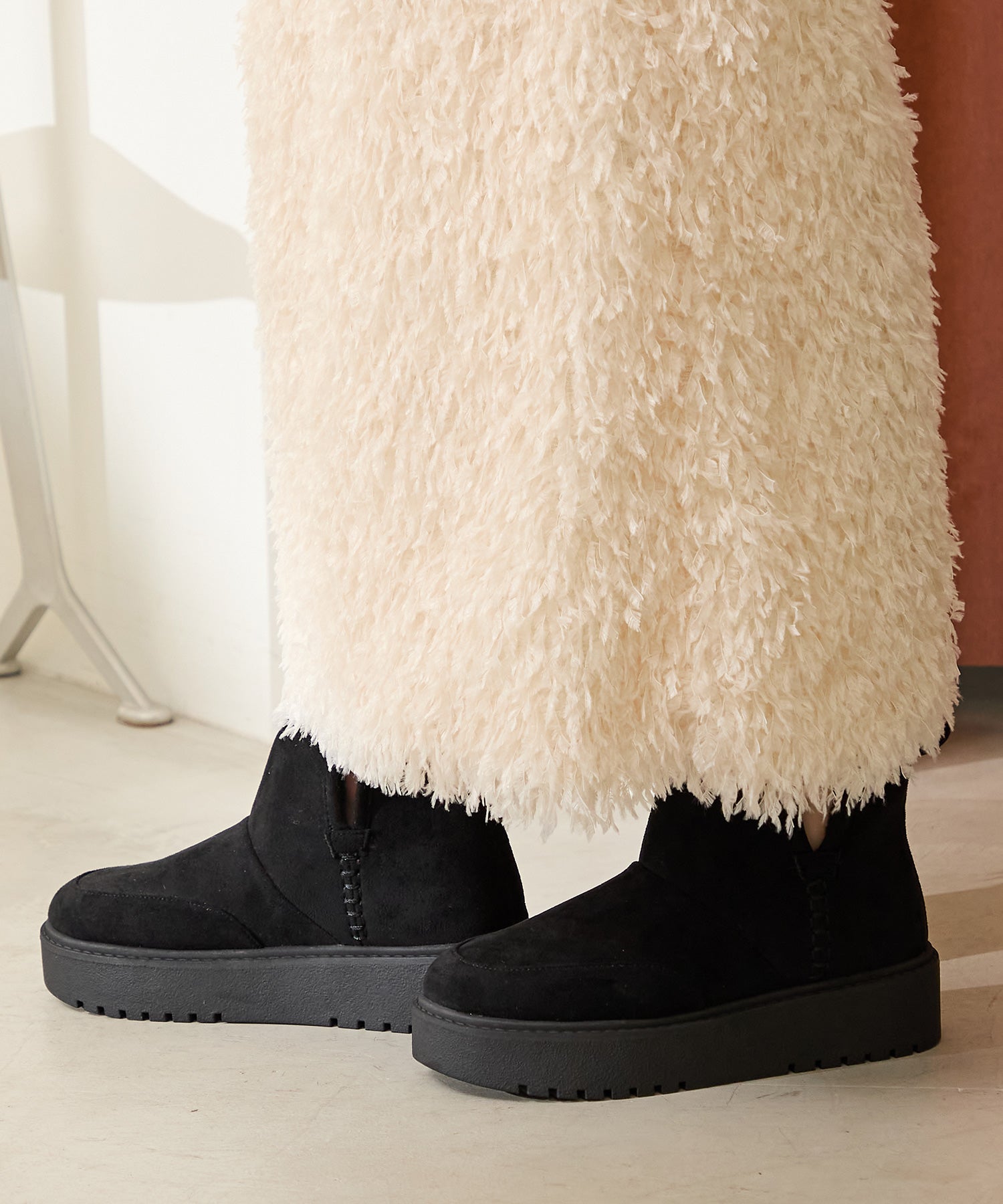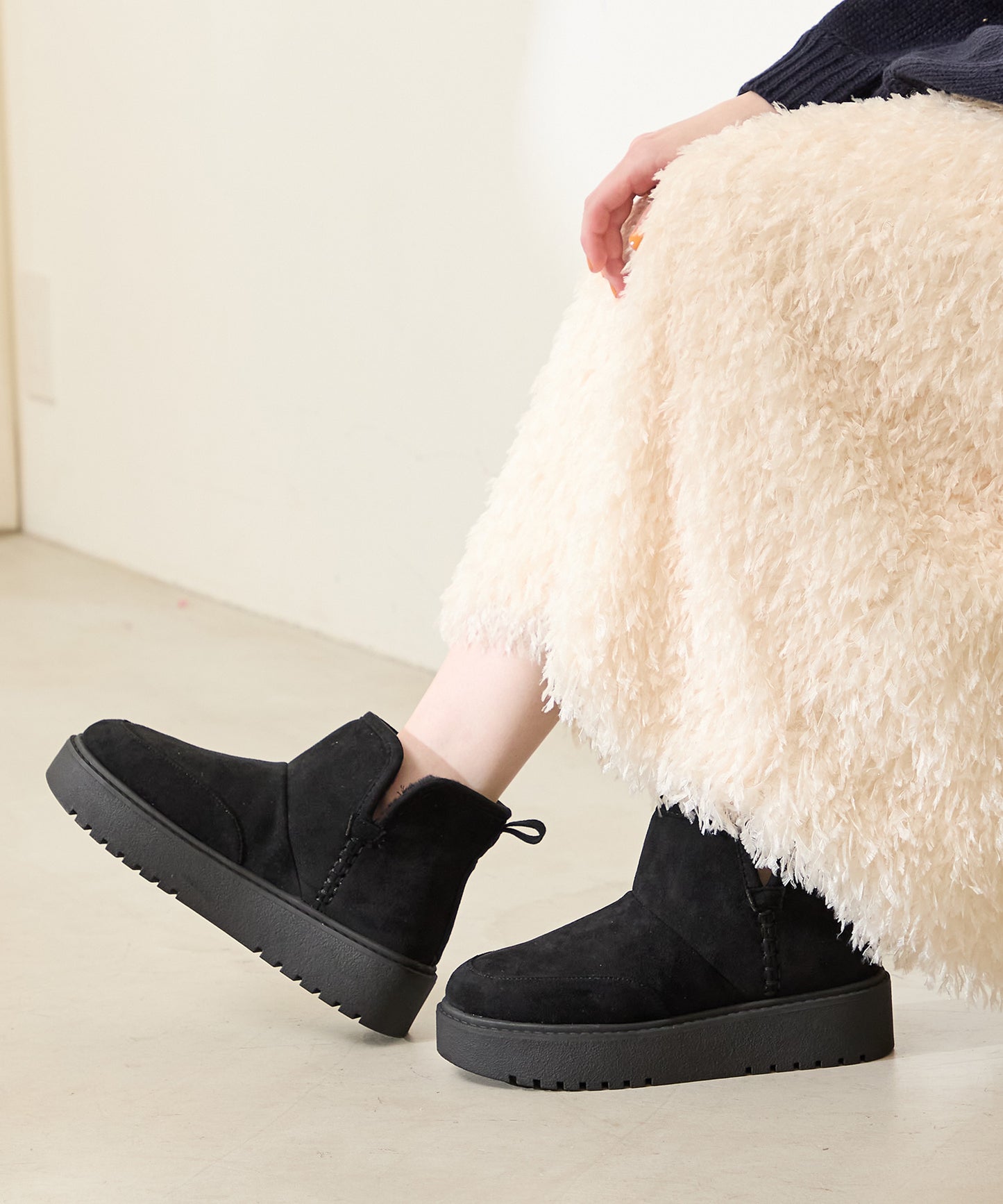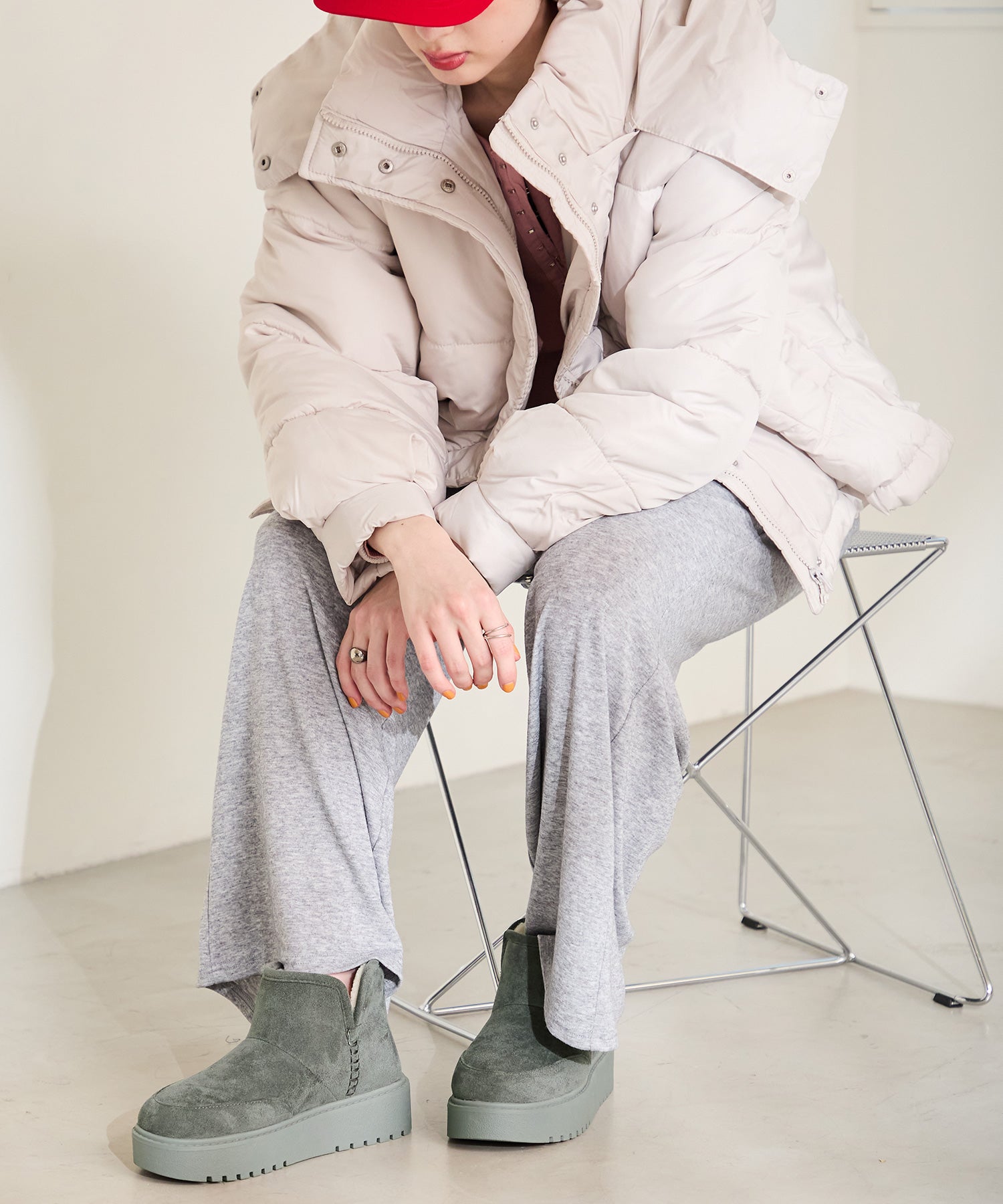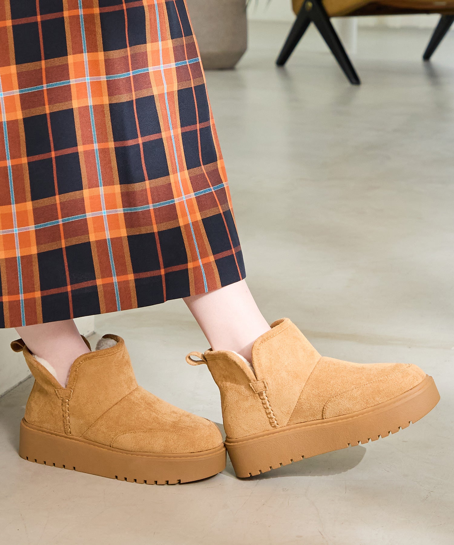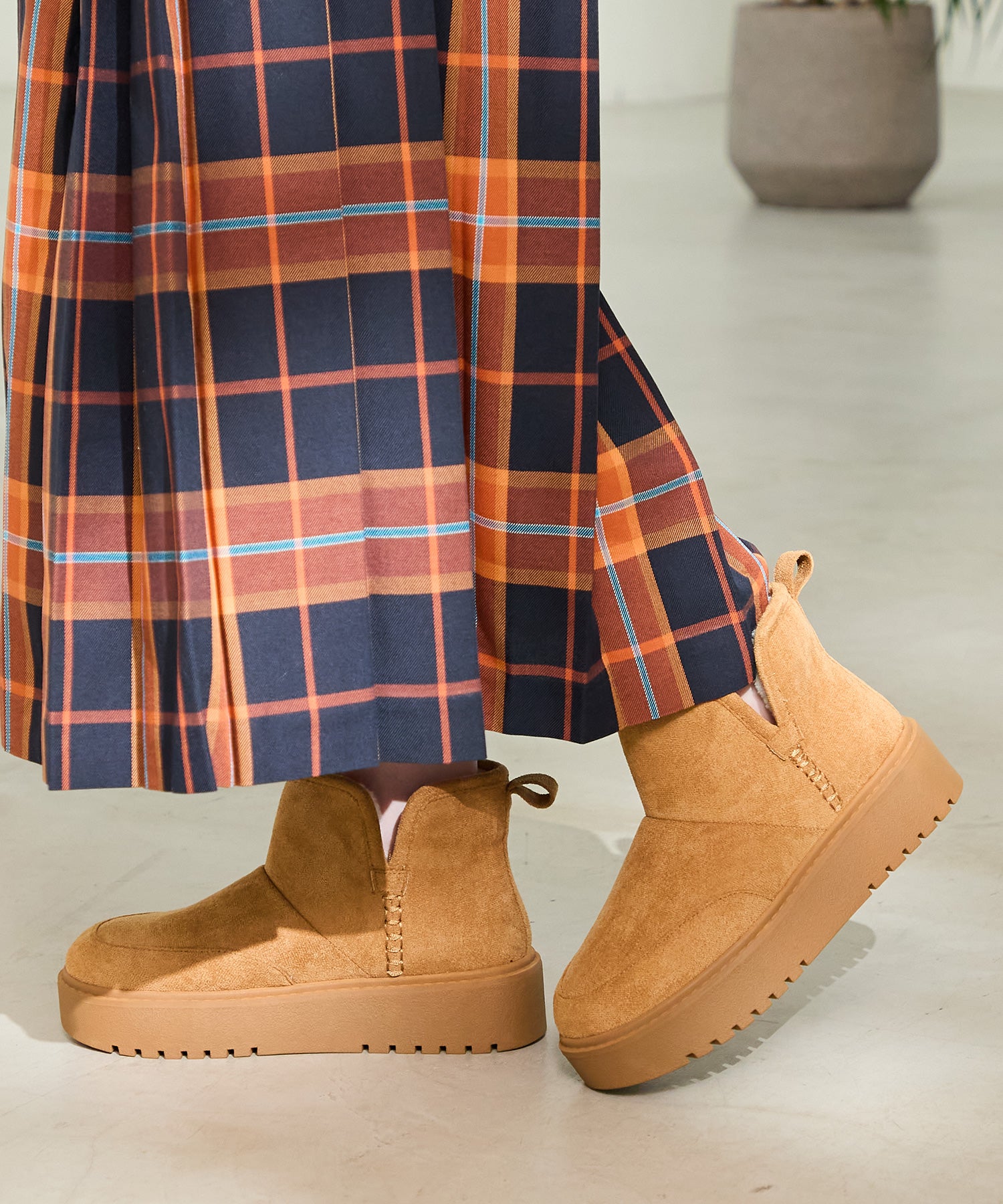 内側全体にフェイクファーをあしらったムートンブーツはお洒落さと防寒を両立できるアイテム。短めの筒丈で着脱しやすく、サイドスリット入りなので筒を折り返しても楽しめる2way仕様なのが嬉しいポイント。しっかり厚みのあるボリュームソールが今季らしいシルエットを叶えてくれる。ソールは柔らかく軽い材質で屈曲性が高く、フィット感抜群な機能面も充実したマストハブブーツ。