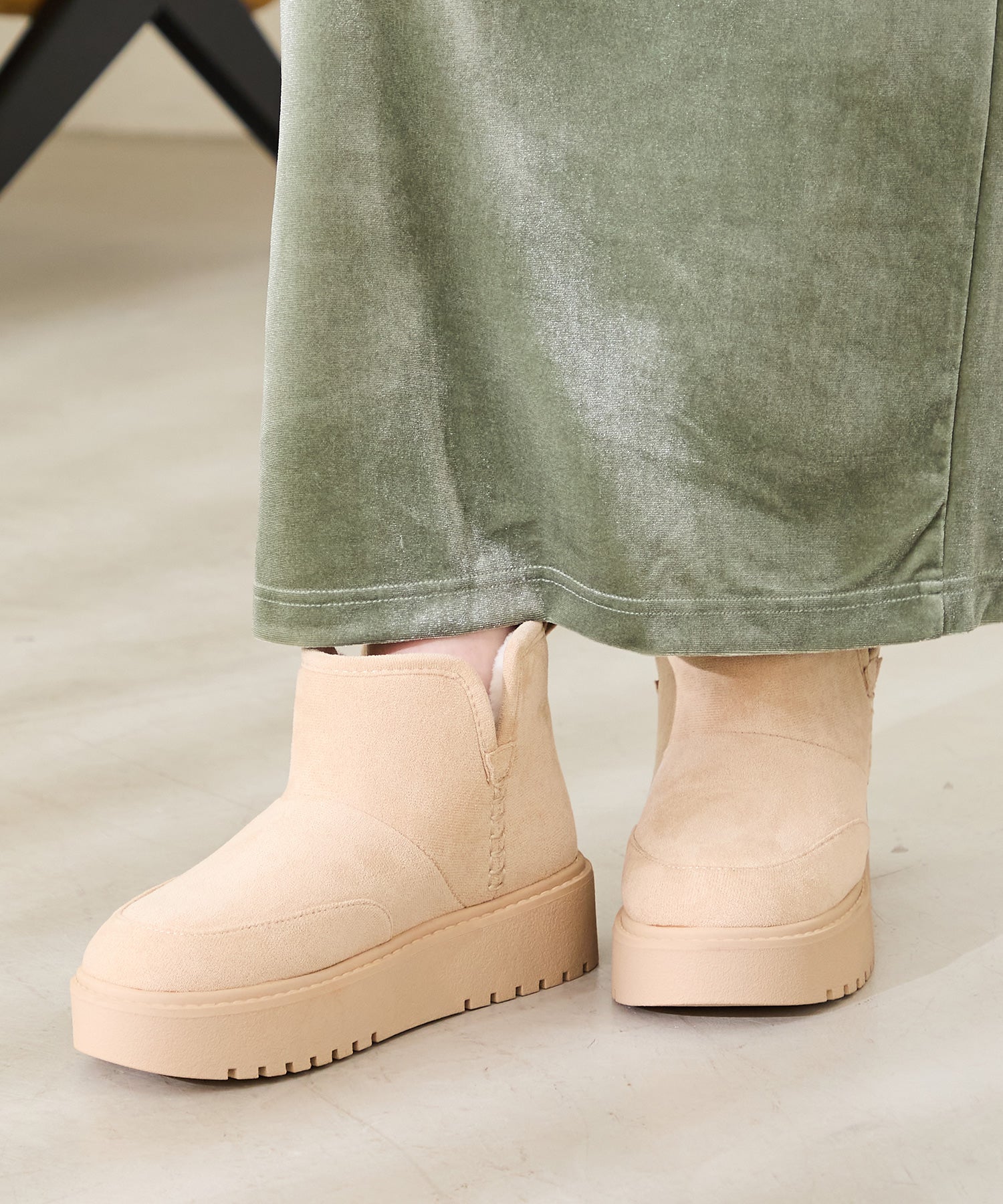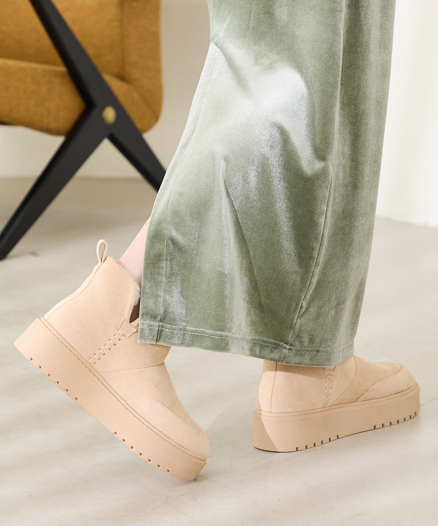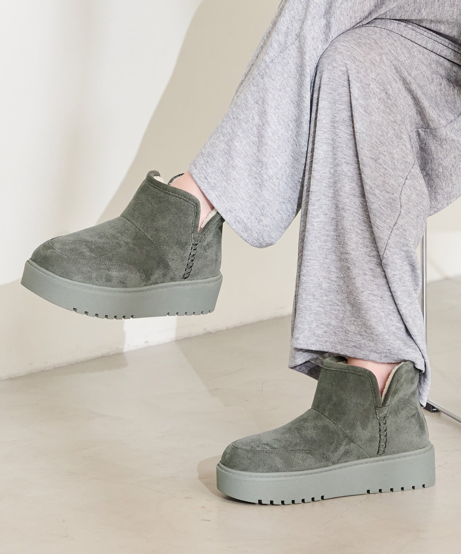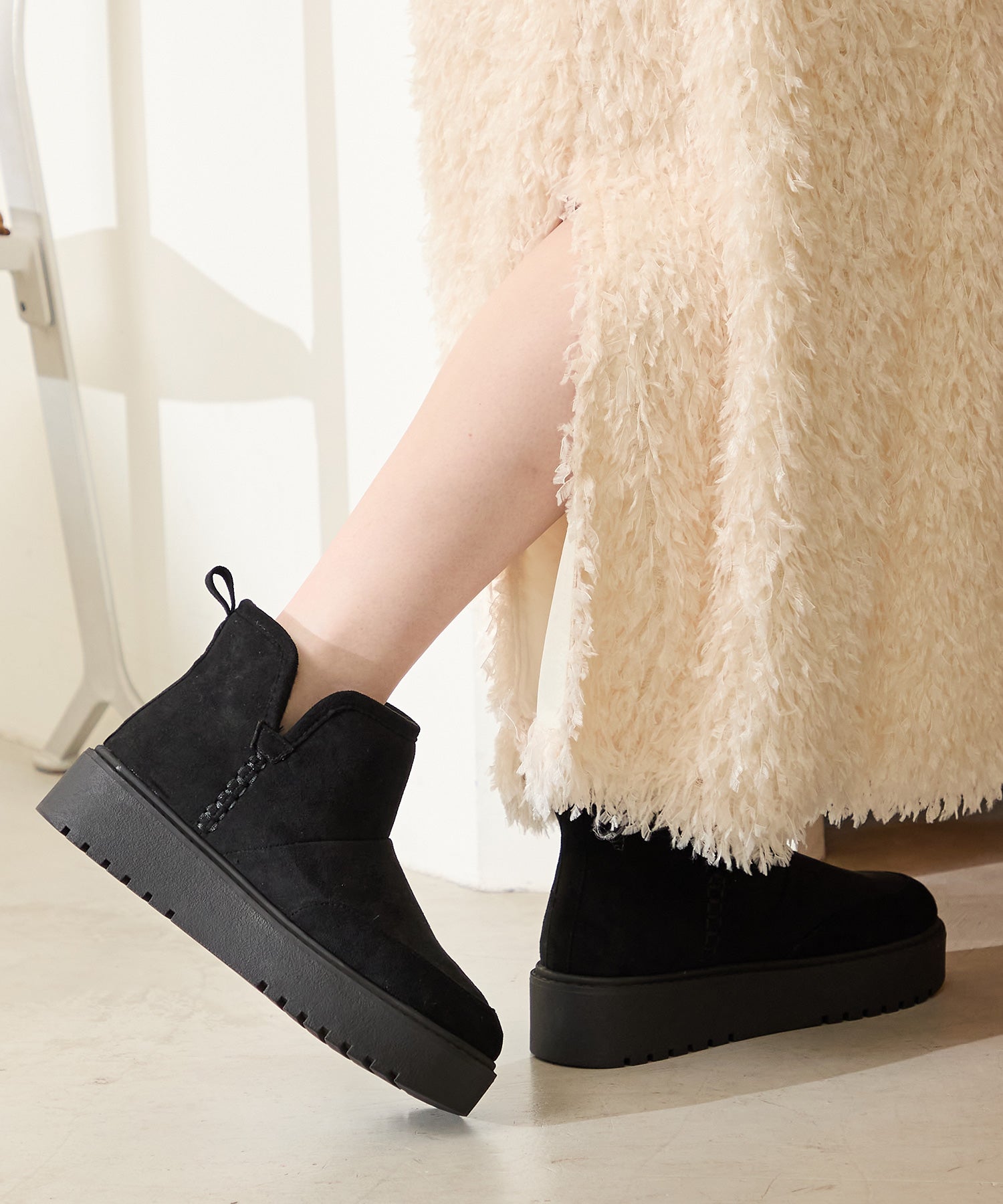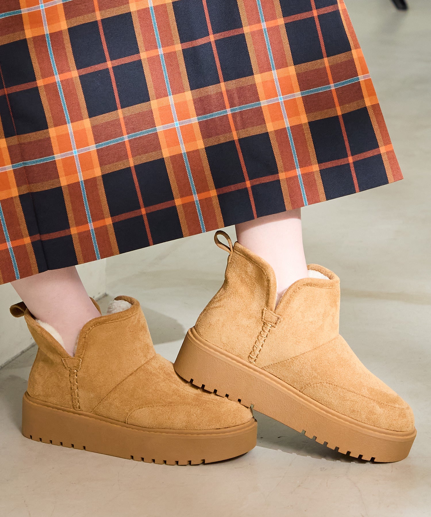 内側全体にフェイクファーをあしらったムートンブーツはお洒落さと防寒を両立できるアイテム。短めの筒丈で着脱しやすく、サイドスリット入りなので筒を折り返しても楽しめる2way仕様なのが嬉しいポイント。しっかり厚みのあるボリュームソールが今季らしいシルエットを叶えてくれる。ソールは柔らかく軽い材質で屈曲性が高く、フィット感抜群な機能面も充実したマストハブブーツ。