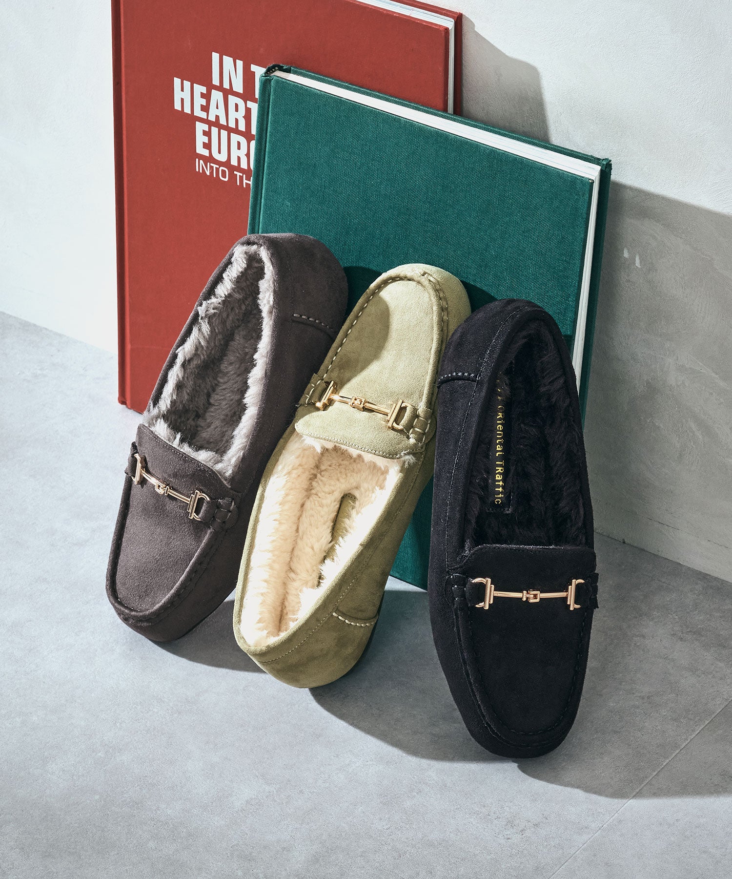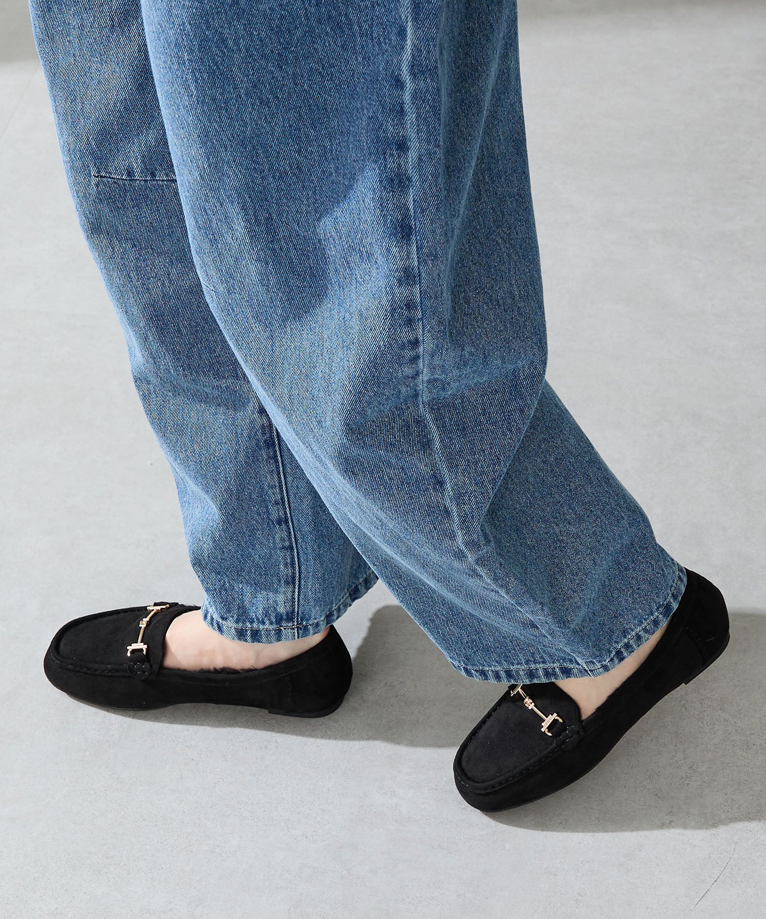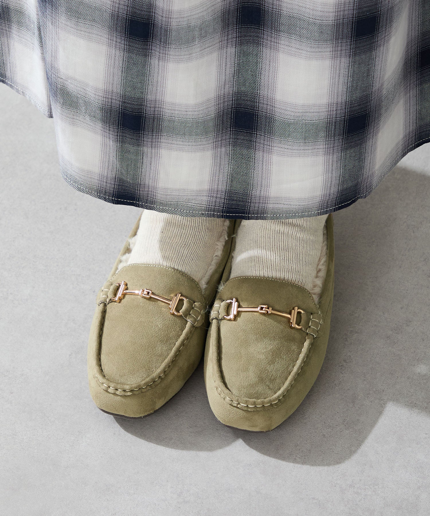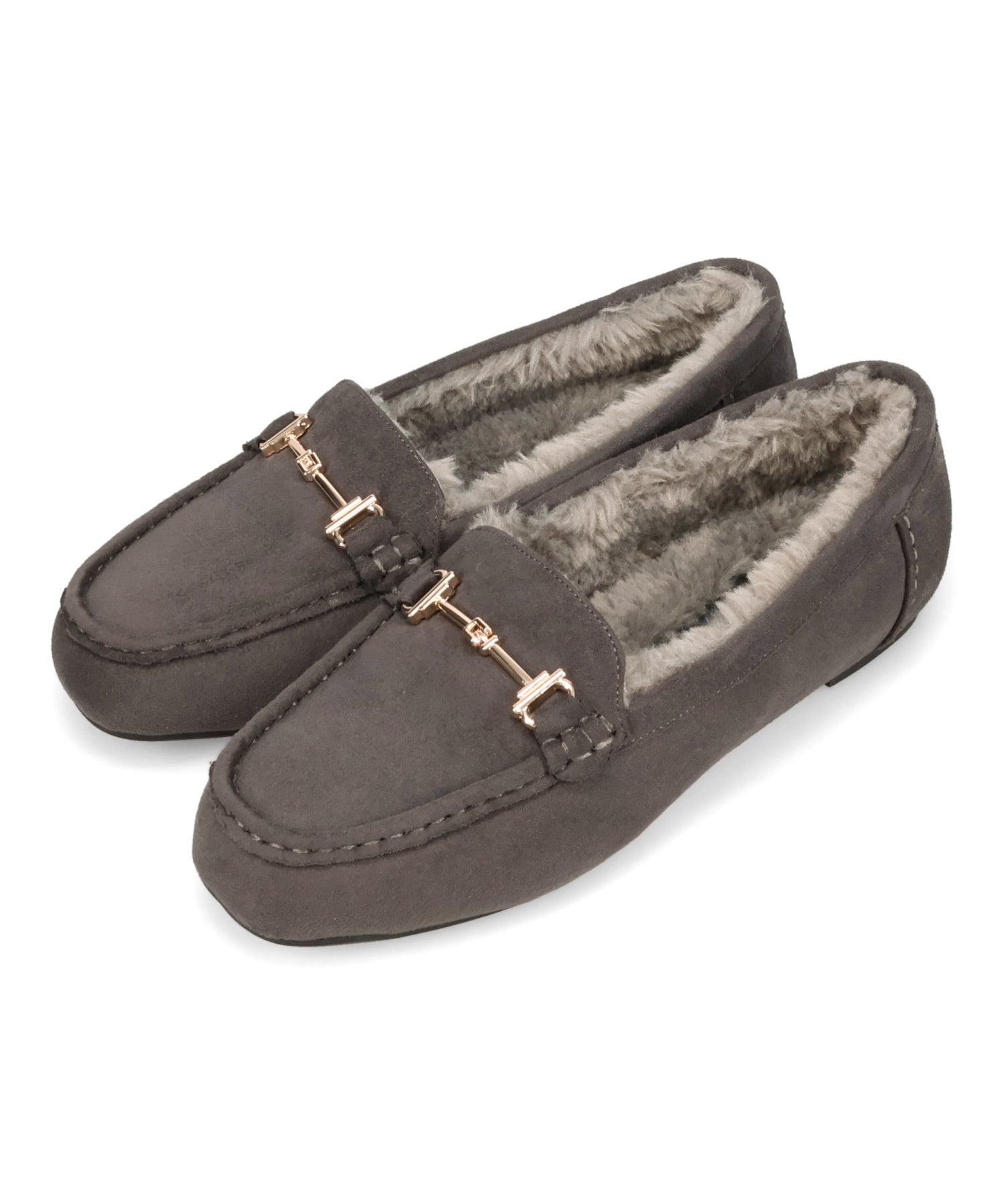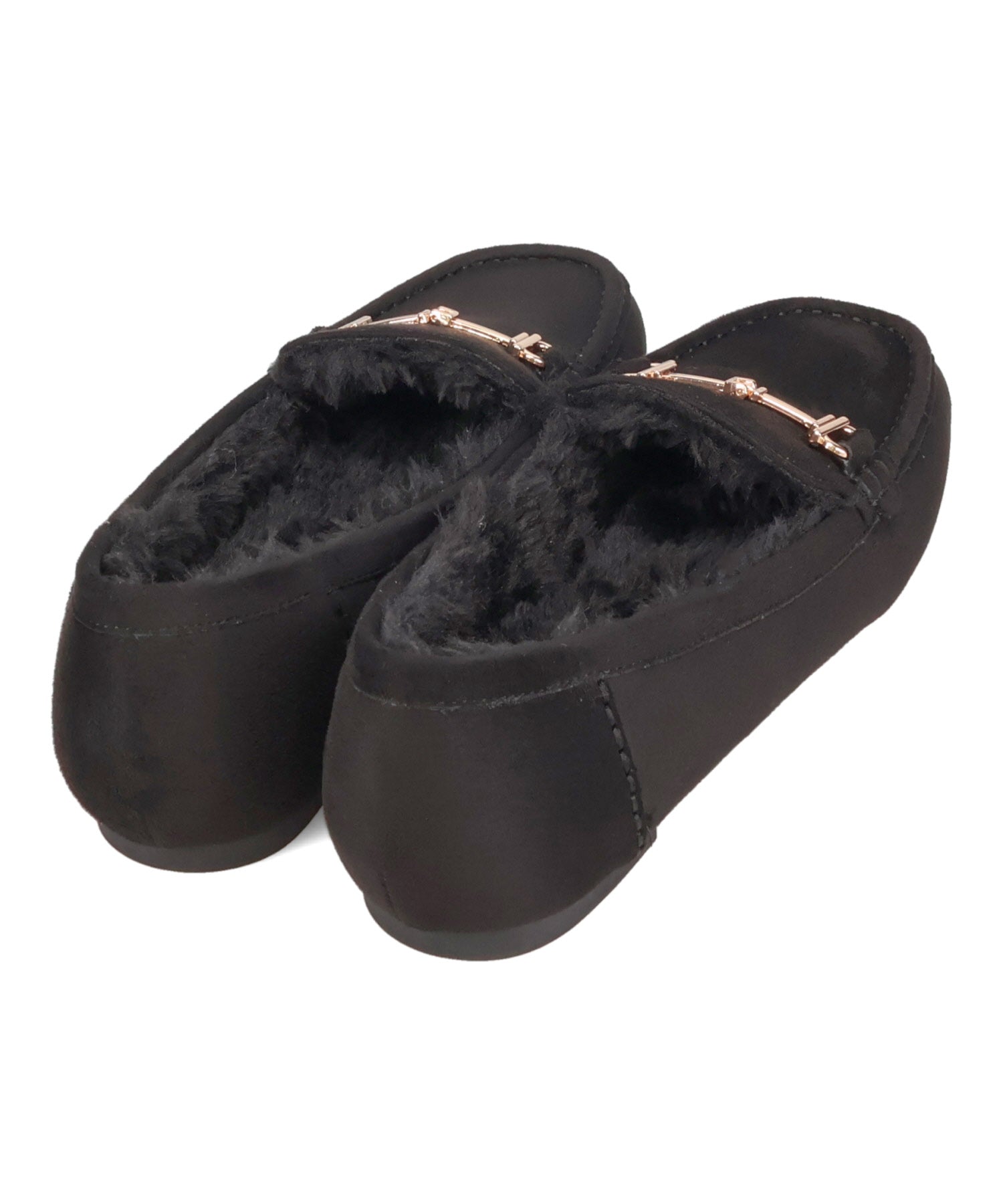 軽くて暖かい人気のムートンシューズは、ゴールドのビットモチーフを付けたデザインで高級感のある仕上がりに。中敷や内側全体にふわふわのフェイクファーを使用し、足裏や指先まで優しく包み込んでくれる履き心地。さっと楽に履ける上に、甲を覆う深めの履き口でホールド感があり、防寒アイテムとして最適なシューズは、この冬大活躍すること間違い無し。