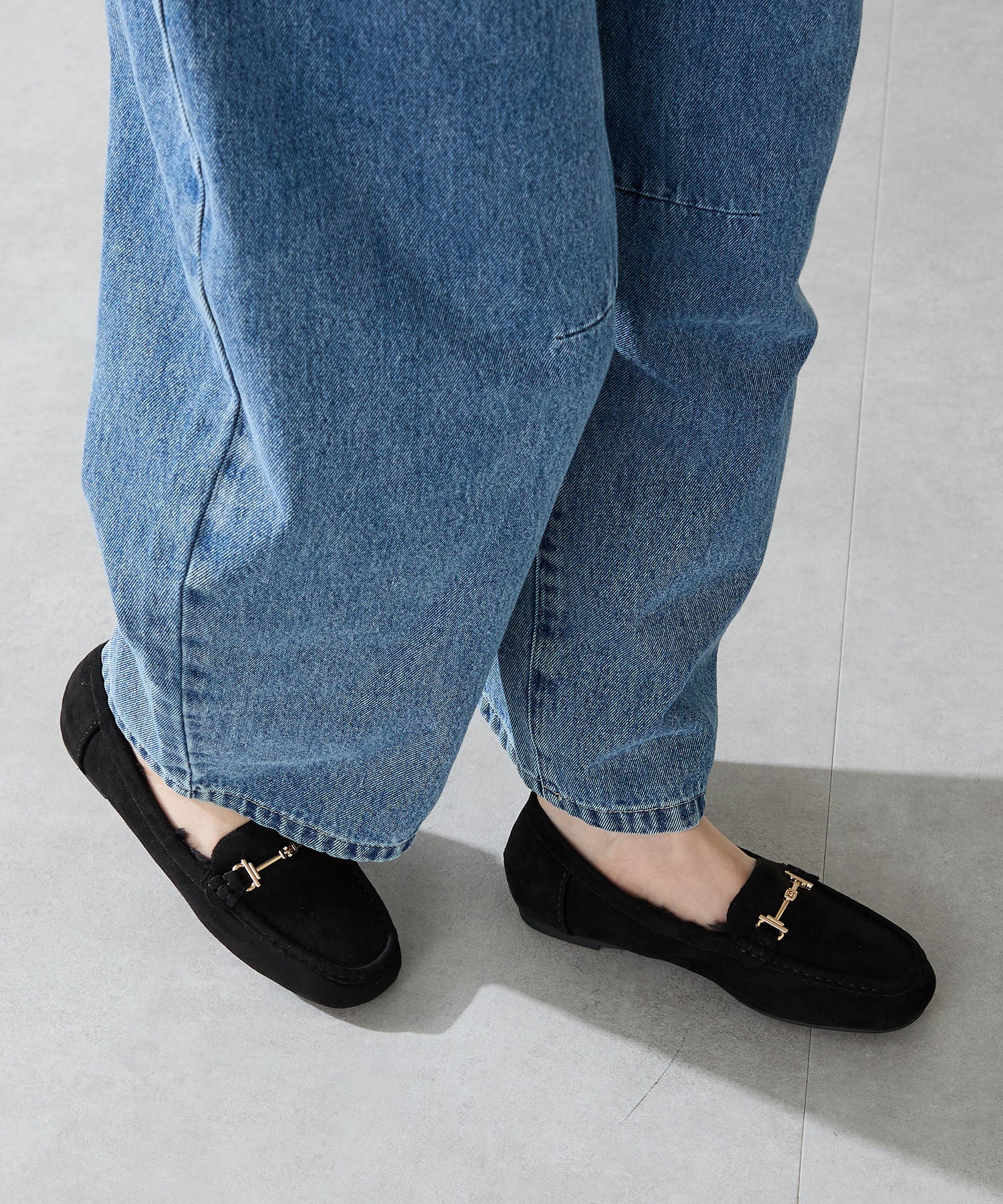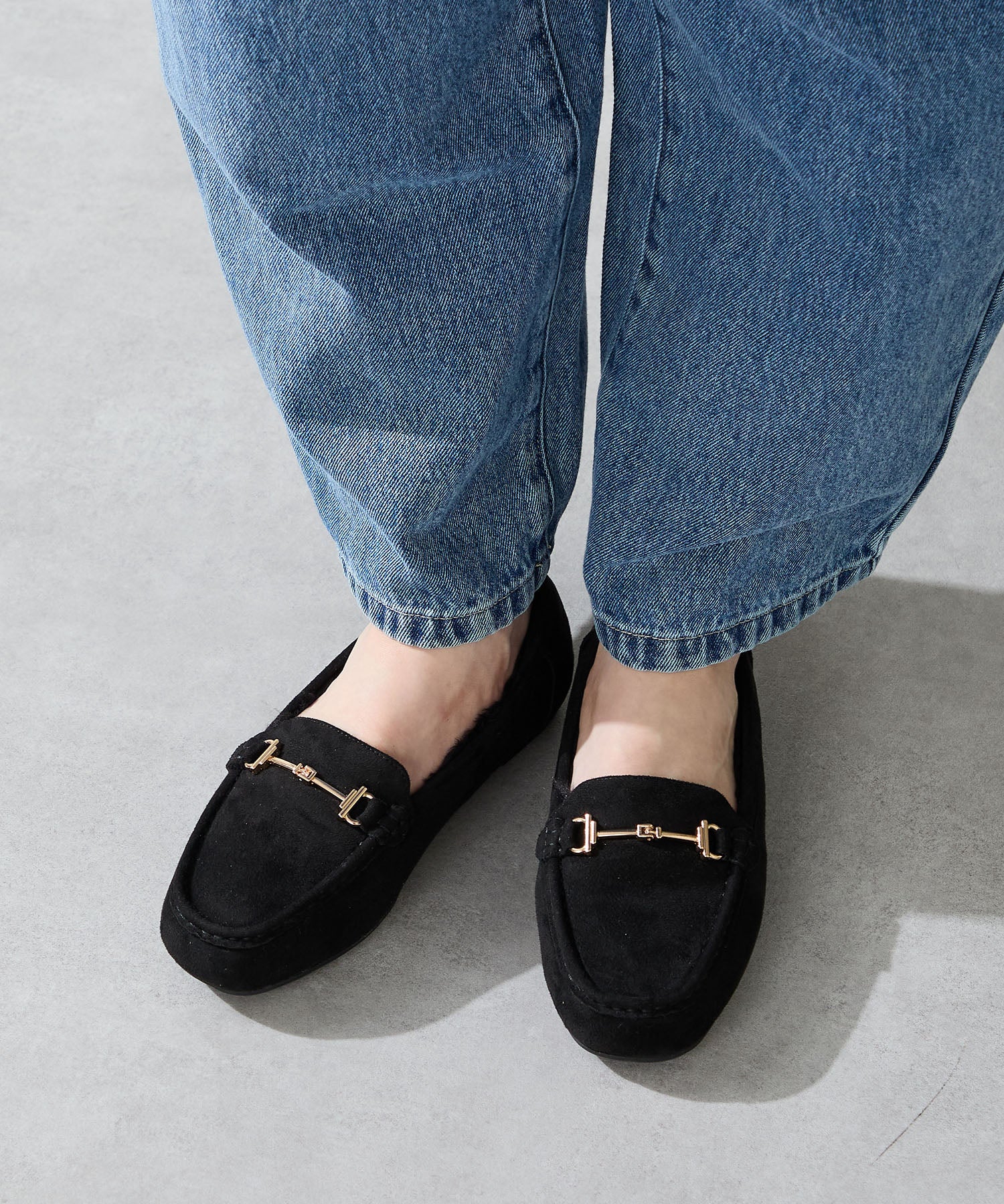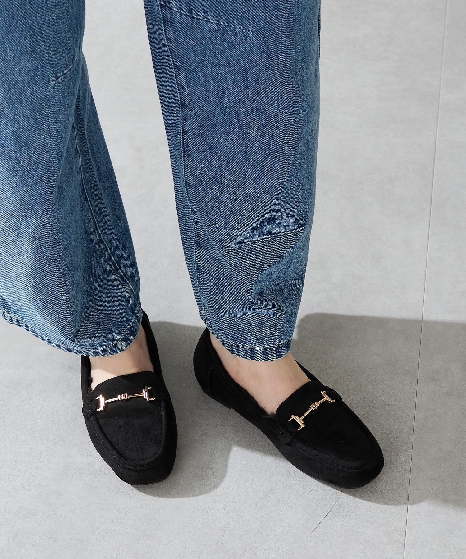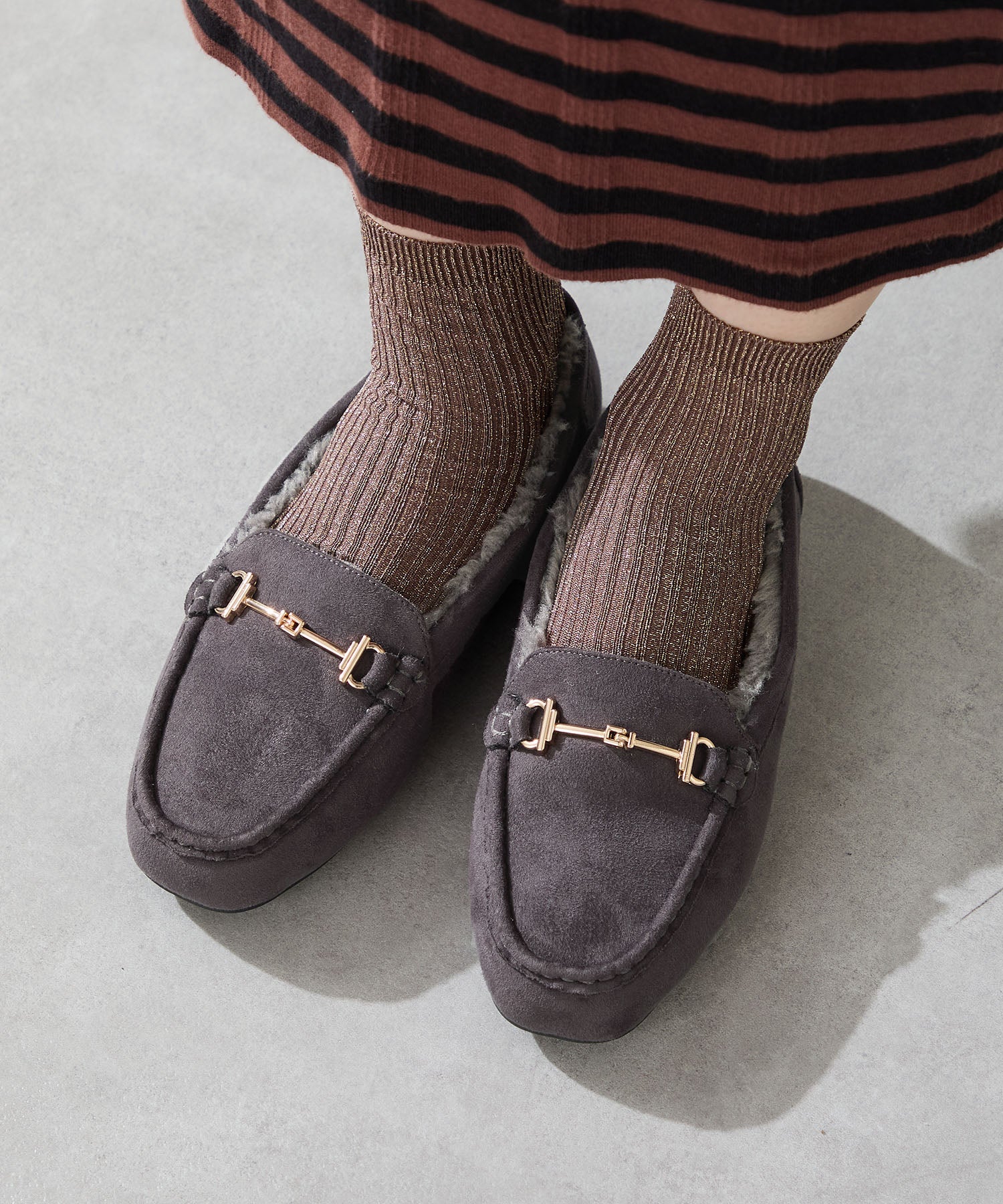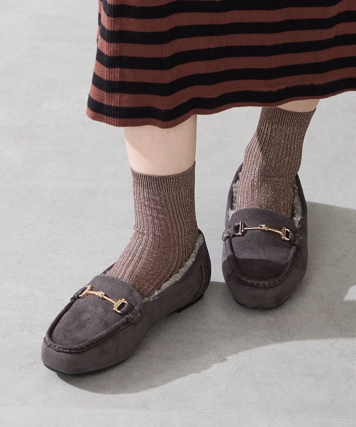 軽くて暖かい人気のムートンシューズは、ゴールドのビットモチーフを付けたデザインで高級感のある仕上がりに。中敷や内側全体にふわふわのフェイクファーを使用し、足裏や指先まで優しく包み込んでくれる履き心地。さっと楽に履ける上に、甲を覆う深めの履き口でホールド感があり、防寒アイテムとして最適なシューズは、この冬大活躍すること間違い無し。