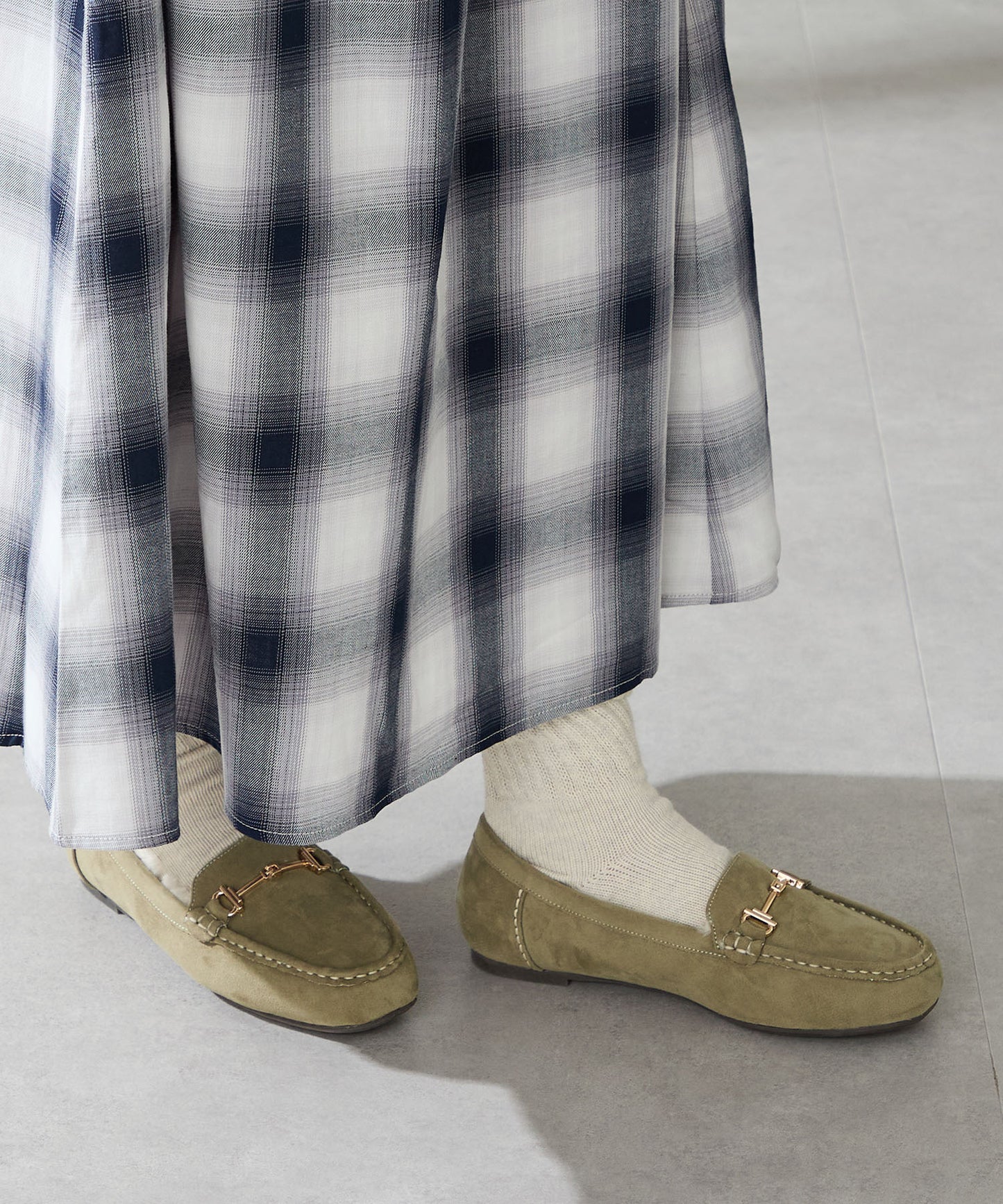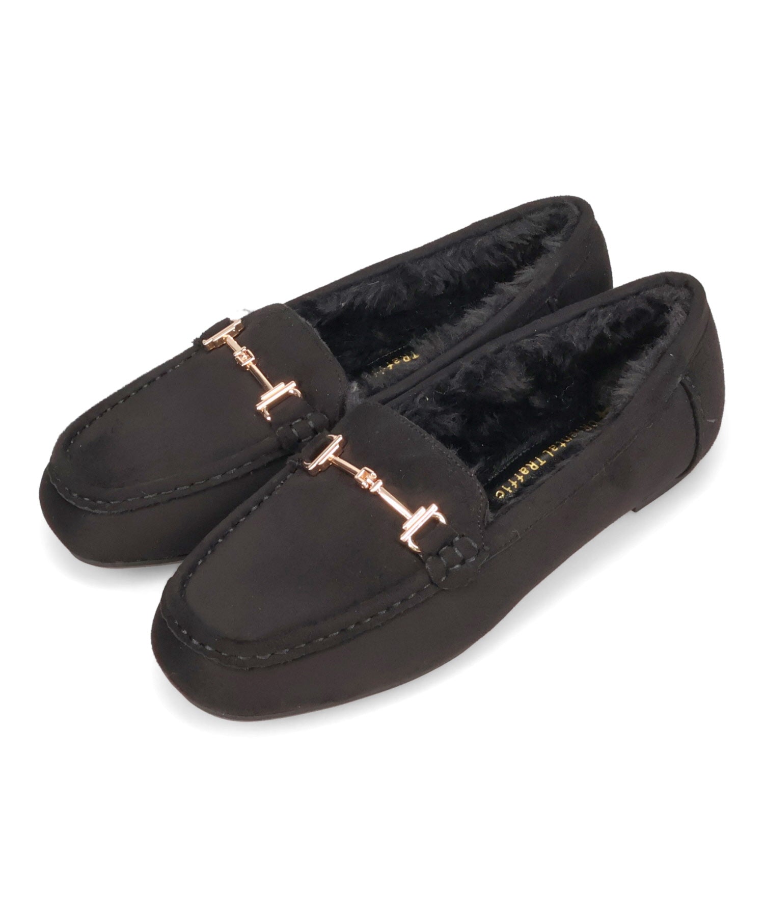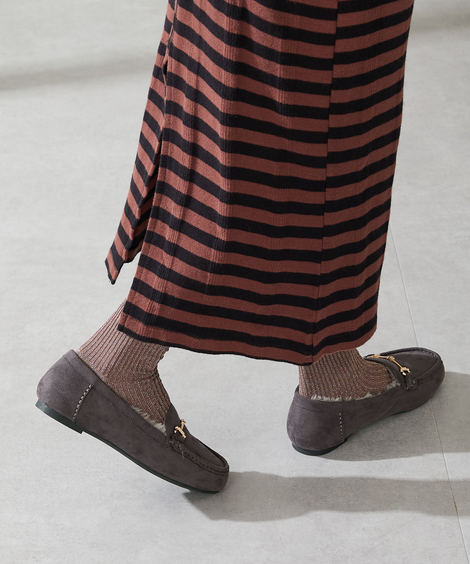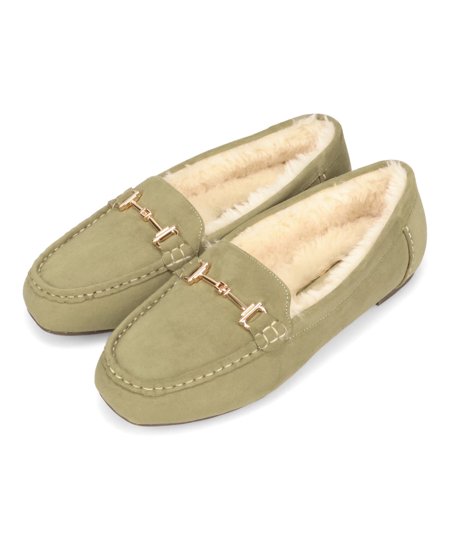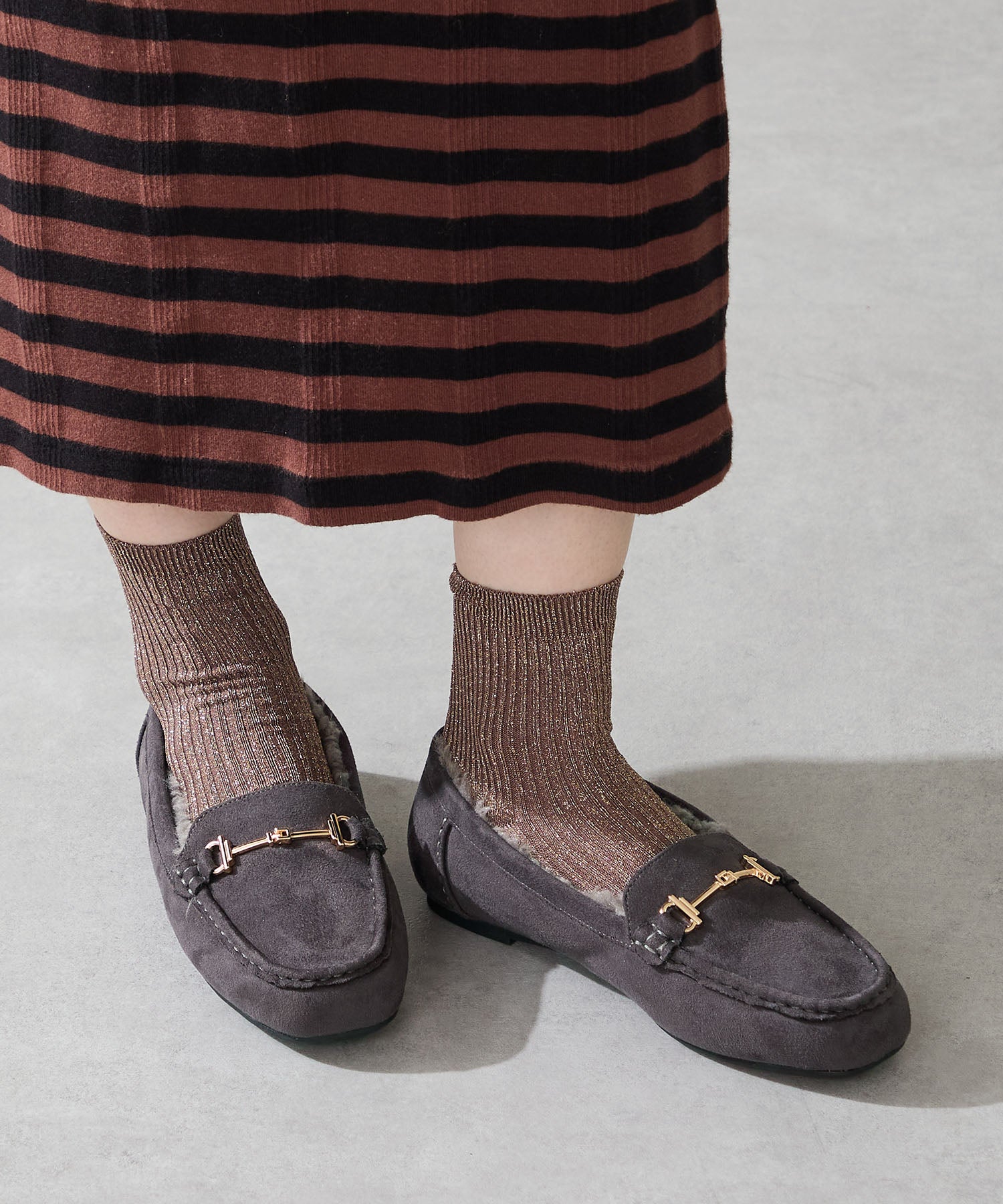 軽くて暖かい人気のムートンシューズは、ゴールドのビットモチーフを付けたデザインで高級感のある仕上がりに。中敷や内側全体にふわふわのフェイクファーを使用し、足裏や指先まで優しく包み込んでくれる履き心地。さっと楽に履ける上に、甲を覆う深めの履き口でホールド感があり、防寒アイテムとして最適なシューズは、この冬大活躍すること間違い無し。