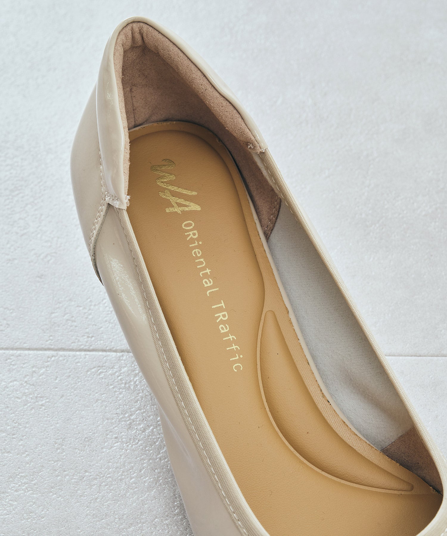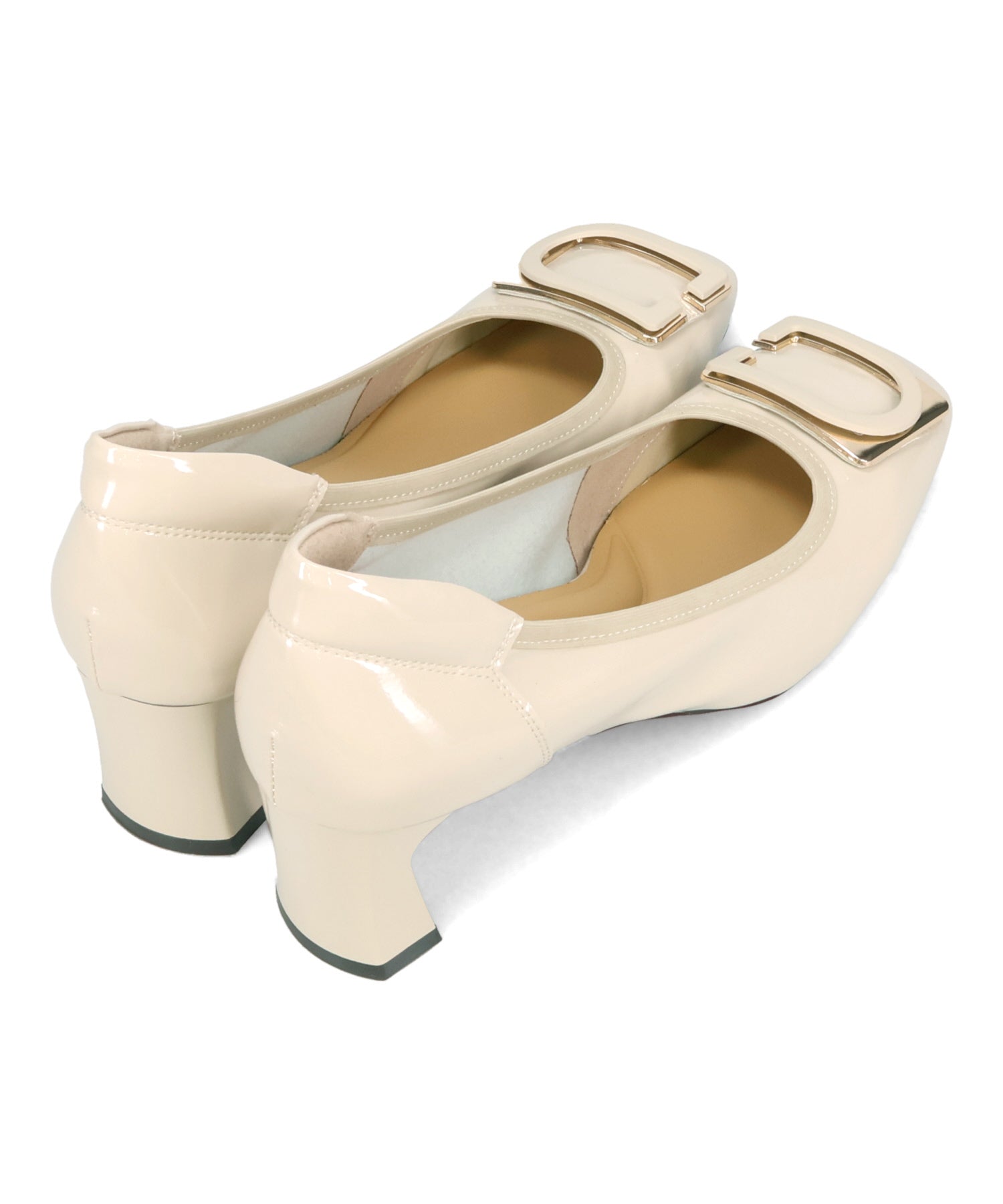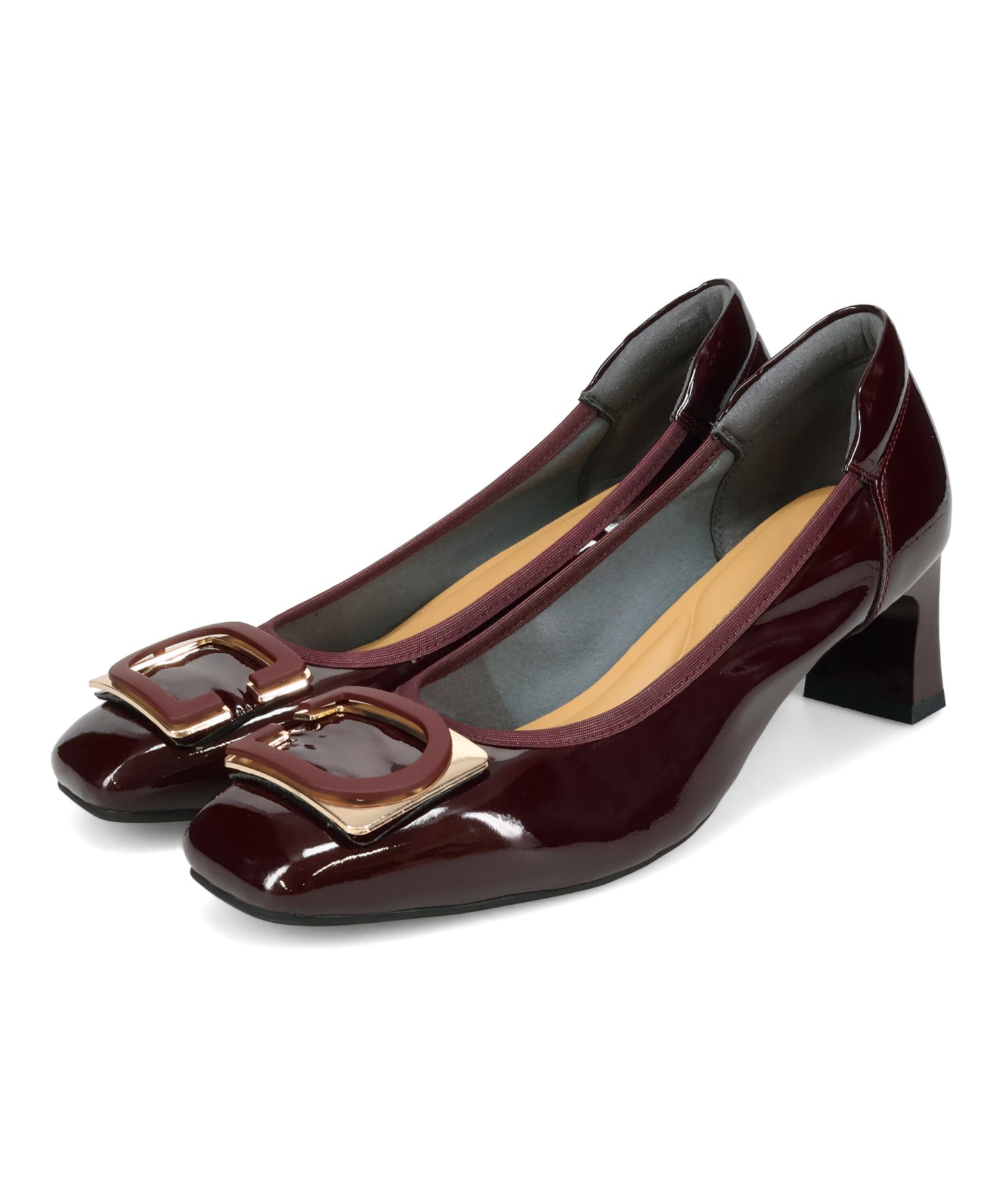 大ぶりなバックルが目を引くヒーパンプスはエレガントさ際立つアイテム。艶が上品なエナメル素材はくたっと柔らかいものを使用して履いた瞬間に足に馴染んでくれる。つま先はスクエアトゥにすることで指周りをゆったりとさせて、中敷の立体的なクッションや踵クッションも内蔵しヒールパンプスでも足への負担がかかりにくく通勤用としても活躍してくれそう。