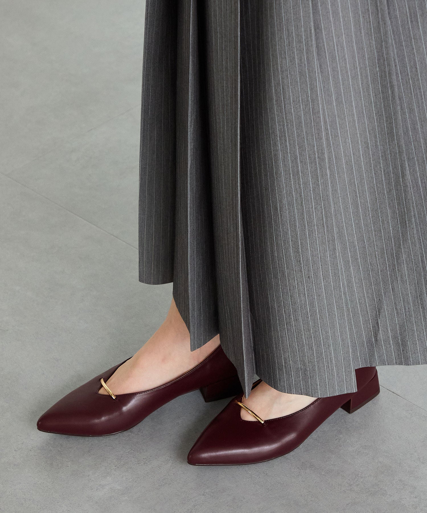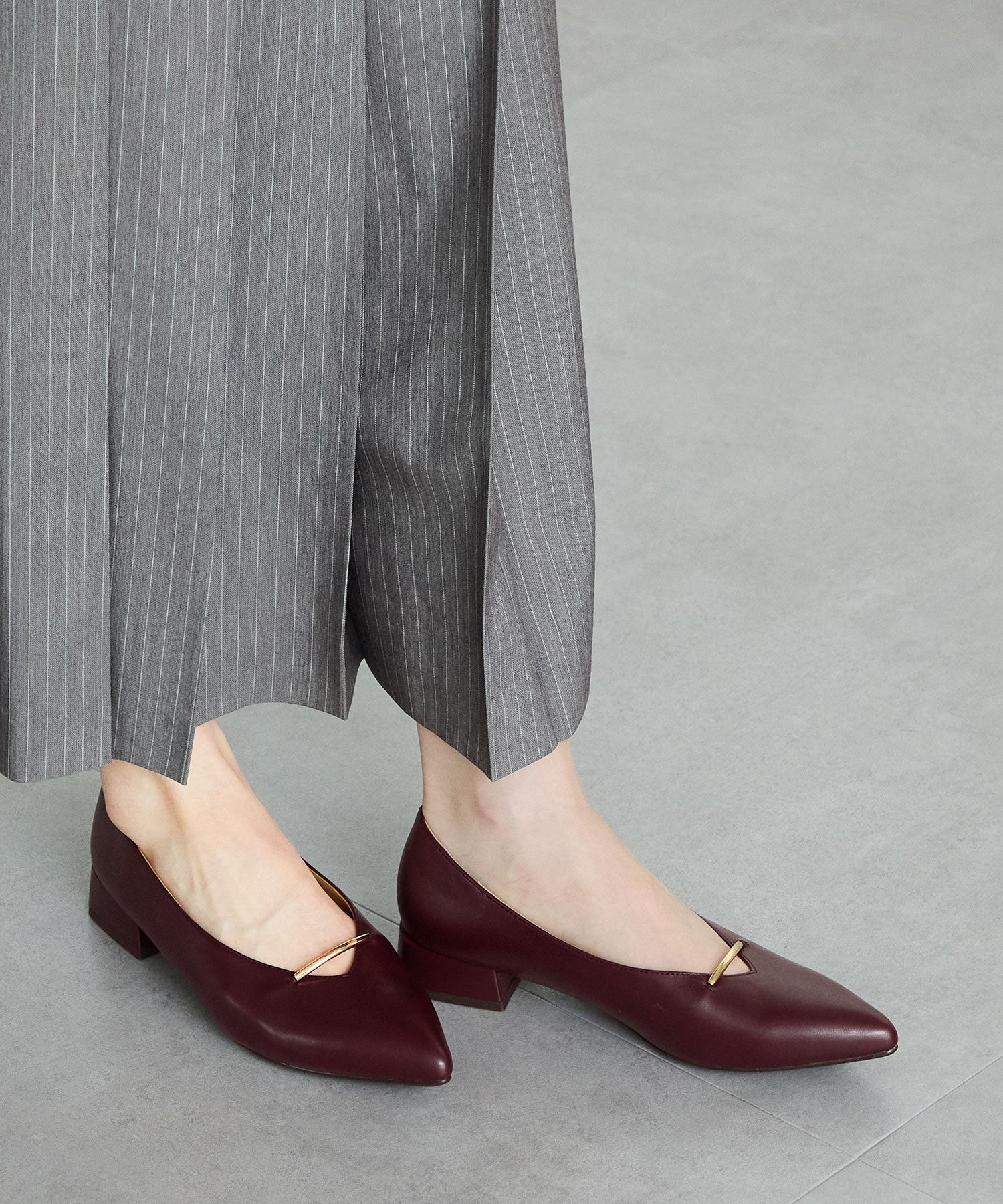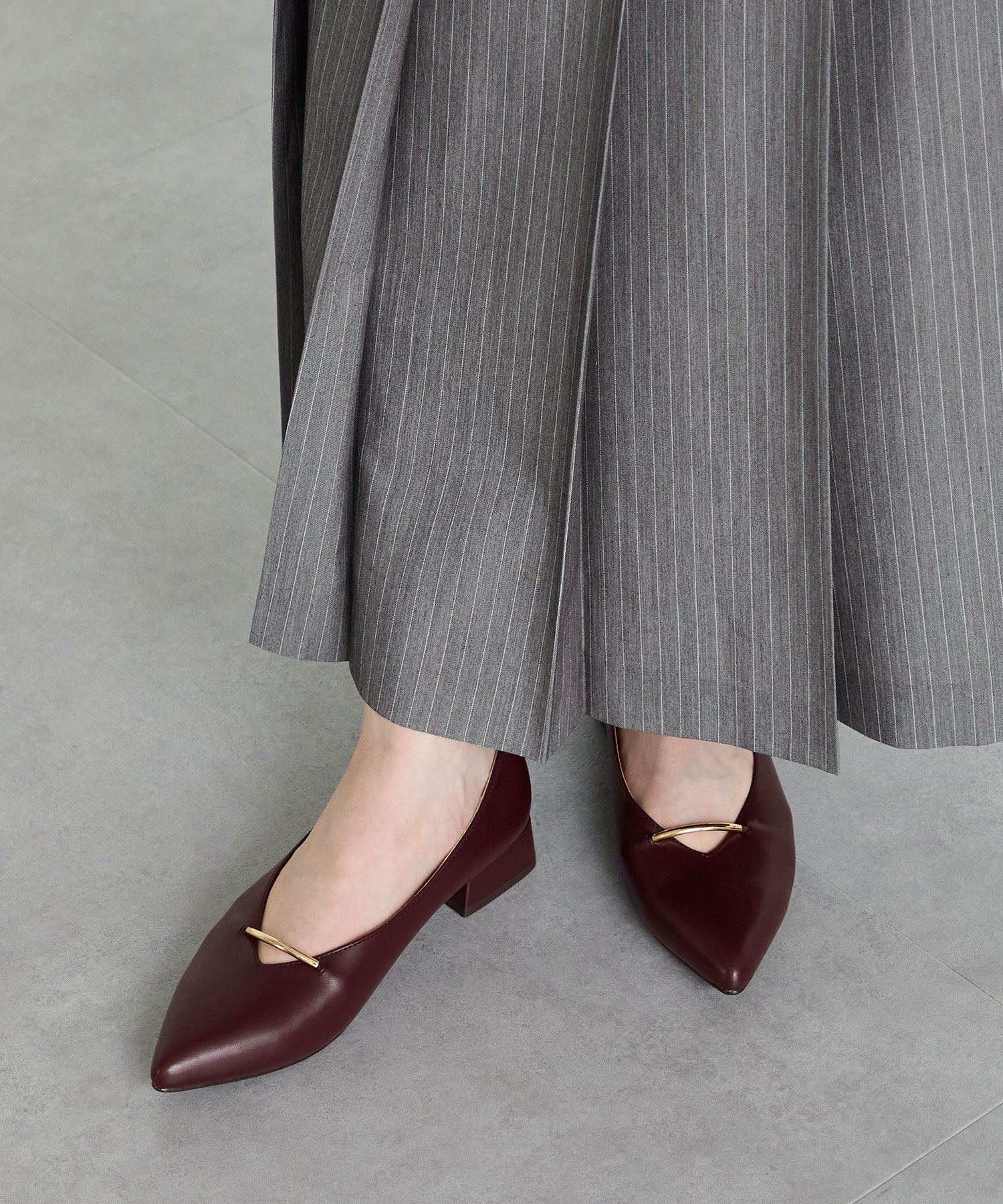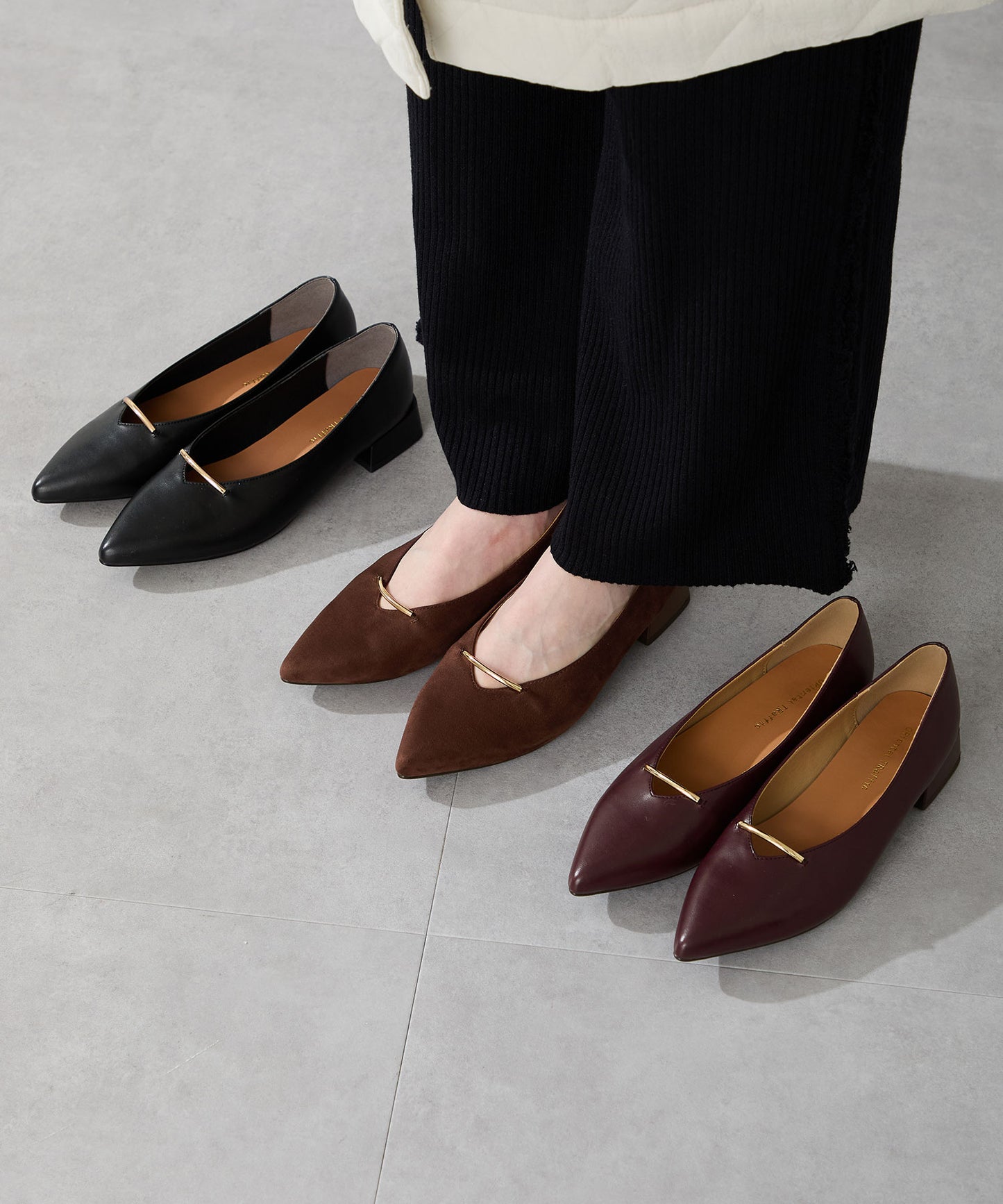 今季トレンドの深みのあるレッドとブラウンにブラックを加えたカラーバリエーションで登場した1足。アッパーに施したゴールドラインと、ポインテッドトゥが女性らしさを引き立ててくれ、履き口がVカットになっているのですっきりした足元に。ブラウンはスエードにすることで、より暖かみのある雰囲気を演出。プライベートや通勤用でも使いやすく、様々な場面でマルチに活躍するアイテム。