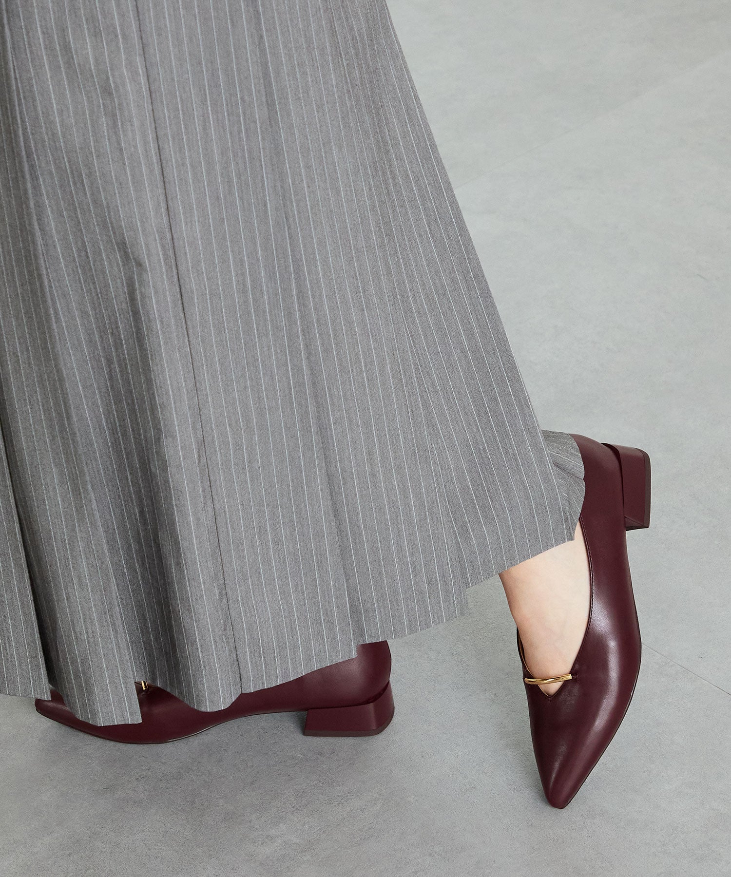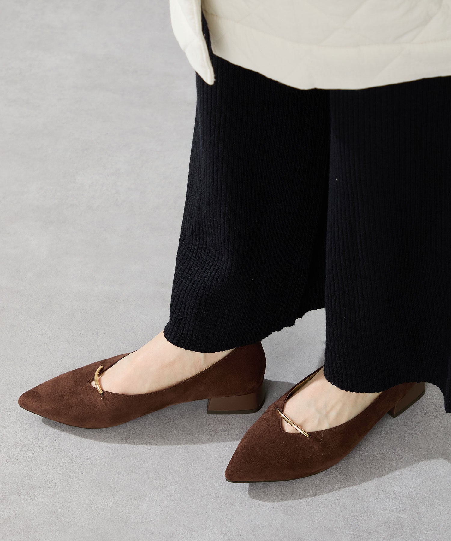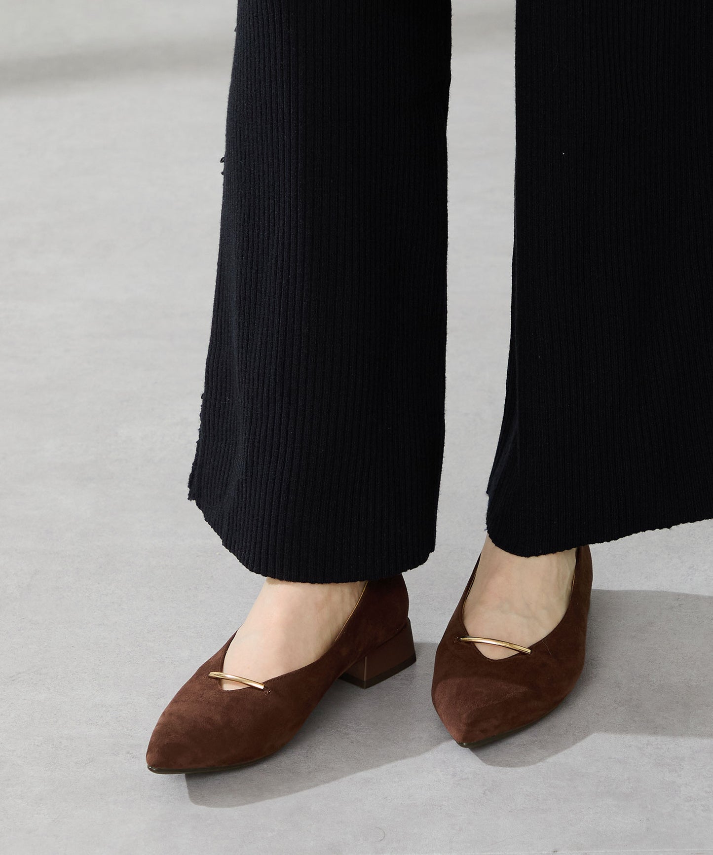 今季トレンドの深みのあるレッドとブラウンにブラックを加えたカラーバリエーションで登場した1足。アッパーに施したゴールドラインと、ポインテッドトゥが女性らしさを引き立ててくれ、履き口がVカットになっているのですっきりした足元に。ブラウンはスエードにすることで、より暖かみのある雰囲気を演出。プライベートや通勤用でも使いやすく、様々な場面でマルチに活躍するアイテム。