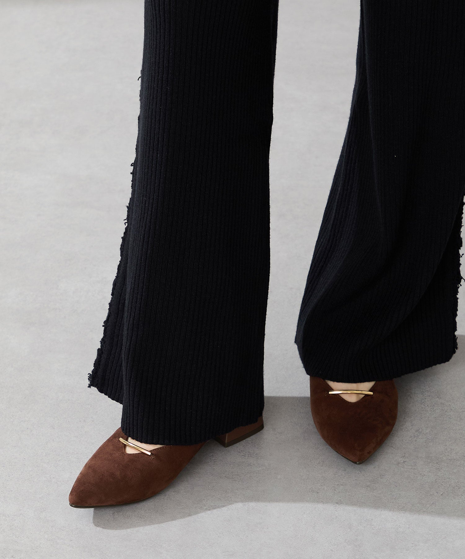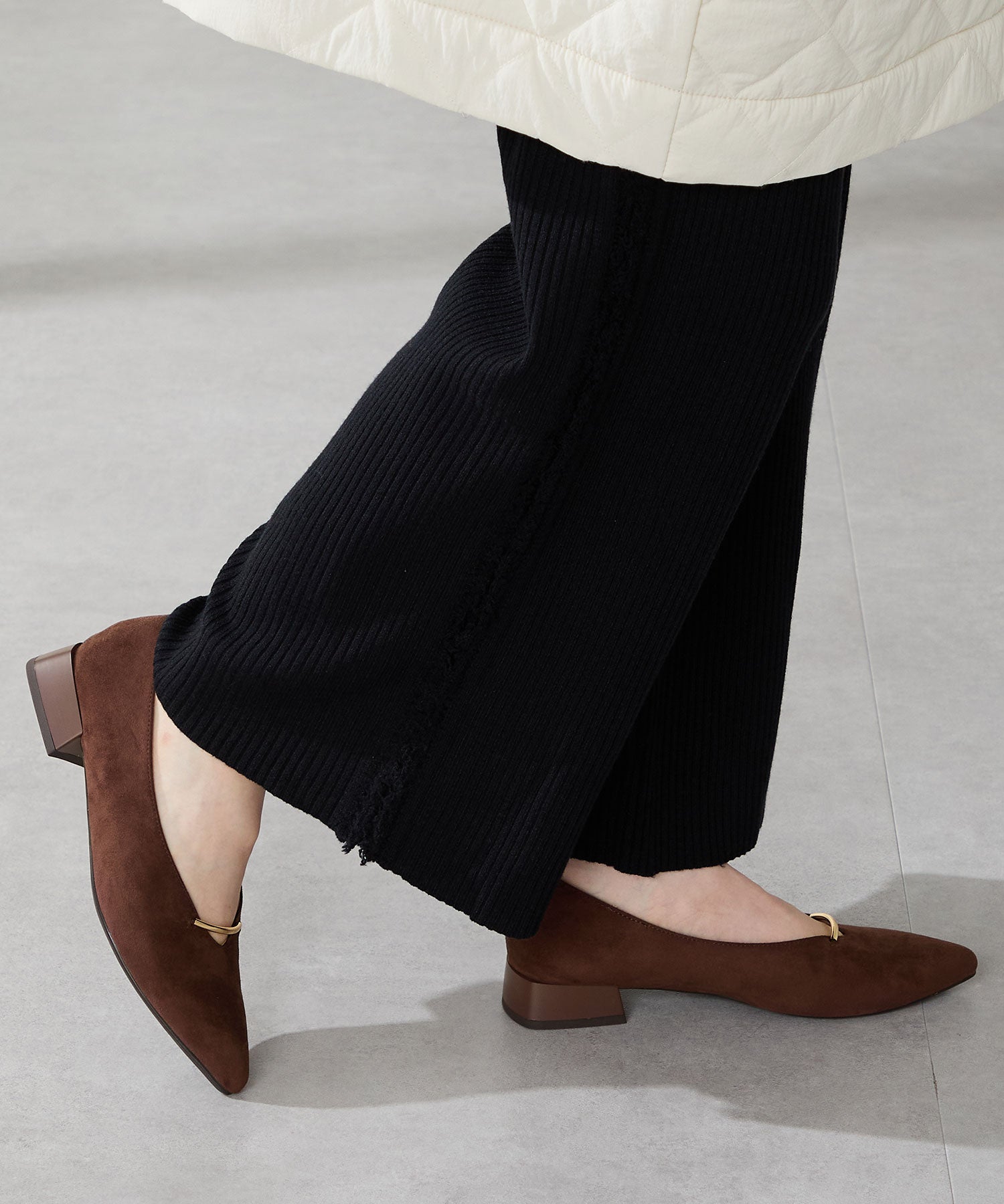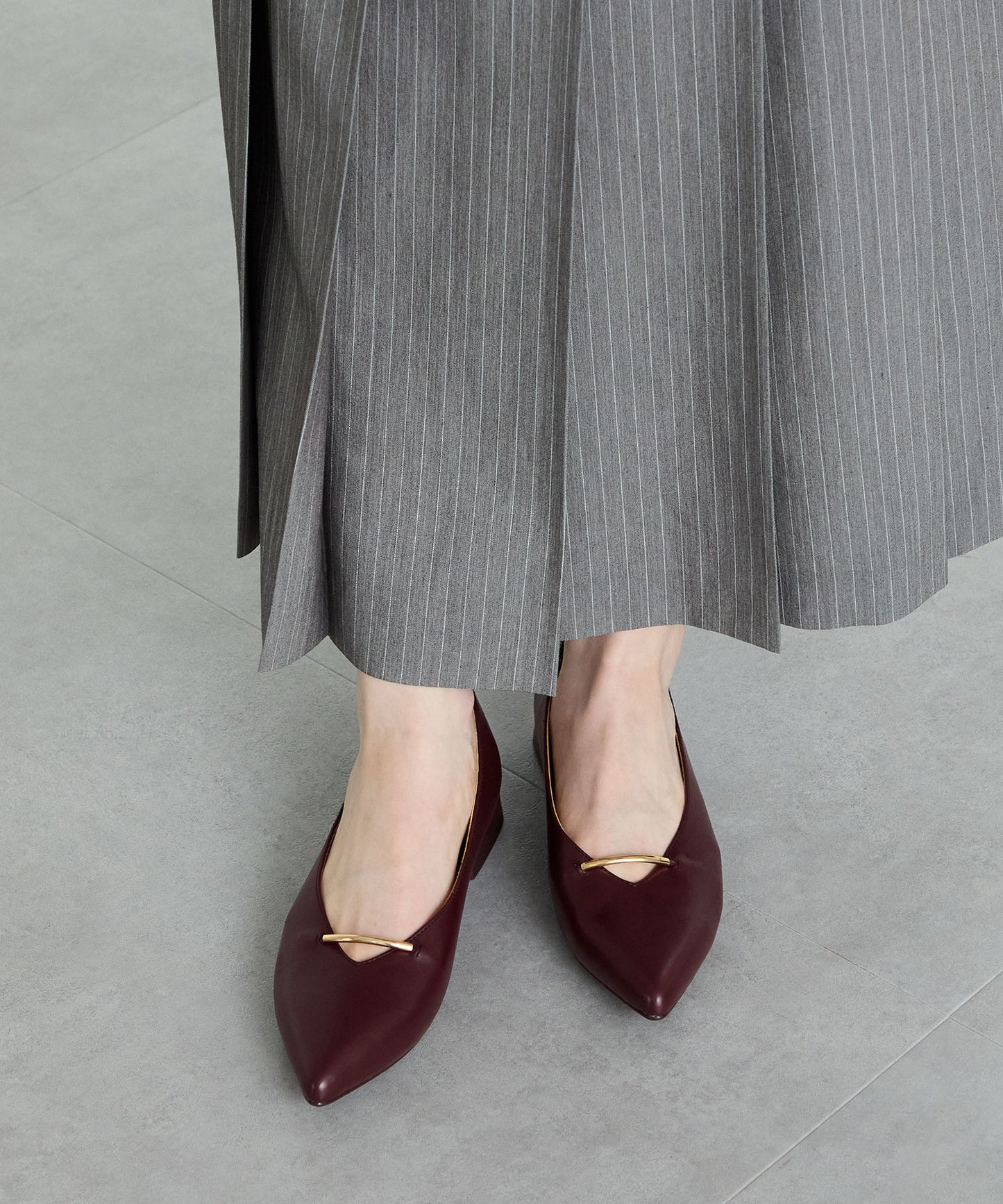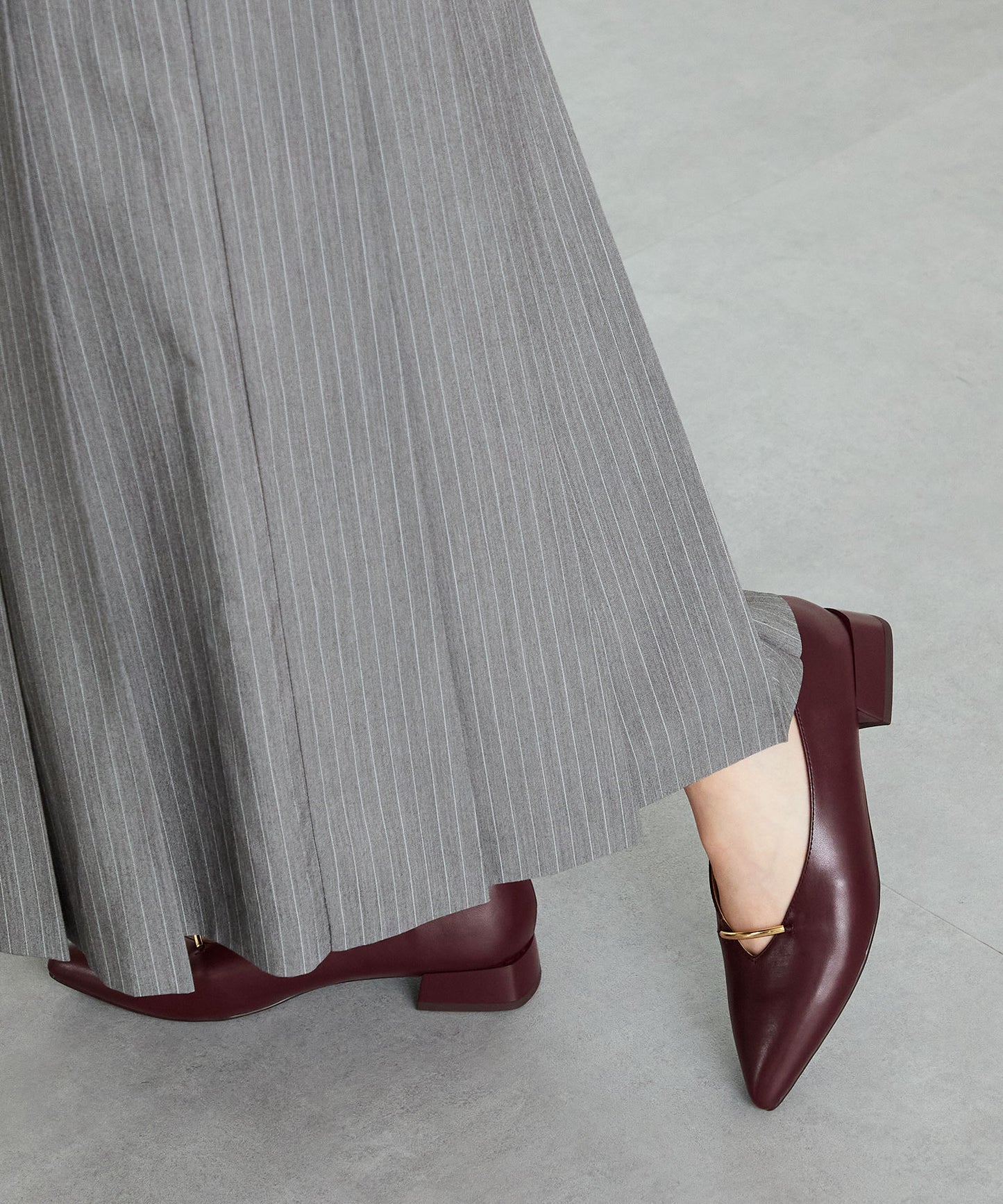 今季トレンドの深みのあるレッドとブラウンにブラックを加えたカラーバリエーションで登場した1足。アッパーに施したゴールドラインと、ポインテッドトゥが女性らしさを引き立ててくれ、履き口がVカットになっているのですっきりした足元に。ブラウンはスエードにすることで、より暖かみのある雰囲気を演出。プライベートや通勤用でも使いやすく、様々な場面でマルチに活躍するアイテム。