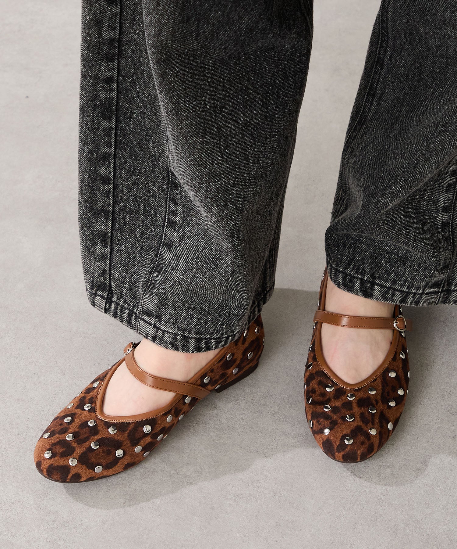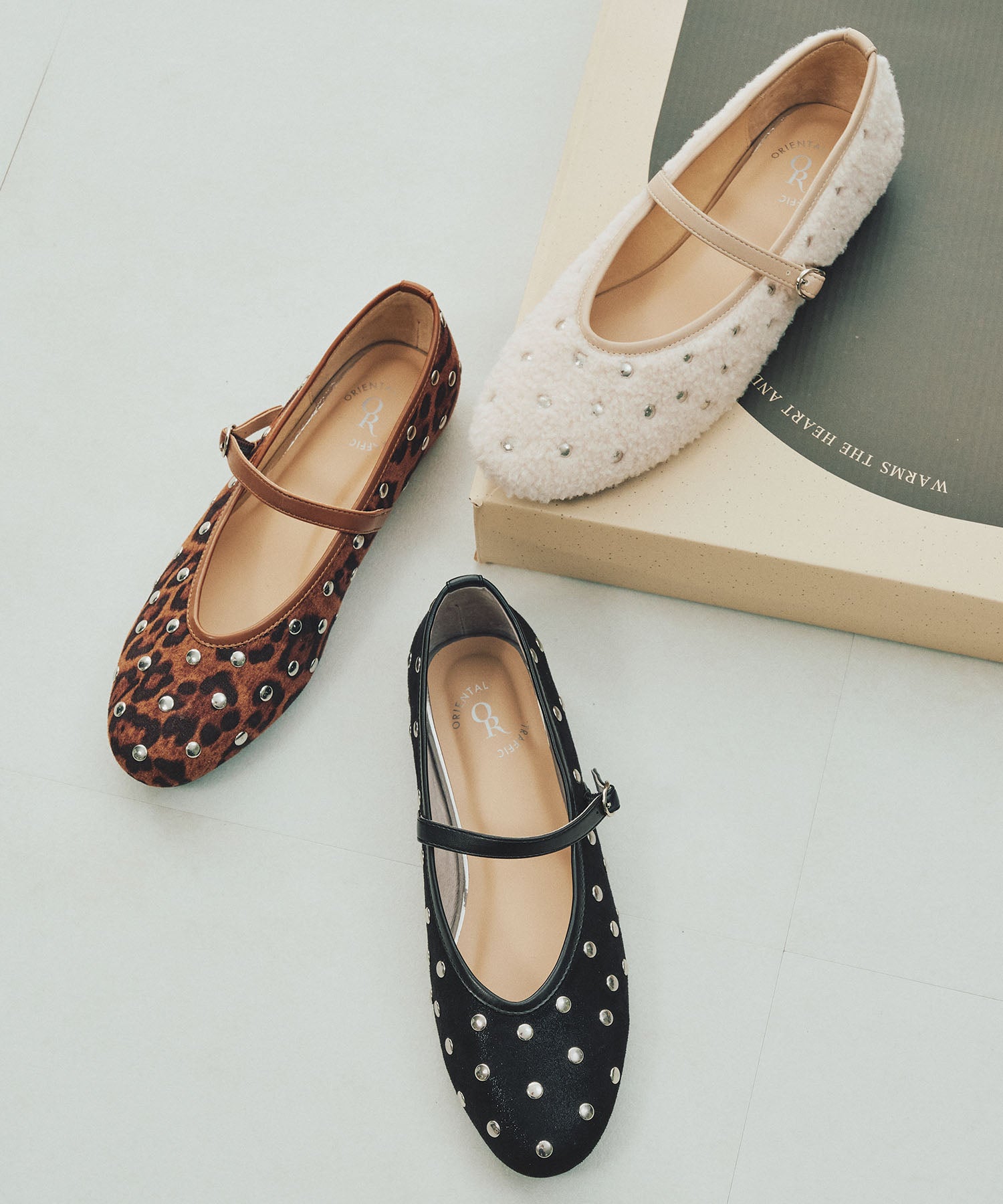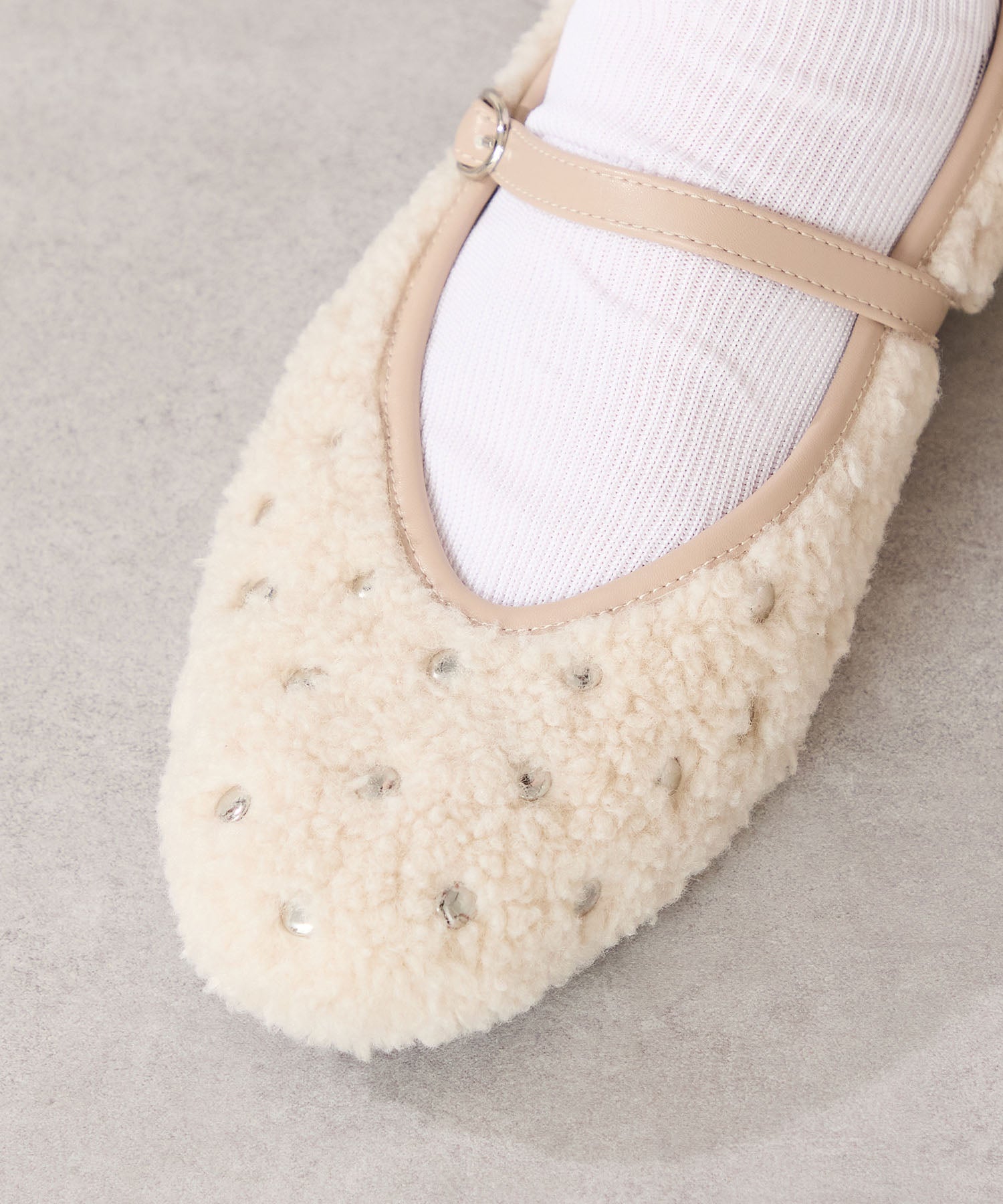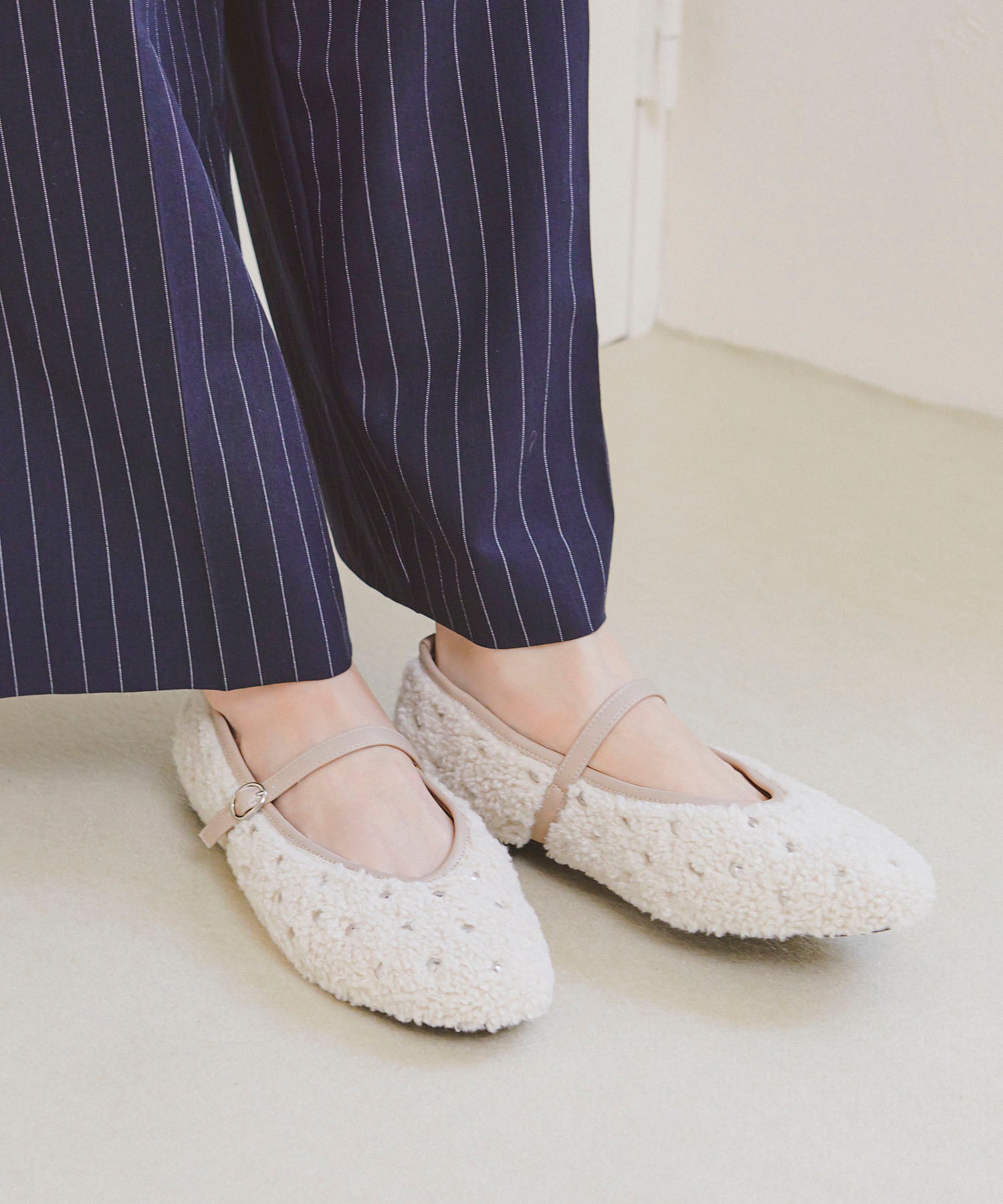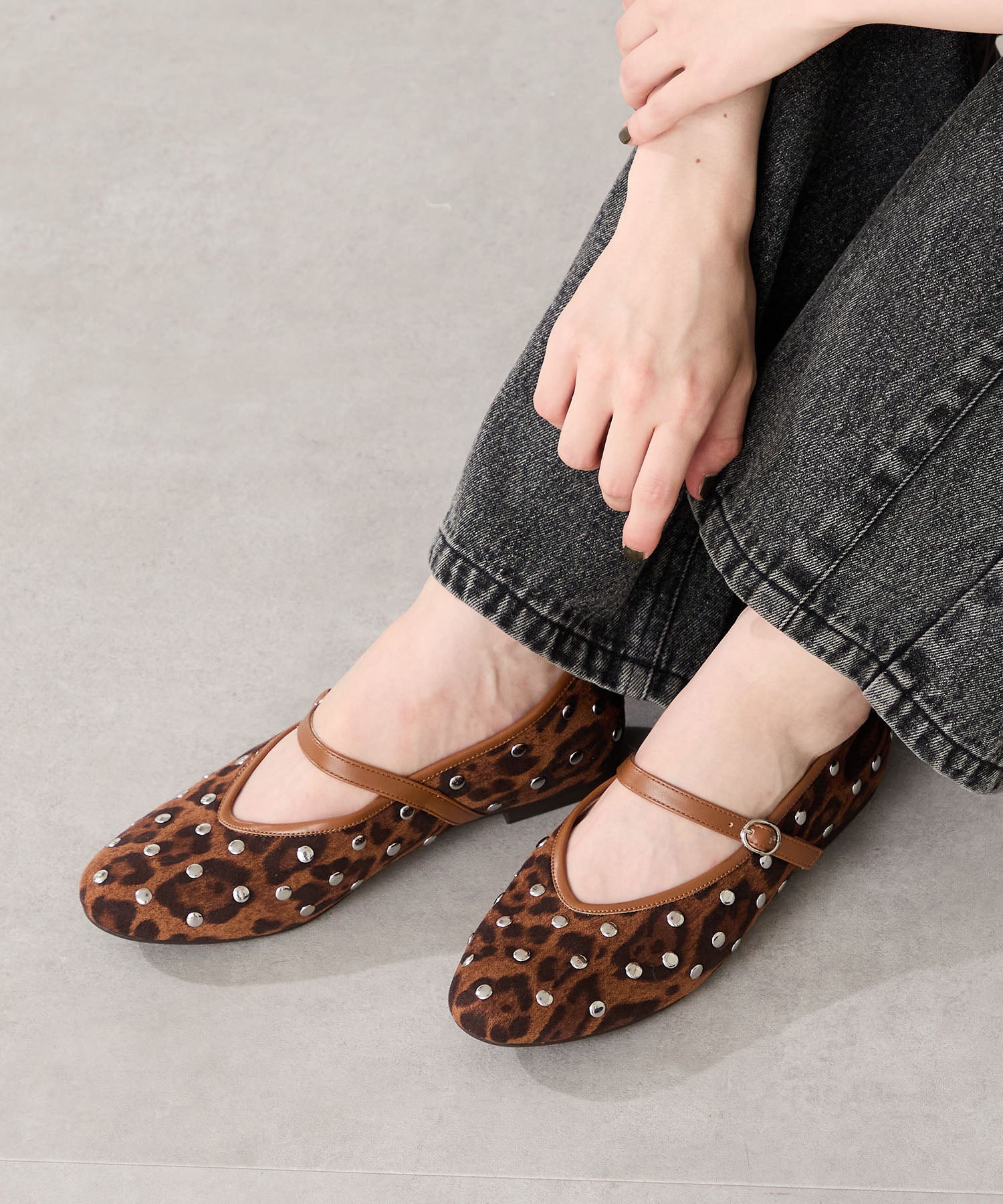 全体にスタッズを散りばめハードな雰囲気を纏ったメリージェーンパンプス。細かなラメがさりげなく輝くブラックに、レオパード柄がトレンドライクなブラウン、シーズンムードを高めるモコモコなボア素材が可愛いベージュと、全色異なるマテリアルで仕上げたバリエーションで選ぶのが楽しい。隠しゴム付きの細ストラップで、足をしっかりホールドしながら、着脱のしやすさも考えられた1足。