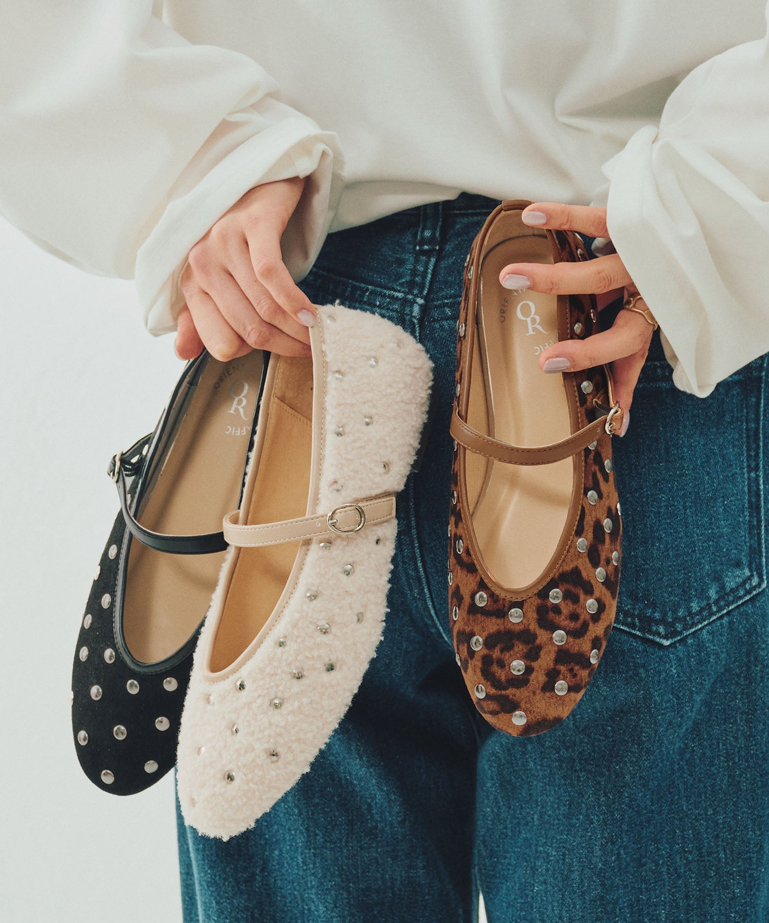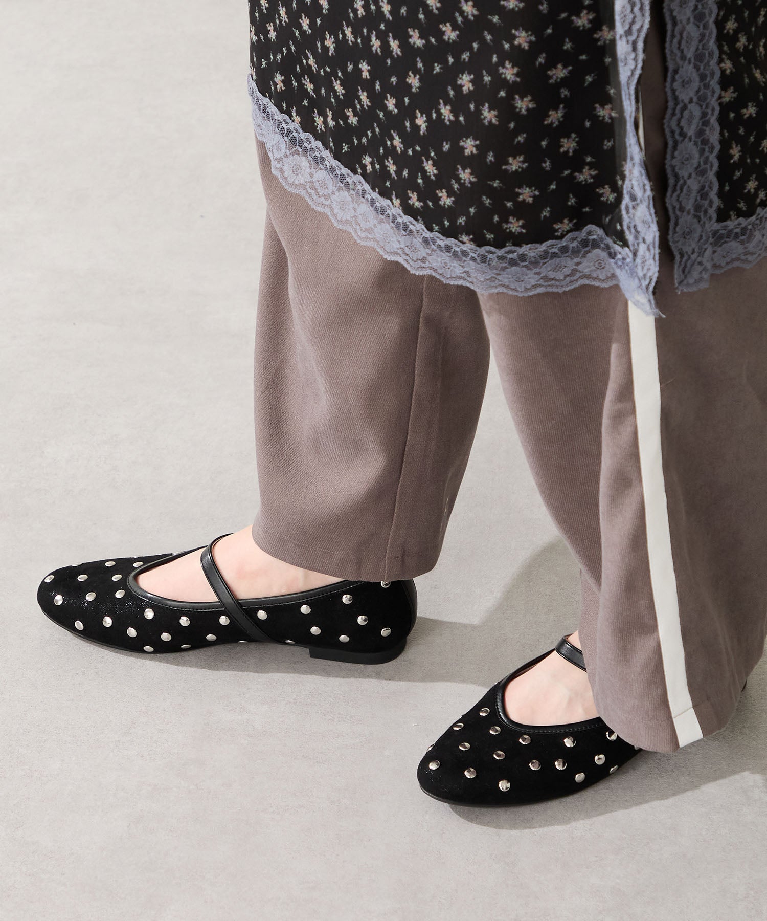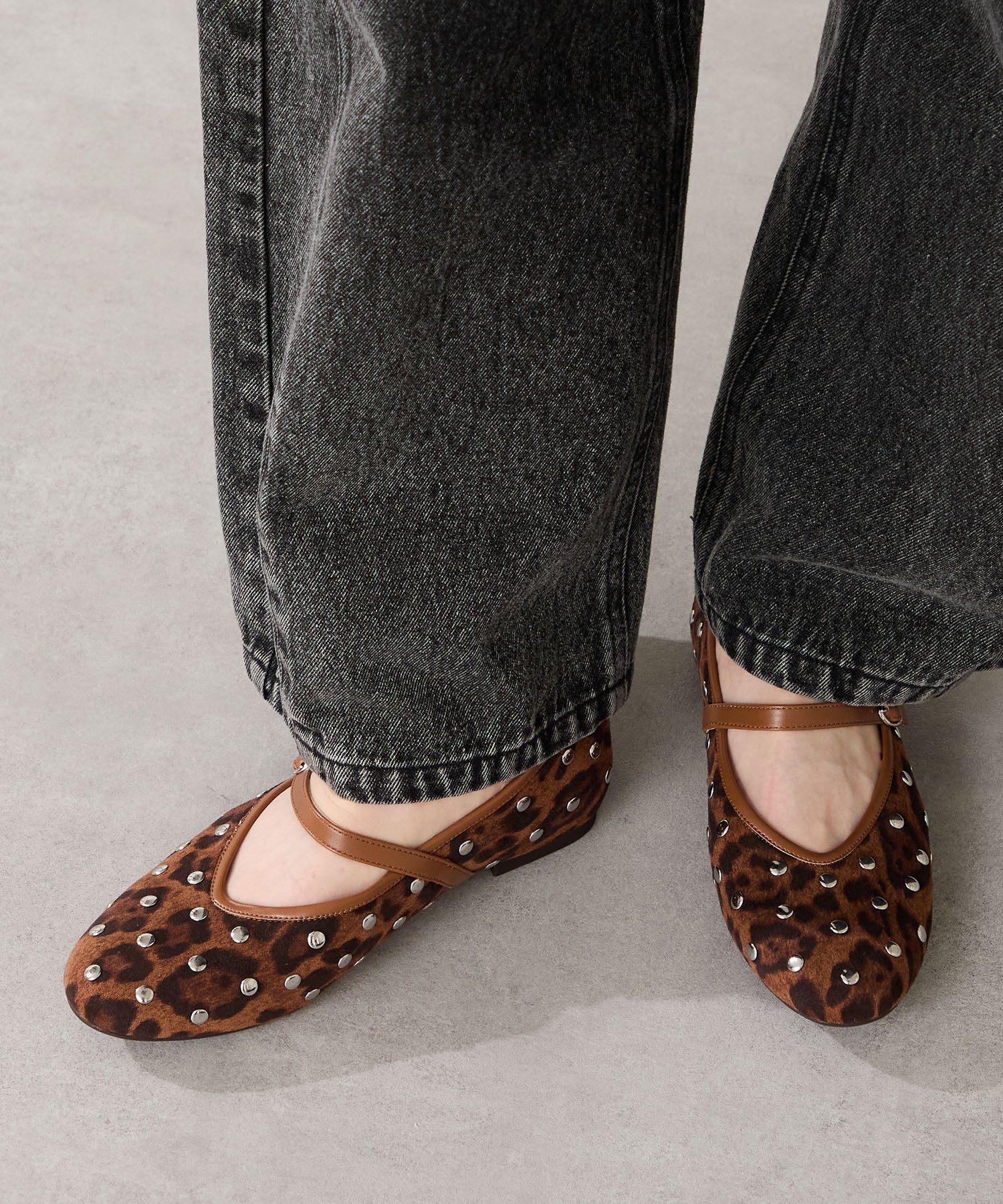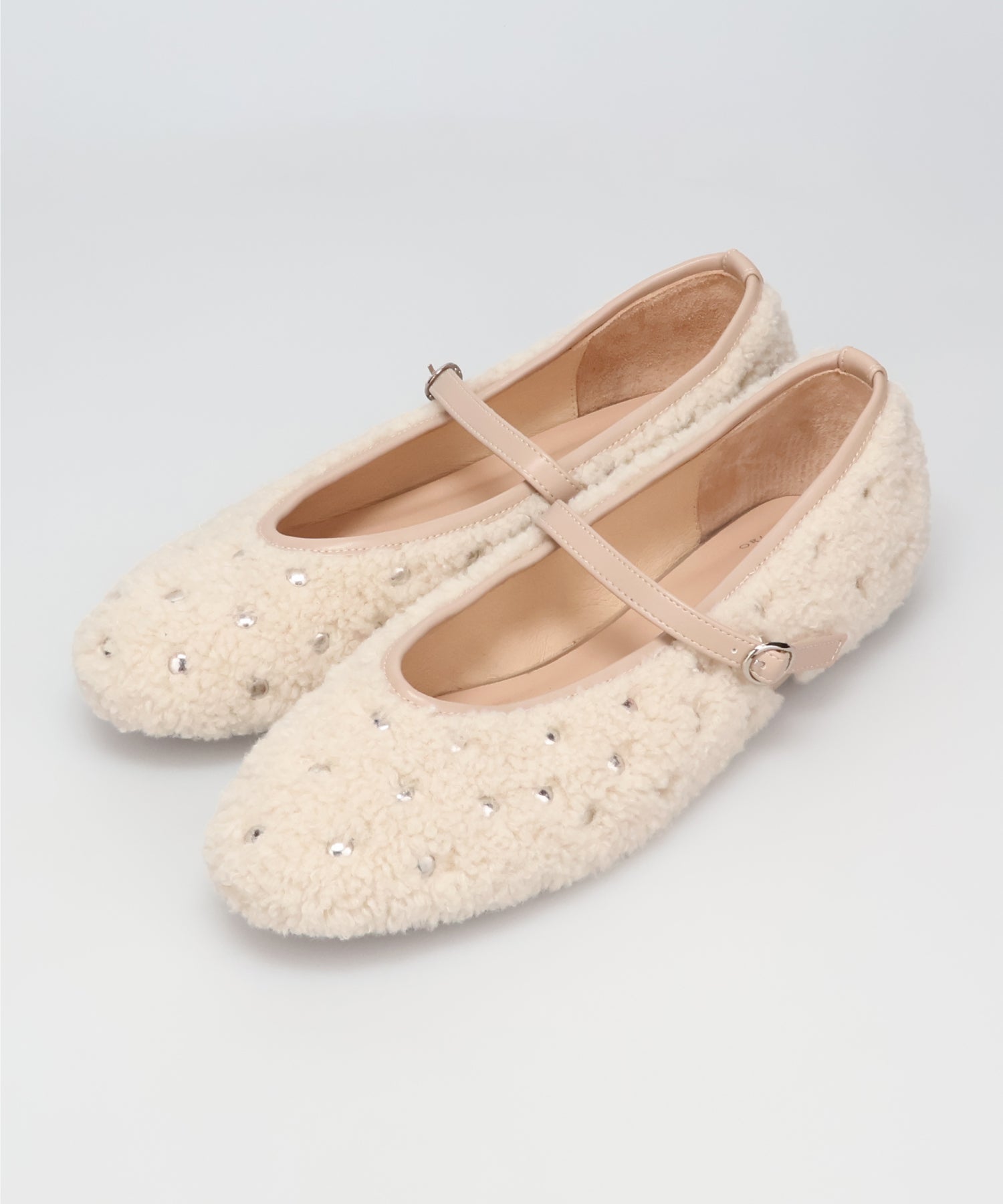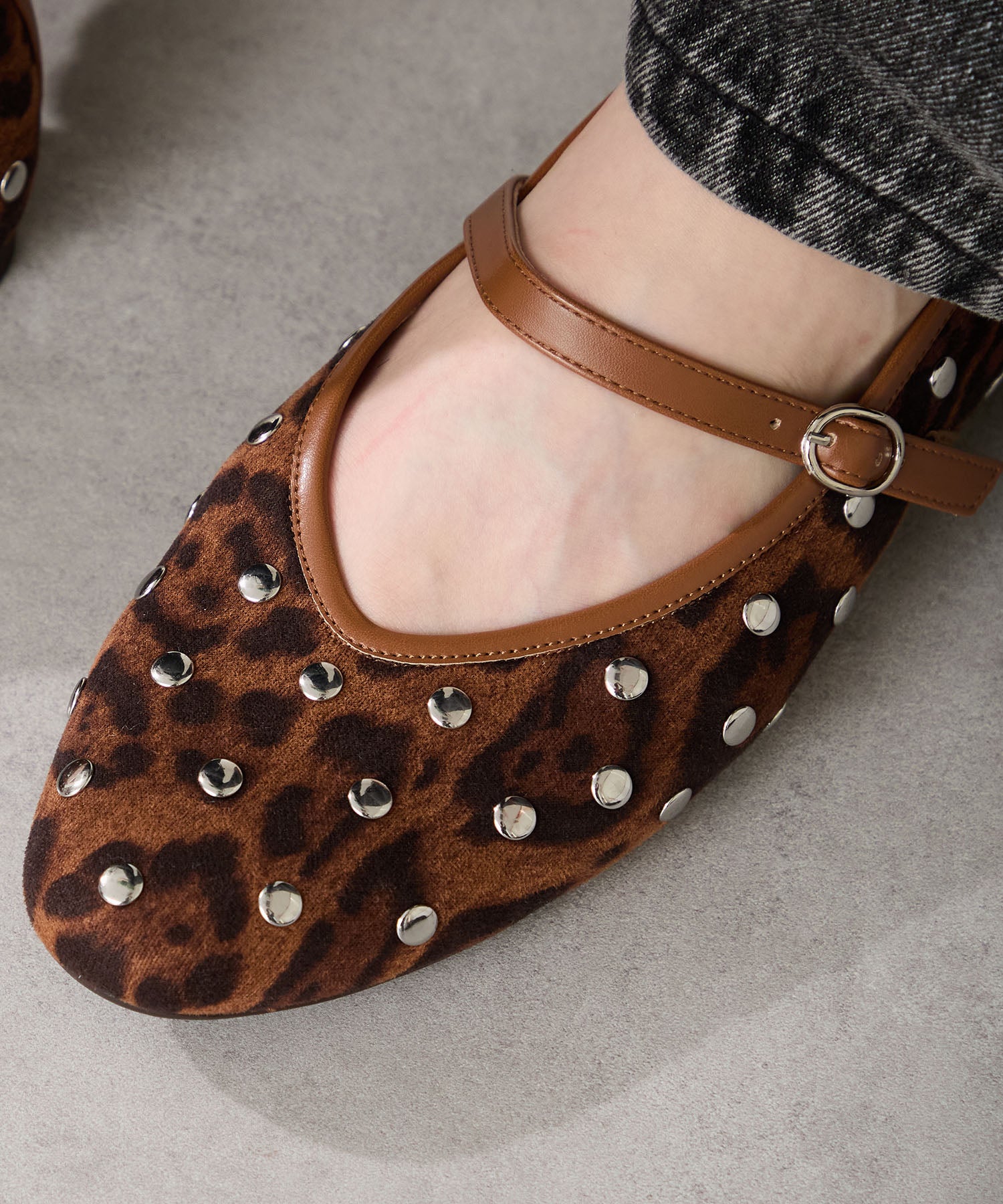 全体にスタッズを散りばめハードな雰囲気を纏ったメリージェーンパンプス。細かなラメがさりげなく輝くブラックに、レオパード柄がトレンドライクなブラウン、シーズンムードを高めるモコモコなボア素材が可愛いベージュと、全色異なるマテリアルで仕上げたバリエーションで選ぶのが楽しい。隠しゴム付きの細ストラップで、足をしっかりホールドしながら、着脱のしやすさも考えられた1足。
