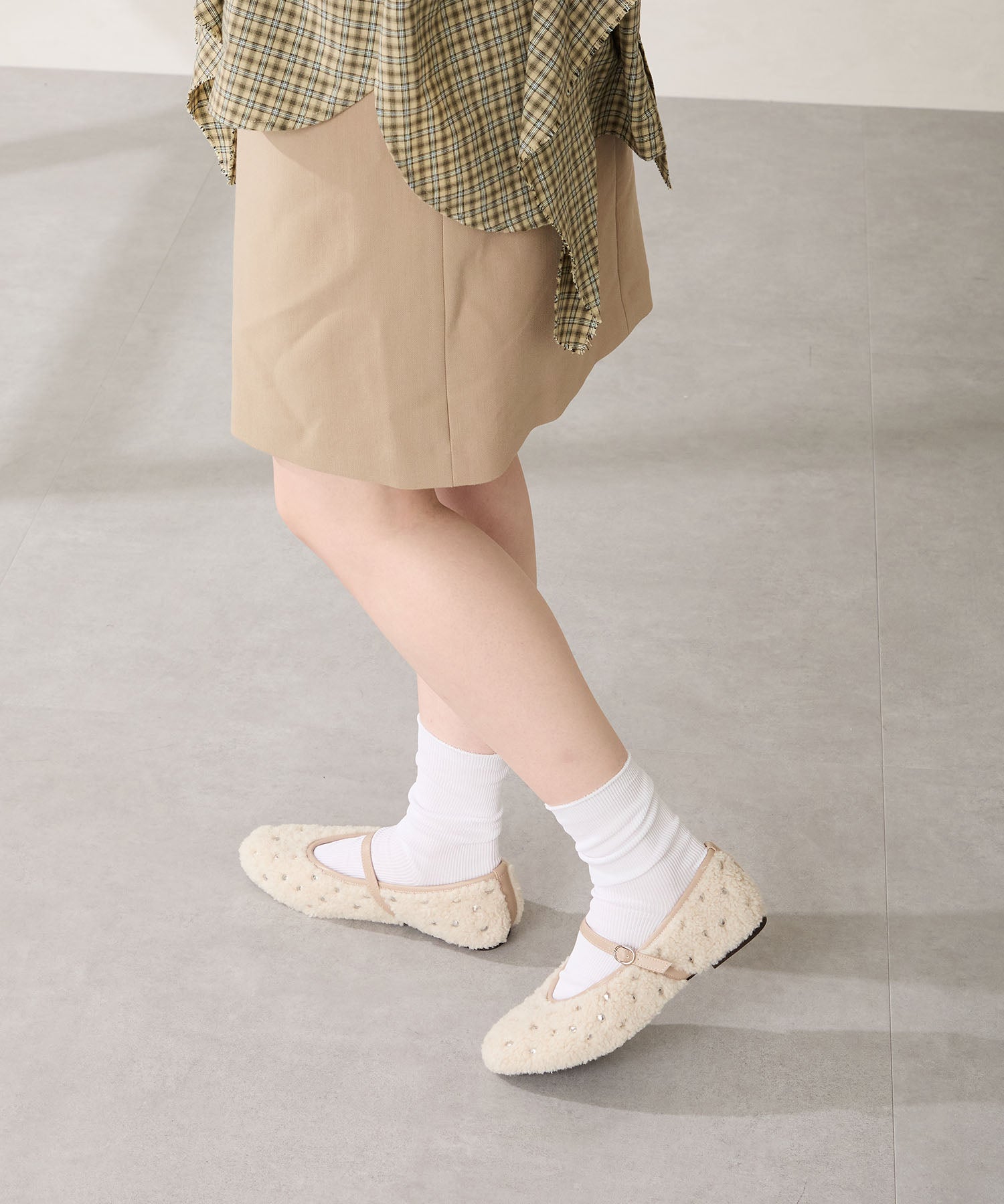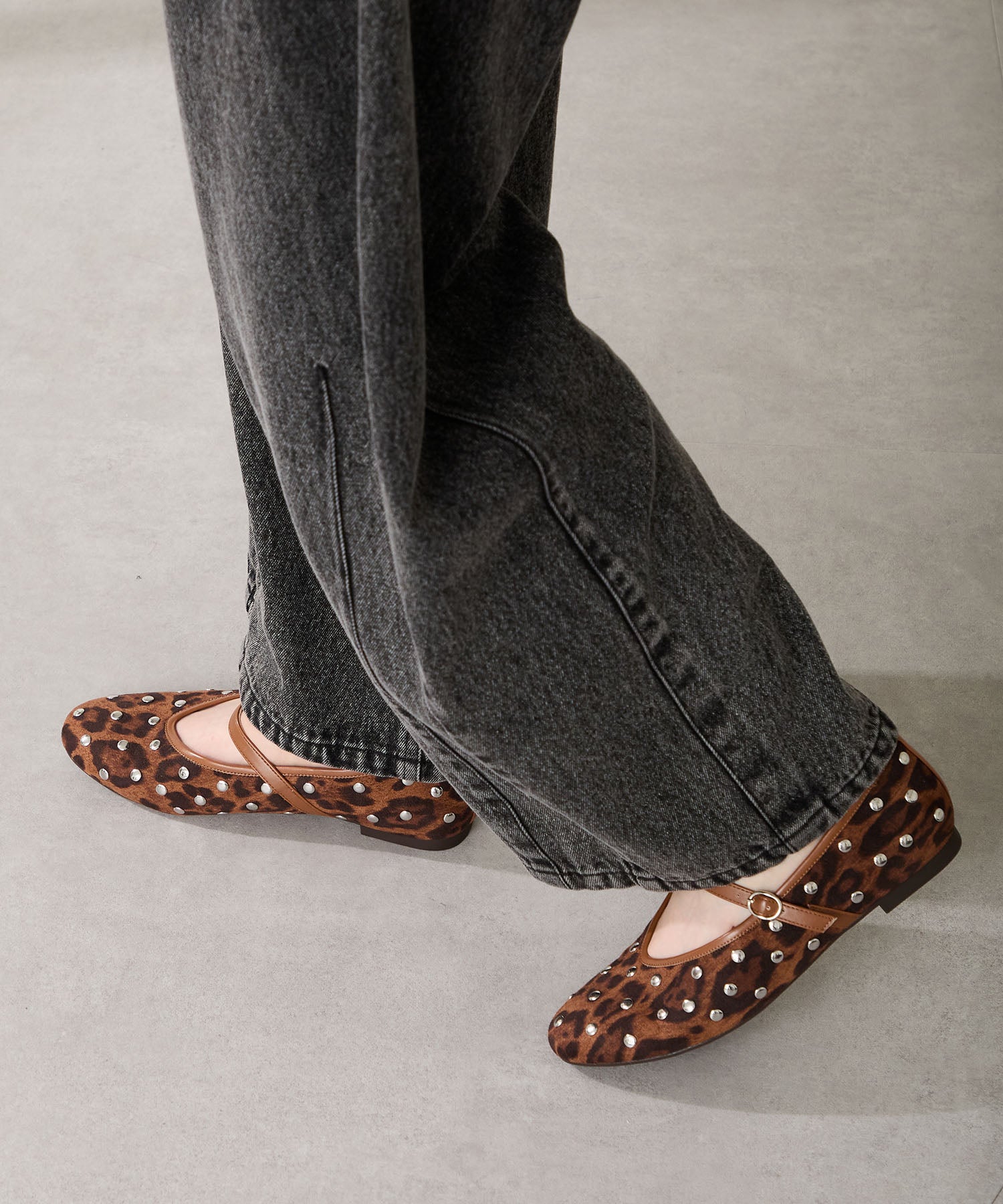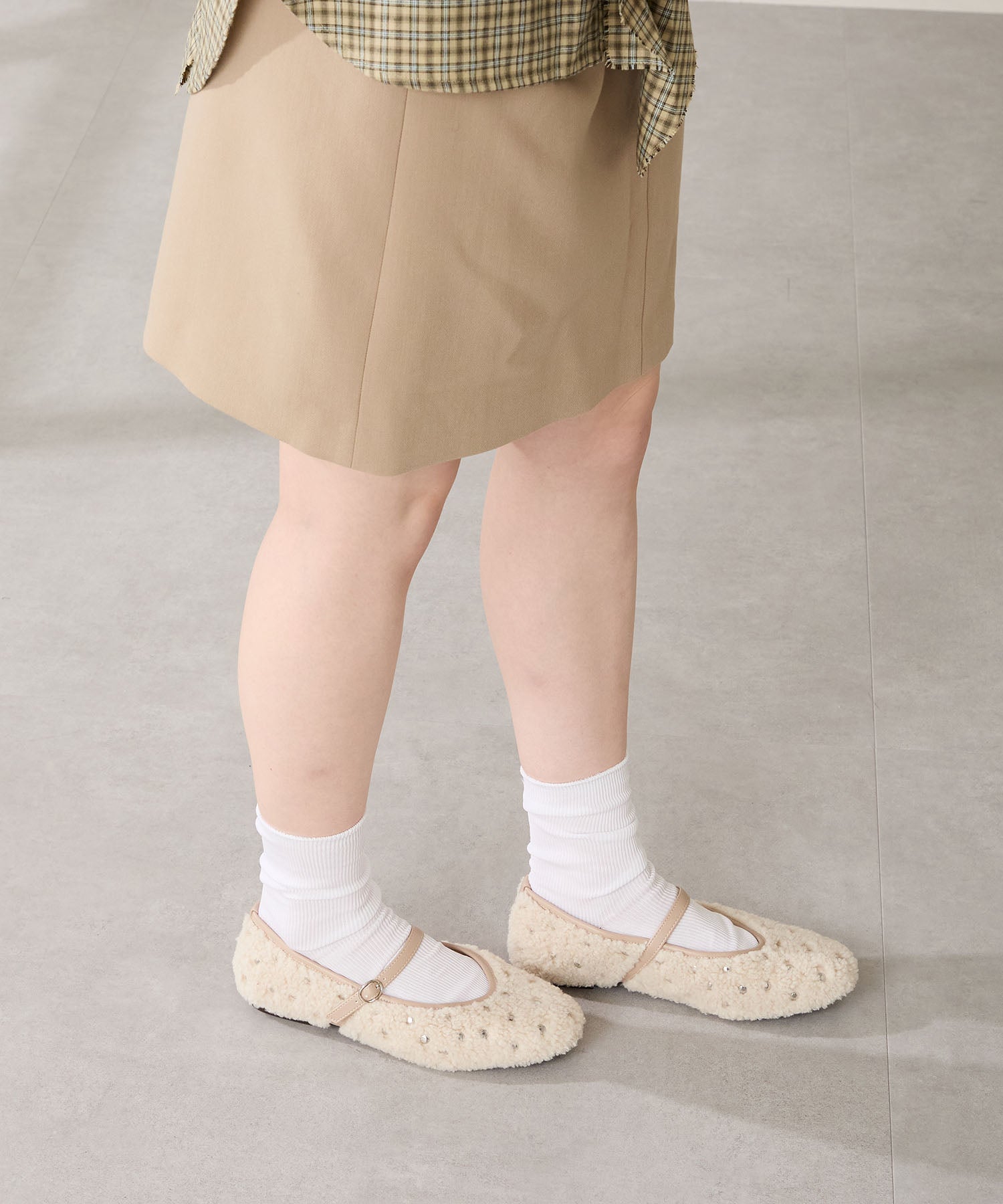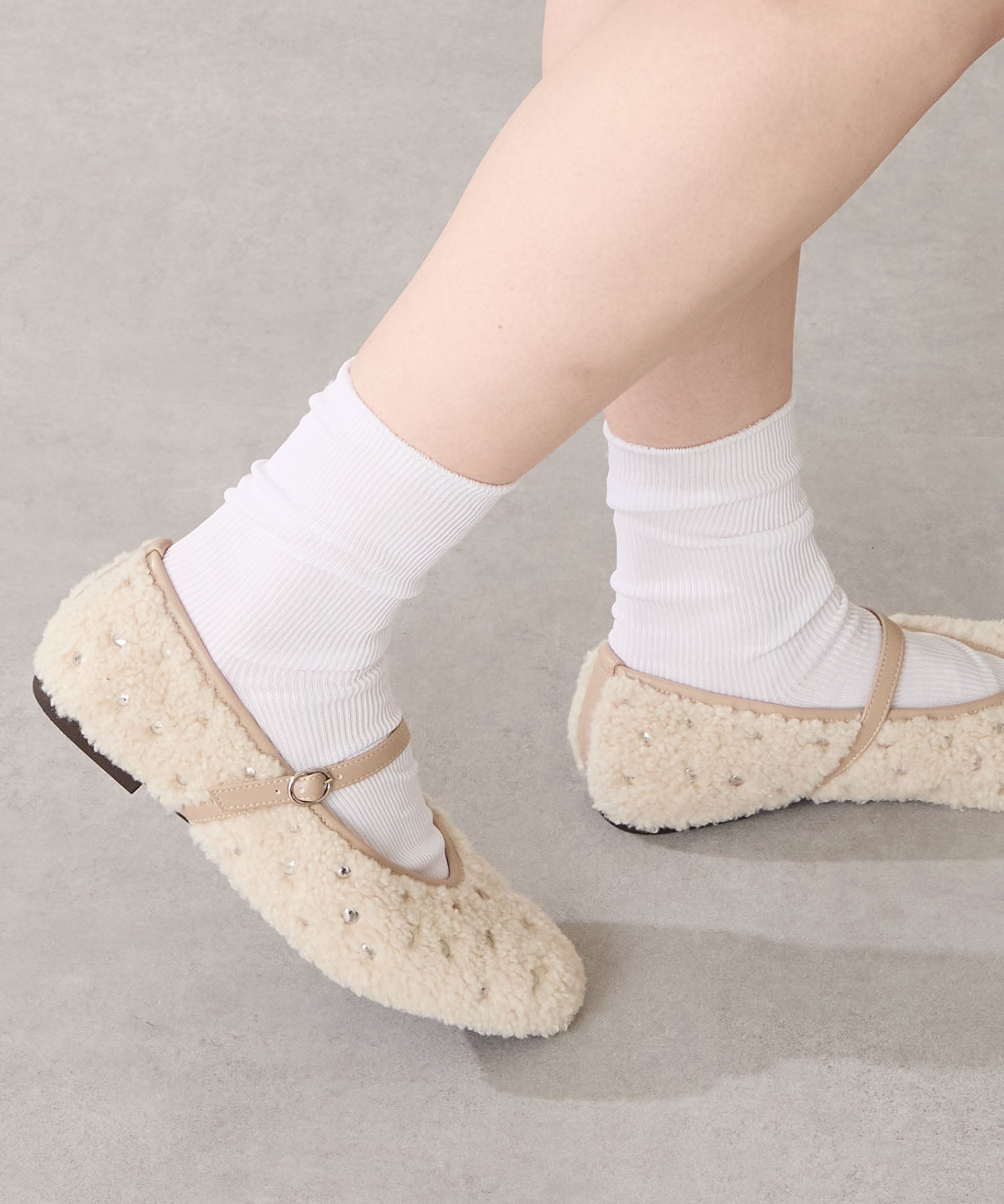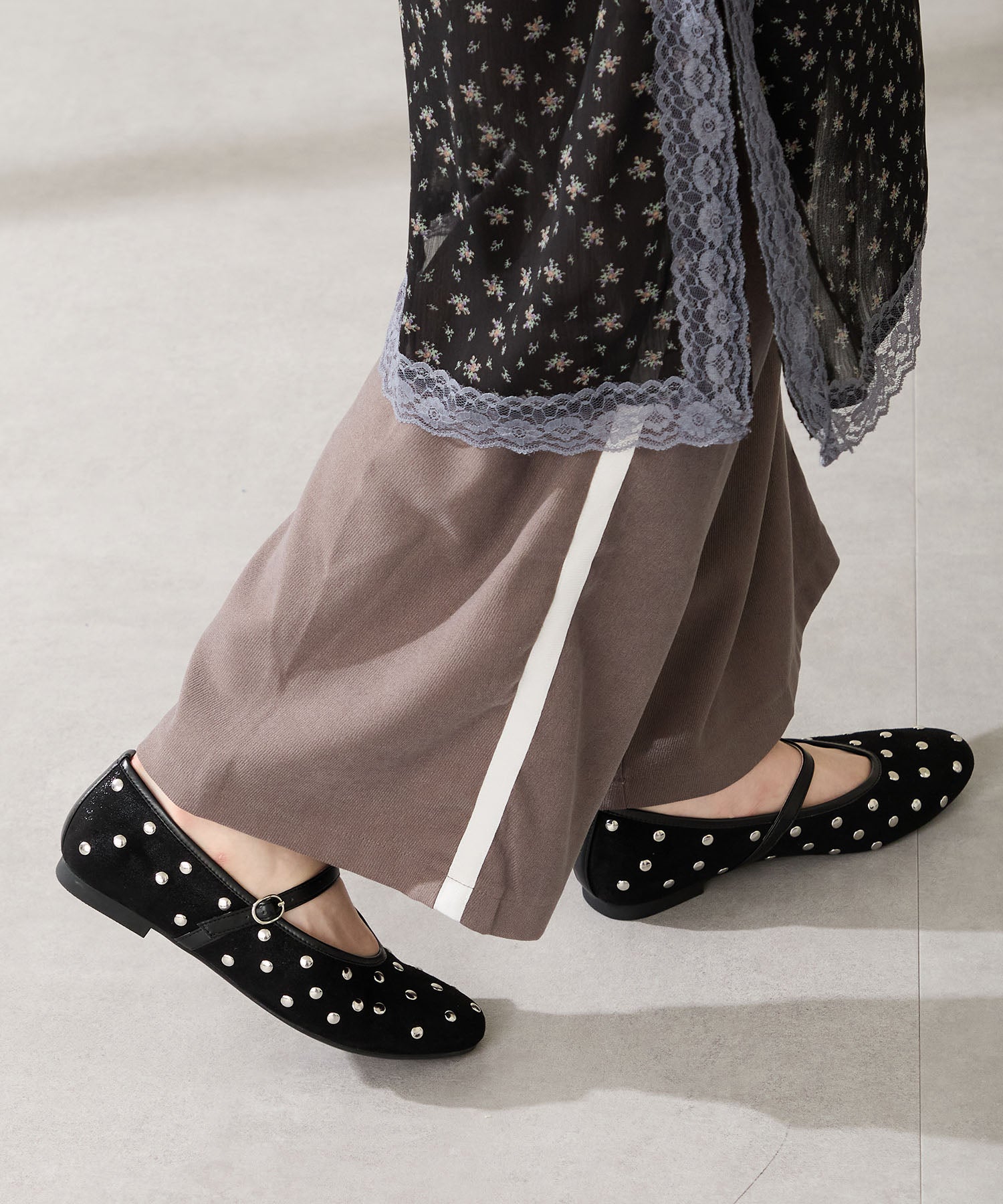 全体にスタッズを散りばめハードな雰囲気を纏ったメリージェーンパンプス。細かなラメがさりげなく輝くブラックに、レオパード柄がトレンドライクなブラウン、シーズンムードを高めるモコモコなボア素材が可愛いベージュと、全色異なるマテリアルで仕上げたバリエーションで選ぶのが楽しい。隠しゴム付きの細ストラップで、足をしっかりホールドしながら、着脱のしやすさも考えられた1足。