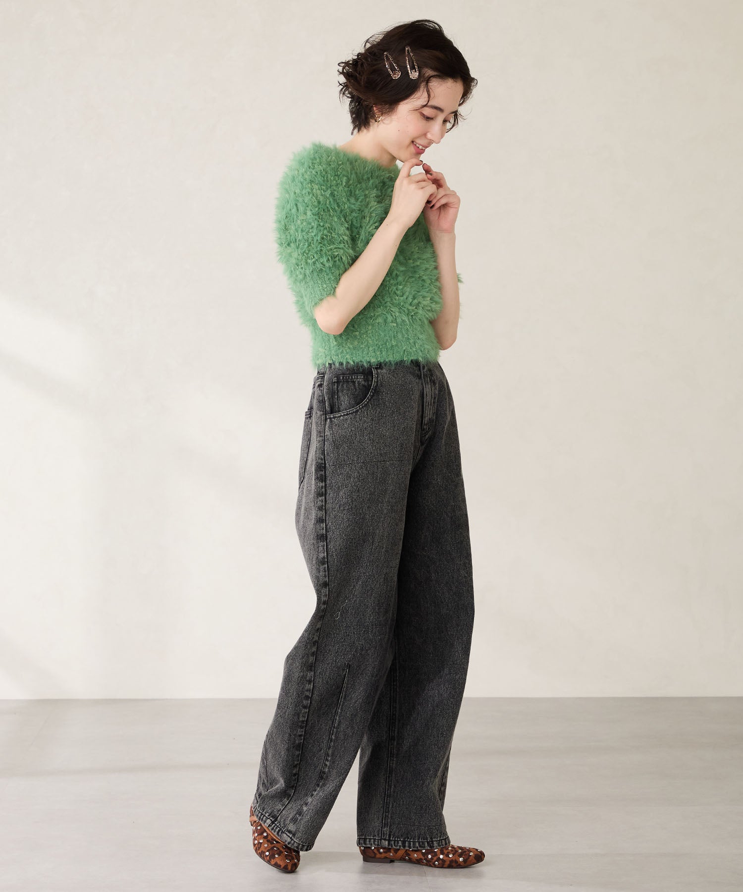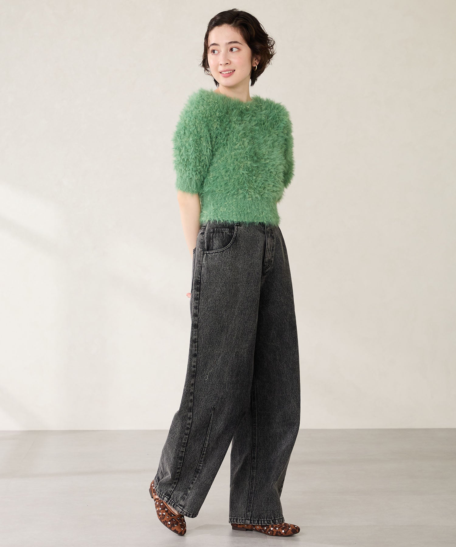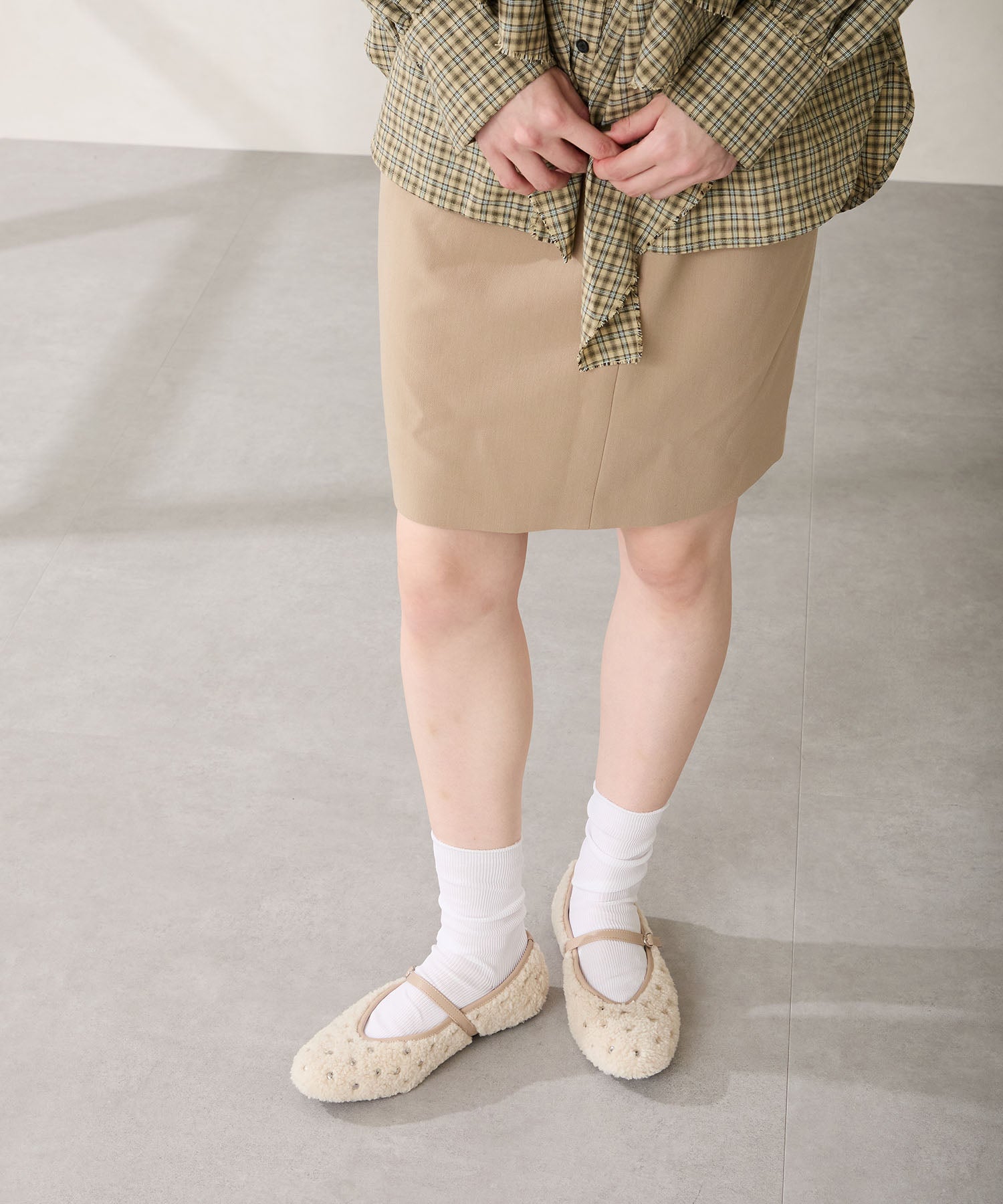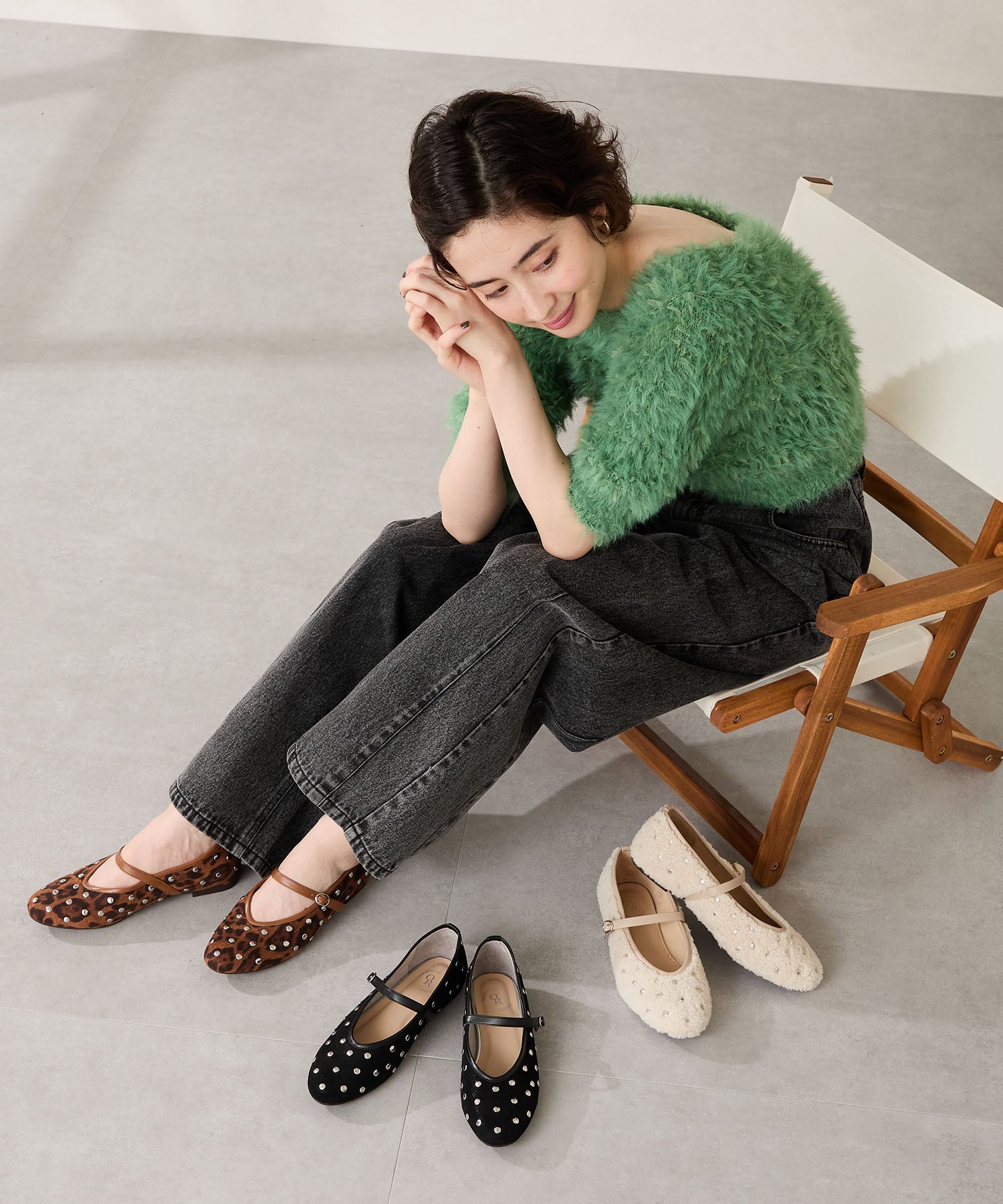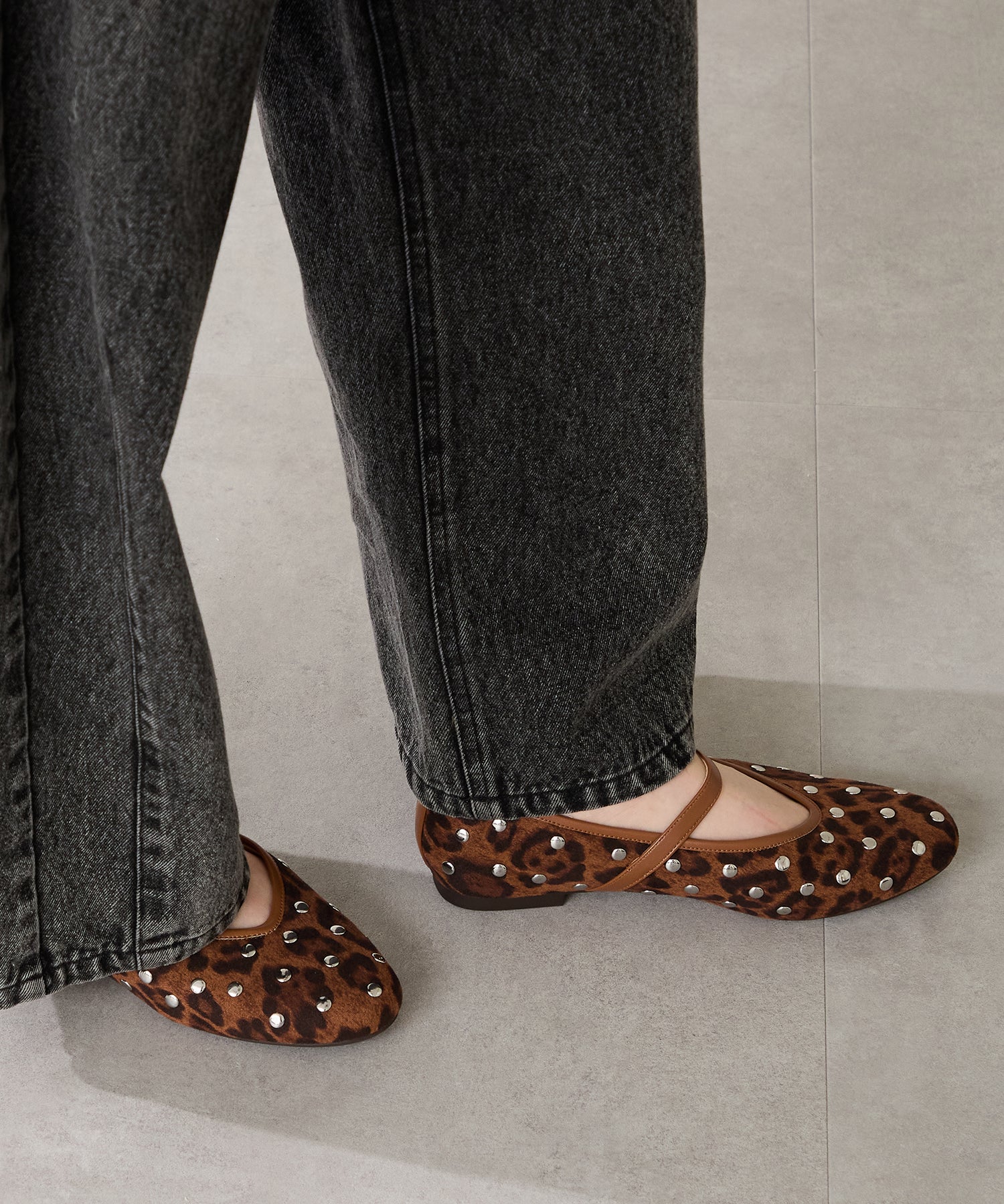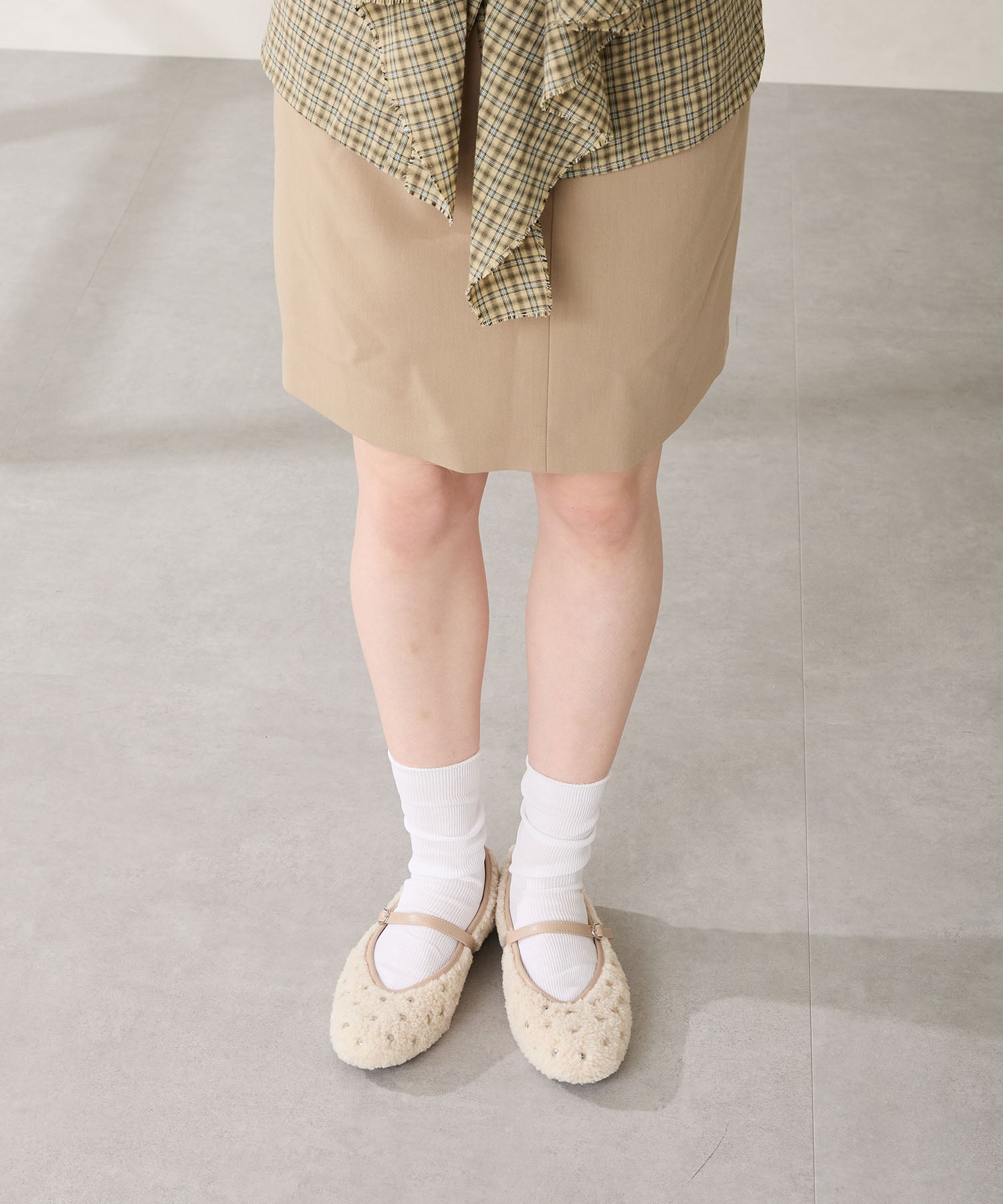 全体にスタッズを散りばめハードな雰囲気を纏ったメリージェーンパンプス。細かなラメがさりげなく輝くブラックに、レオパード柄がトレンドライクなブラウン、シーズンムードを高めるモコモコなボア素材が可愛いベージュと、全色異なるマテリアルで仕上げたバリエーションで選ぶのが楽しい。隠しゴム付きの細ストラップで、足をしっかりホールドしながら、着脱のしやすさも考えられた1足。