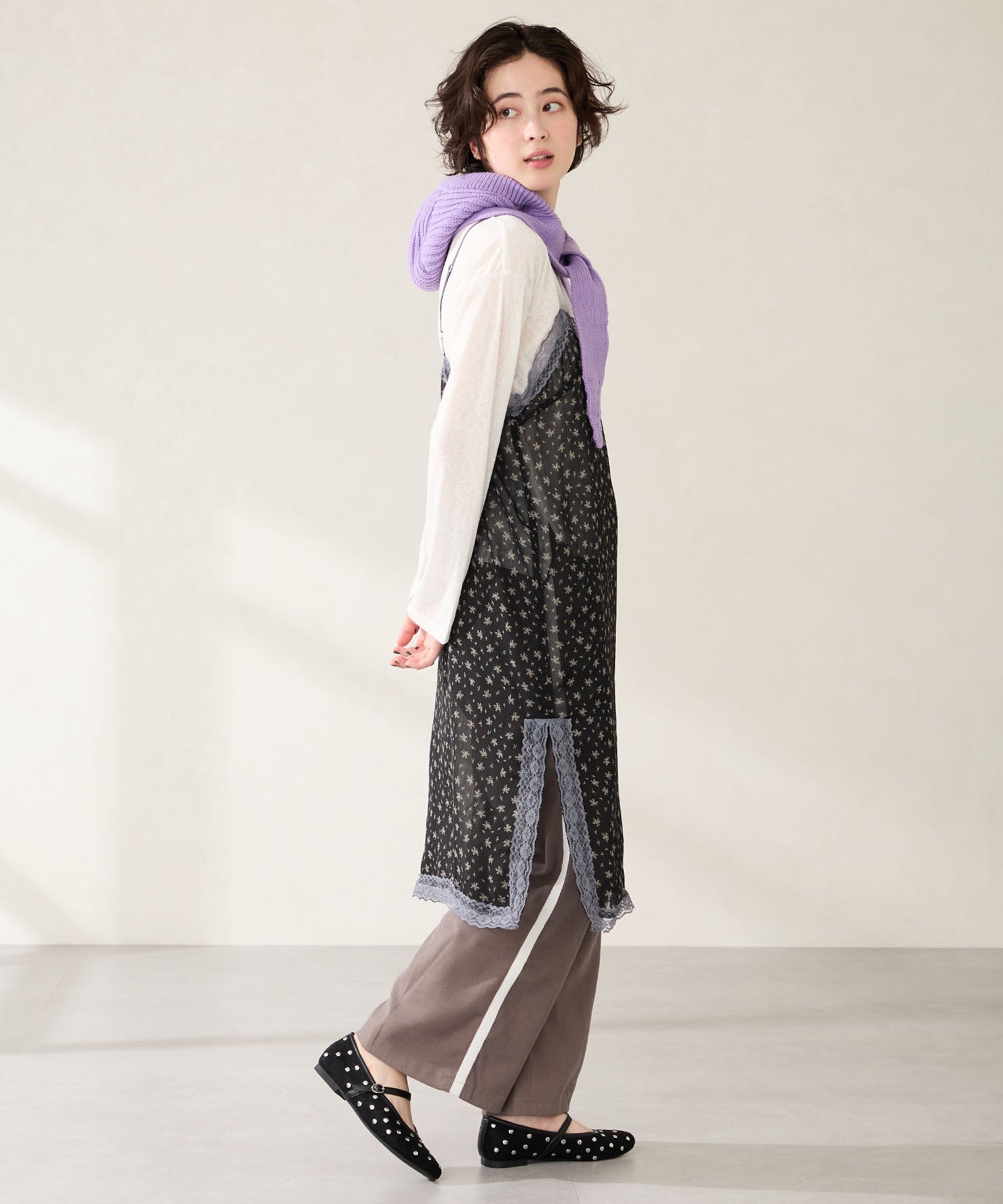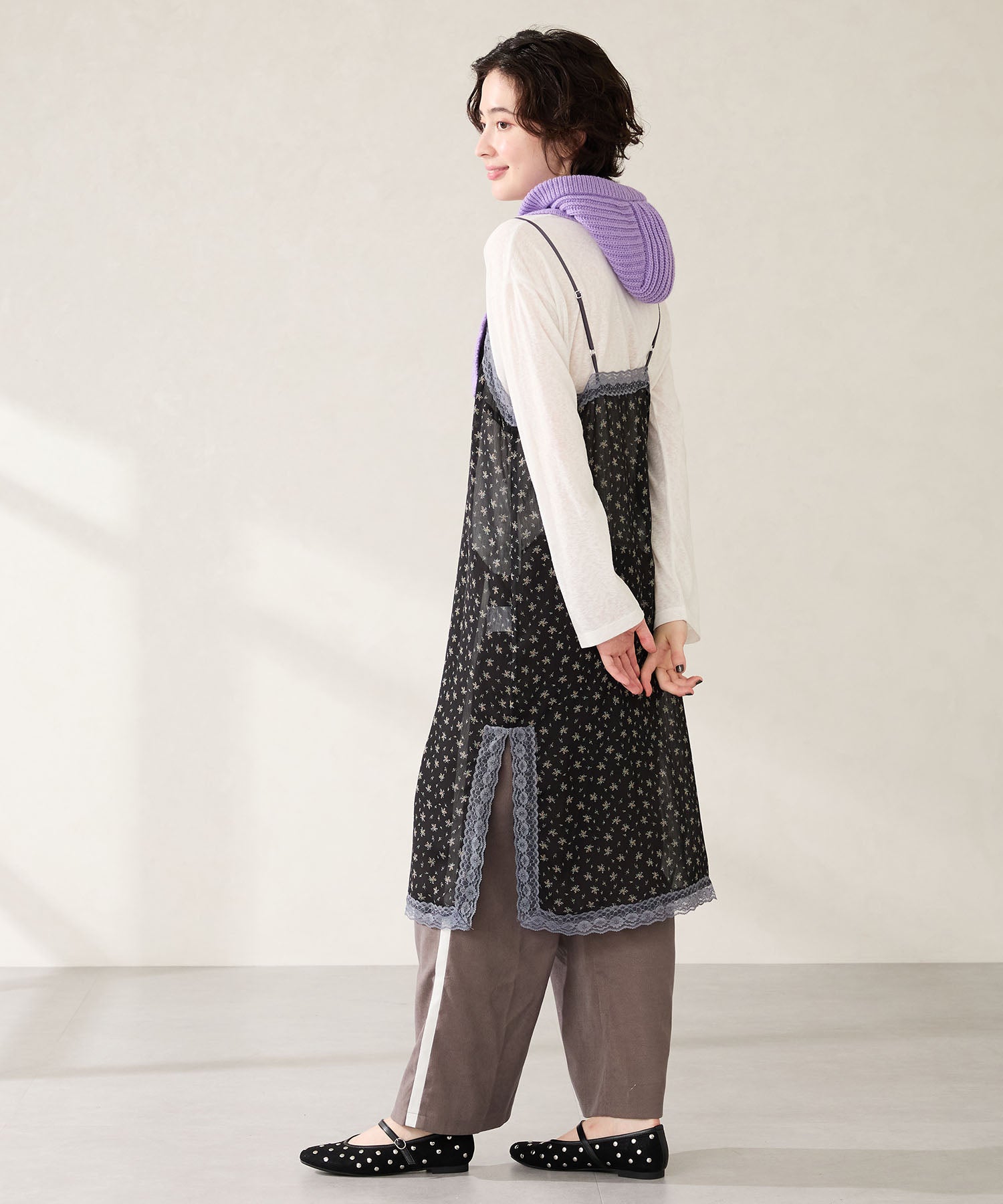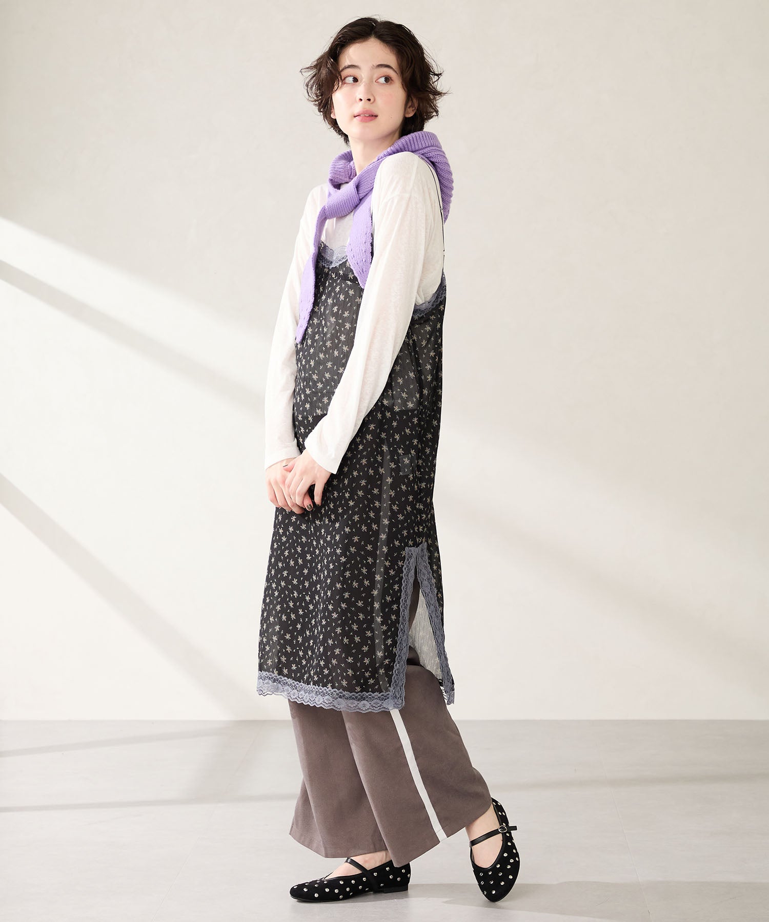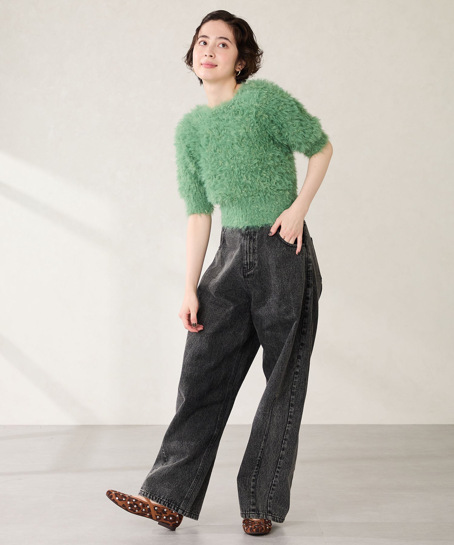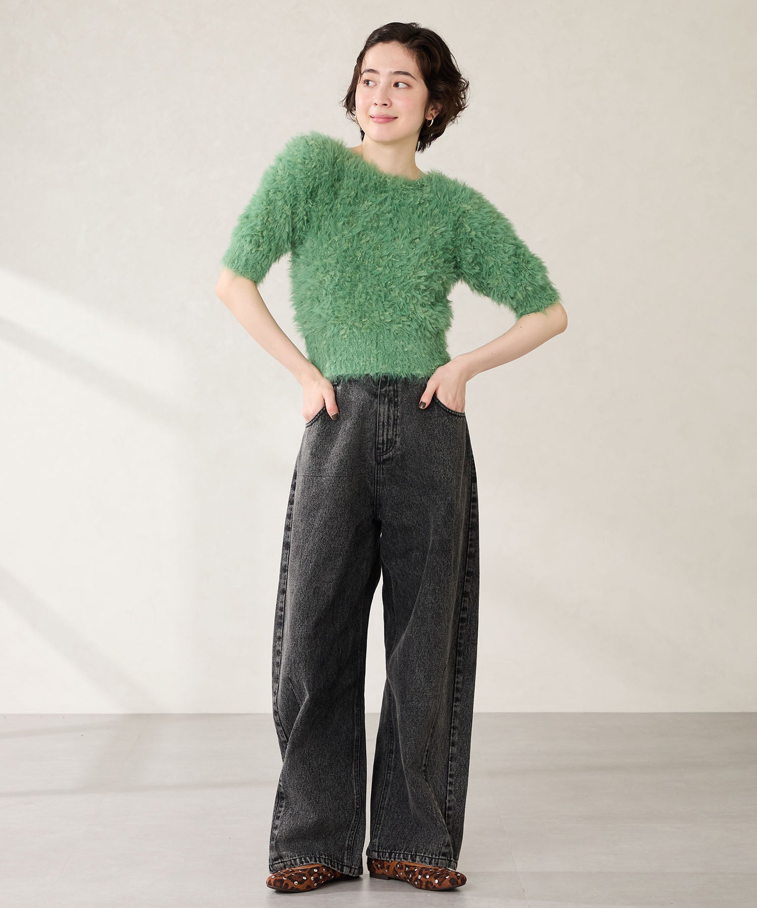 全体にスタッズを散りばめハードな雰囲気を纏ったメリージェーンパンプス。細かなラメがさりげなく輝くブラックに、レオパード柄がトレンドライクなブラウン、シーズンムードを高めるモコモコなボア素材が可愛いベージュと、全色異なるマテリアルで仕上げたバリエーションで選ぶのが楽しい。隠しゴム付きの細ストラップで、足をしっかりホールドしながら、着脱のしやすさも考えられた1足。