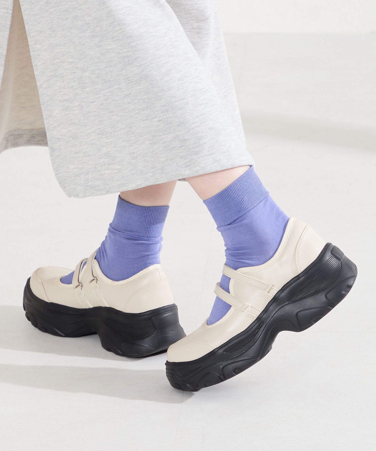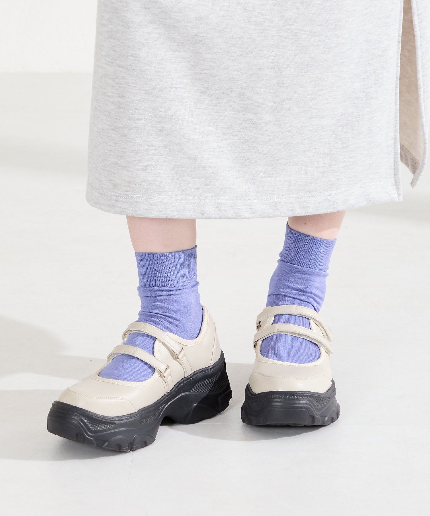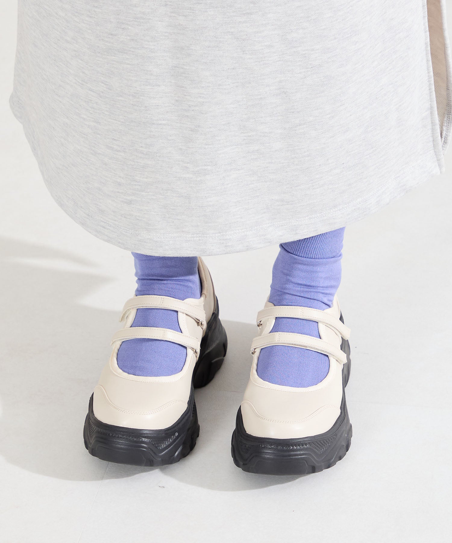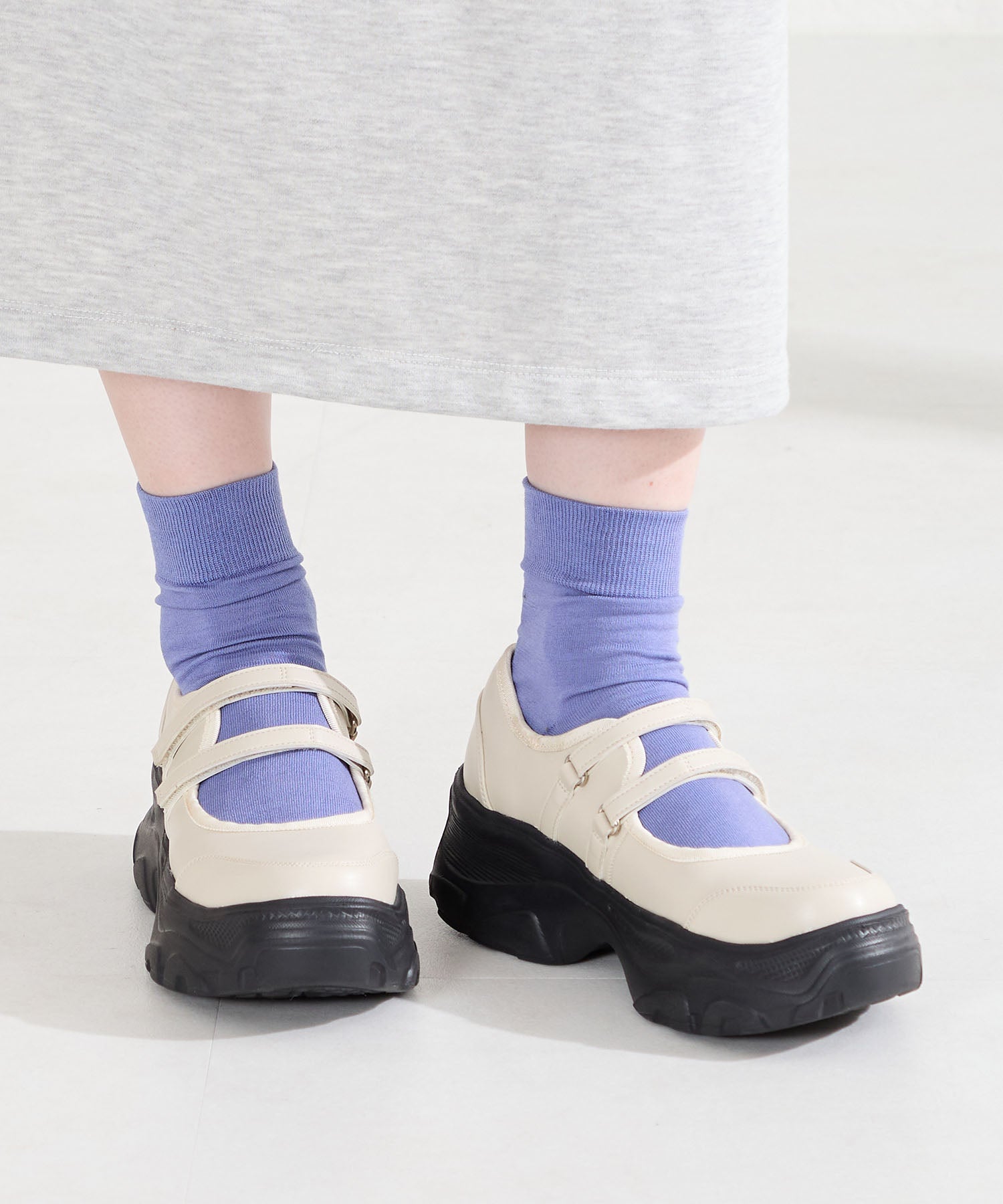 ボリューム感たっぷりのスニーカーソールとメリージェーンデザインの組み合わせが今季らしい旬のアイテム。2本のベルトはベルクロタイプで着脱がしやすく、厚底ソールは見た目以上に軽量なので、高低差が少なく歩きやすいのも嬉しい。甲部分が空いており、靴下の合わせ方次第で表情が変わるので、カジュアルにもガーリーにも幅広いスタイリングに合わせられる。