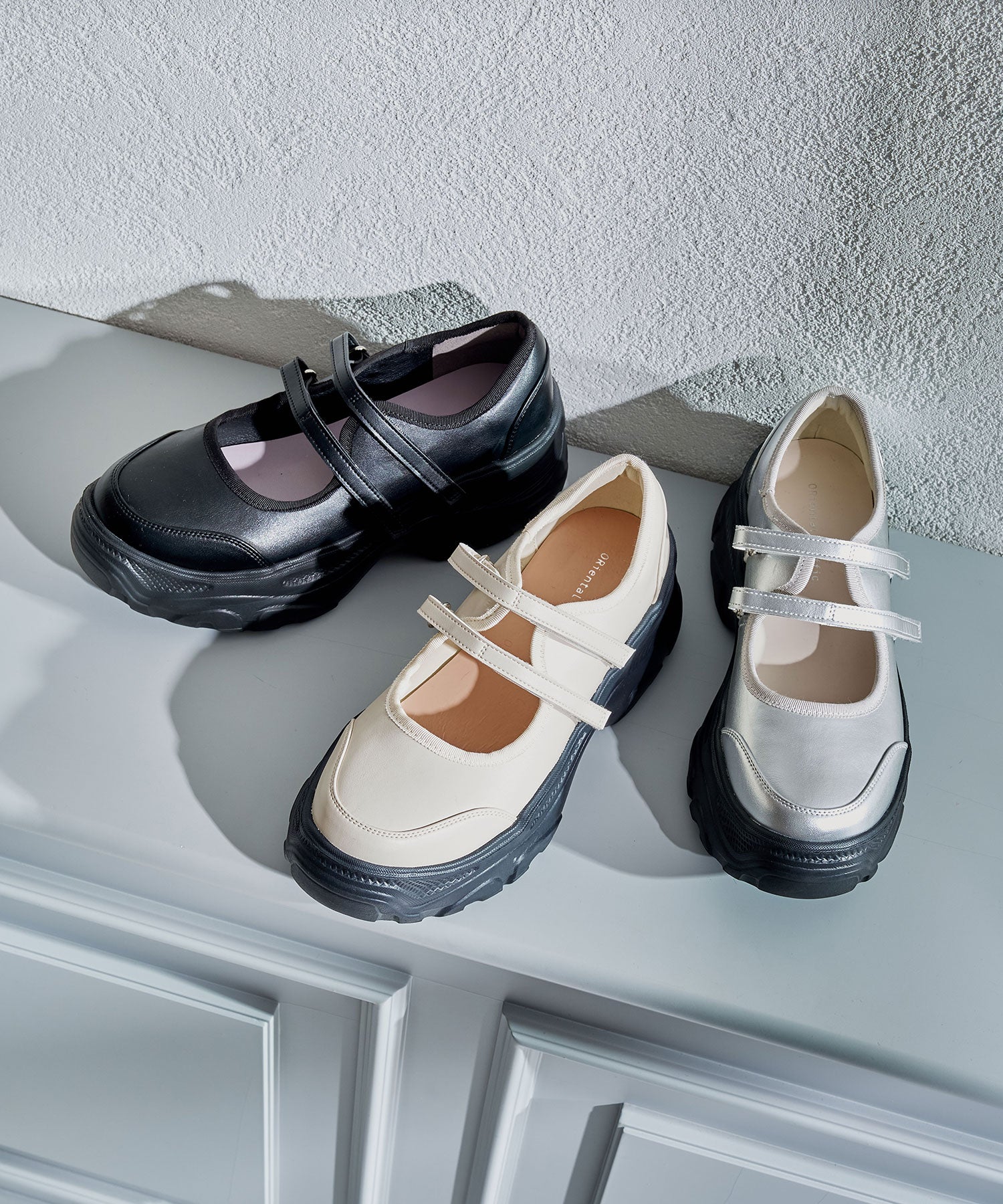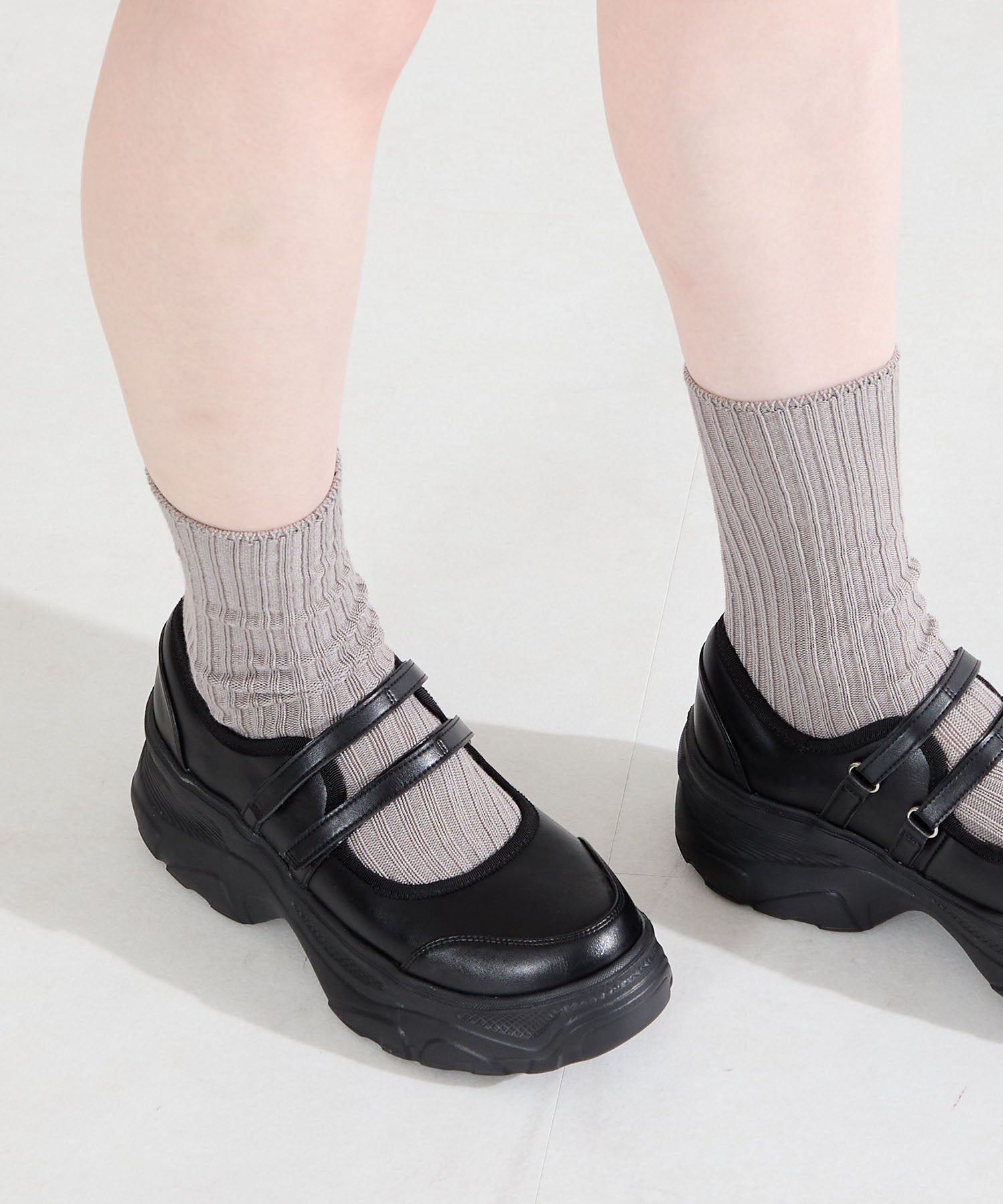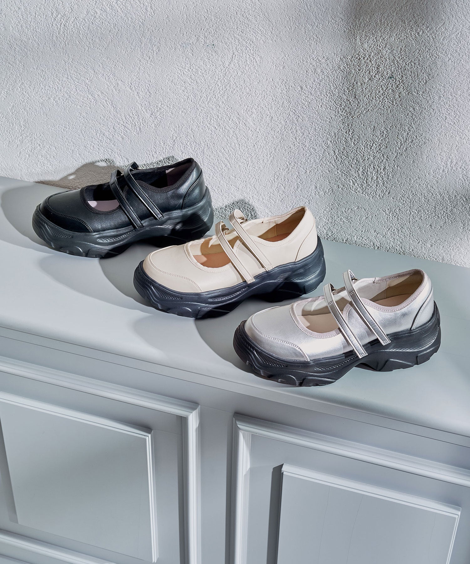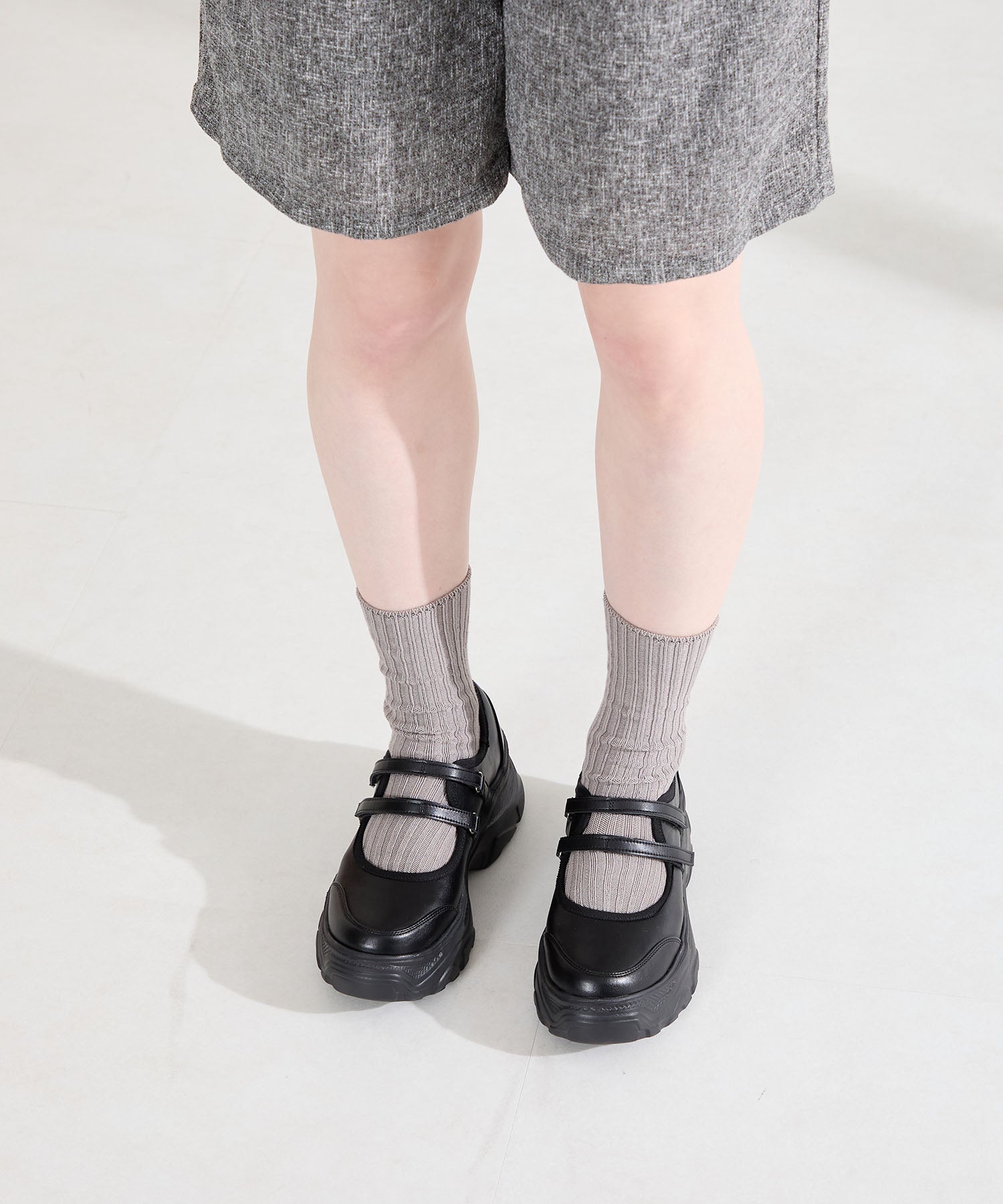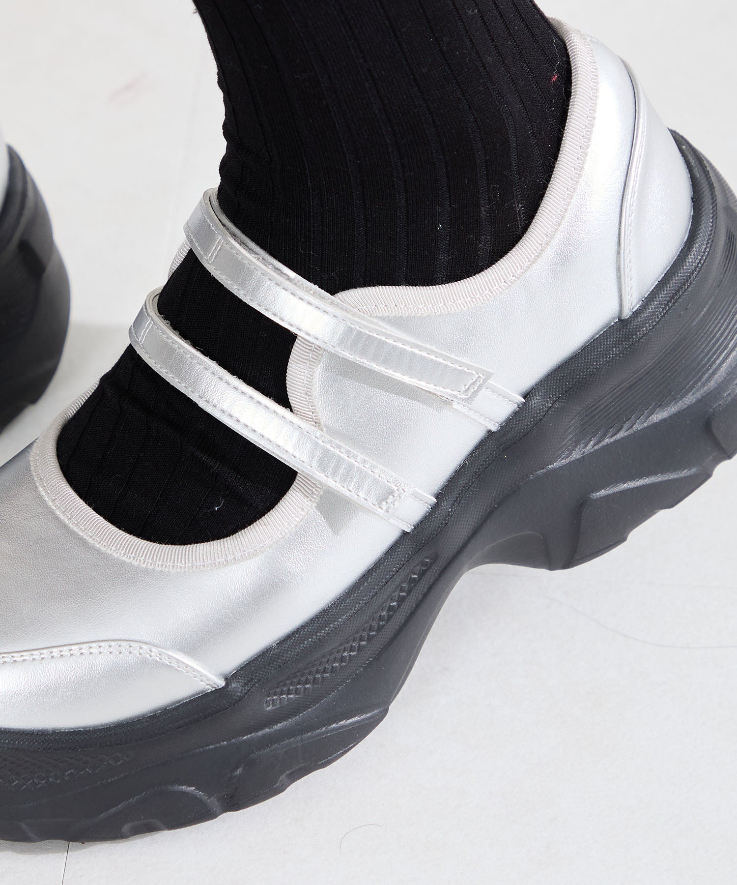ボリューム感たっぷりのスニーカーソールとメリージェーンデザインの組み合わせが今季らしい旬のアイテム。2本のベルトはベルクロタイプで着脱がしやすく、厚底ソールは見た目以上に軽量なので、高低差が少なく歩きやすいのも嬉しい。甲部分が空いており、靴下の合わせ方次第で表情が変わるので、カジュアルにもガーリーにも幅広いスタイリングに合わせられる。