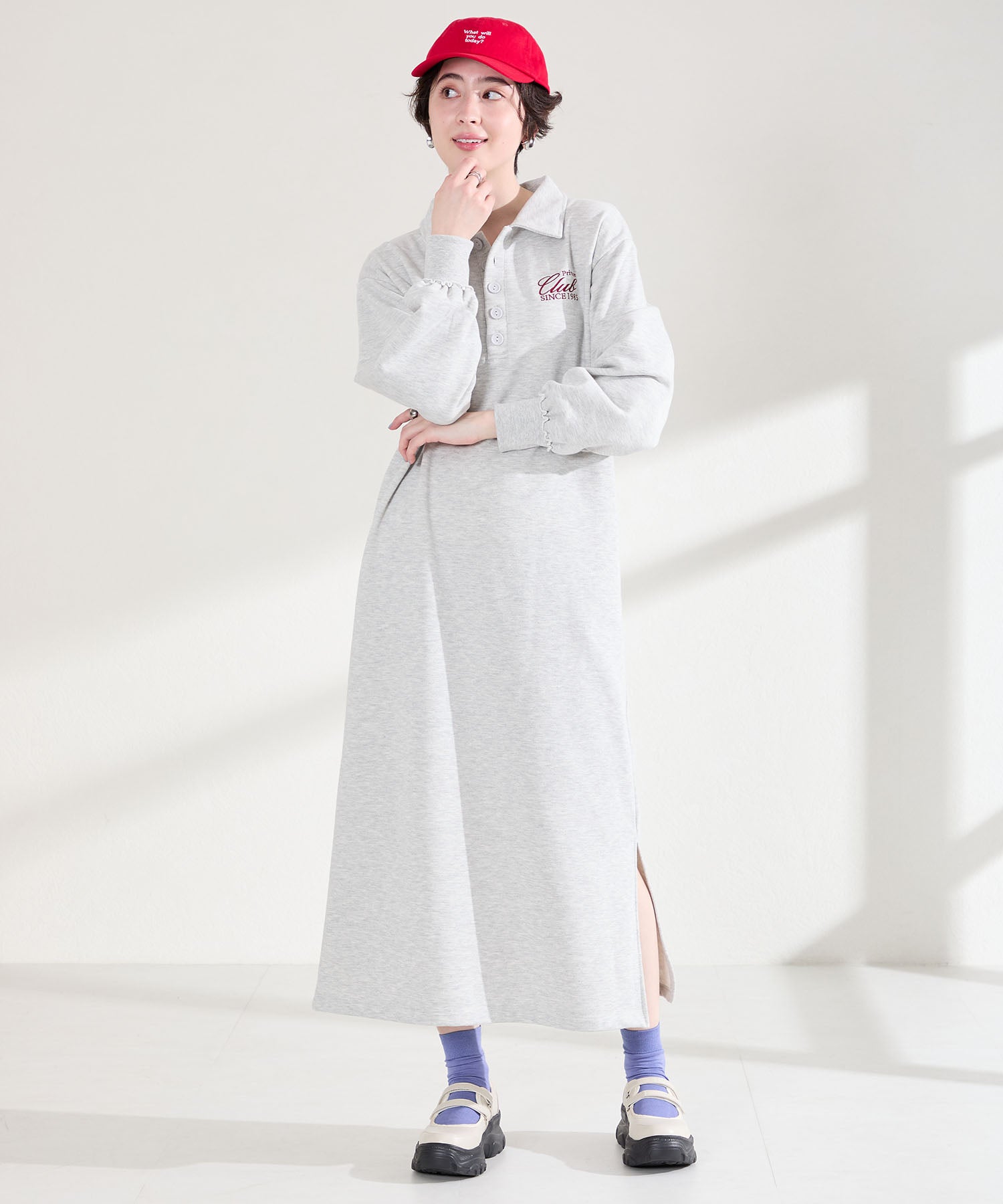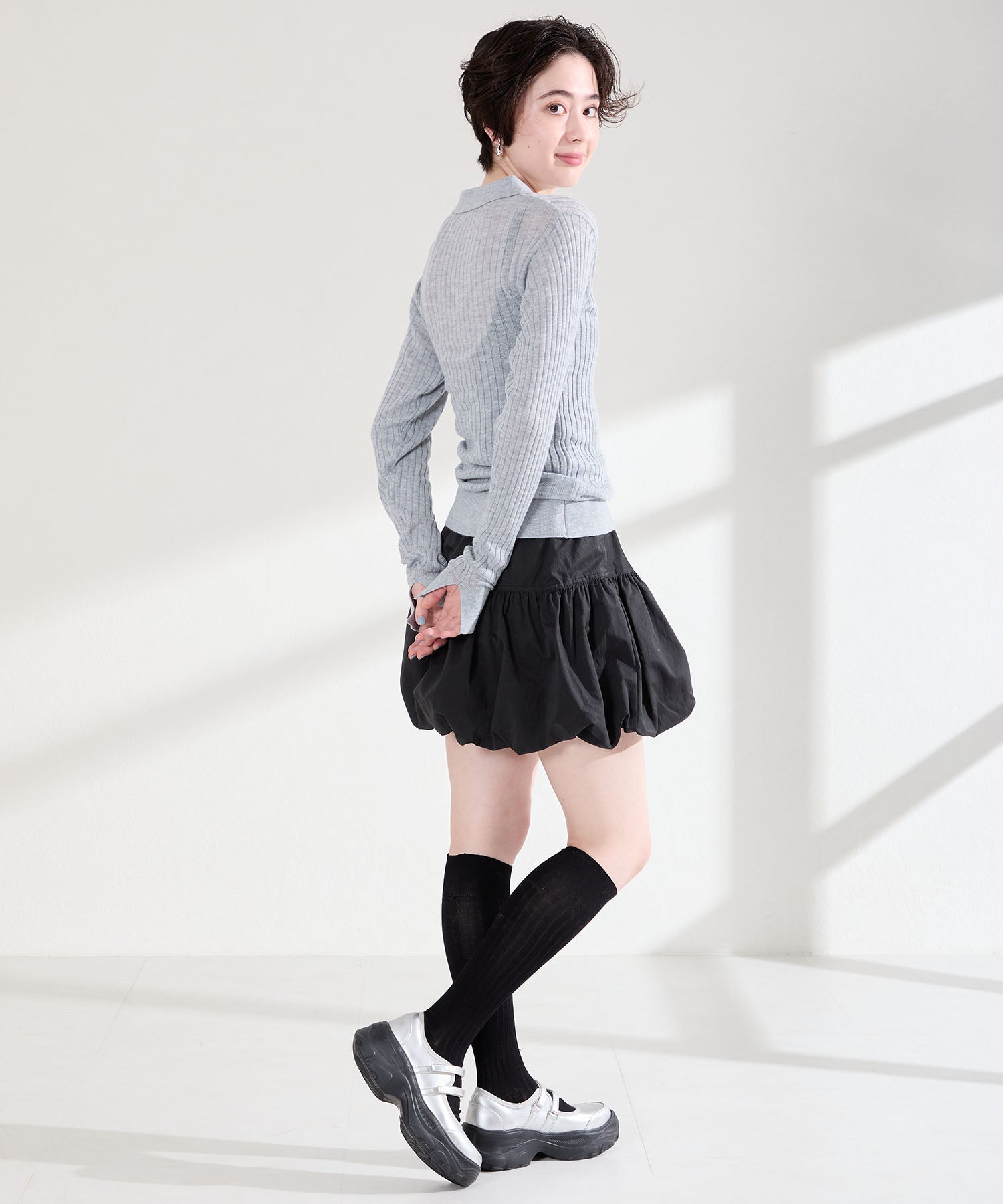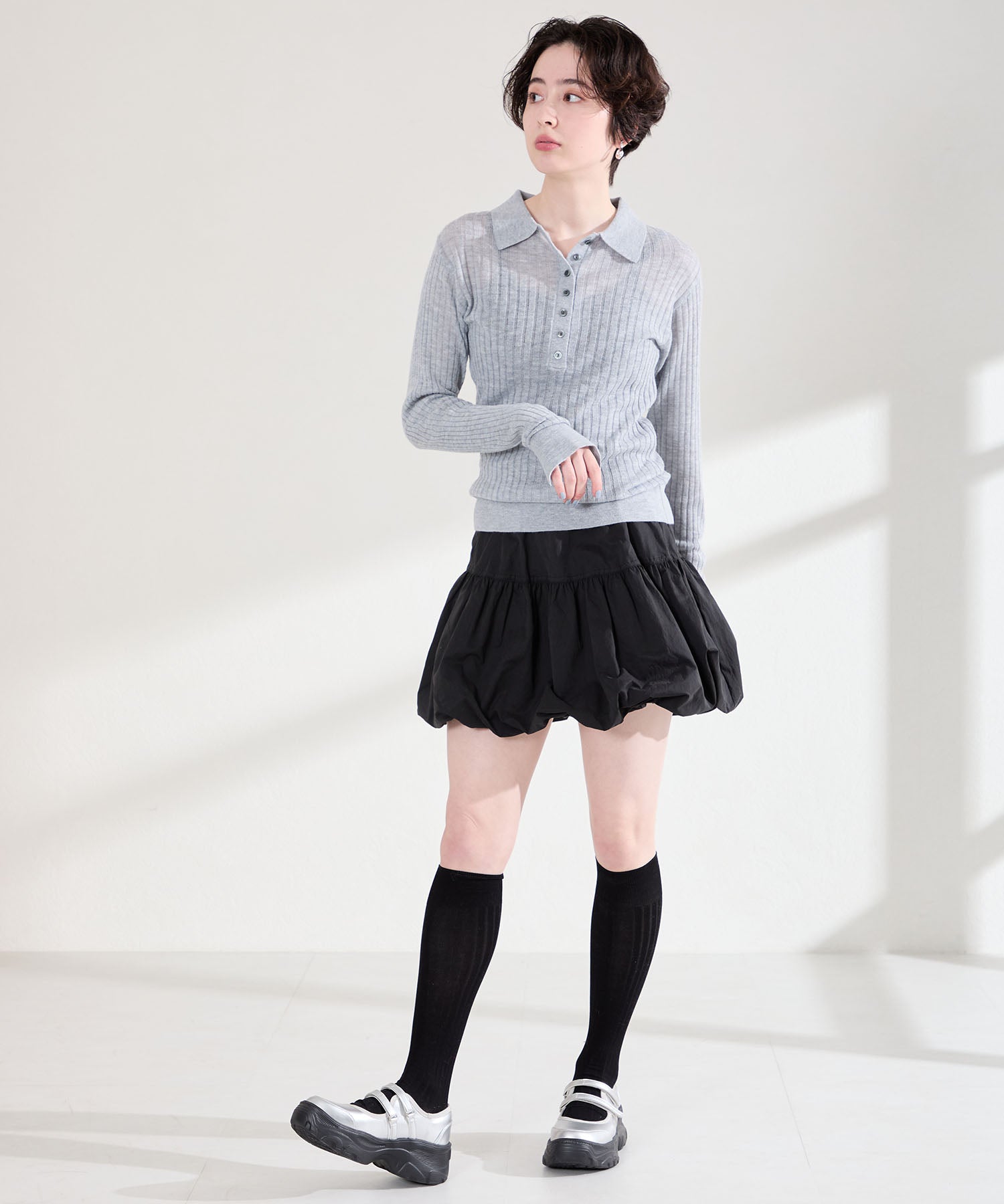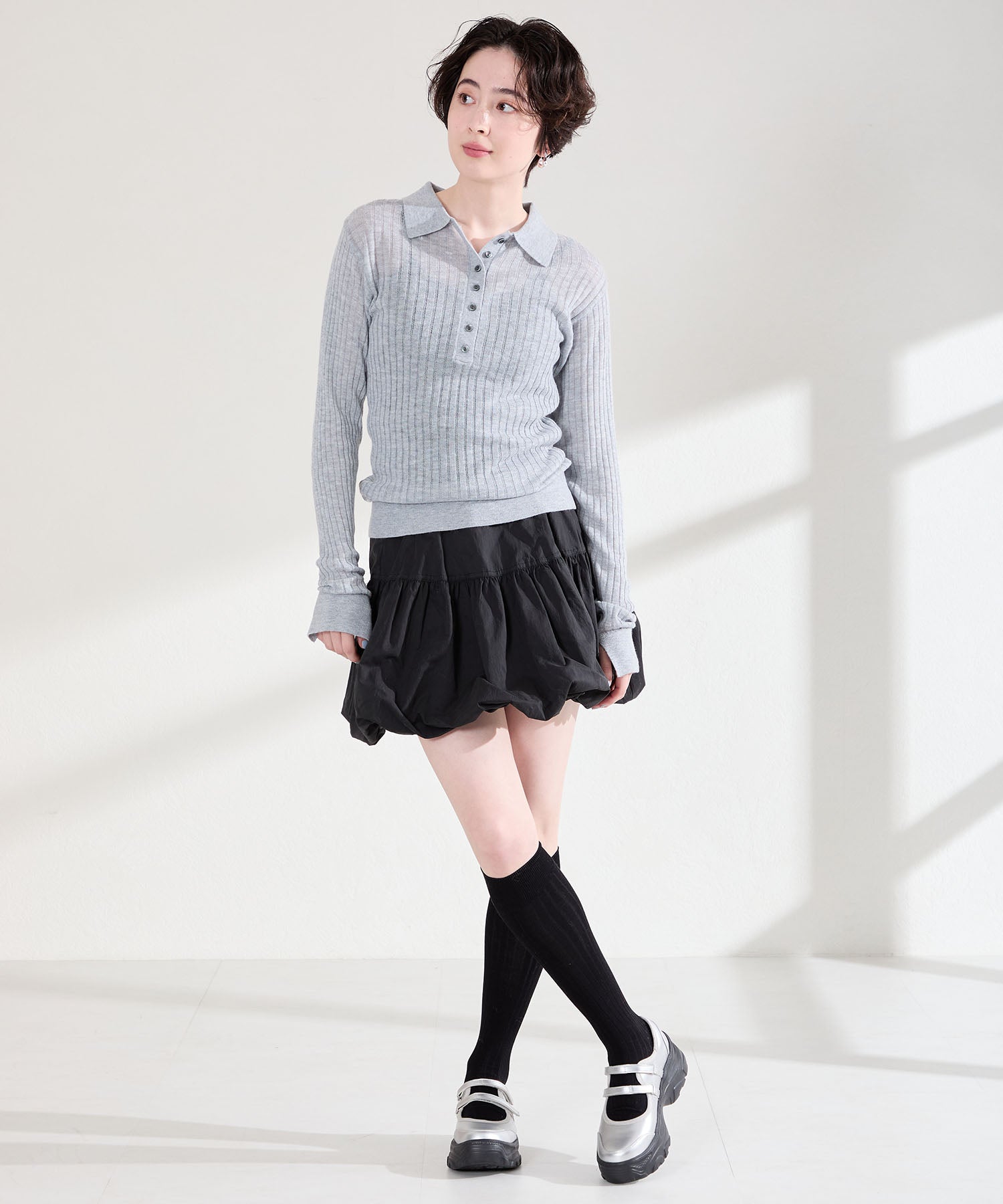 ボリューム感たっぷりのスニーカーソールとメリージェーンデザインの組み合わせが今季らしい旬のアイテム。2本のベルトはベルクロタイプで着脱がしやすく、厚底ソールは見た目以上に軽量なので、高低差が少なく歩きやすいのも嬉しい。甲部分が空いており、靴下の合わせ方次第で表情が変わるので、カジュアルにもガーリーにも幅広いスタイリングに合わせられる。
