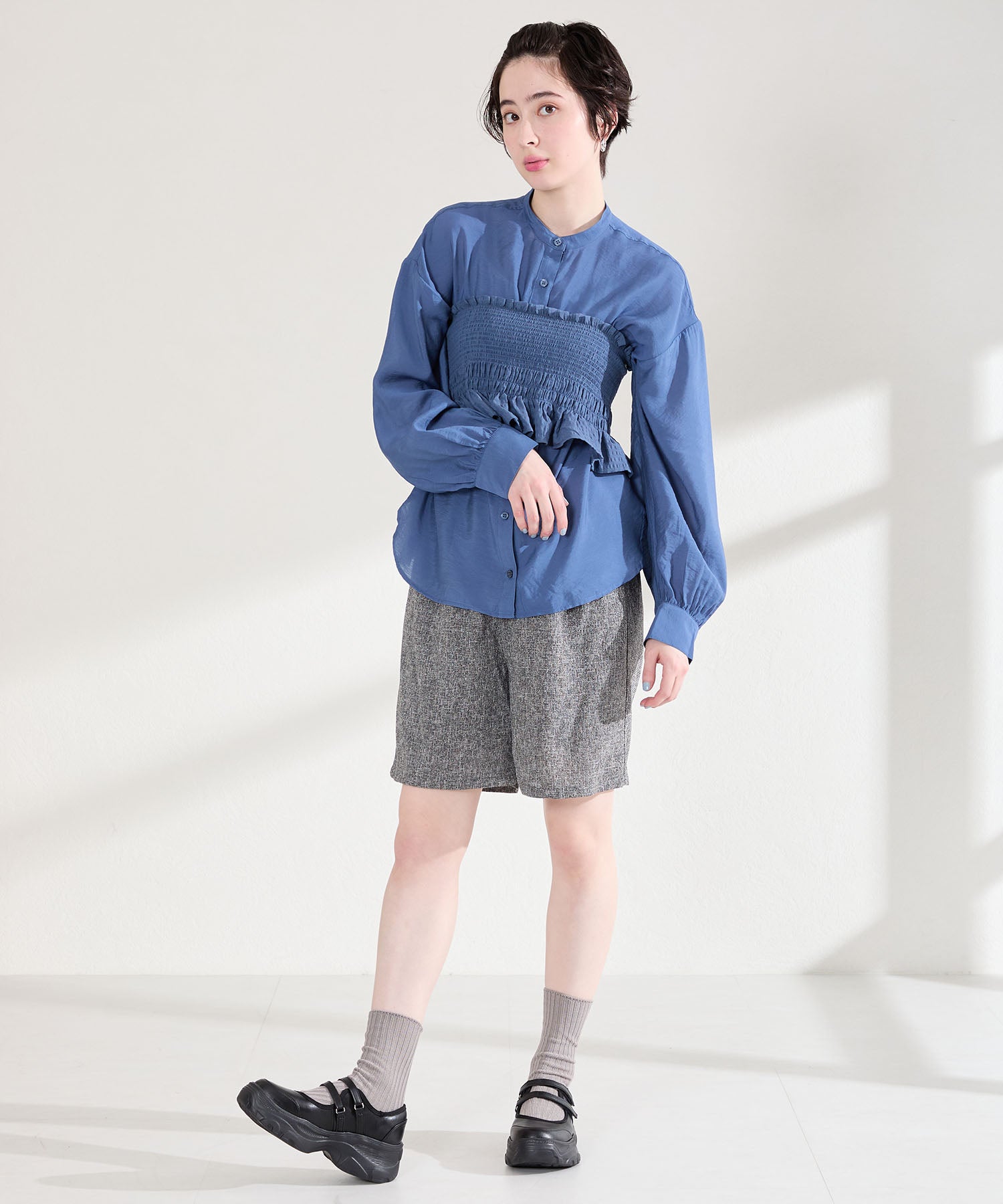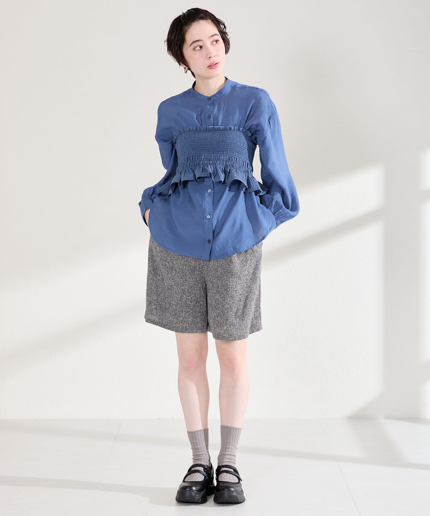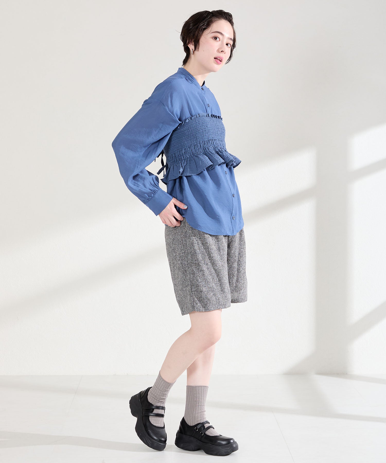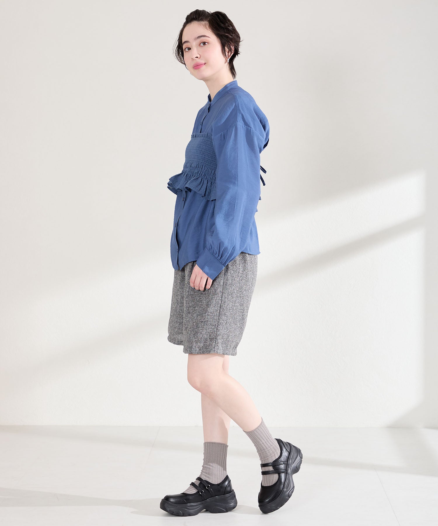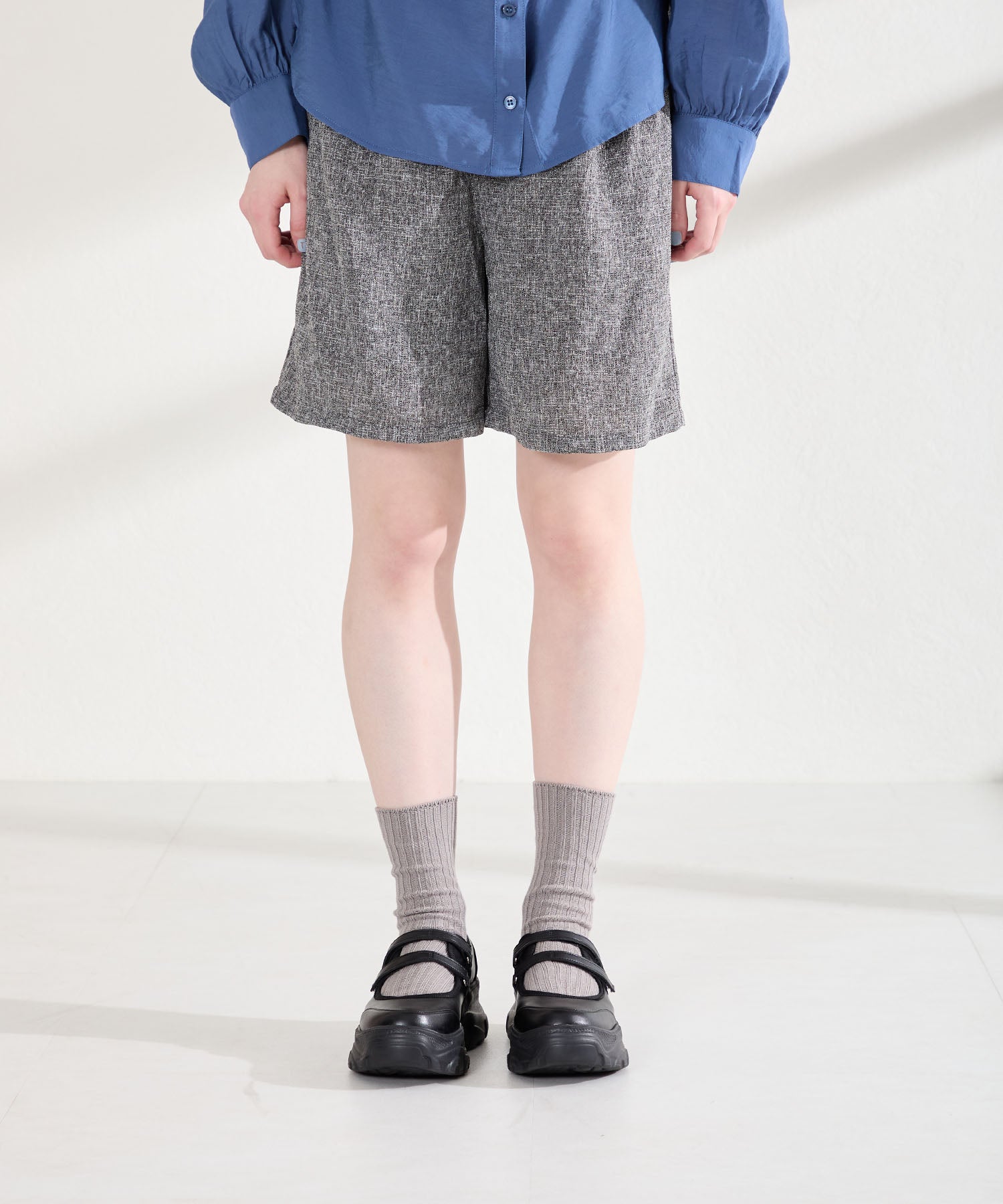 ボリューム感たっぷりのスニーカーソールとメリージェーンデザインの組み合わせが今季らしい旬のアイテム。2本のベルトはベルクロタイプで着脱がしやすく、厚底ソールは見た目以上に軽量なので、高低差が少なく歩きやすいのも嬉しい。甲部分が空いており、靴下の合わせ方次第で表情が変わるので、カジュアルにもガーリーにも幅広いスタイリングに合わせられる。