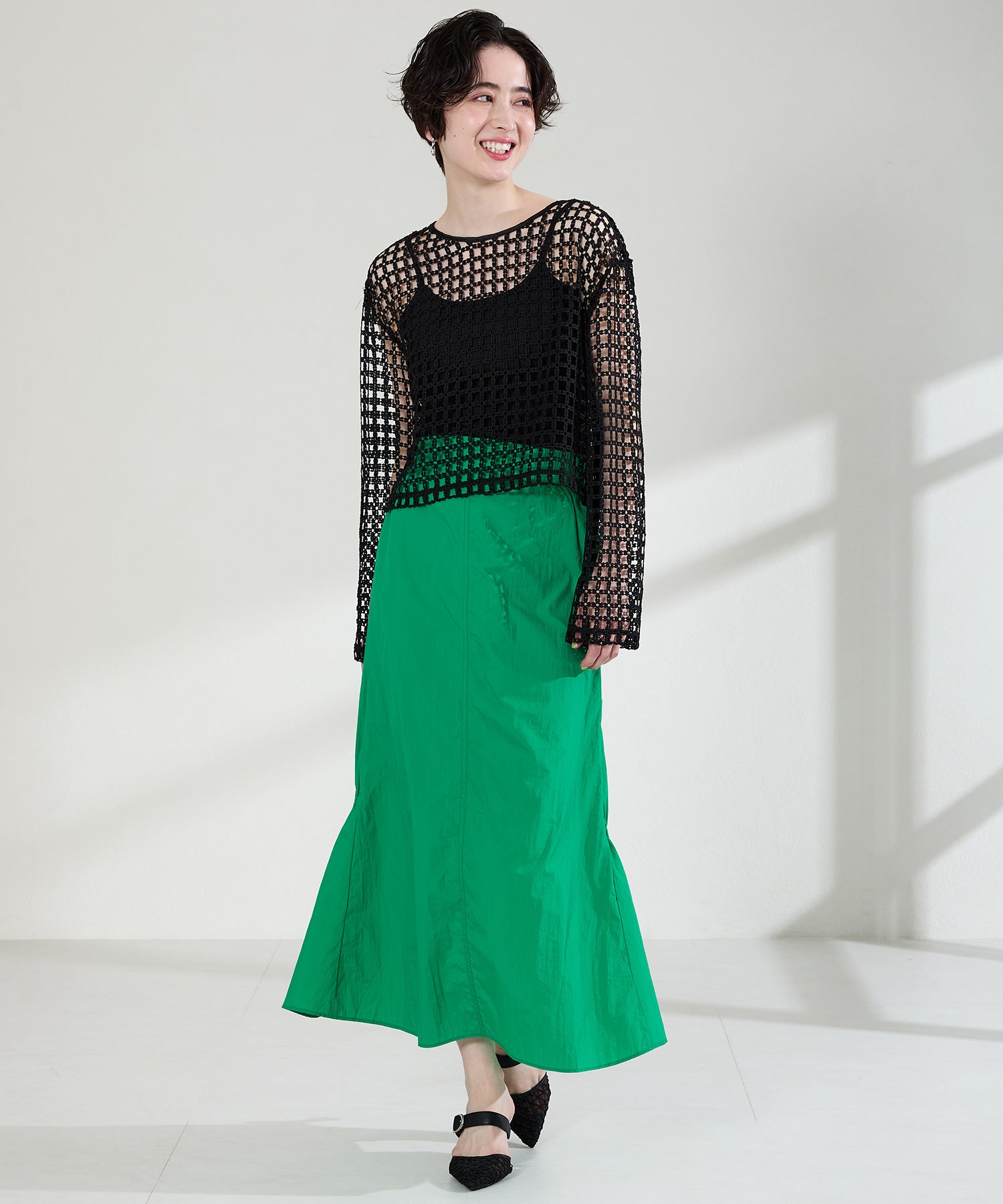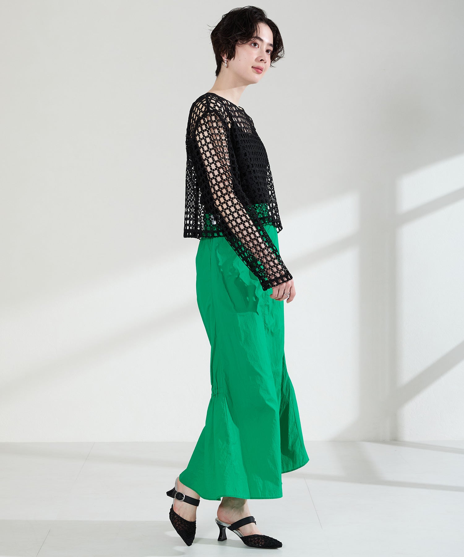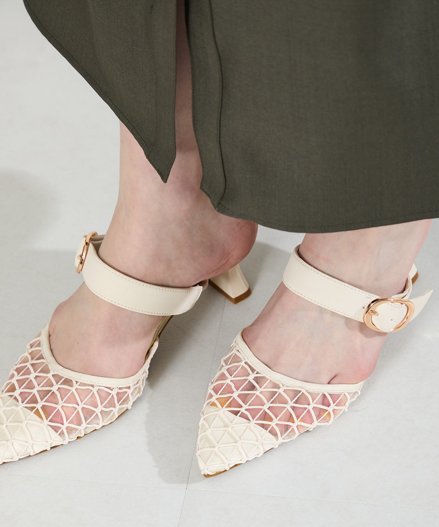 格子柄のレースをチュール素材に重ねた他にはないミュールパンプス。つま先のチュール素材は程よい透け感で軽やかな印象に。くびれたヒールにすることで横からのシルエットがすっきりと見え、シャープなポインテッドトゥの形でより女性らしい足元を演出してくれます。甲のストラップには隠しゴムがついていてさっと履けるのも魅力。